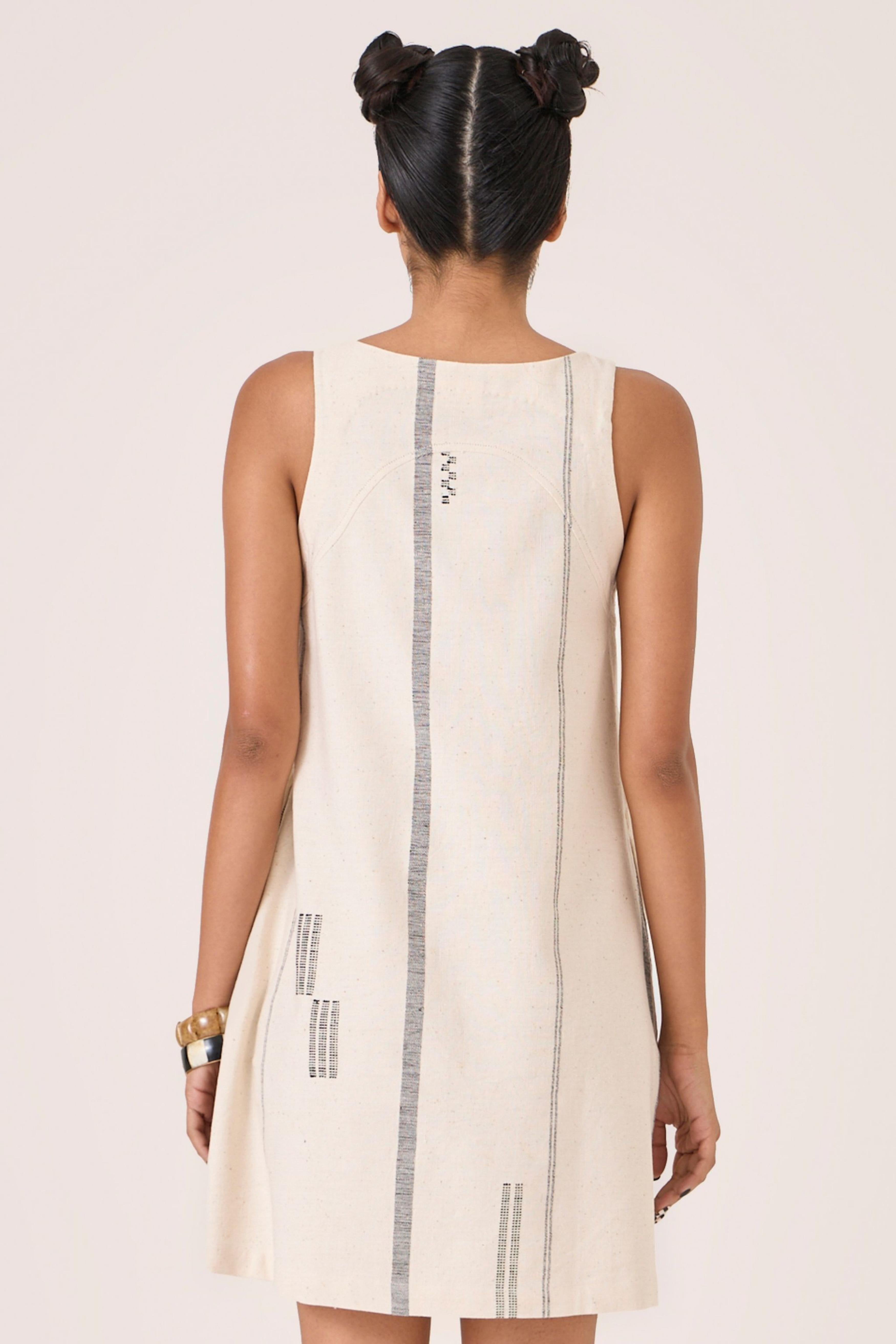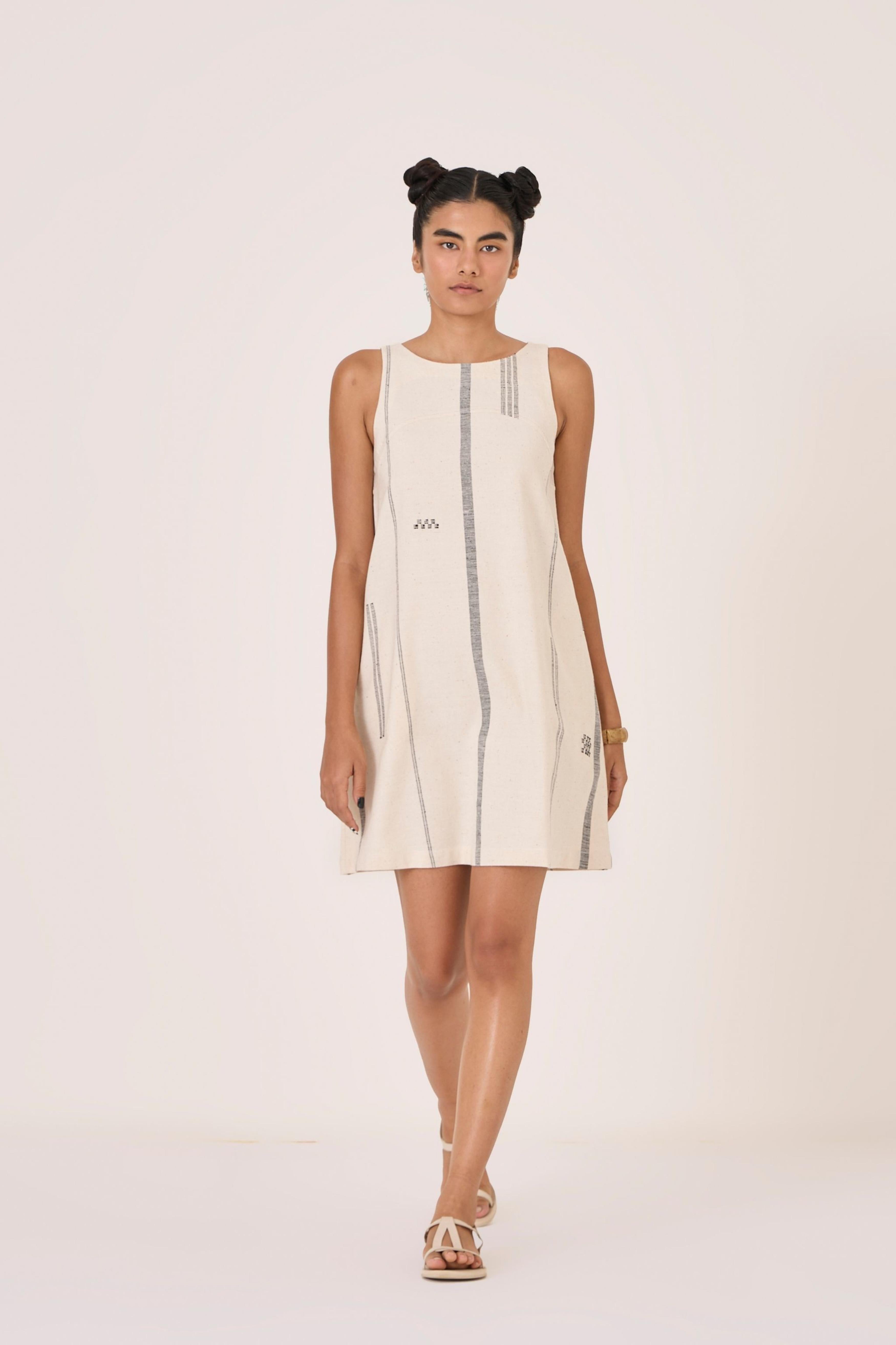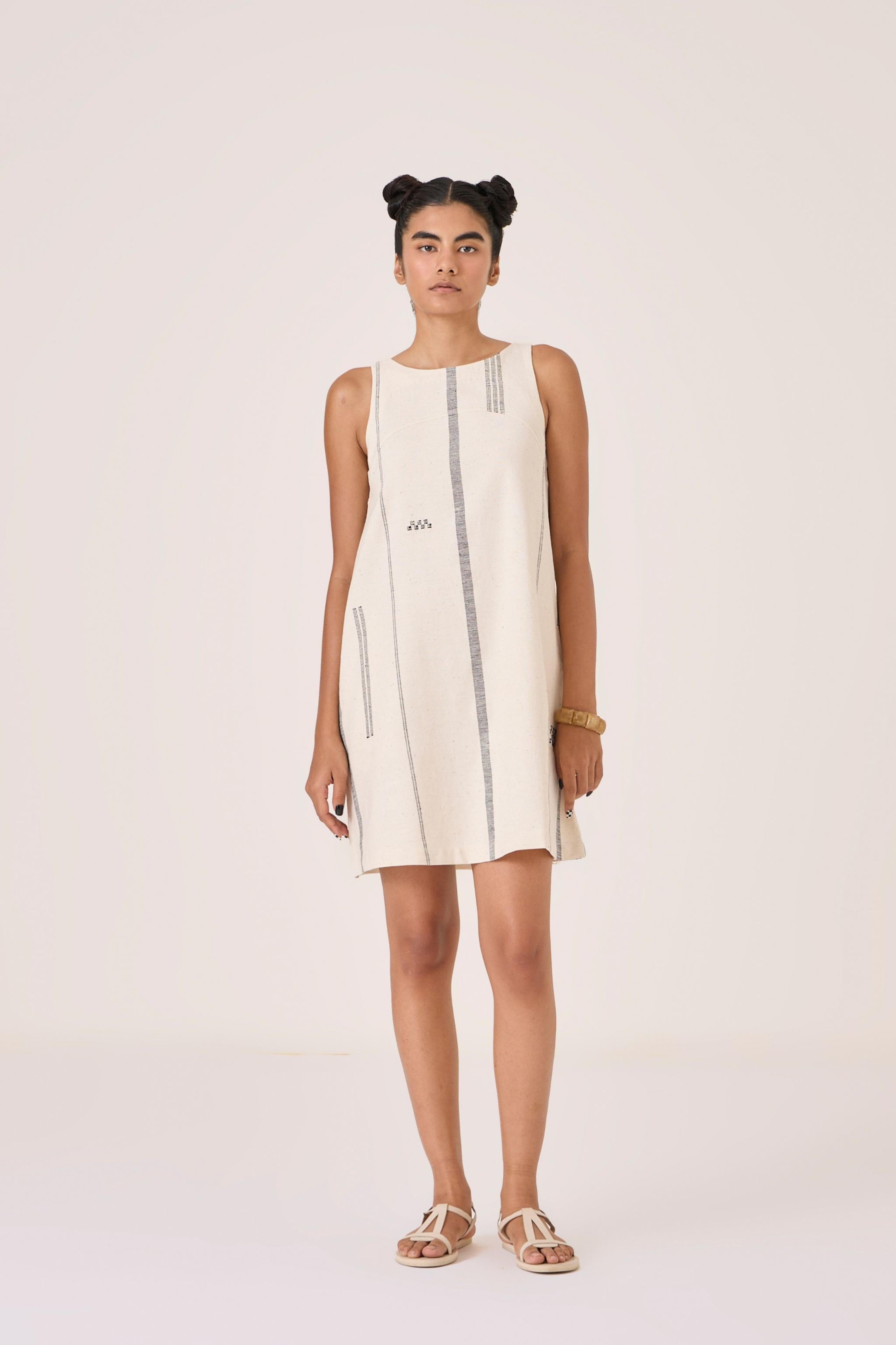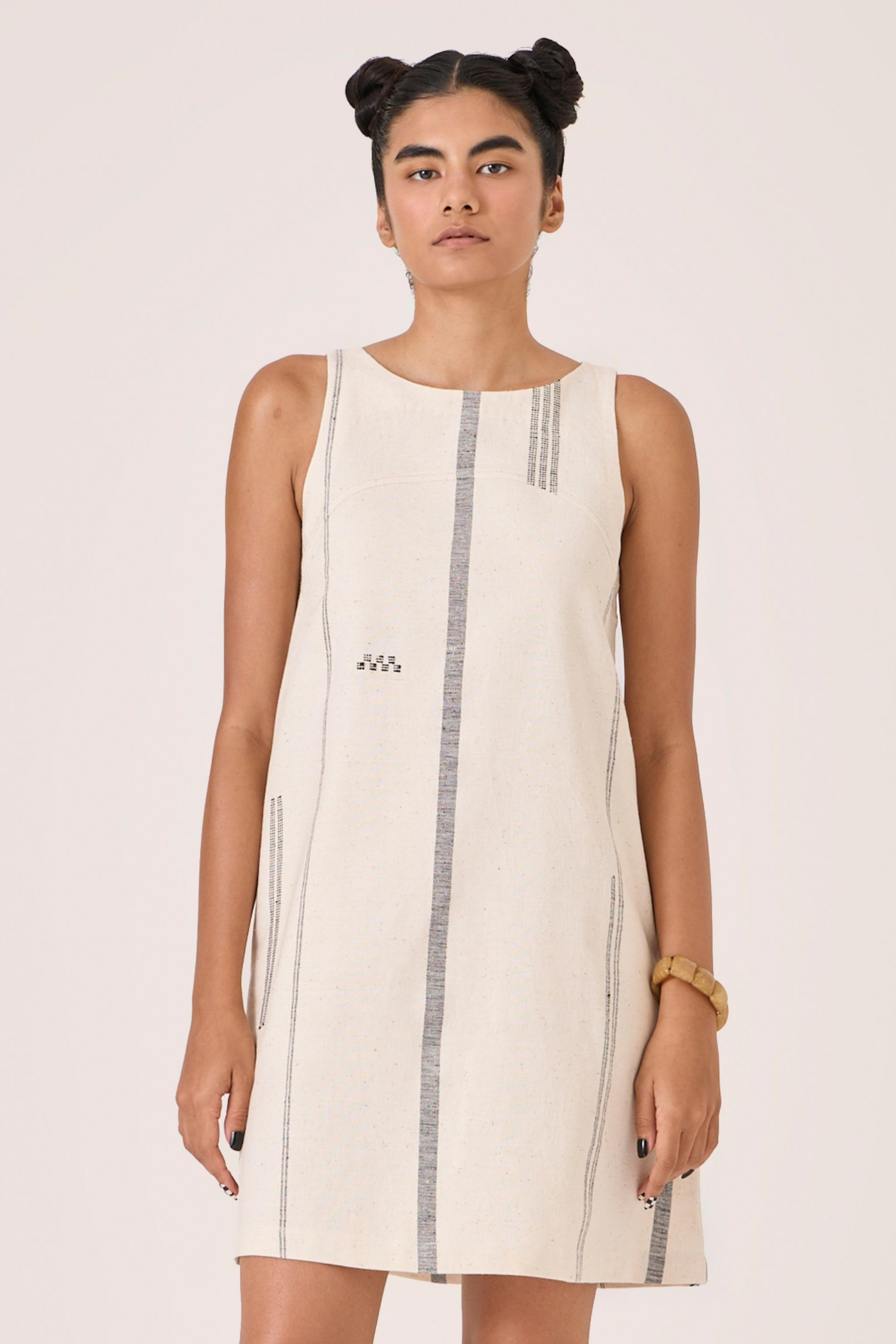 - Sleeveless shift dress - Classic shape - Interesting panel detail - In-seam pockets This signature weave has been developed in our studio and handwoven by artisans in Kutch. Slight irregularities are inherent and speak to the hand processes involved.