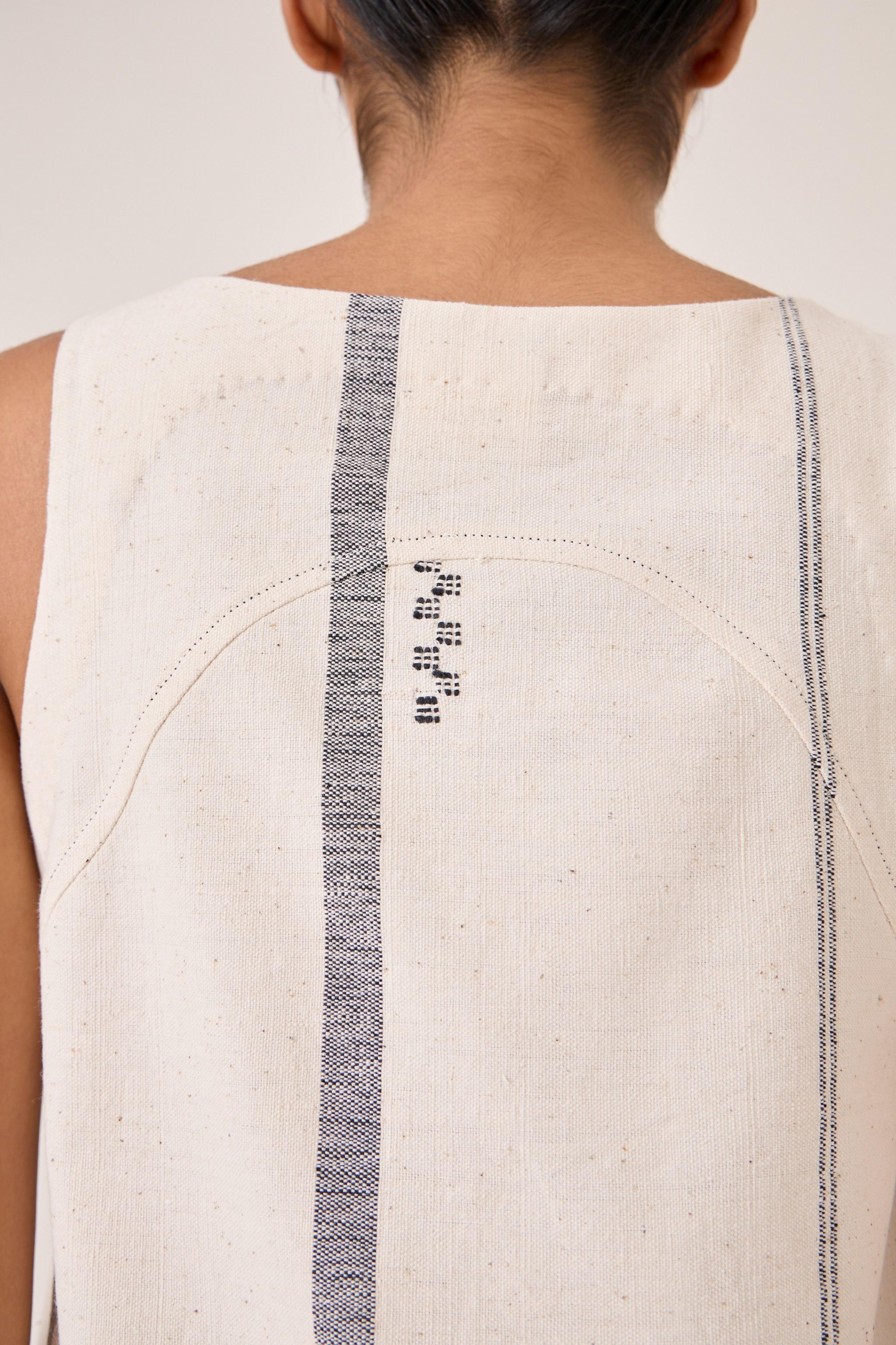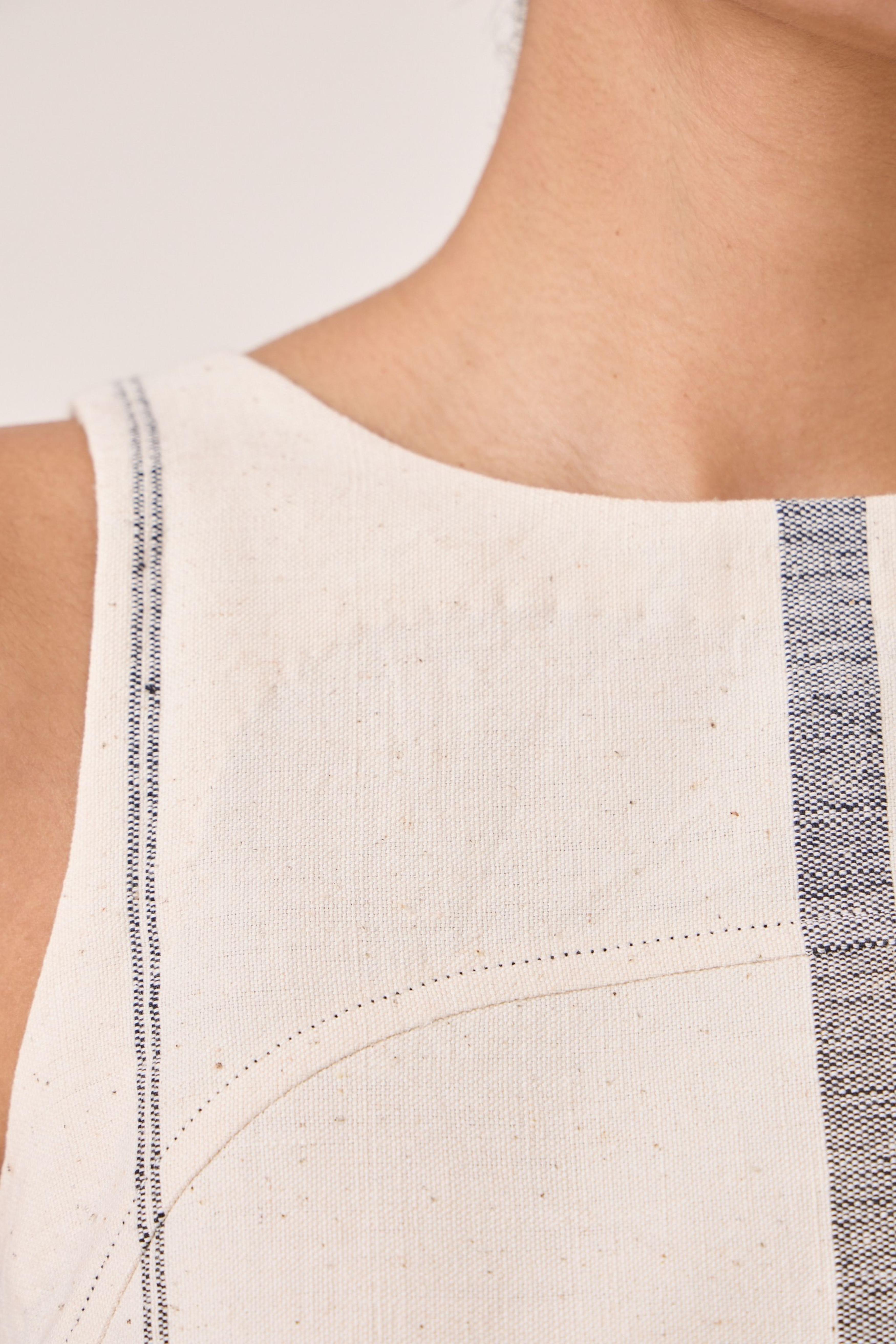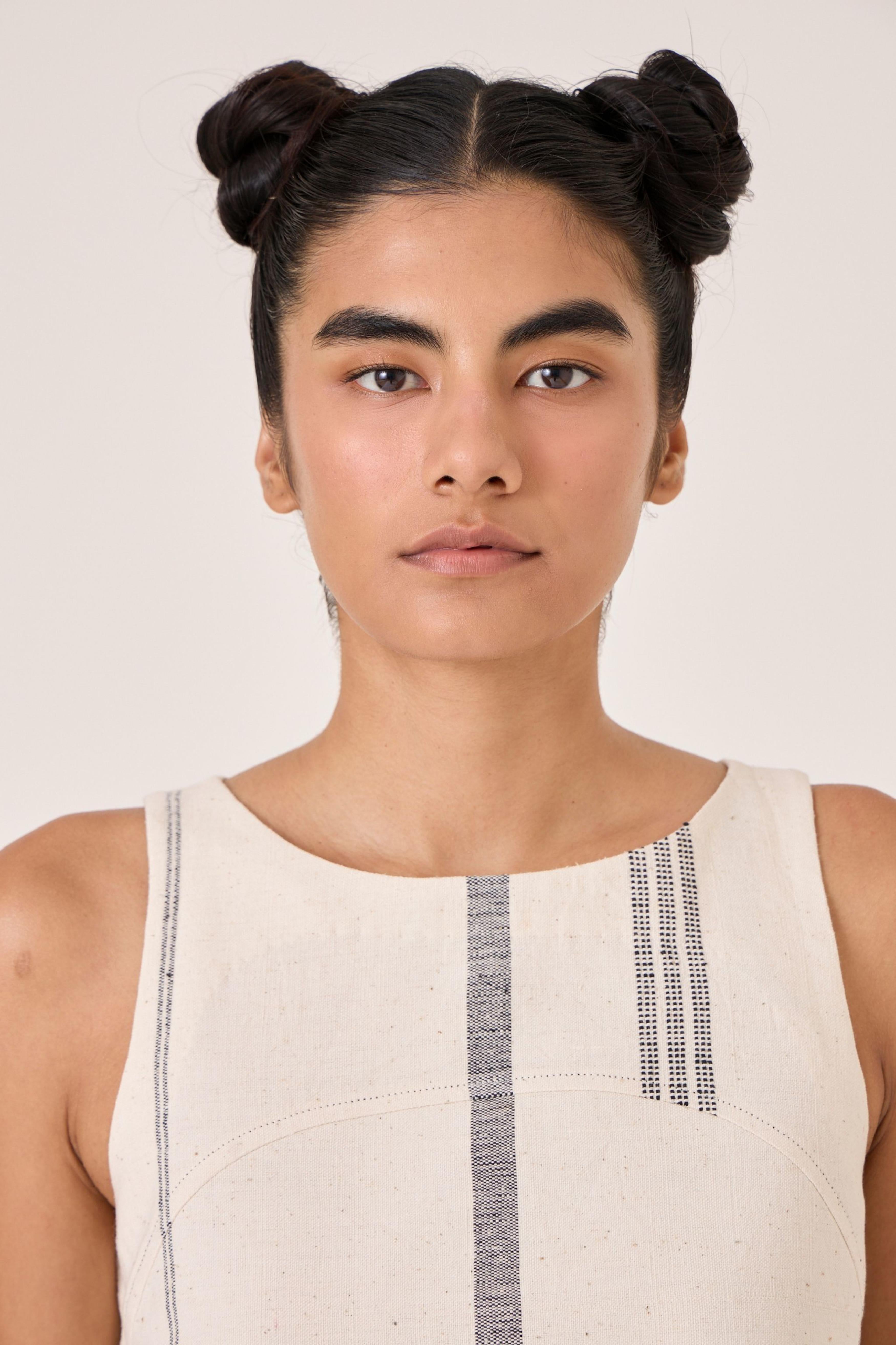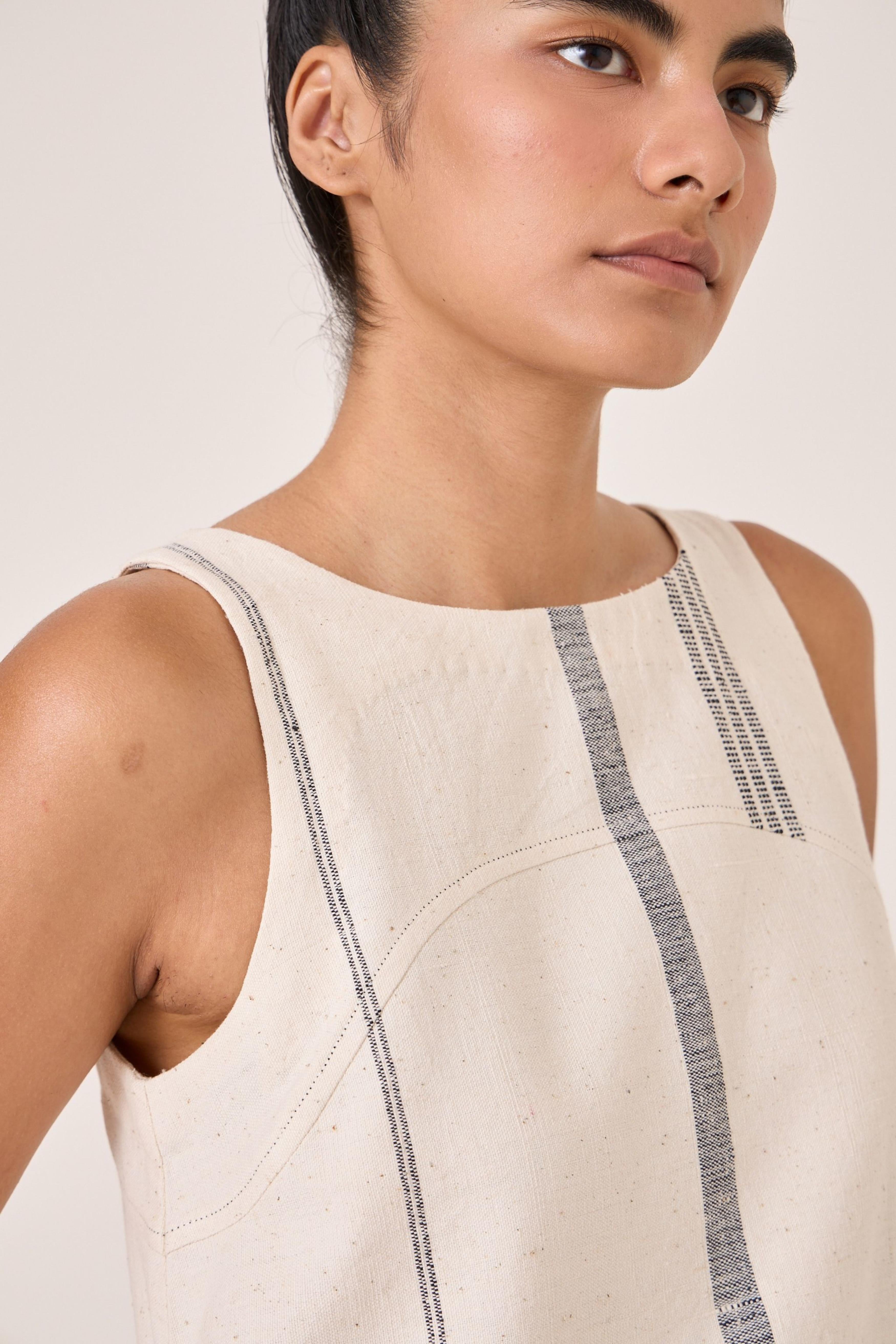 - Sleeveless shift dress - Classic shape - Interesting panel detail - In-seam pockets This signature weave has been developed in our studio and handwoven by artisans in Kutch. Slight irregularities are inherent and speak to the hand processes involved.