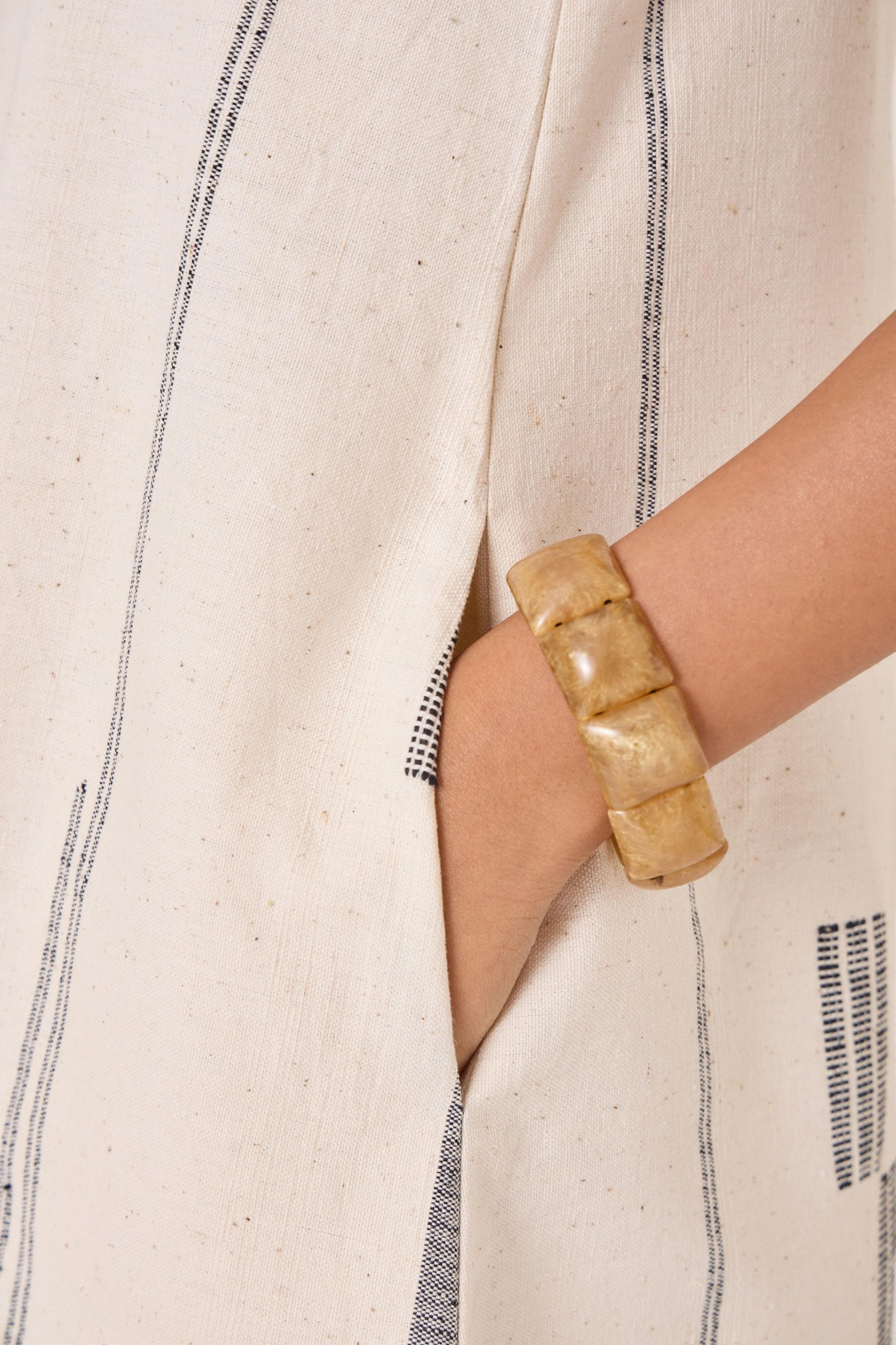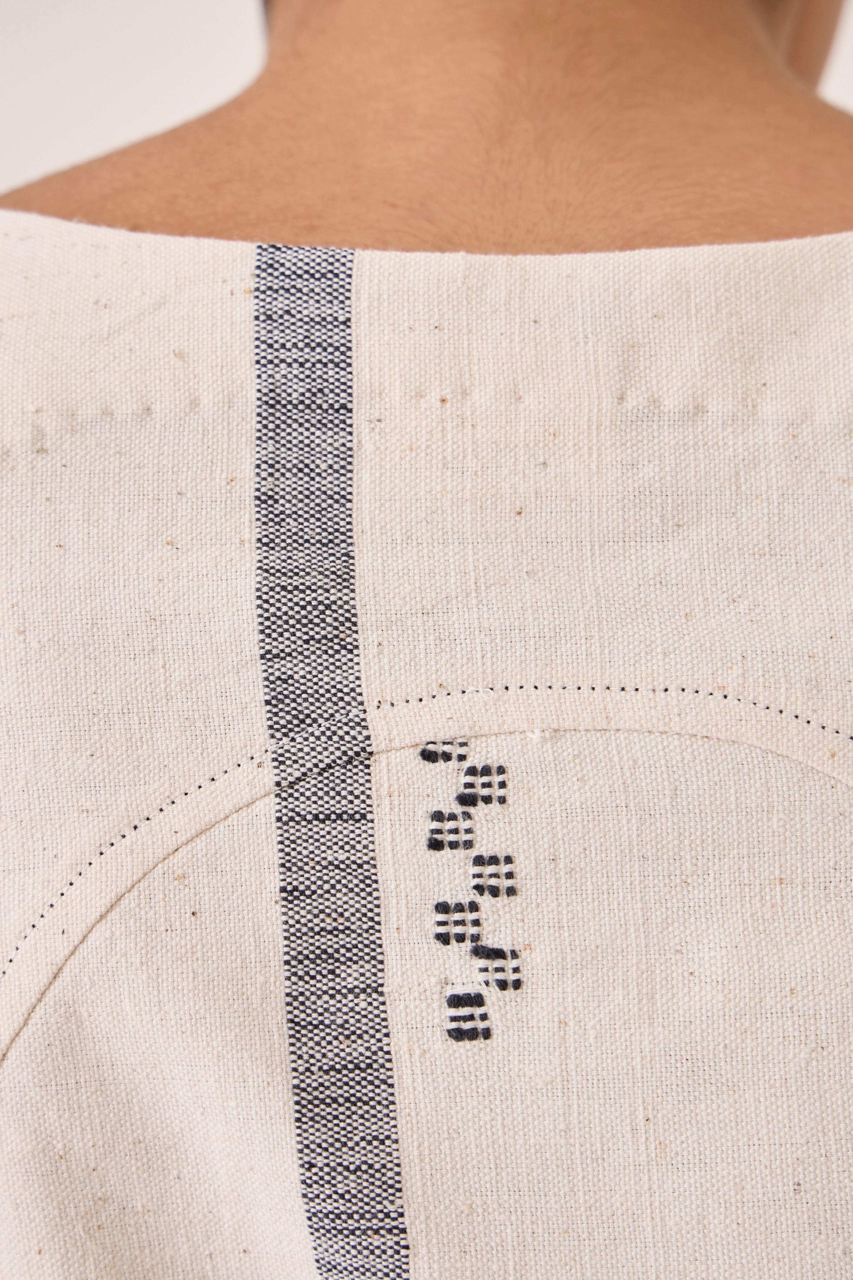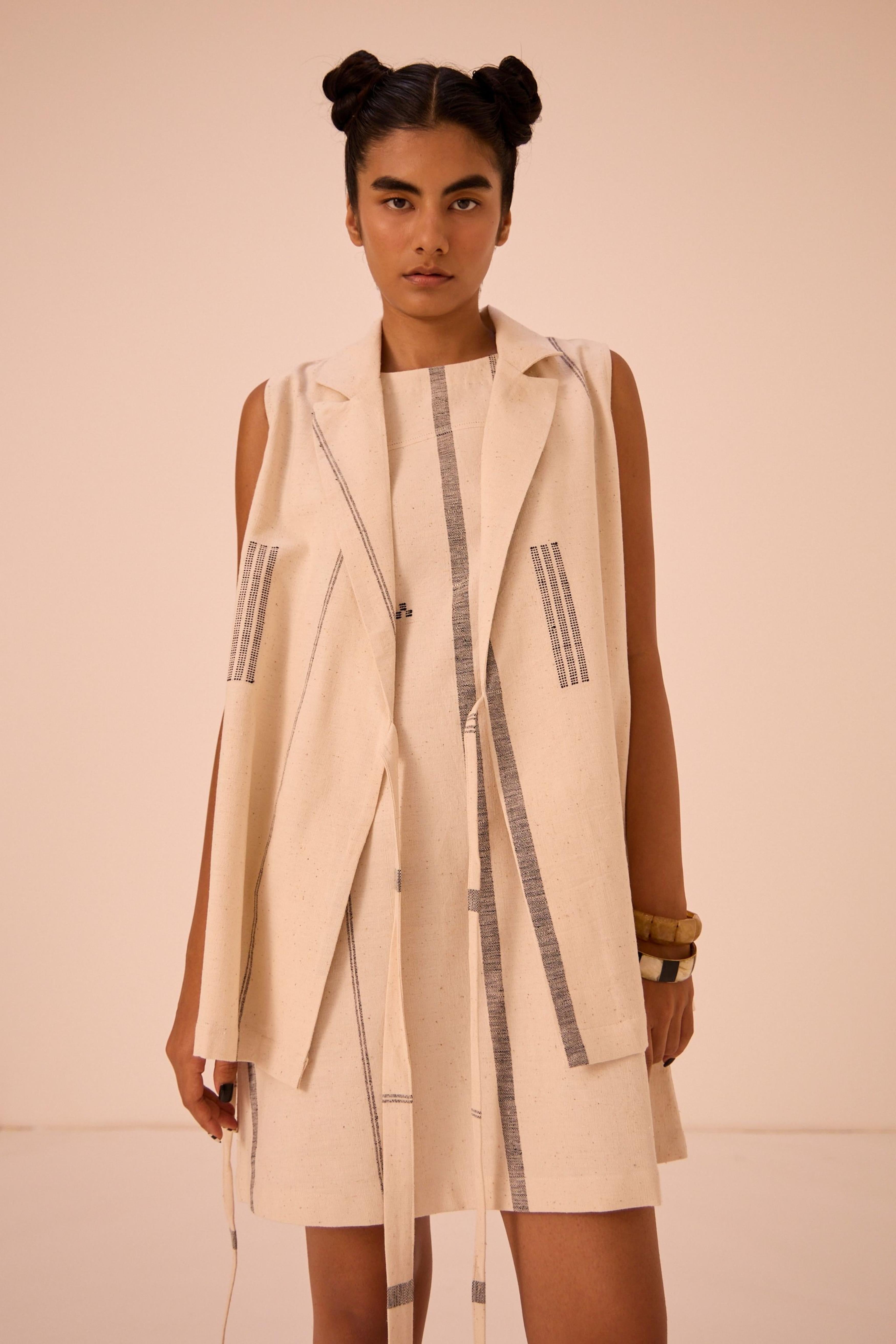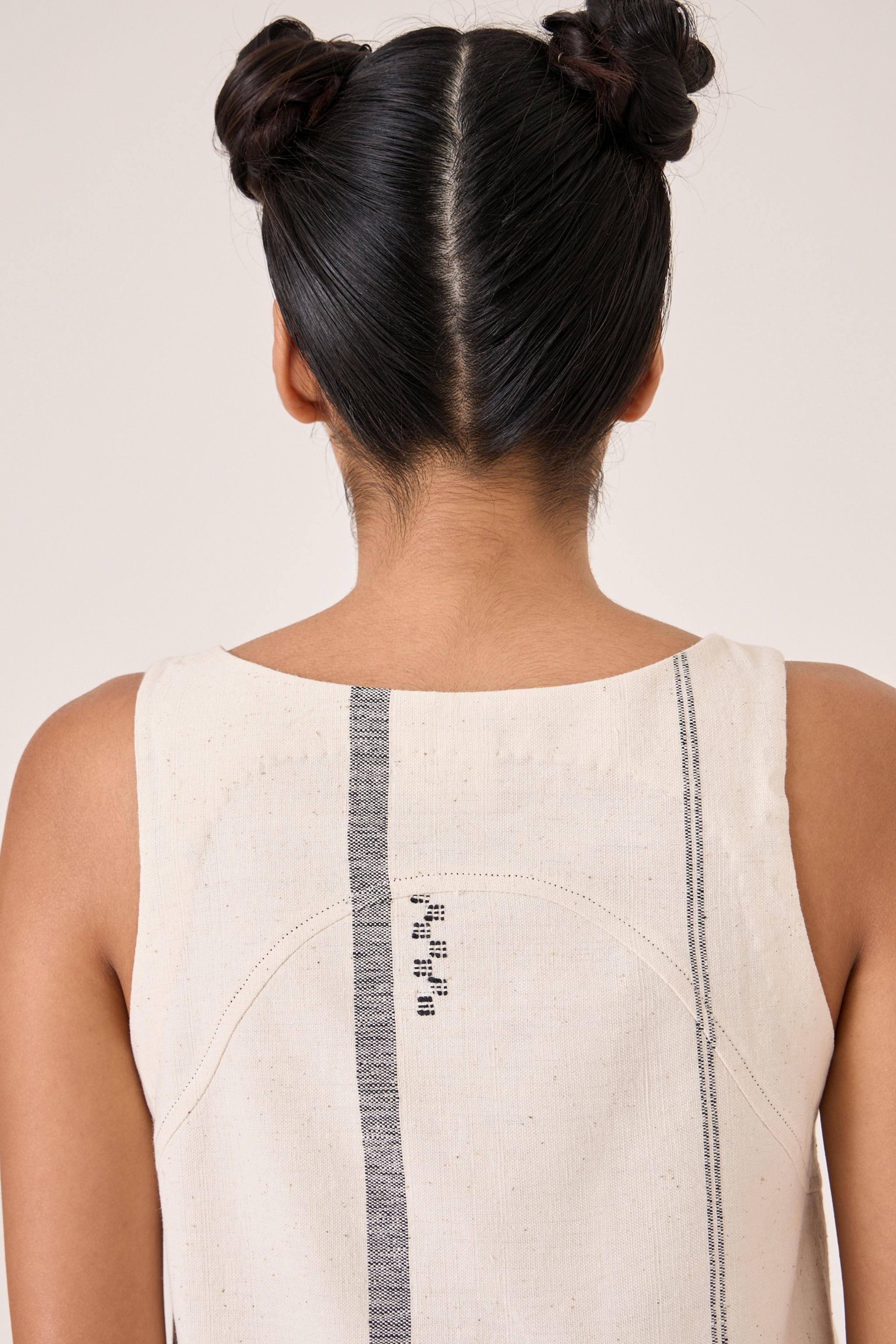 - Sleeveless shift dress - Classic shape - Interesting panel detail - In-seam pockets This signature weave has been developed in our studio and handwoven by artisans in Kutch. Slight irregularities are inherent and speak to the hand processes involved.