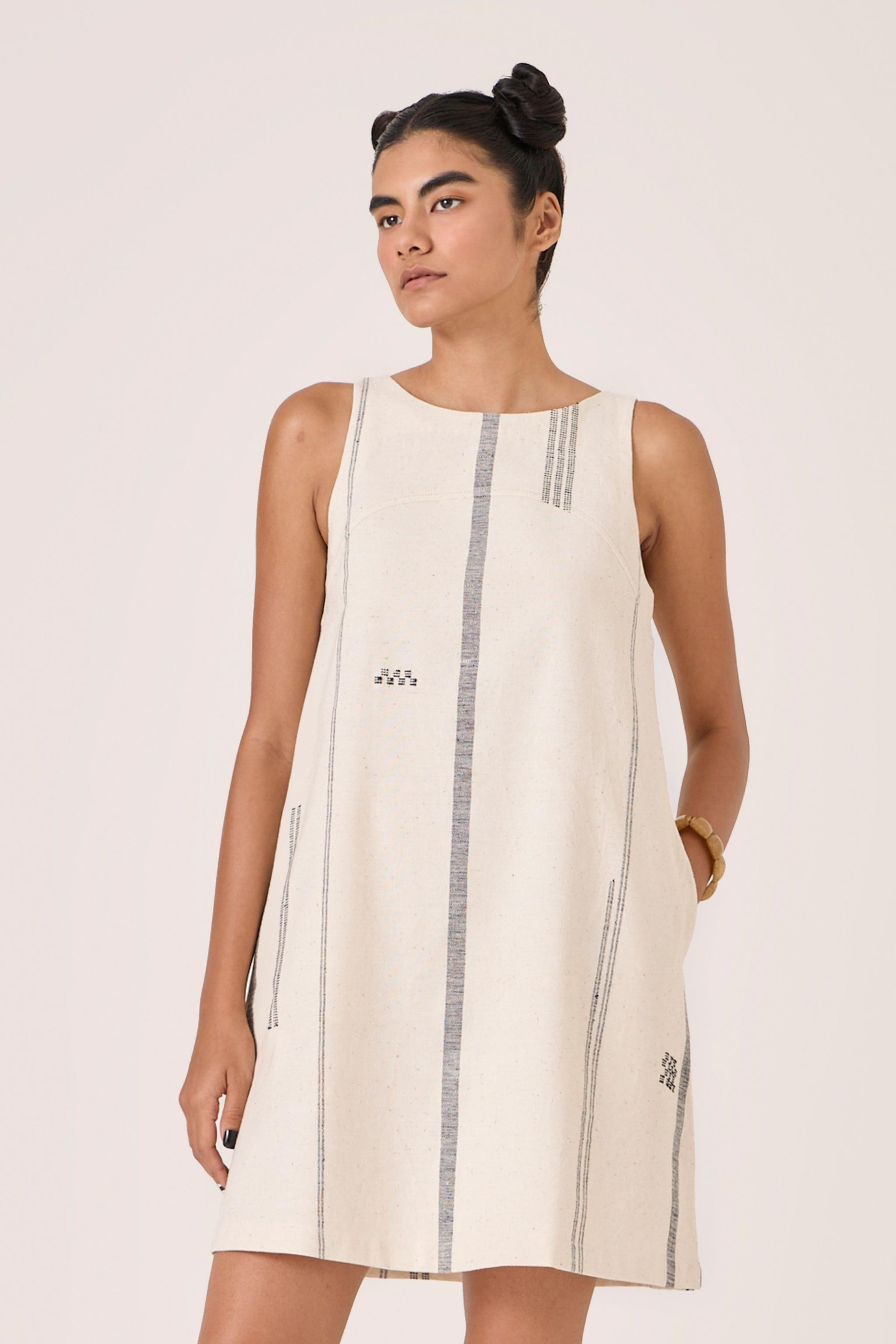 - Sleeveless shift dress - Classic shape - Interesting panel detail - In-seam pockets This signature weave has been developed in our studio and handwoven by artisans in Kutch. Slight irregularities are inherent and speak to the hand processes involved.