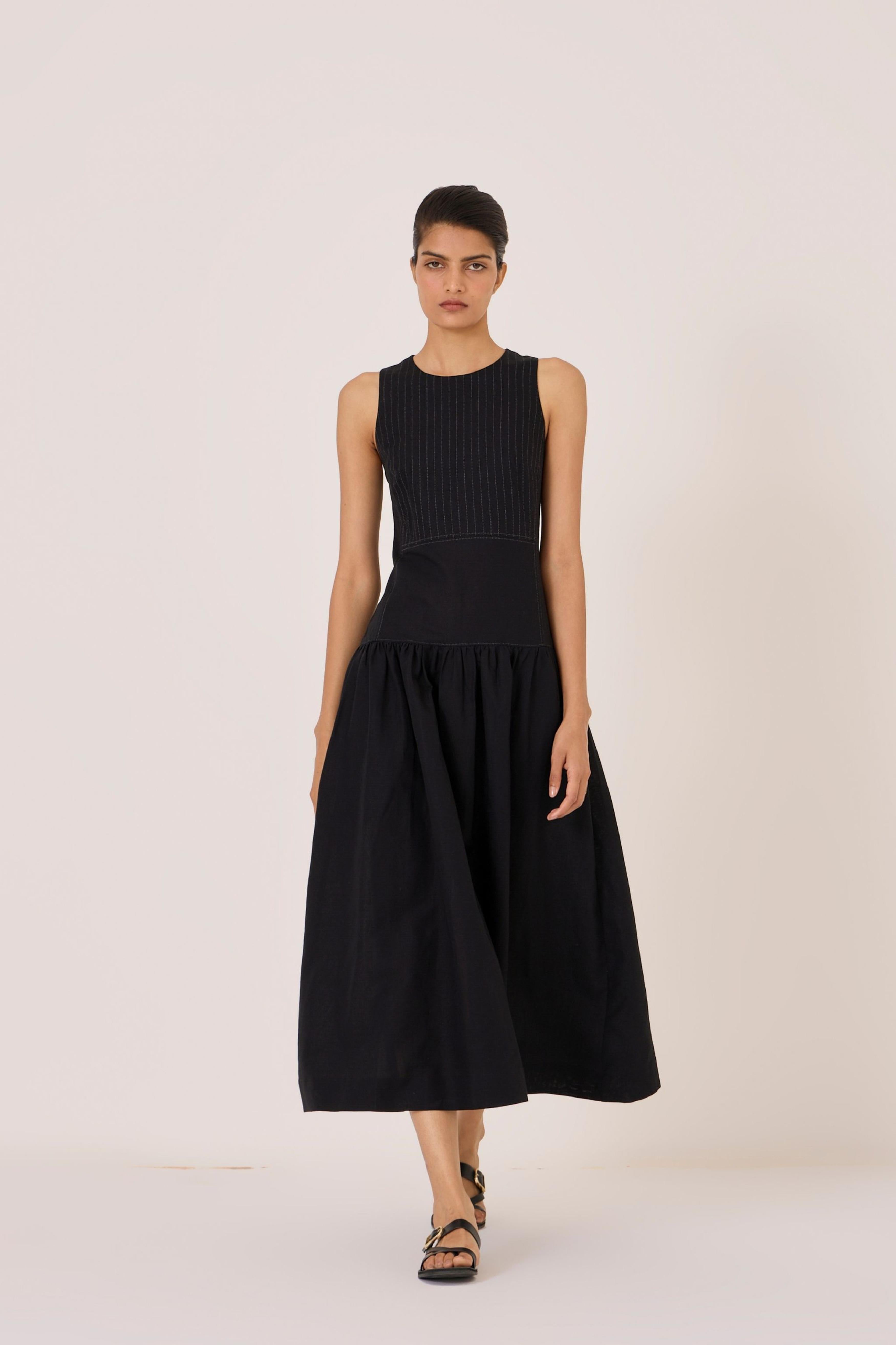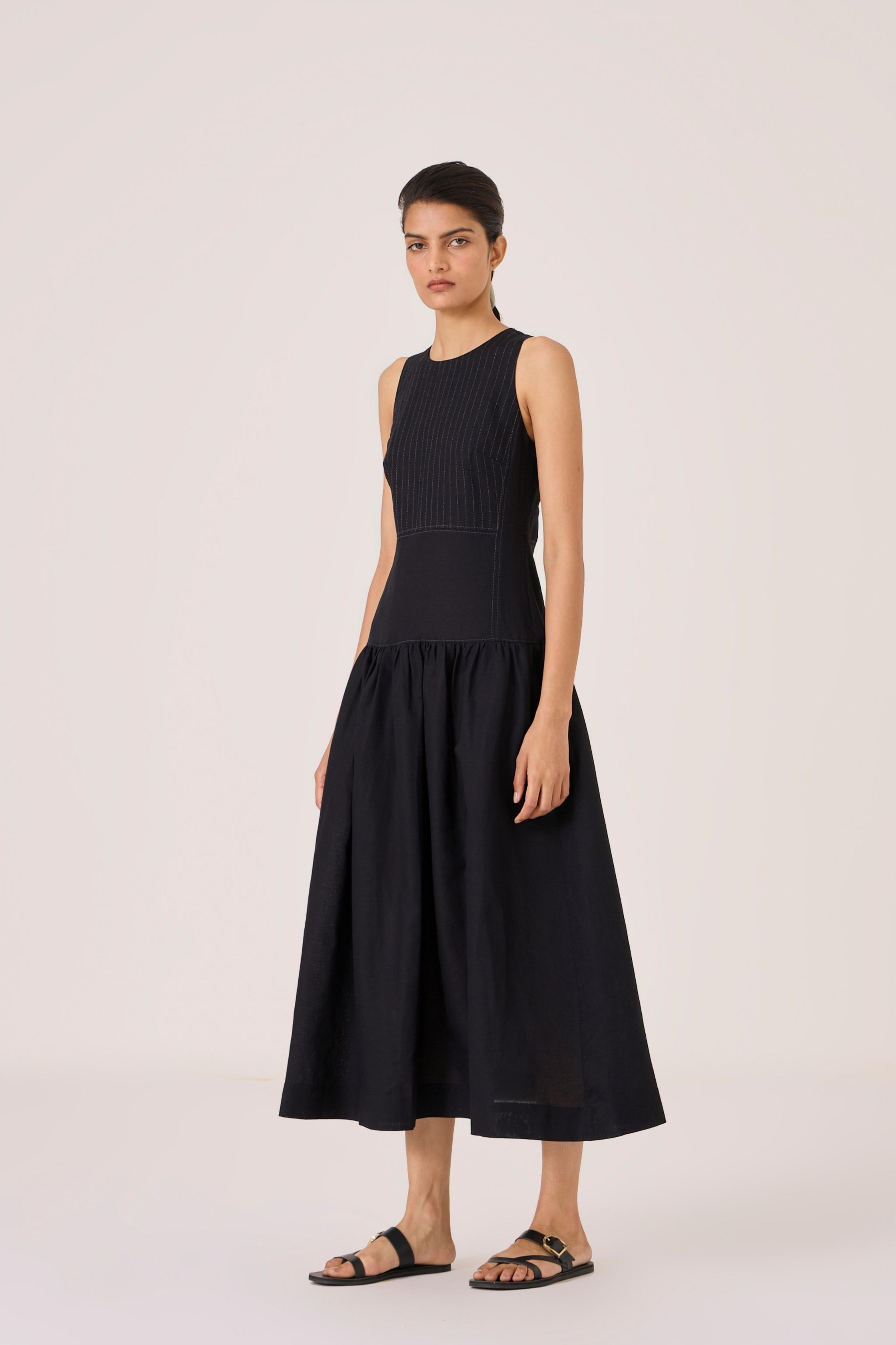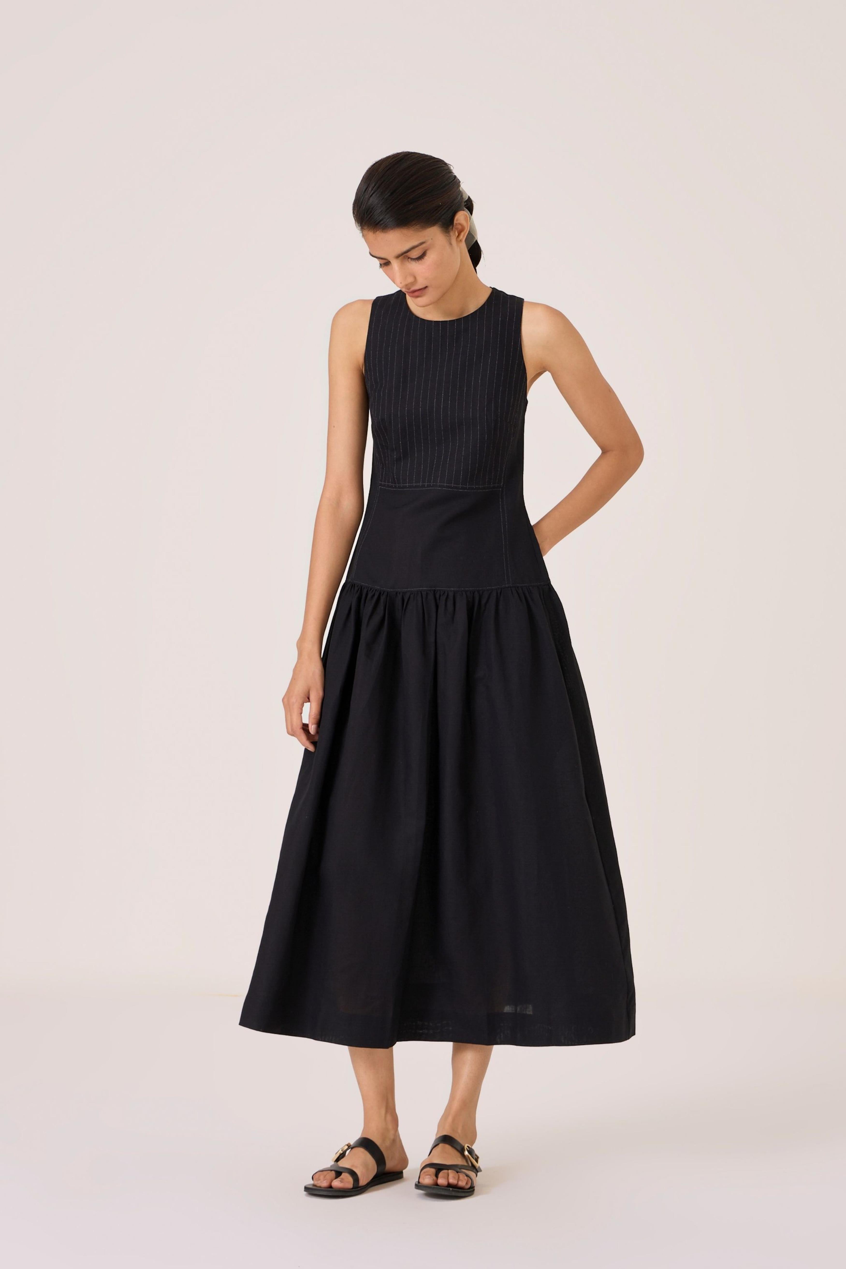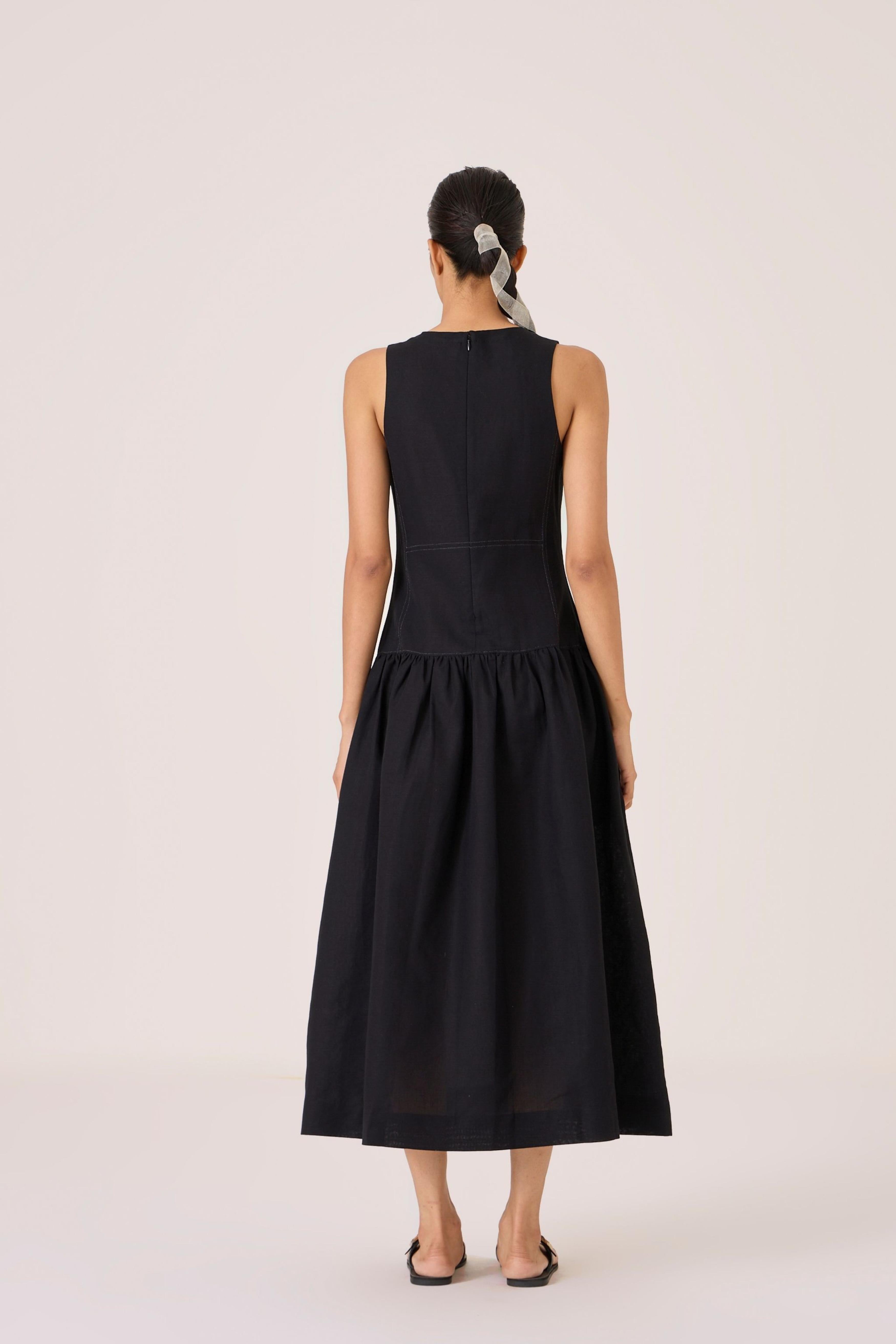 - Long black dress - Sleeveless with gusset - Contrast quilting on square yoke - Added drop waist - Back zip - In-seam pockets