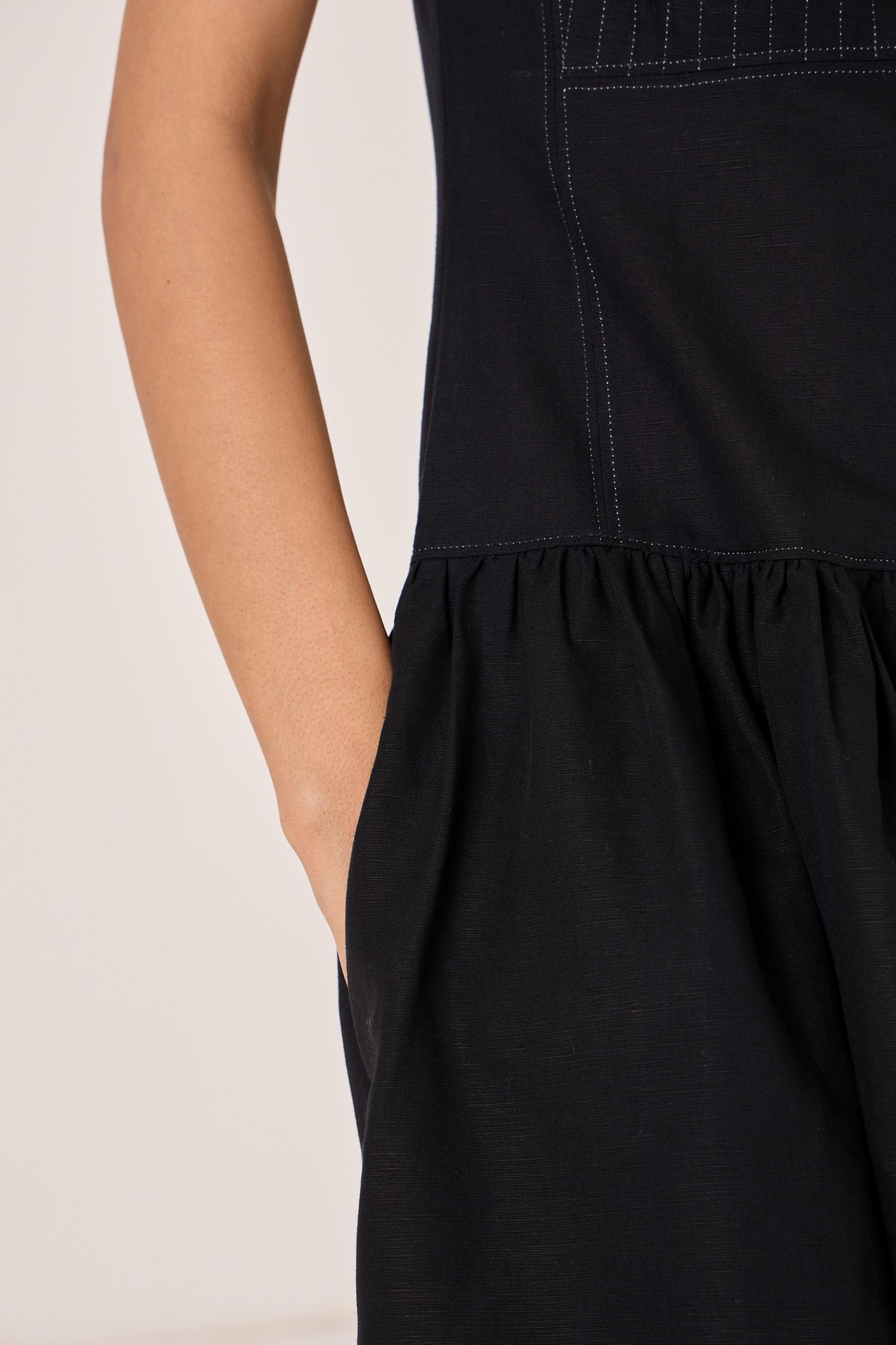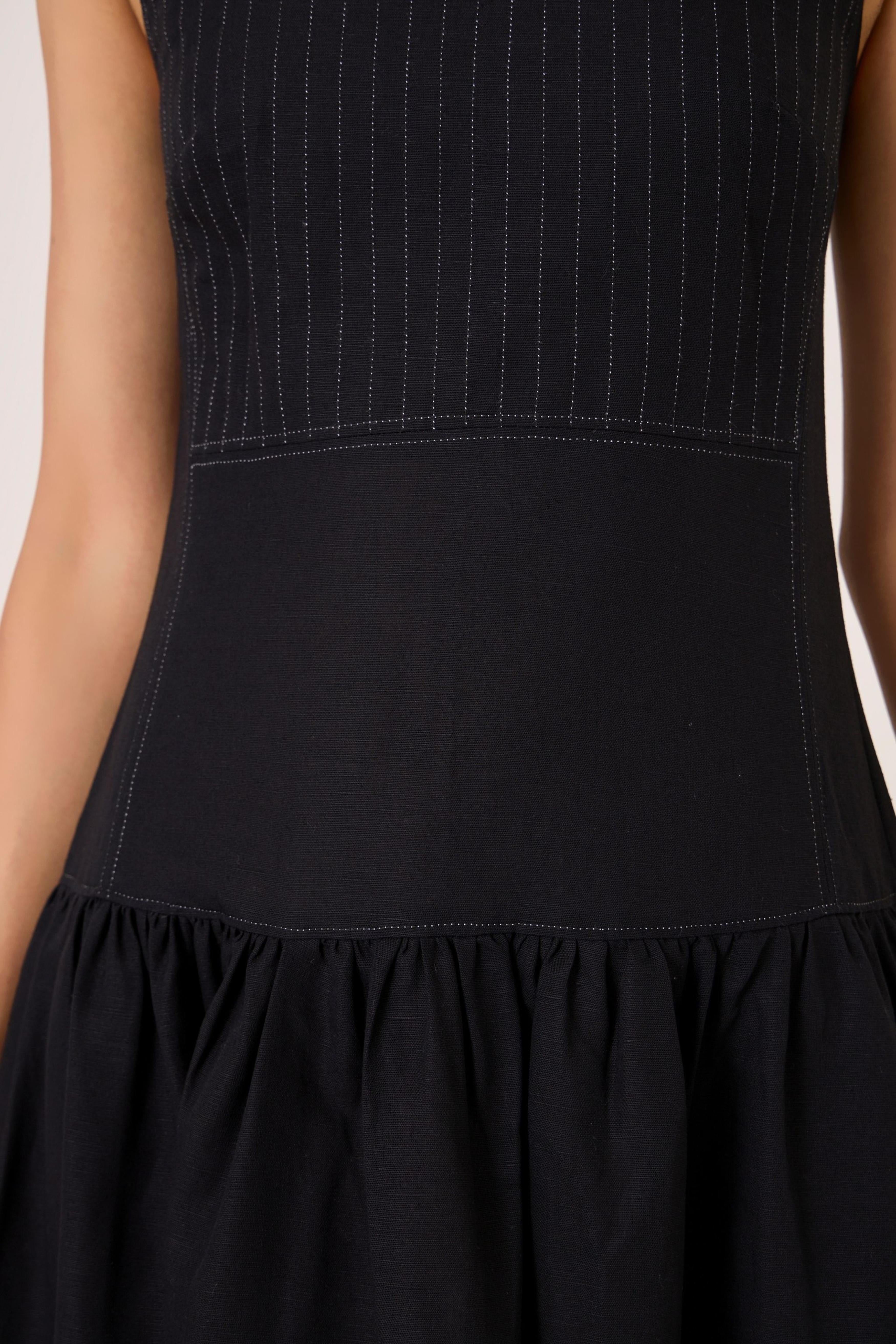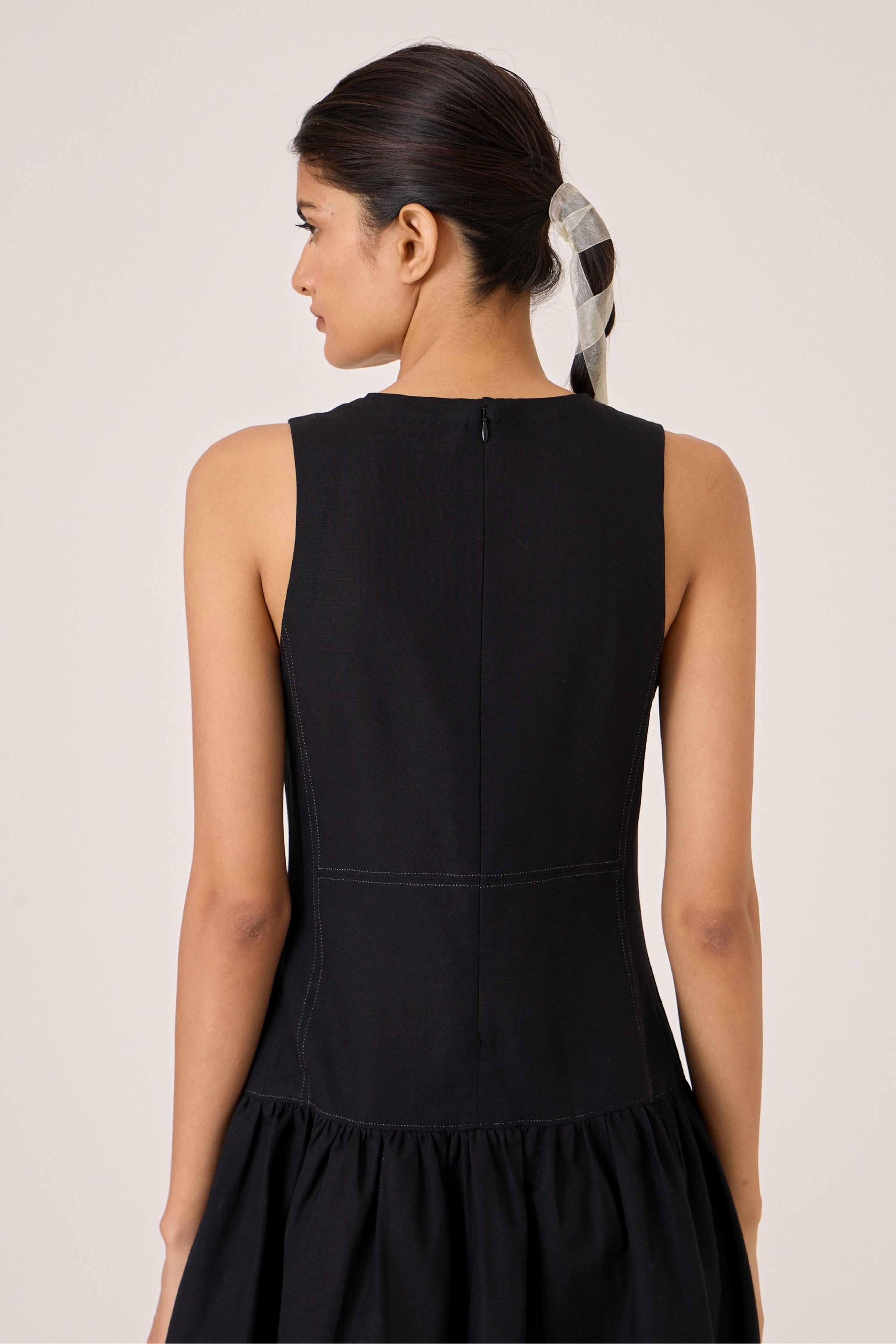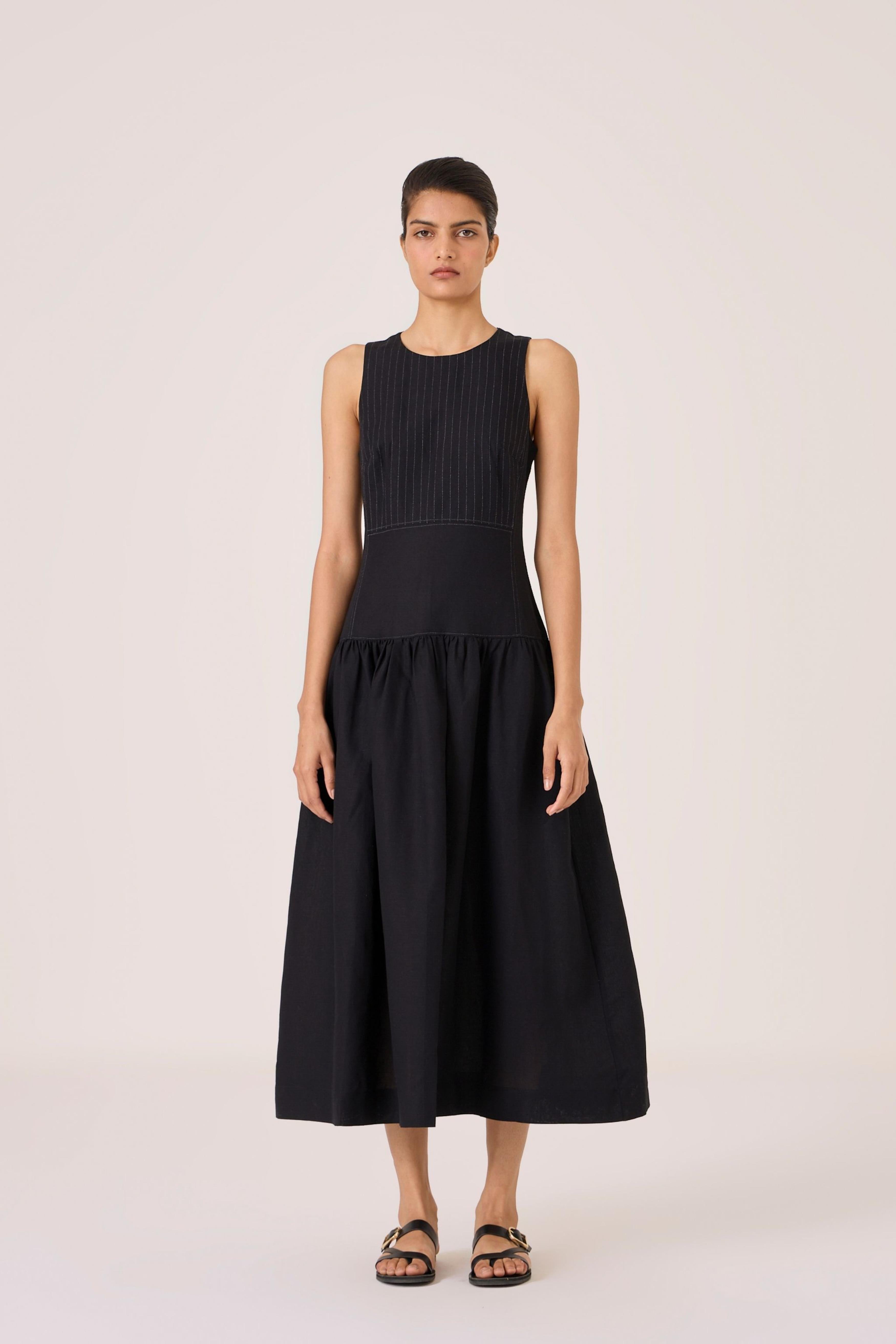 - Long black dress - Sleeveless with gusset - Contrast quilting on square yoke - Added drop waist - Back zip - In-seam pockets