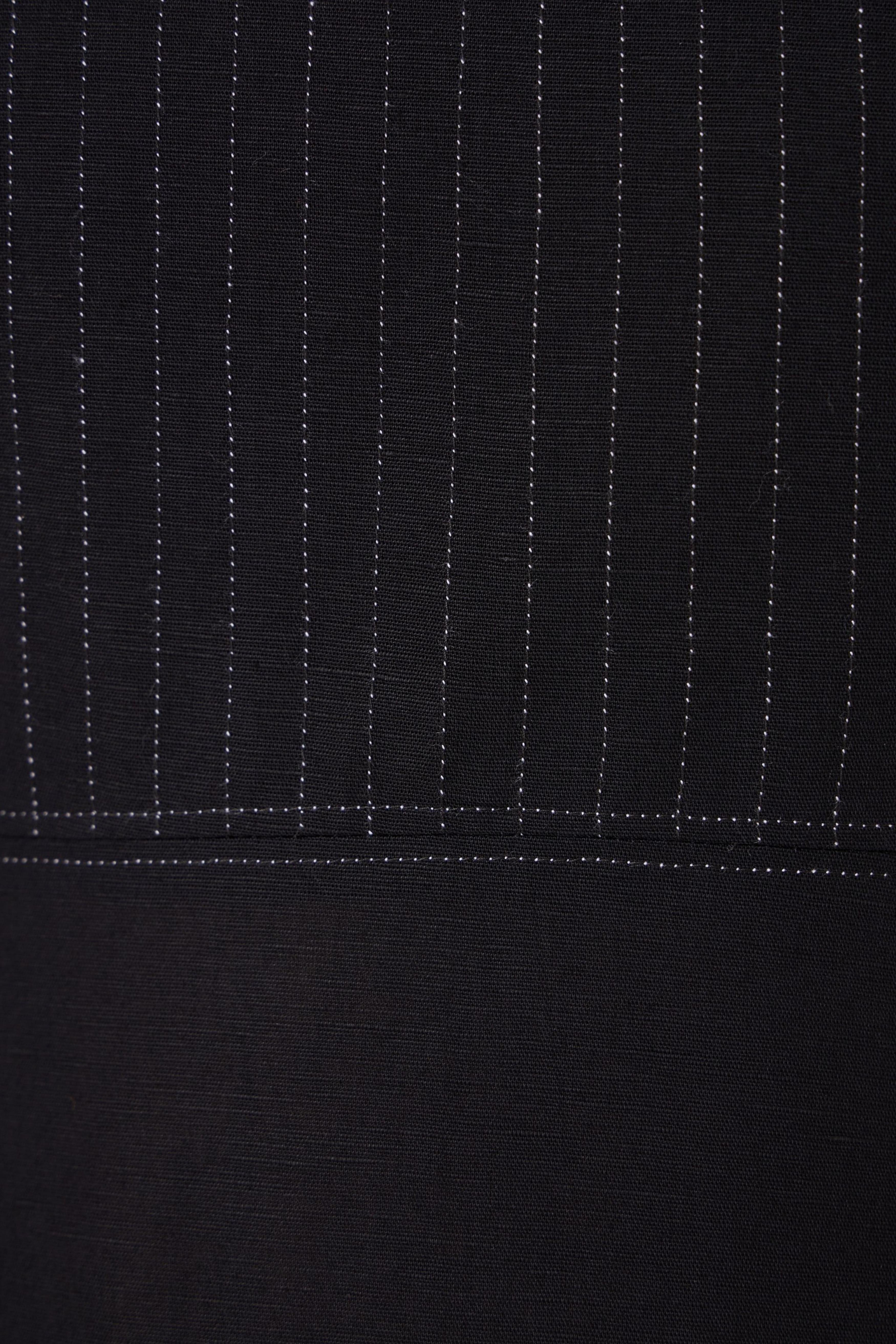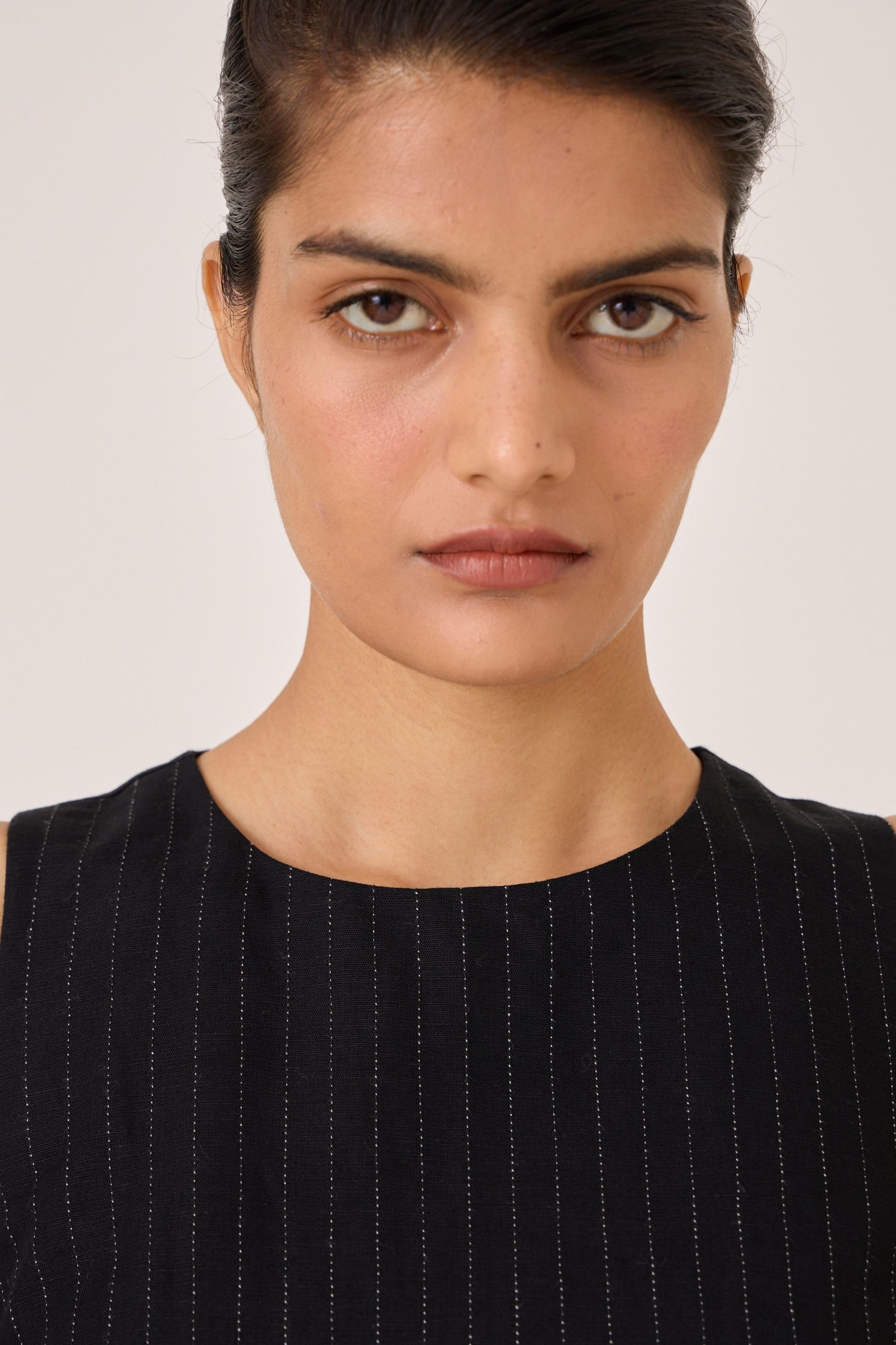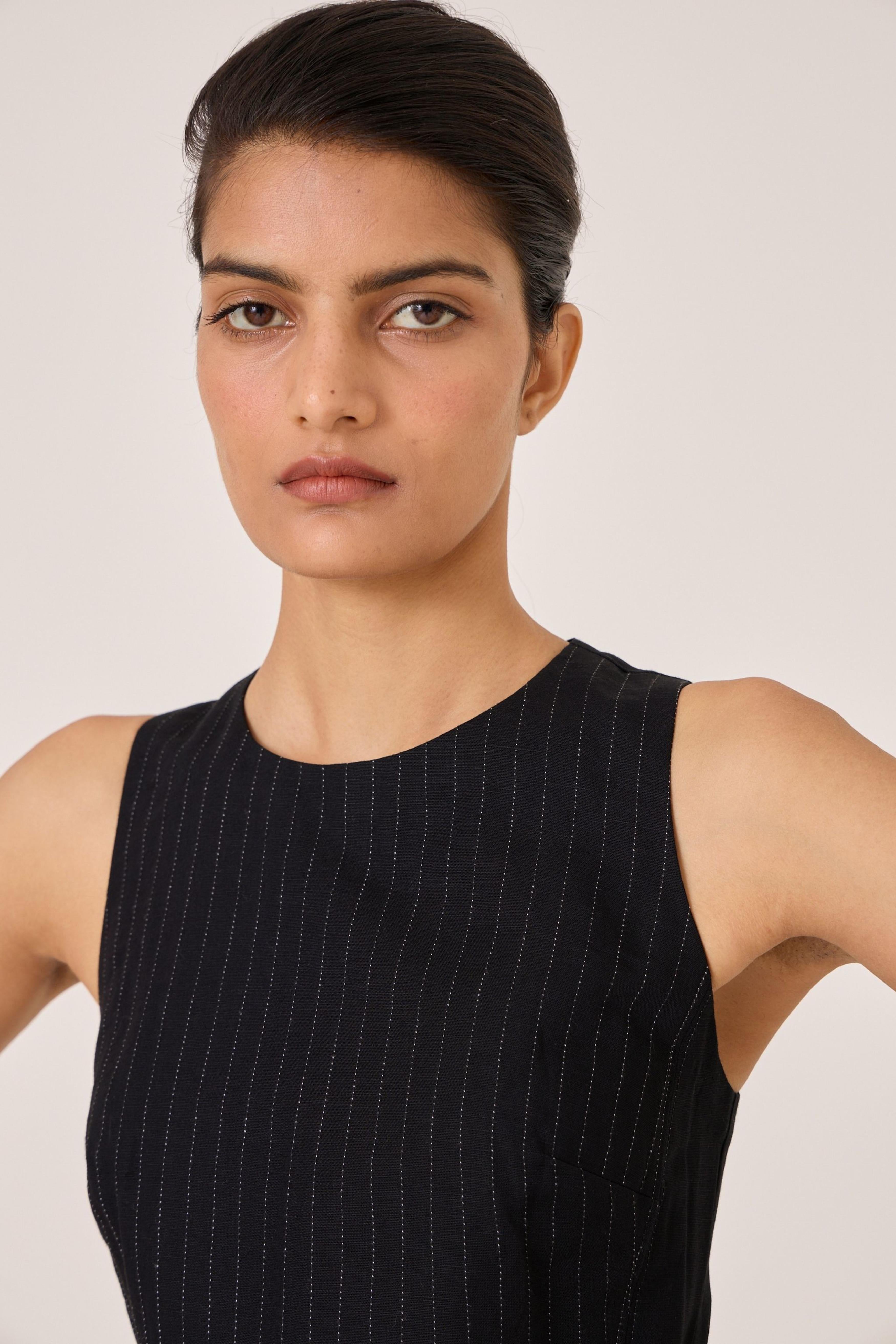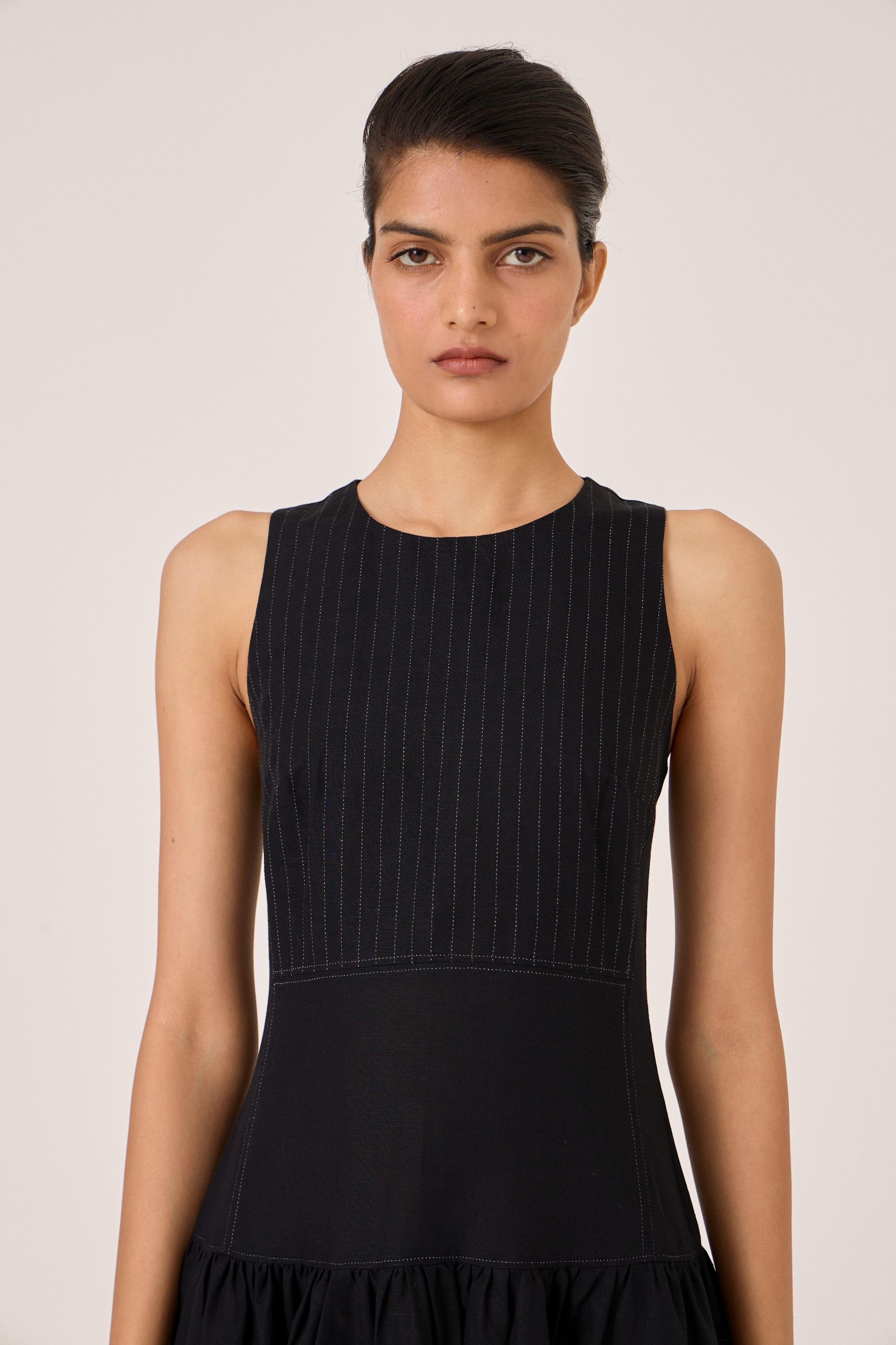 - Long black dress - Sleeveless with gusset - Contrast quilting on square yoke - Added drop waist - Back zip - In-seam pockets