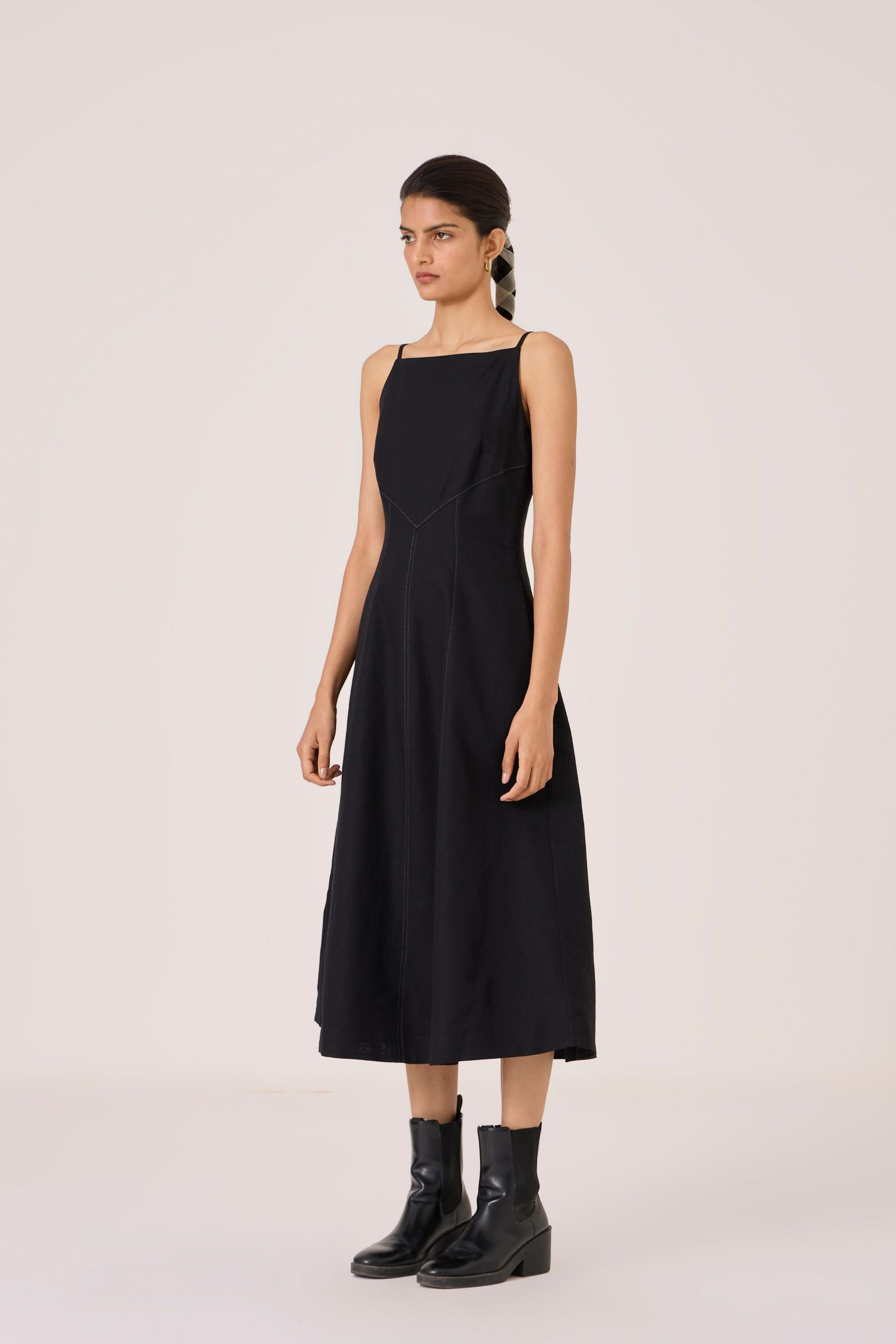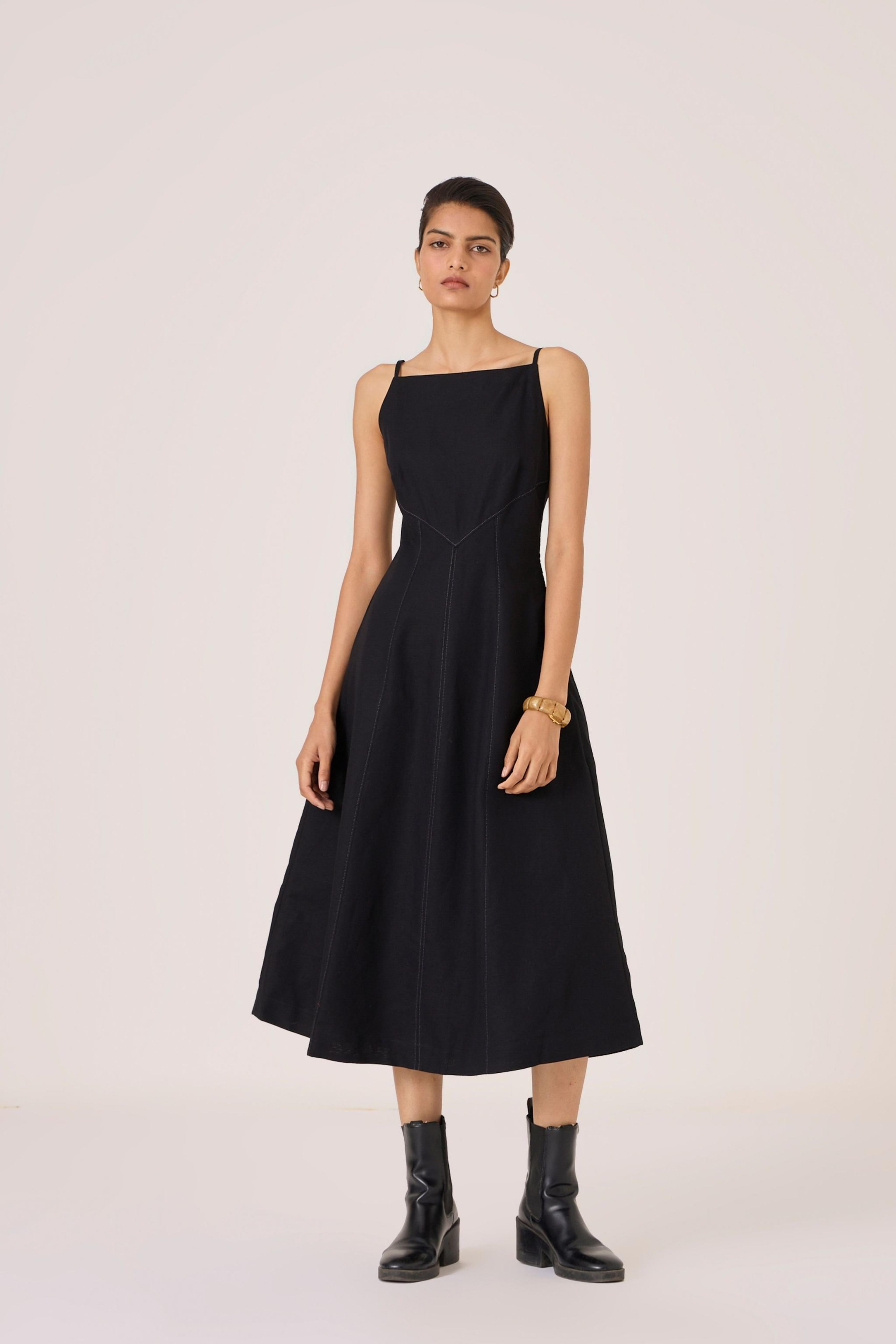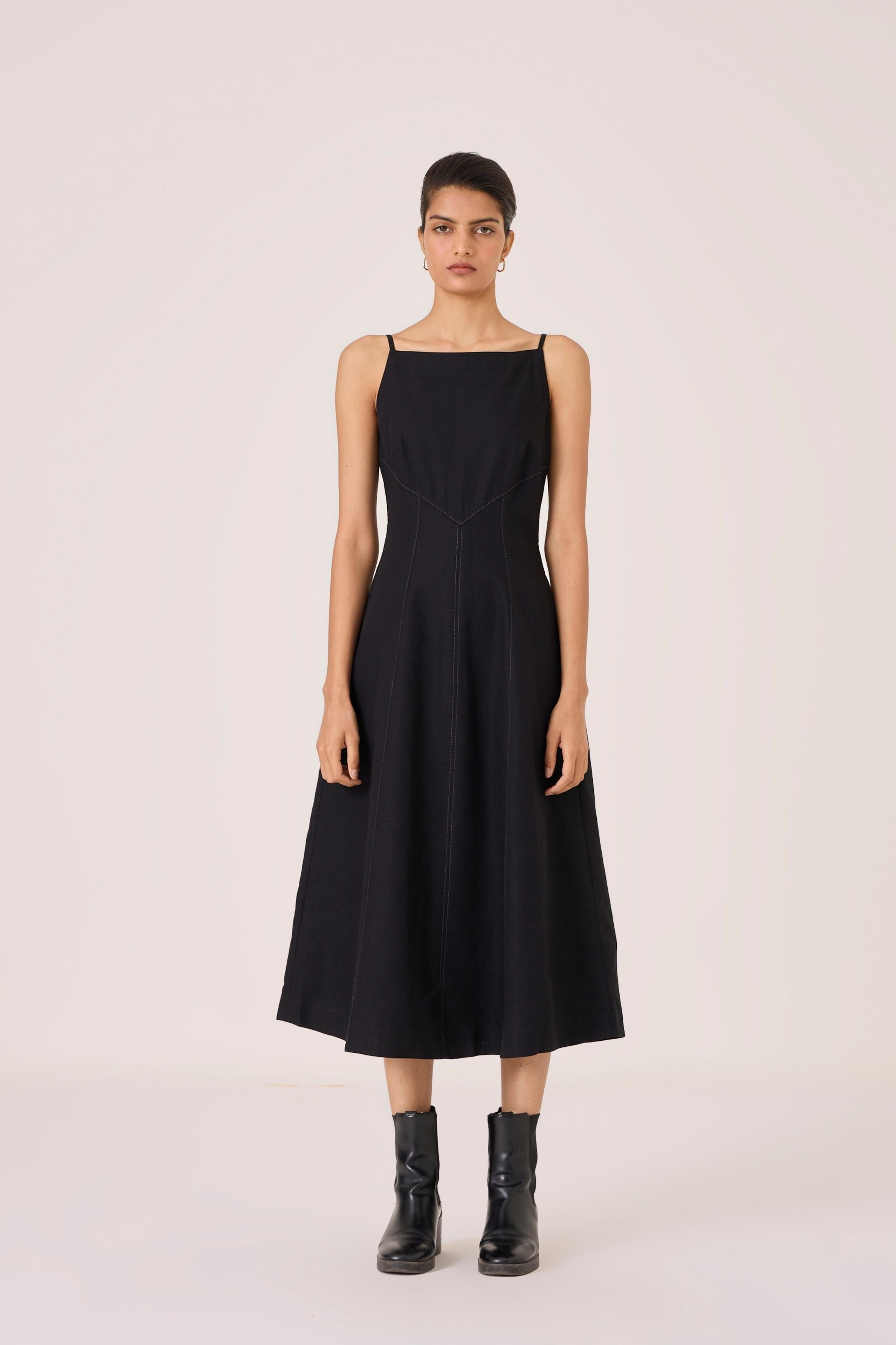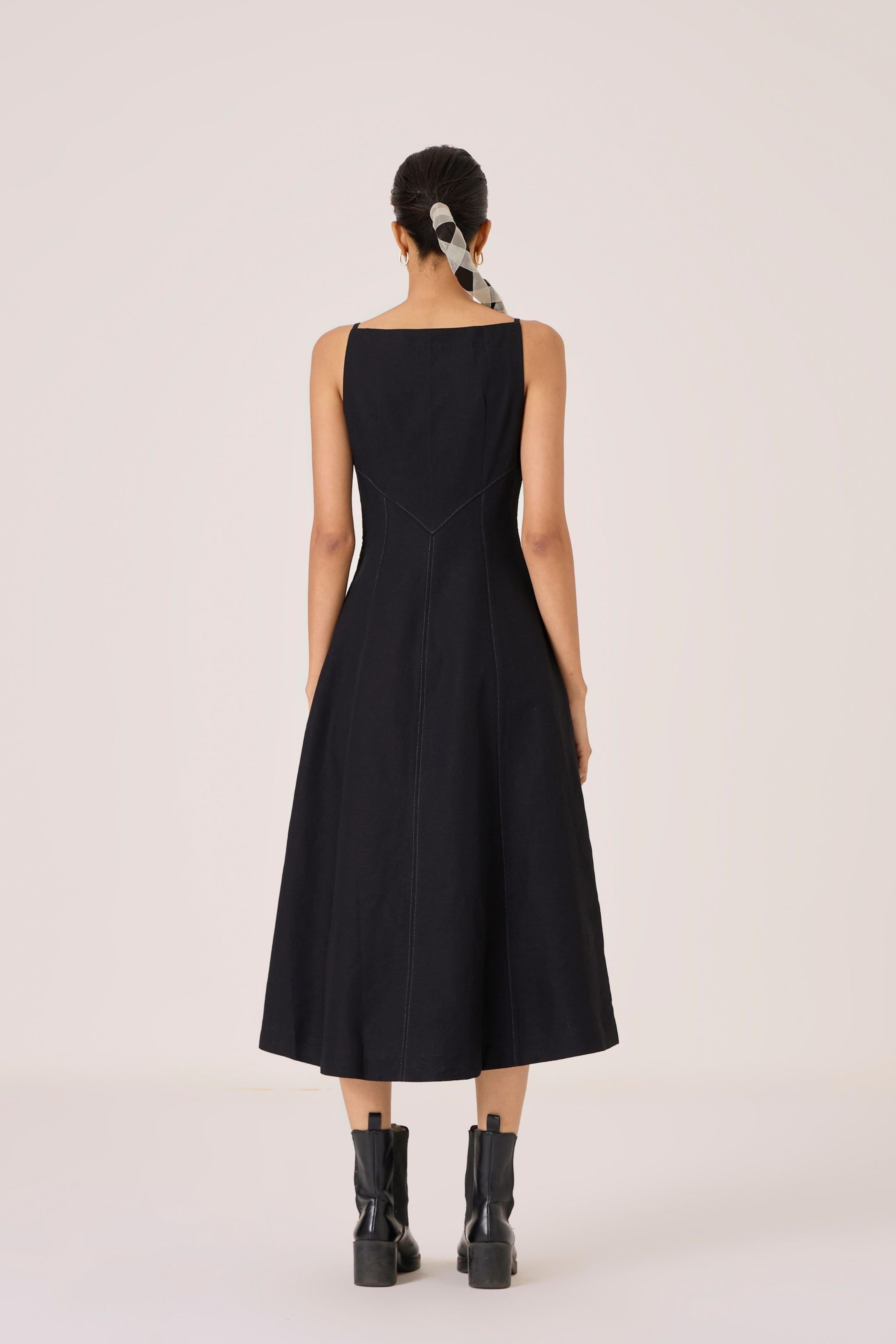 - Classic black midi dress - Fit and gentle flare shape - Sleek square neckline - Fitted bodice with contrast stitch detail - Side zip - In-seam pockets