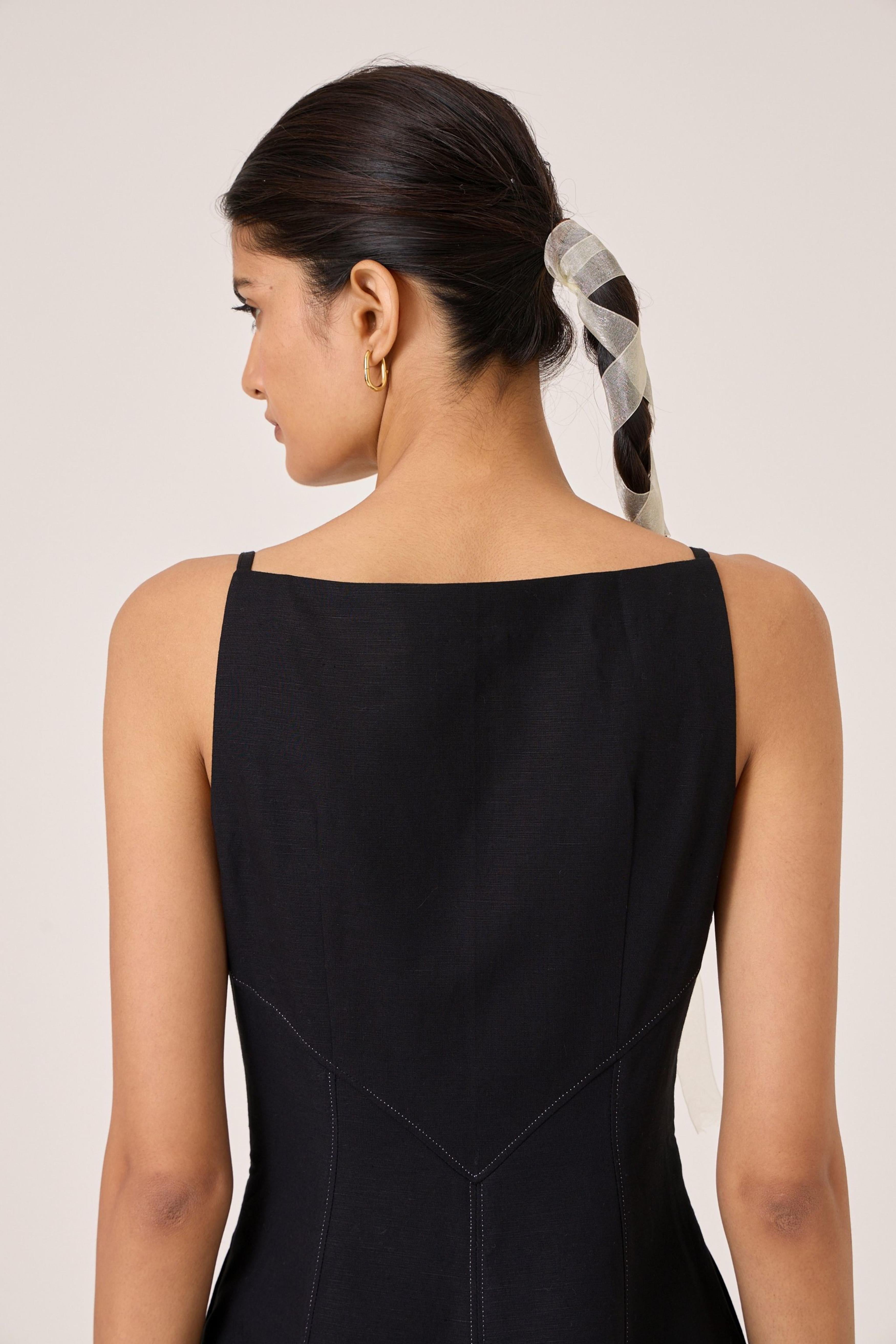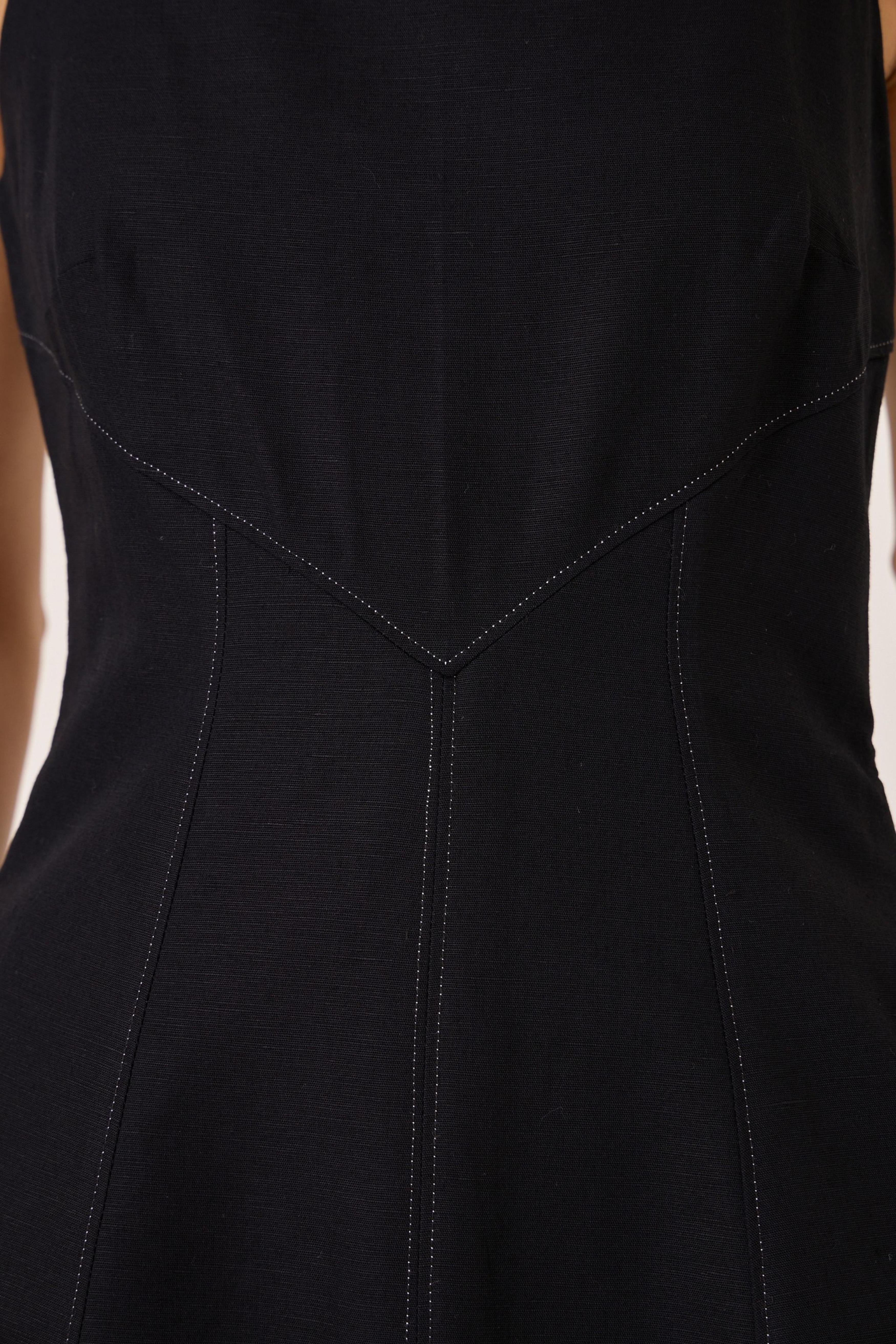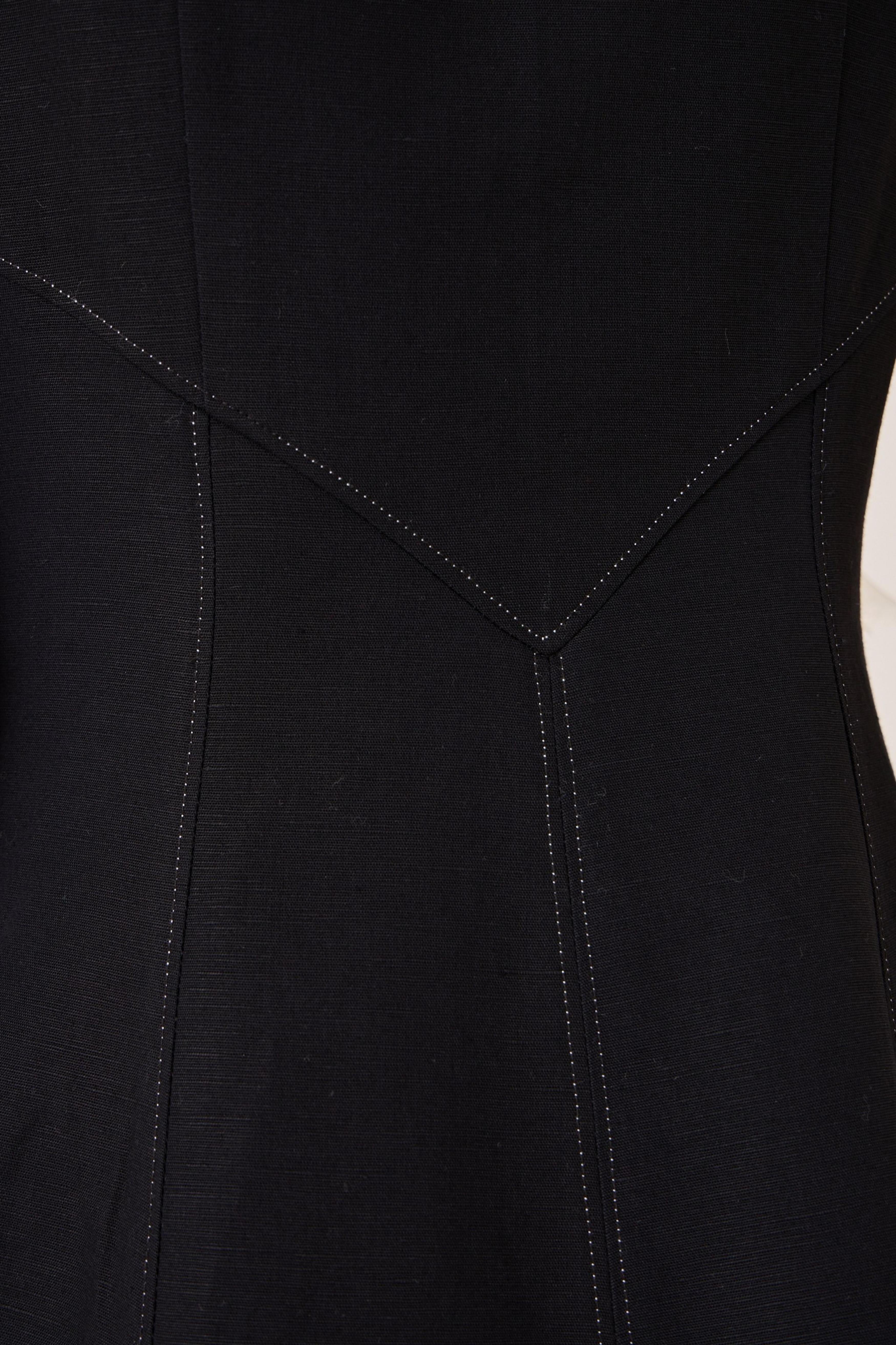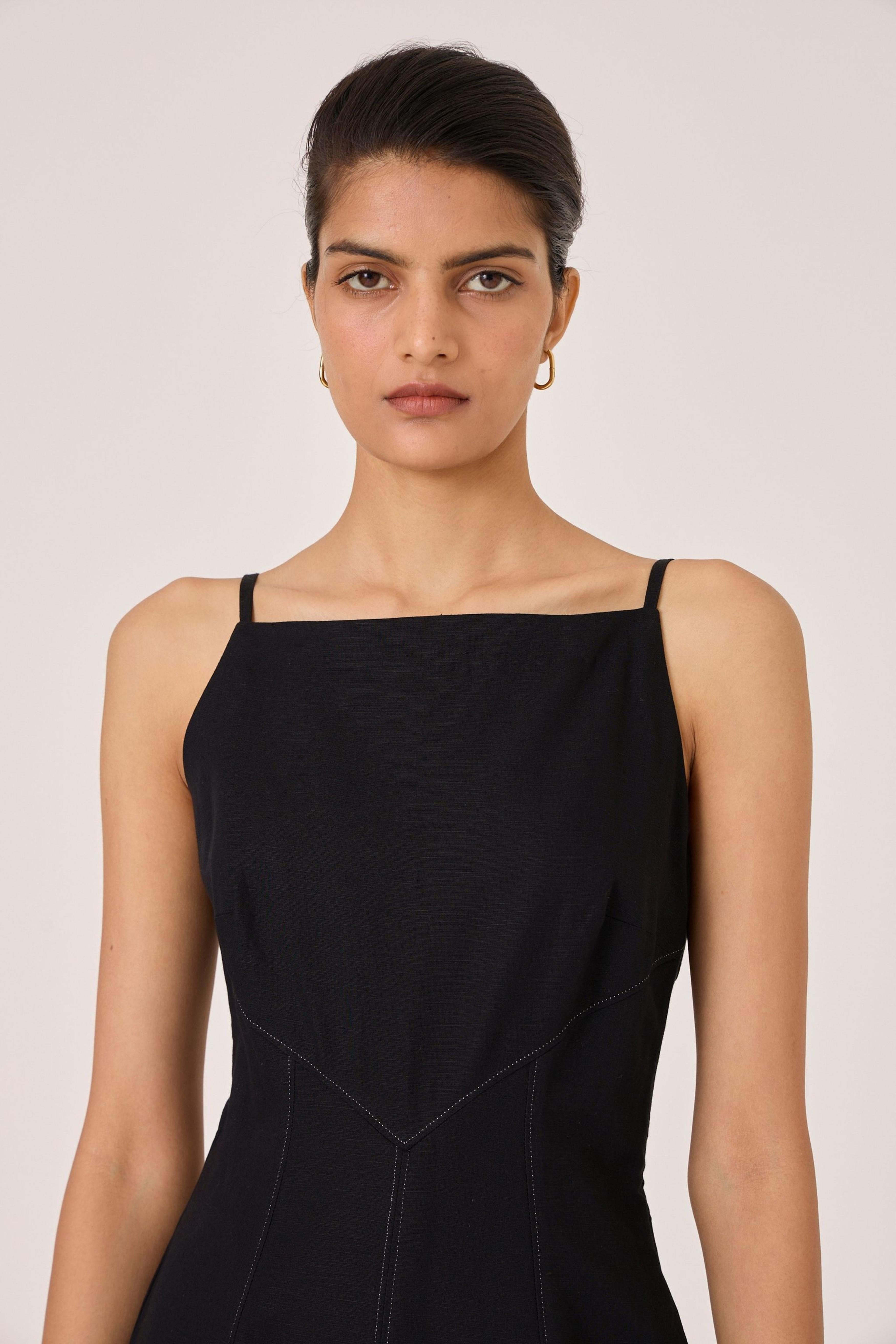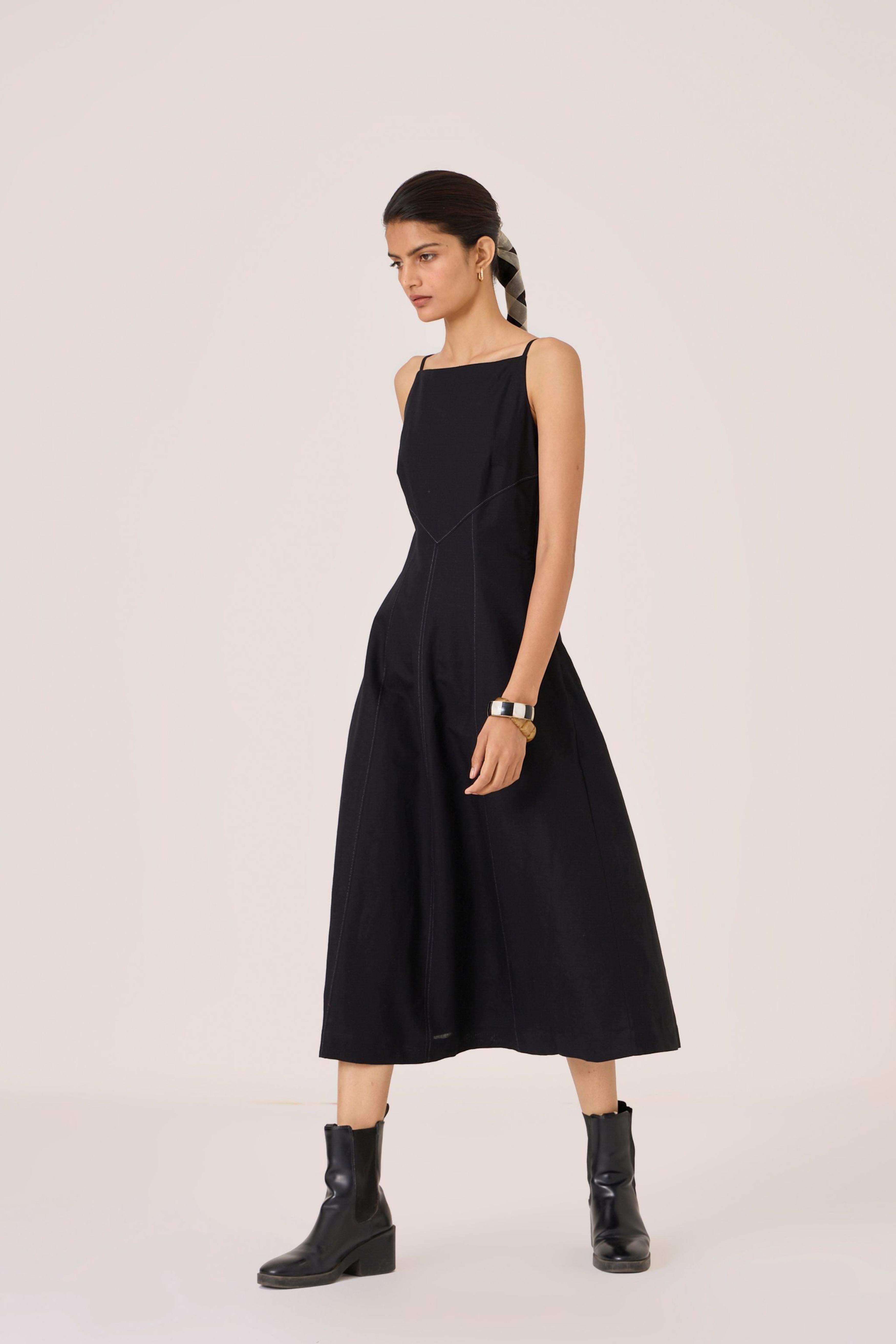 - Classic black midi dress - Fit and gentle flare shape - Sleek square neckline - Fitted bodice with contrast stitch detail - Side zip - In-seam pockets