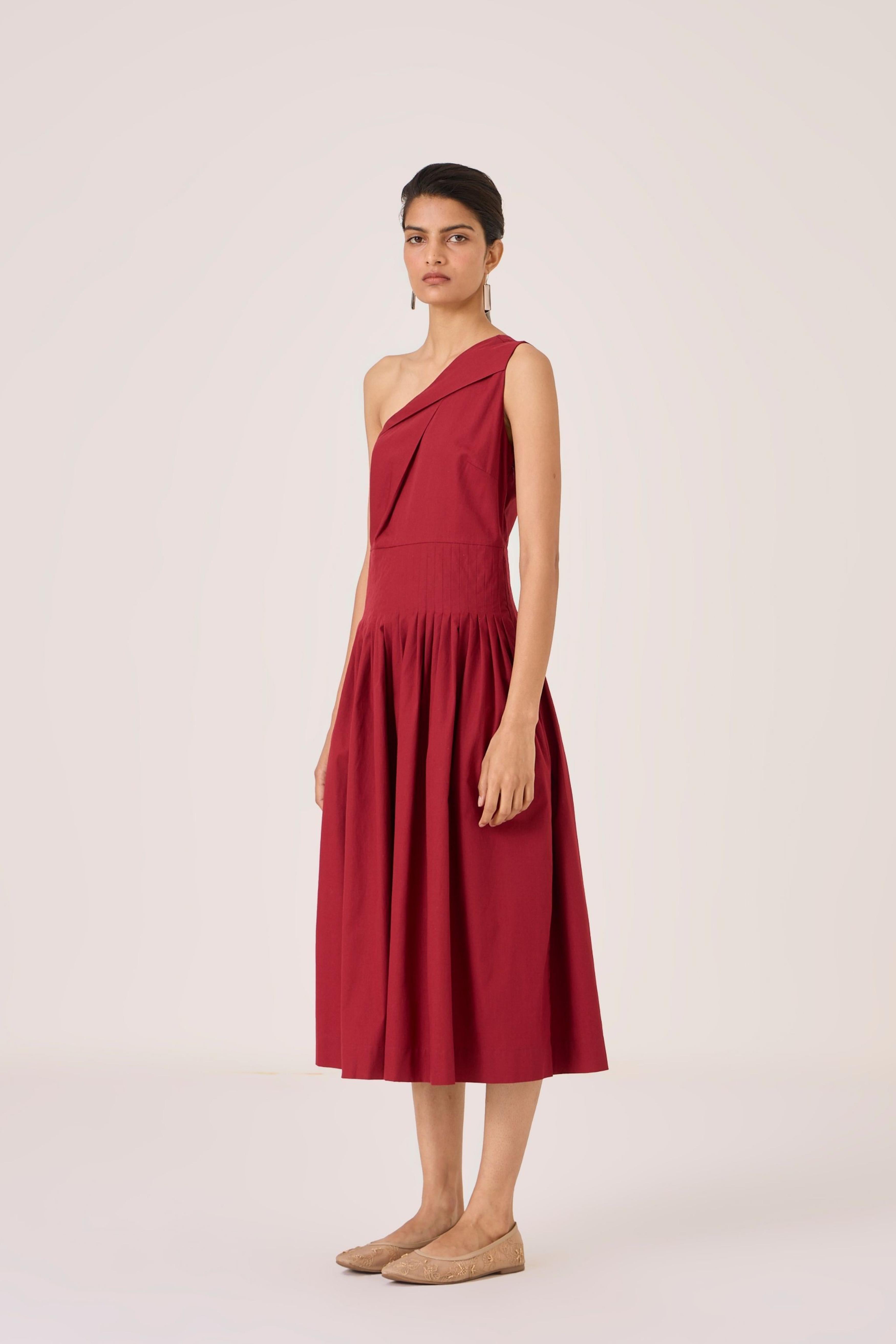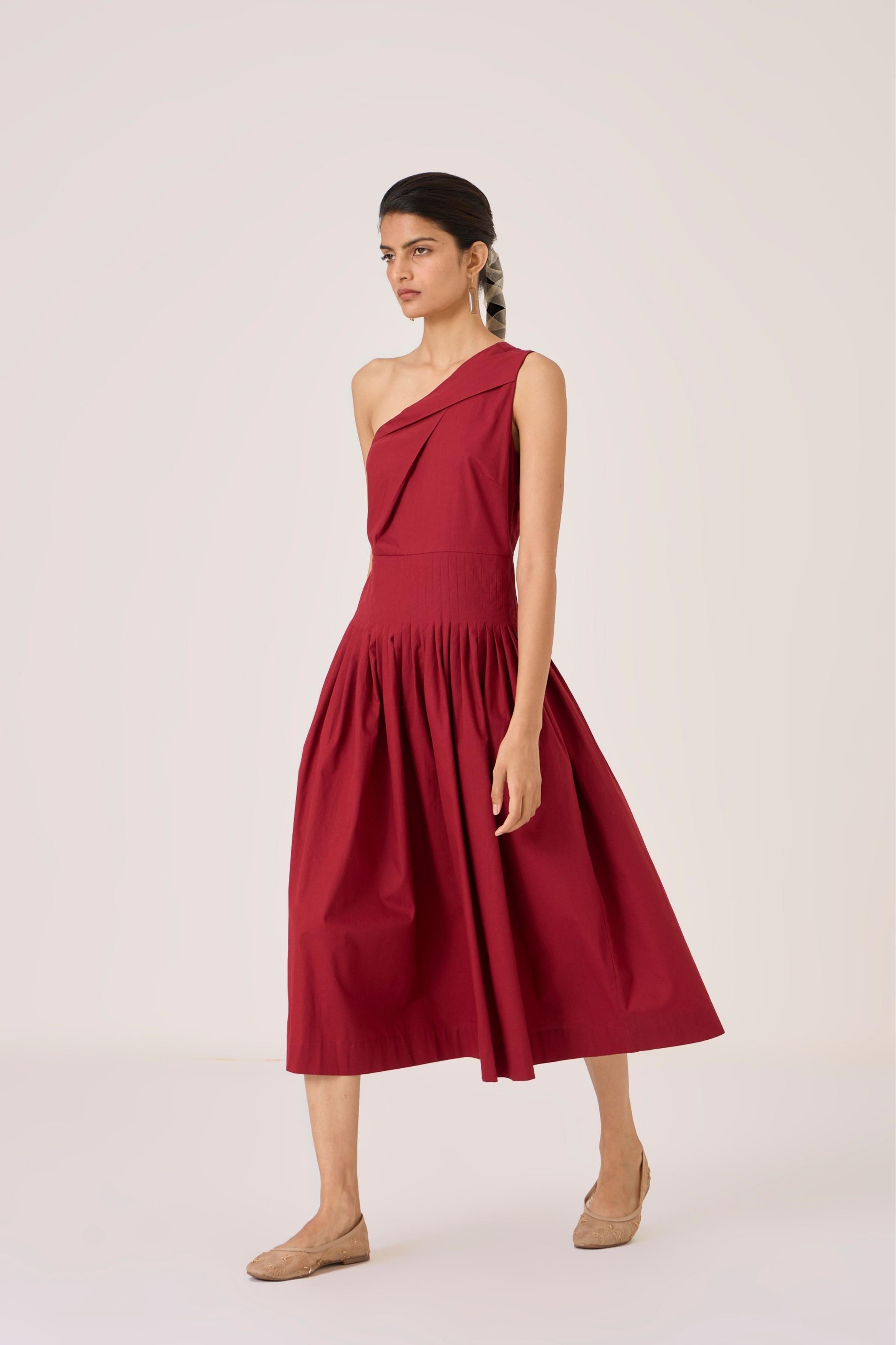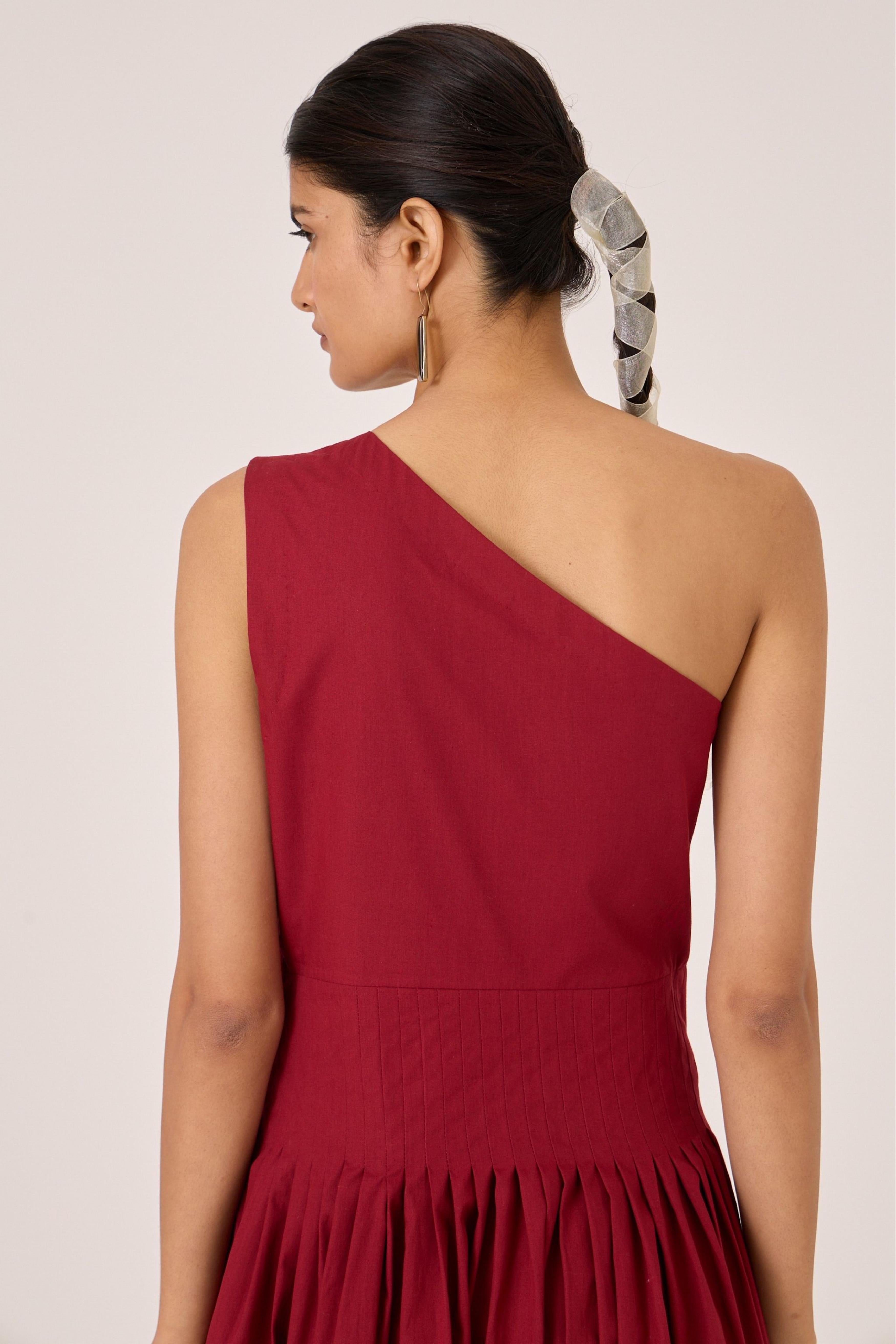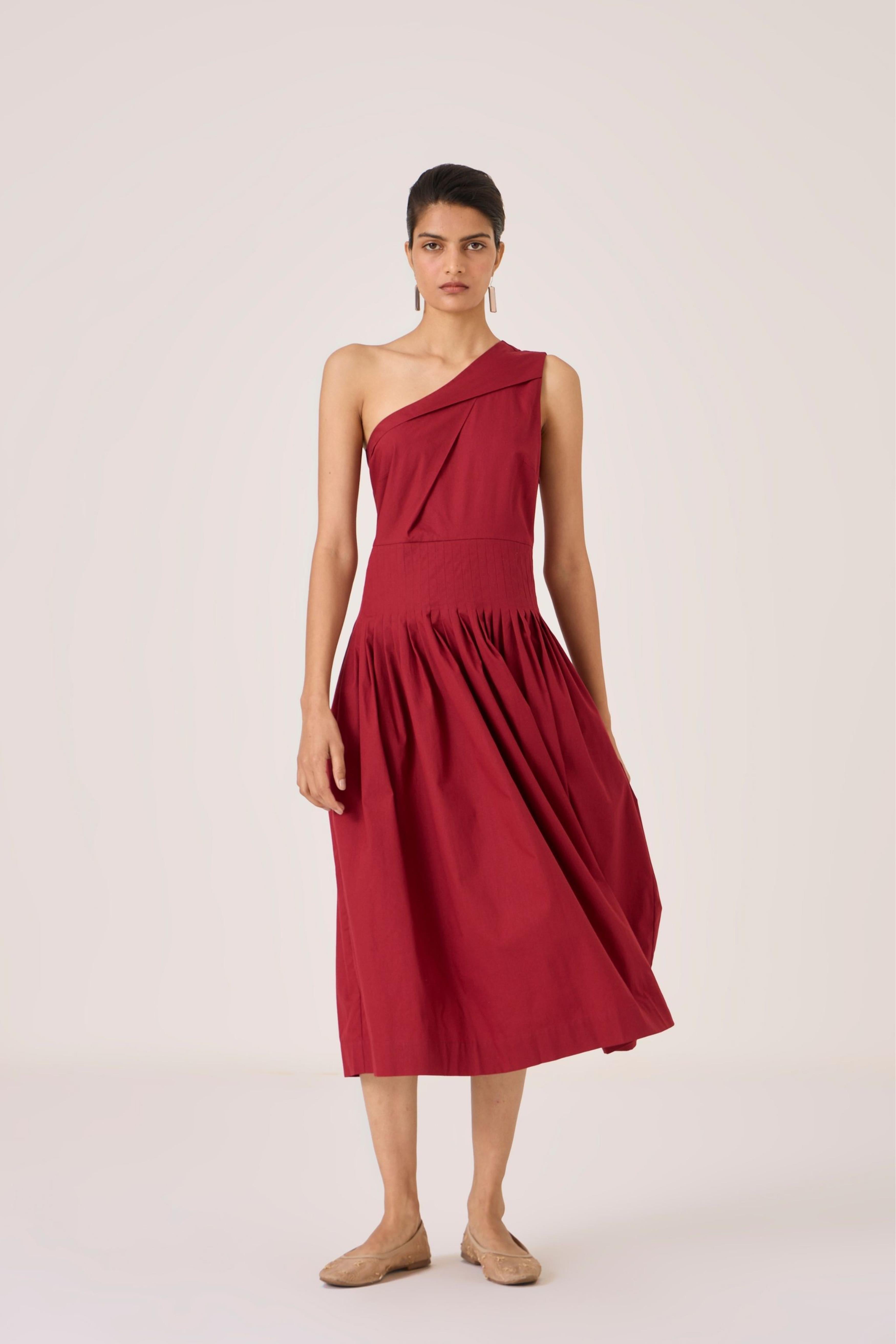 - Perfect for a season of revelries - Made from luxurious organic cotton - One shoulder fit and flare silhouette - Angular pleat detail over neckline - Sharply tailored pintuck waistline - Side zip - In-seam pockets