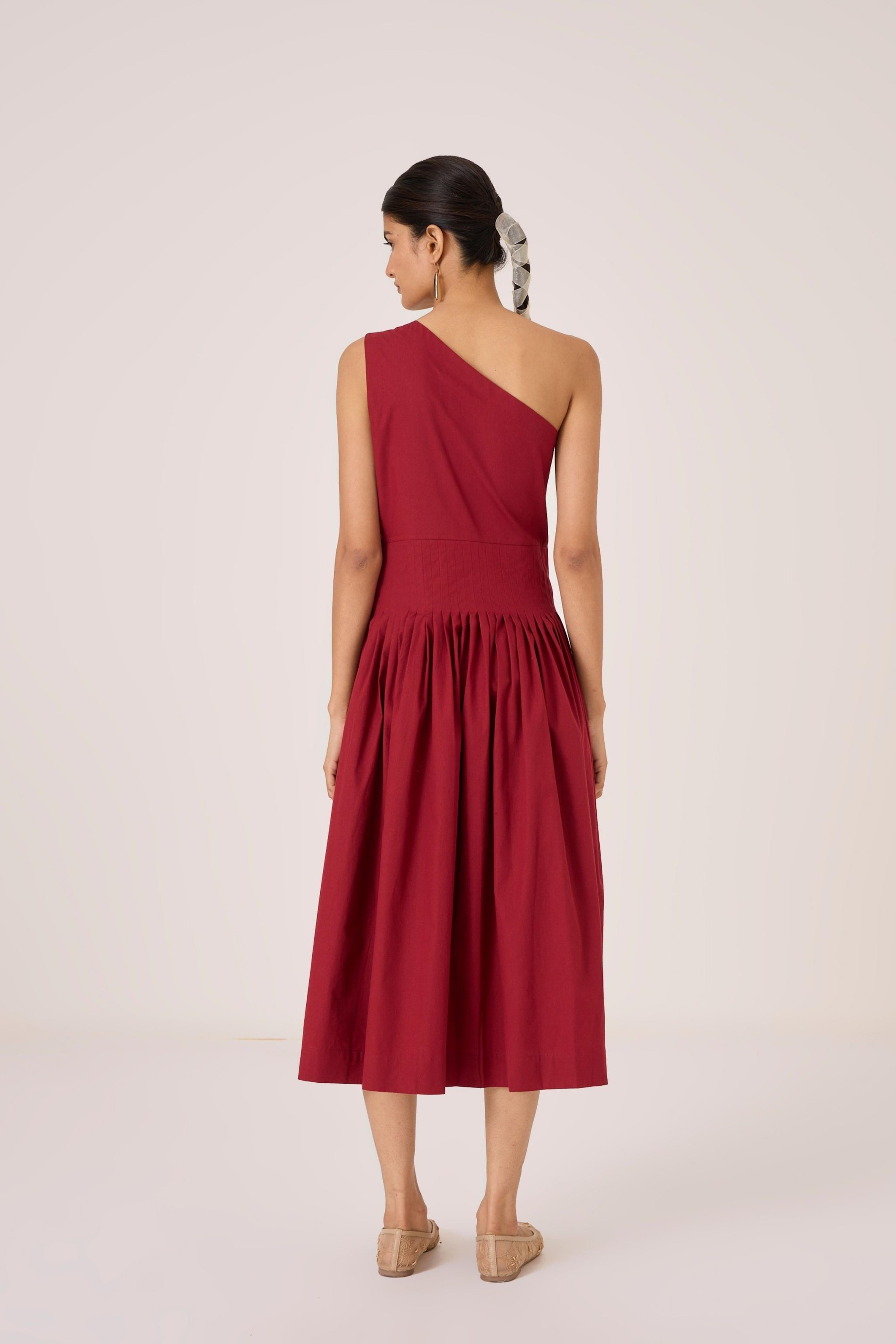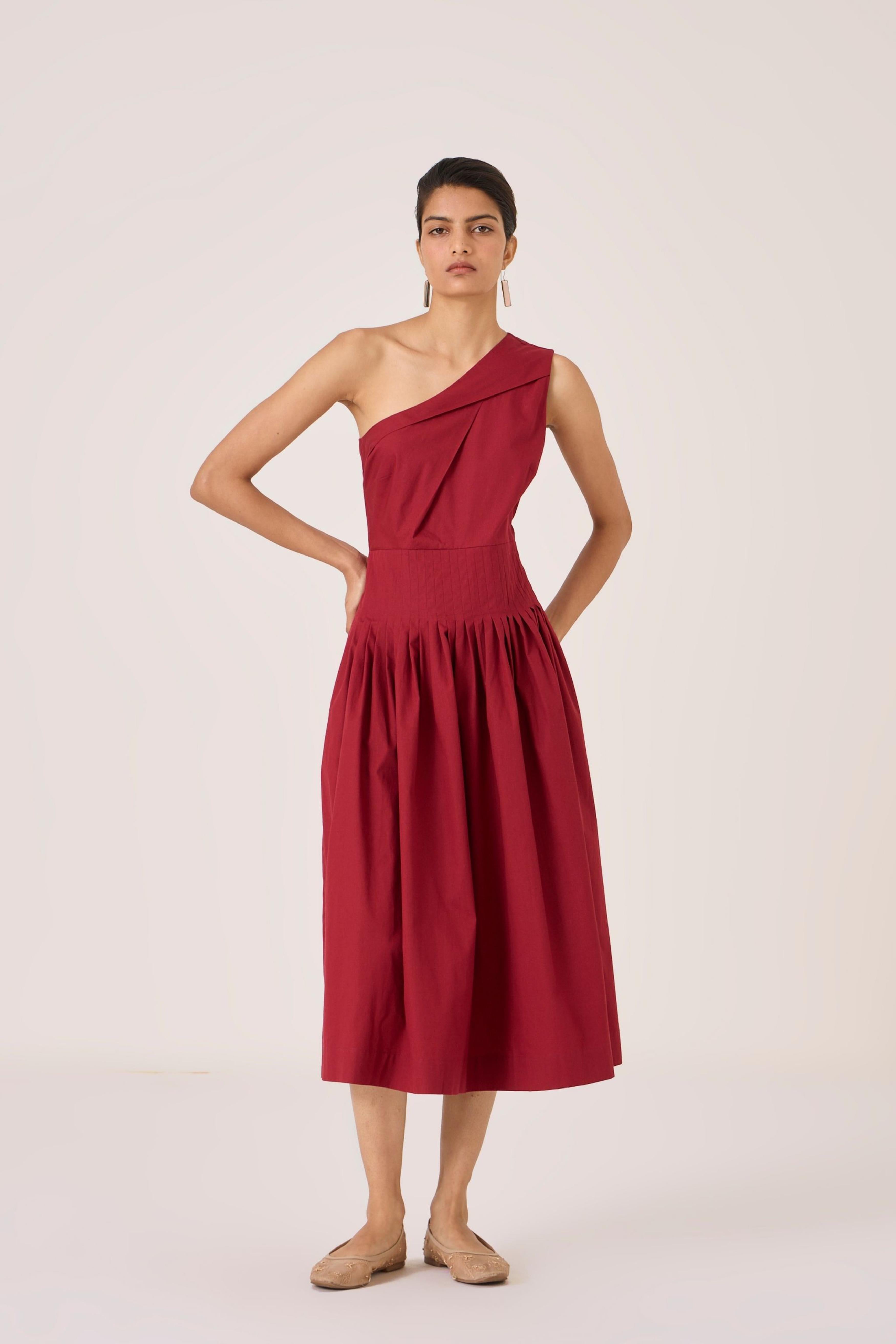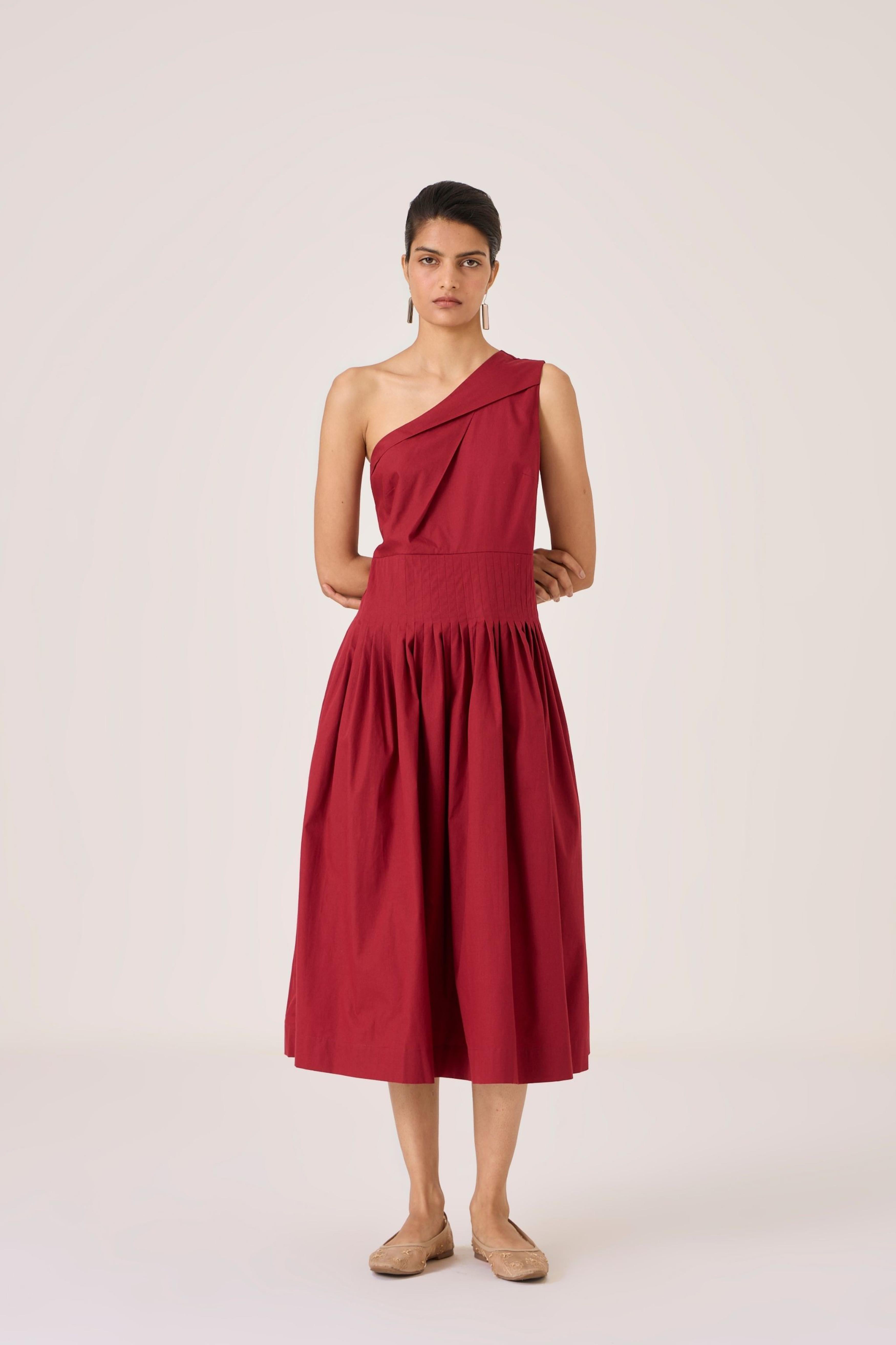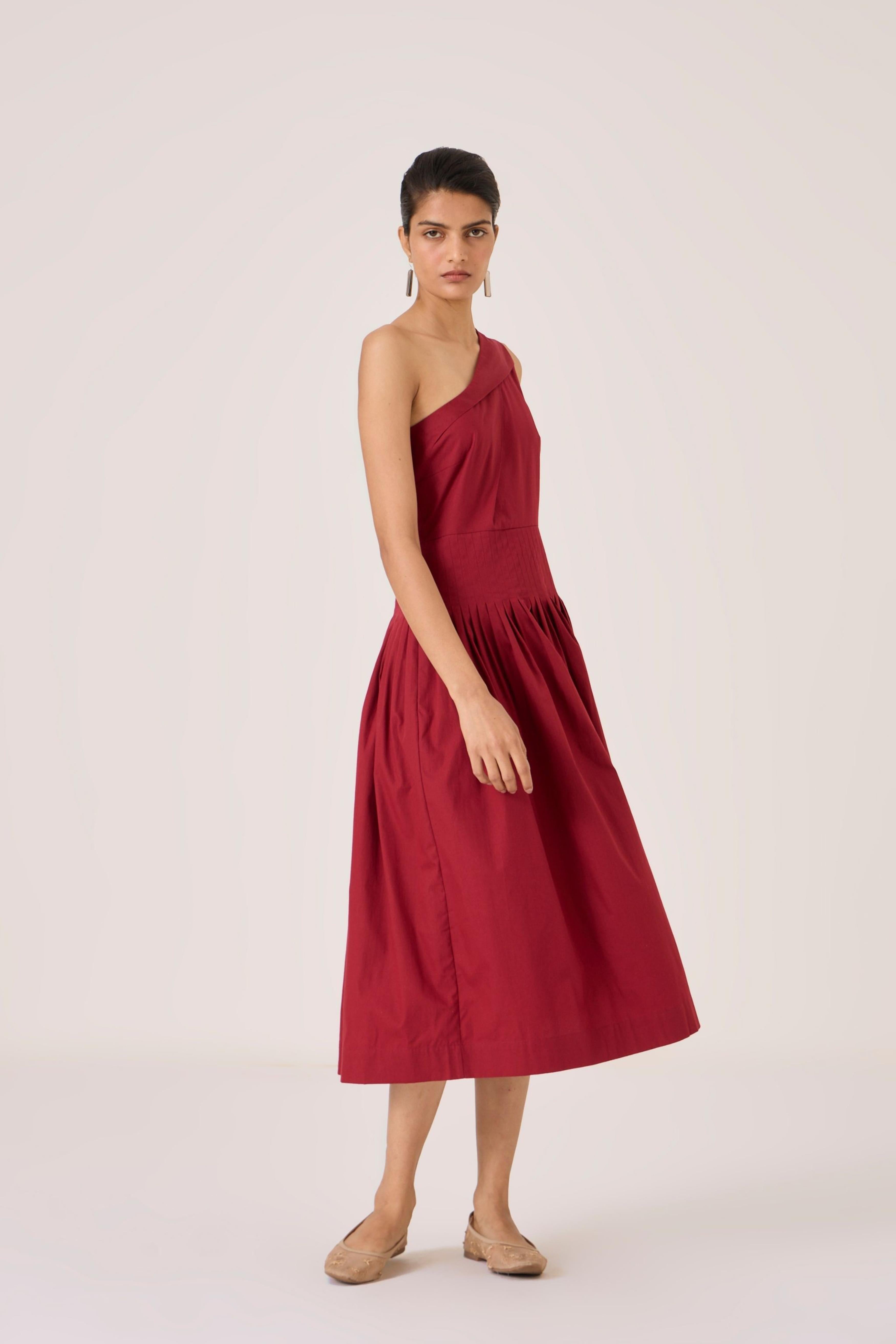 - Perfect for a season of revelries - Made from luxurious organic cotton - One shoulder fit and flare silhouette - Angular pleat detail over neckline - Sharply tailored pintuck waistline - Side zip - In-seam pockets