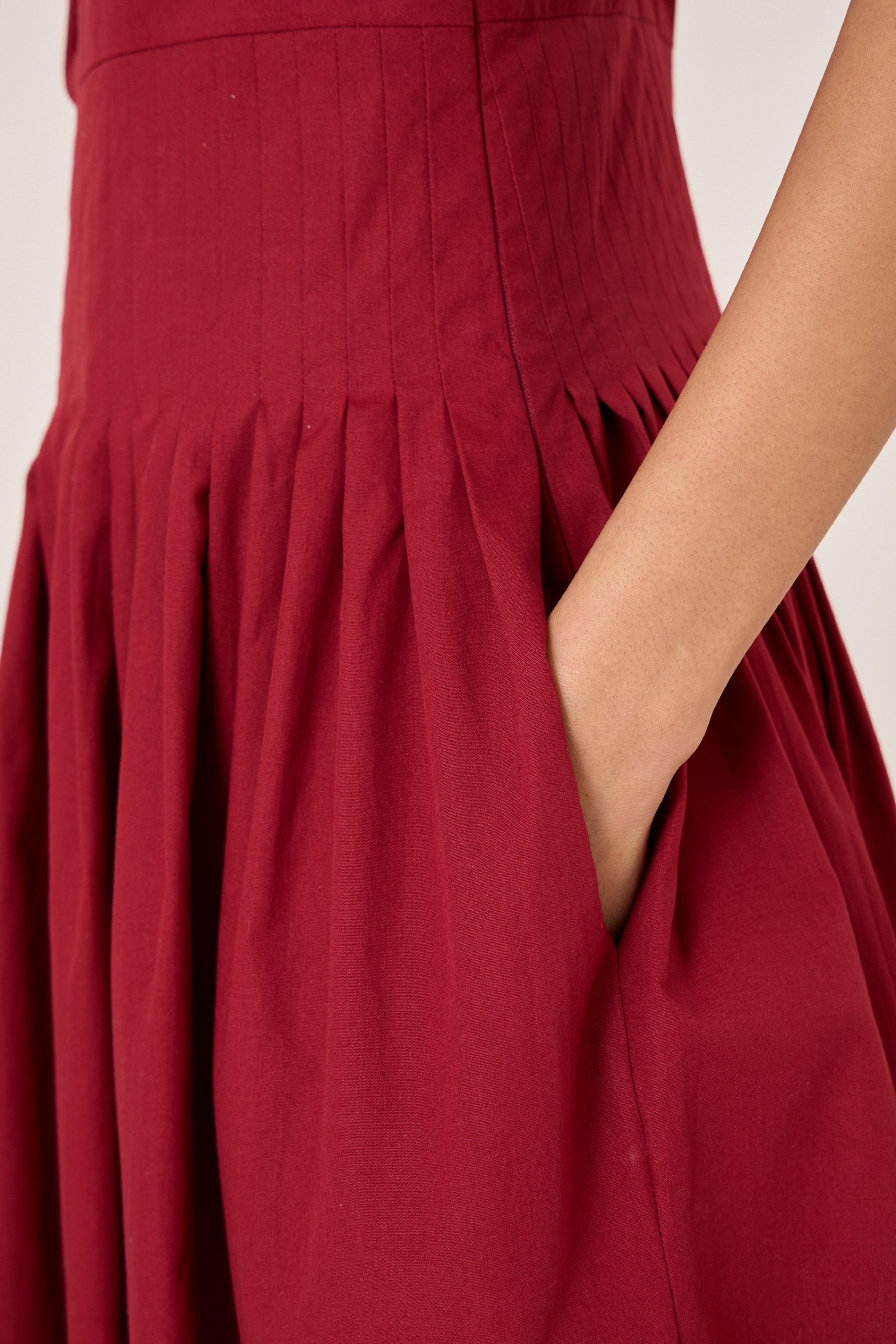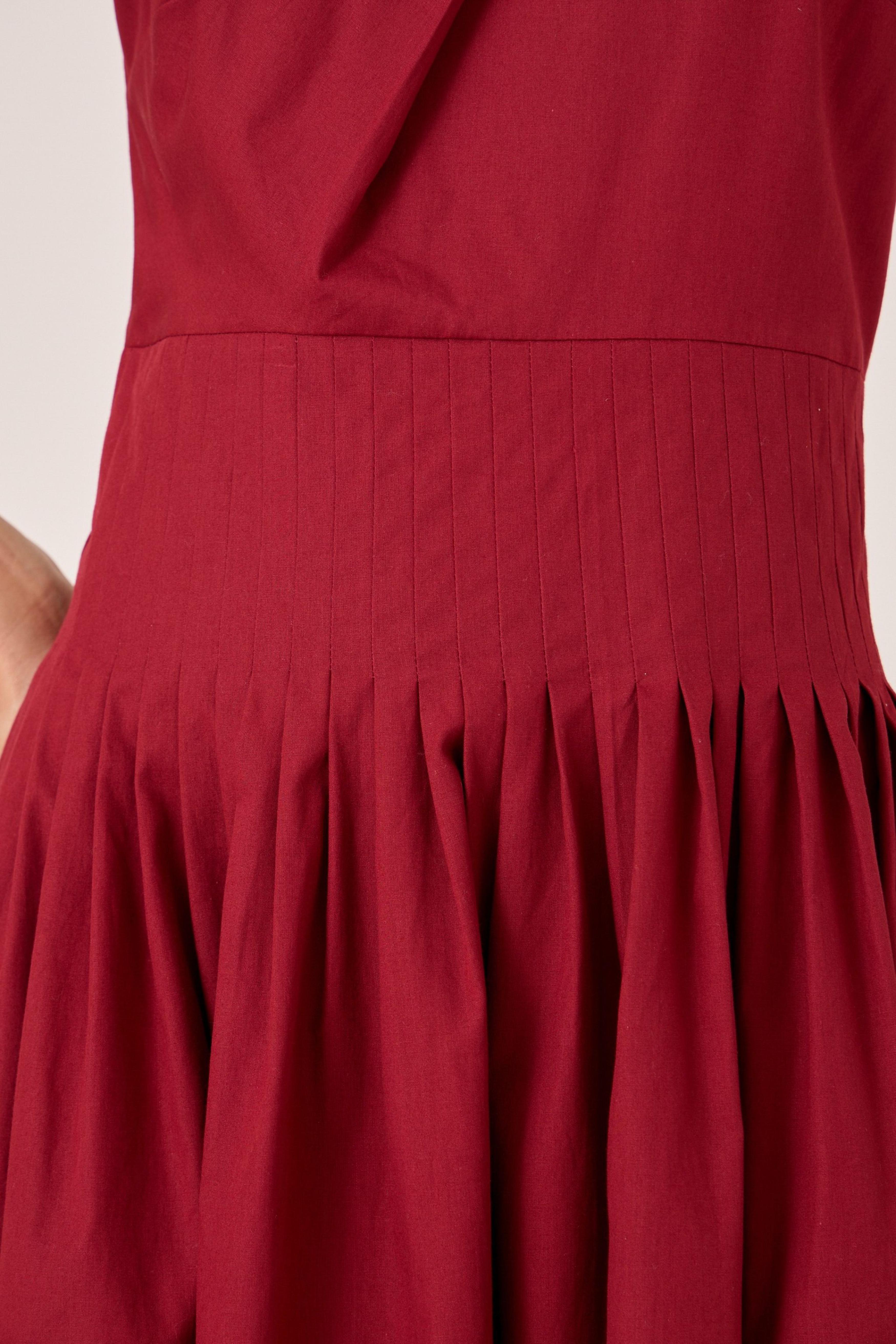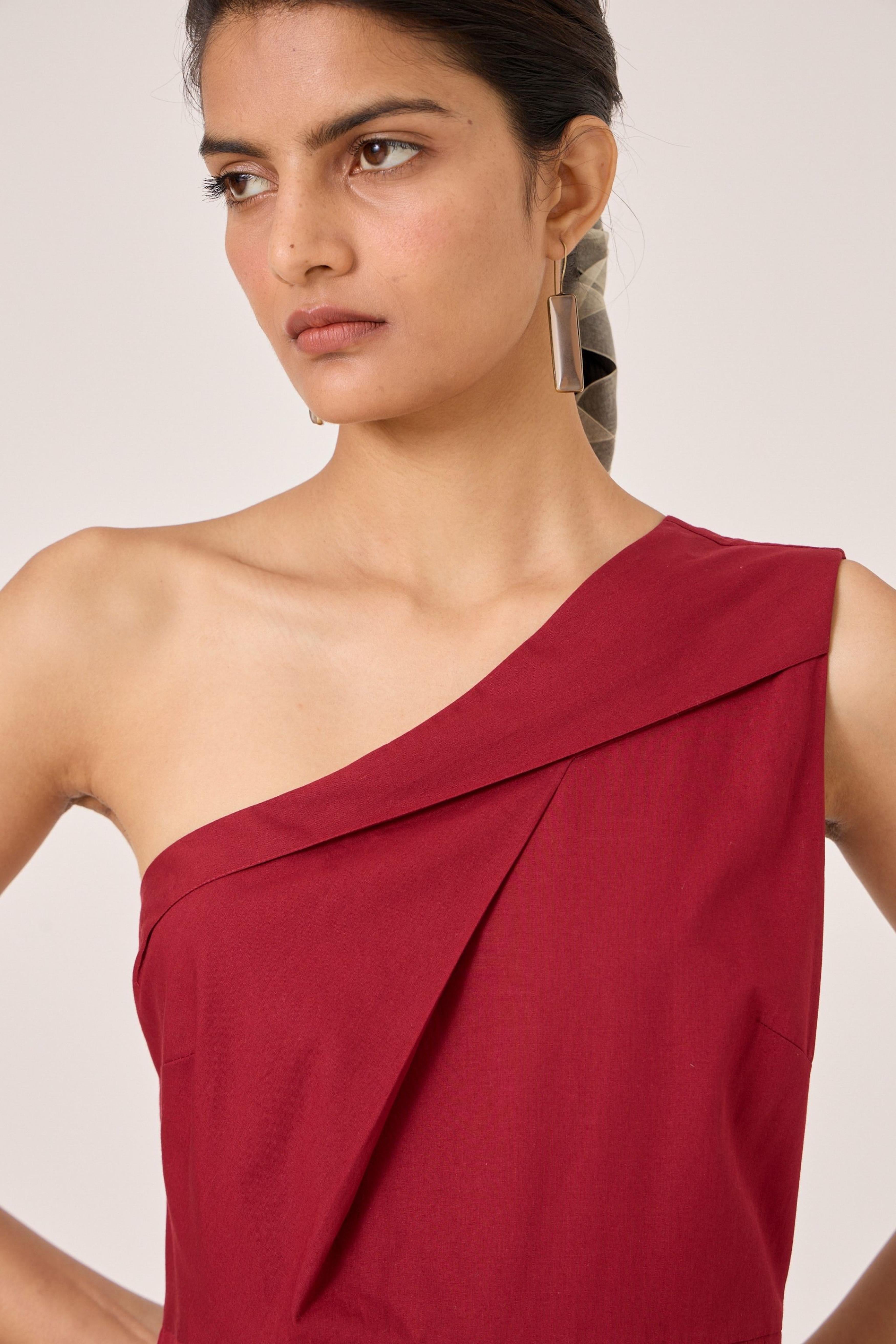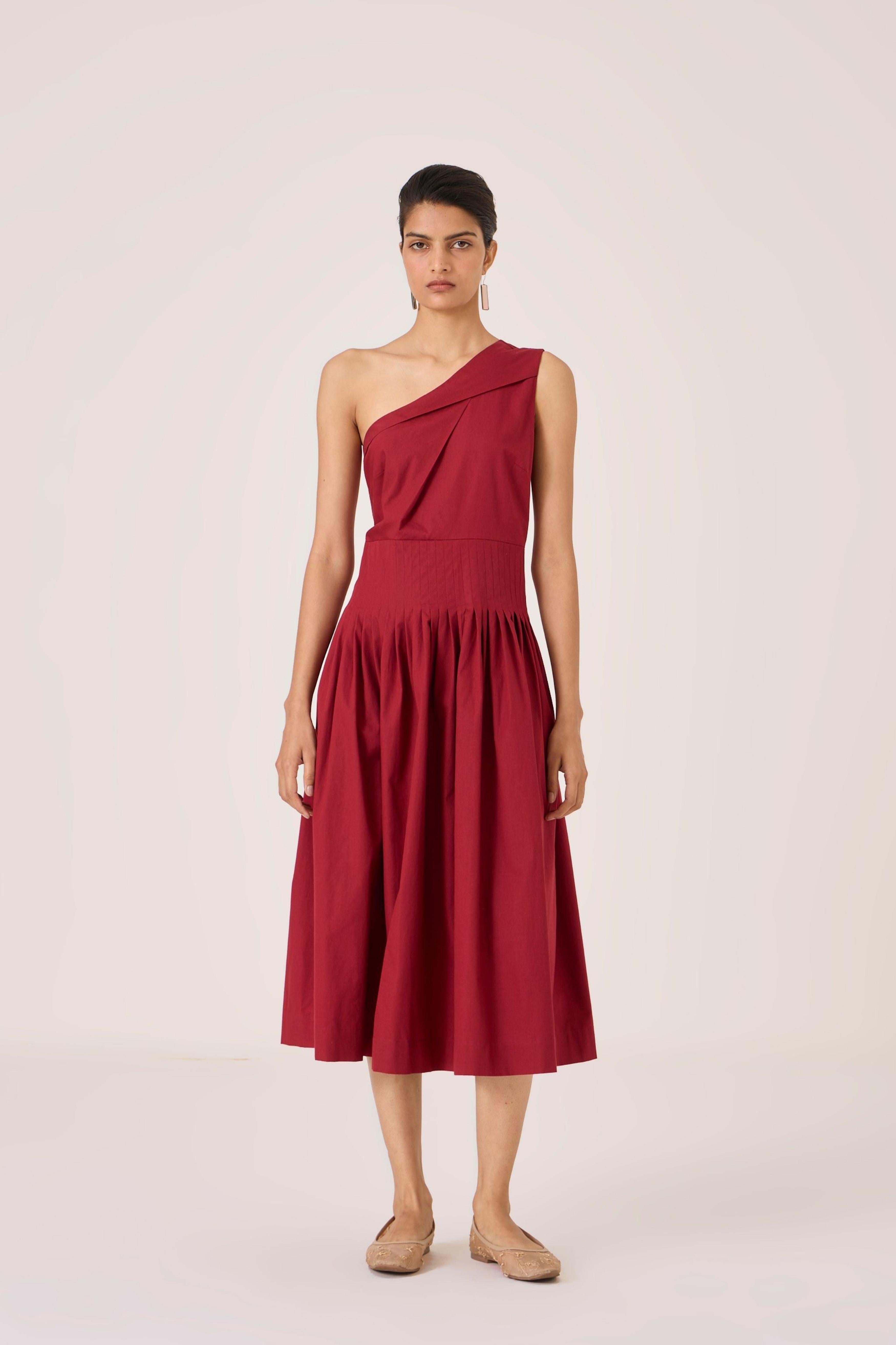 - Perfect for a season of revelries - Made from luxurious organic cotton - One shoulder fit and flare silhouette - Angular pleat detail over neckline - Sharply tailored pintuck waistline - Side zip - In-seam pockets