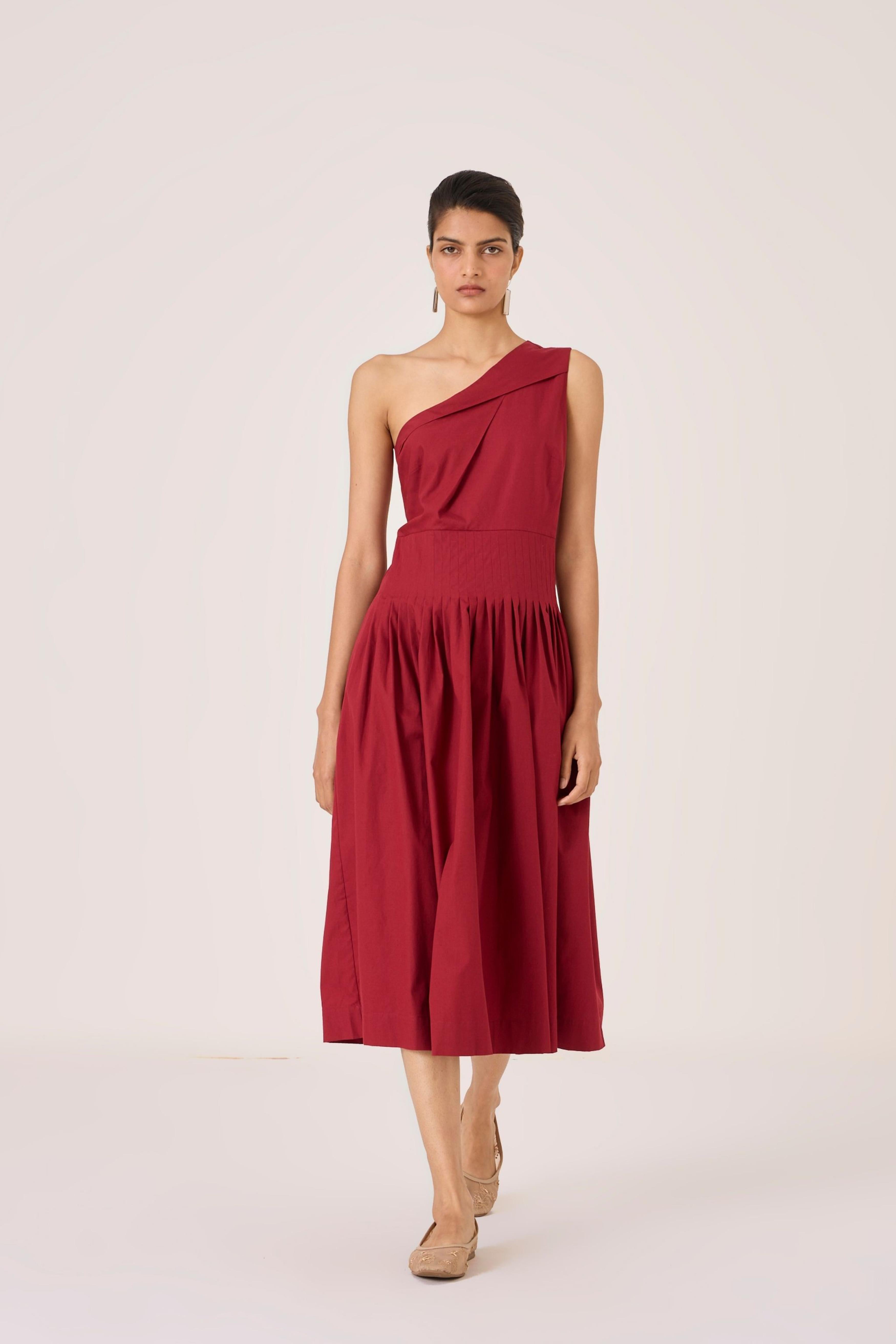 - Perfect for a season of revelries - Made from luxurious organic cotton - One shoulder fit and flare silhouette - Angular pleat detail over neckline - Sharply tailored pintuck waistline - Side zip - In-seam pockets