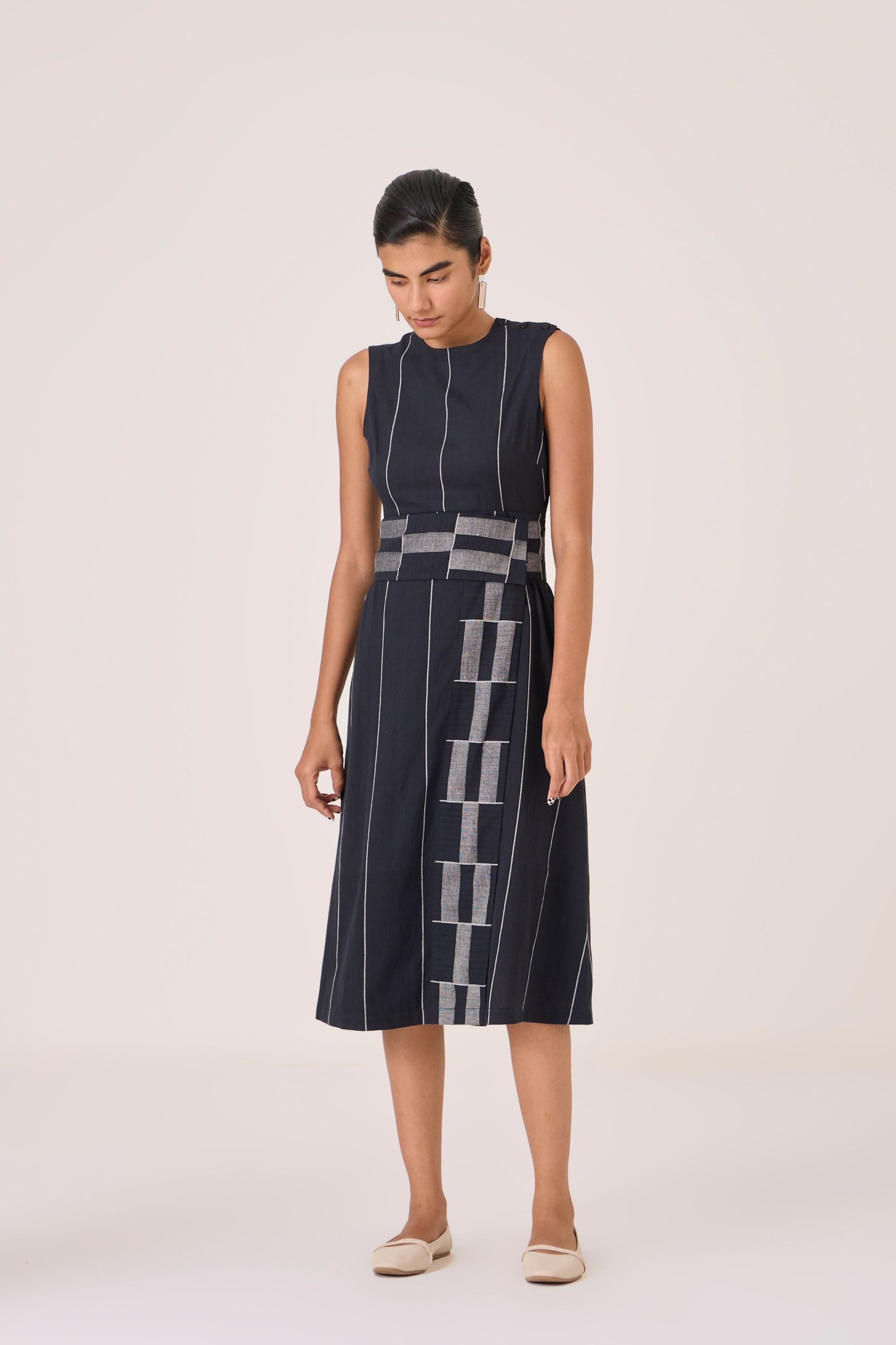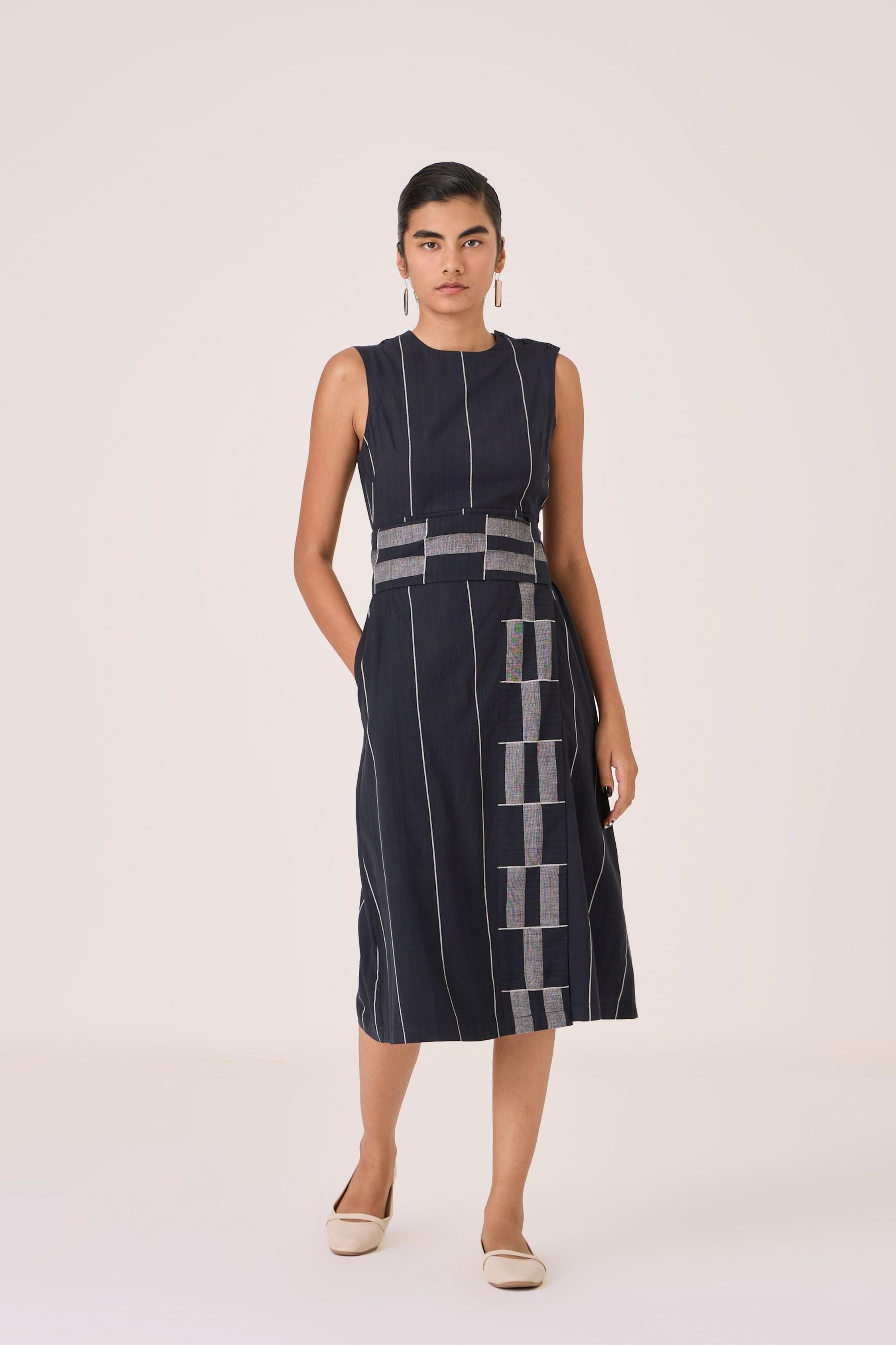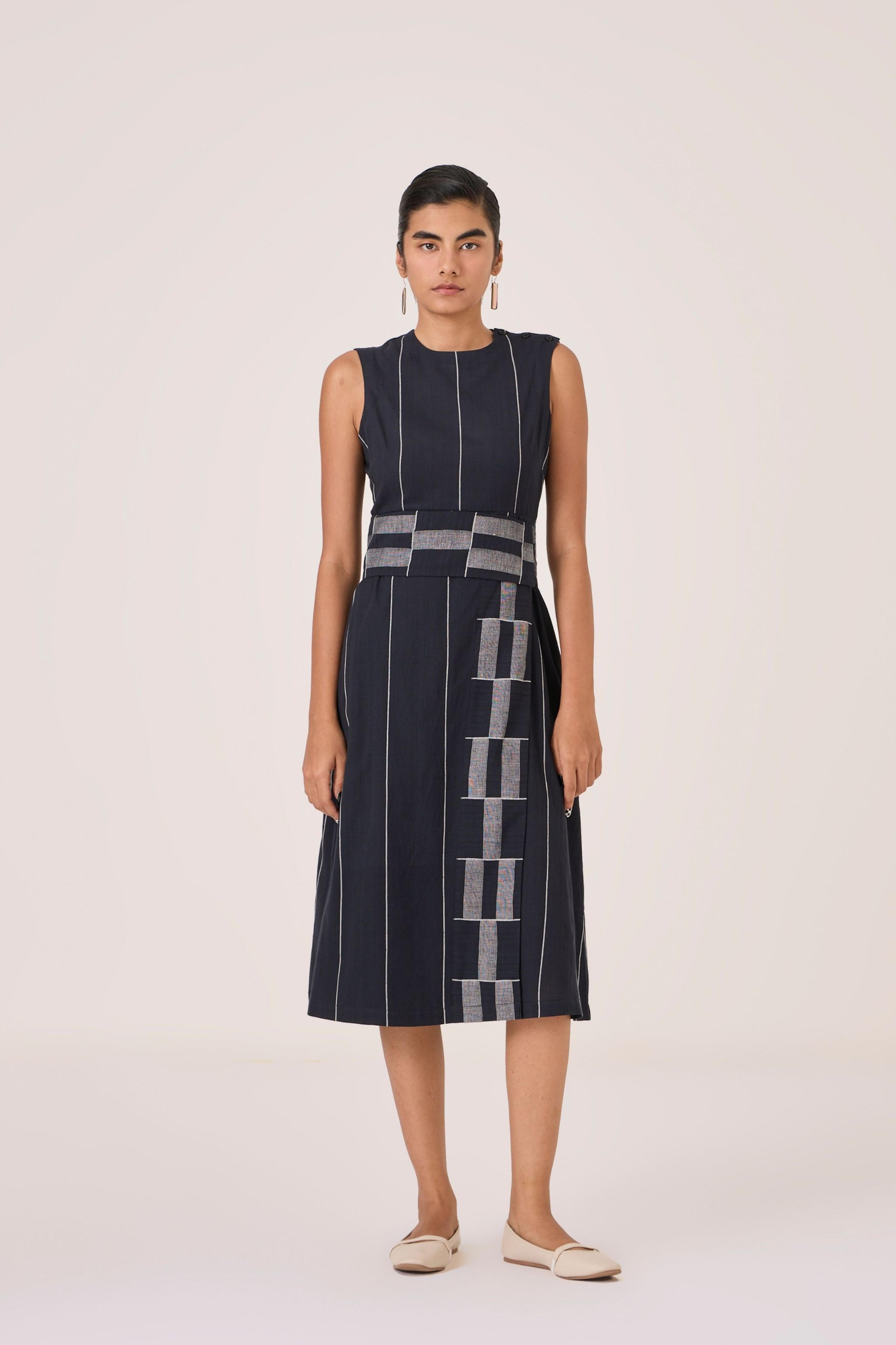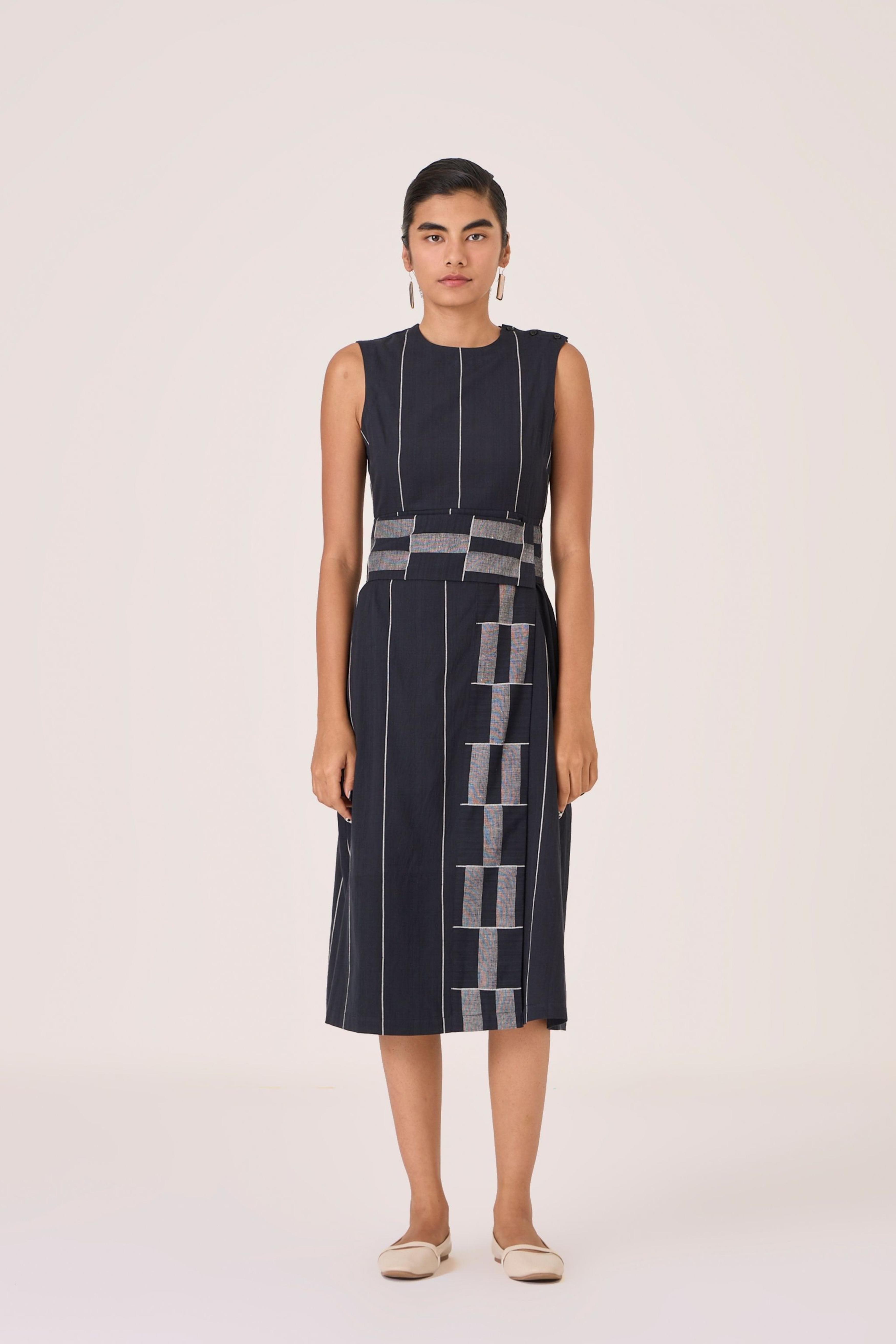- Sleeveless midi dress - Indian heritage textile - Angular overlap panel with geometric Jamdani border - Shoulder button closure - In-seam pockets - Side zip - This dress is fully lined