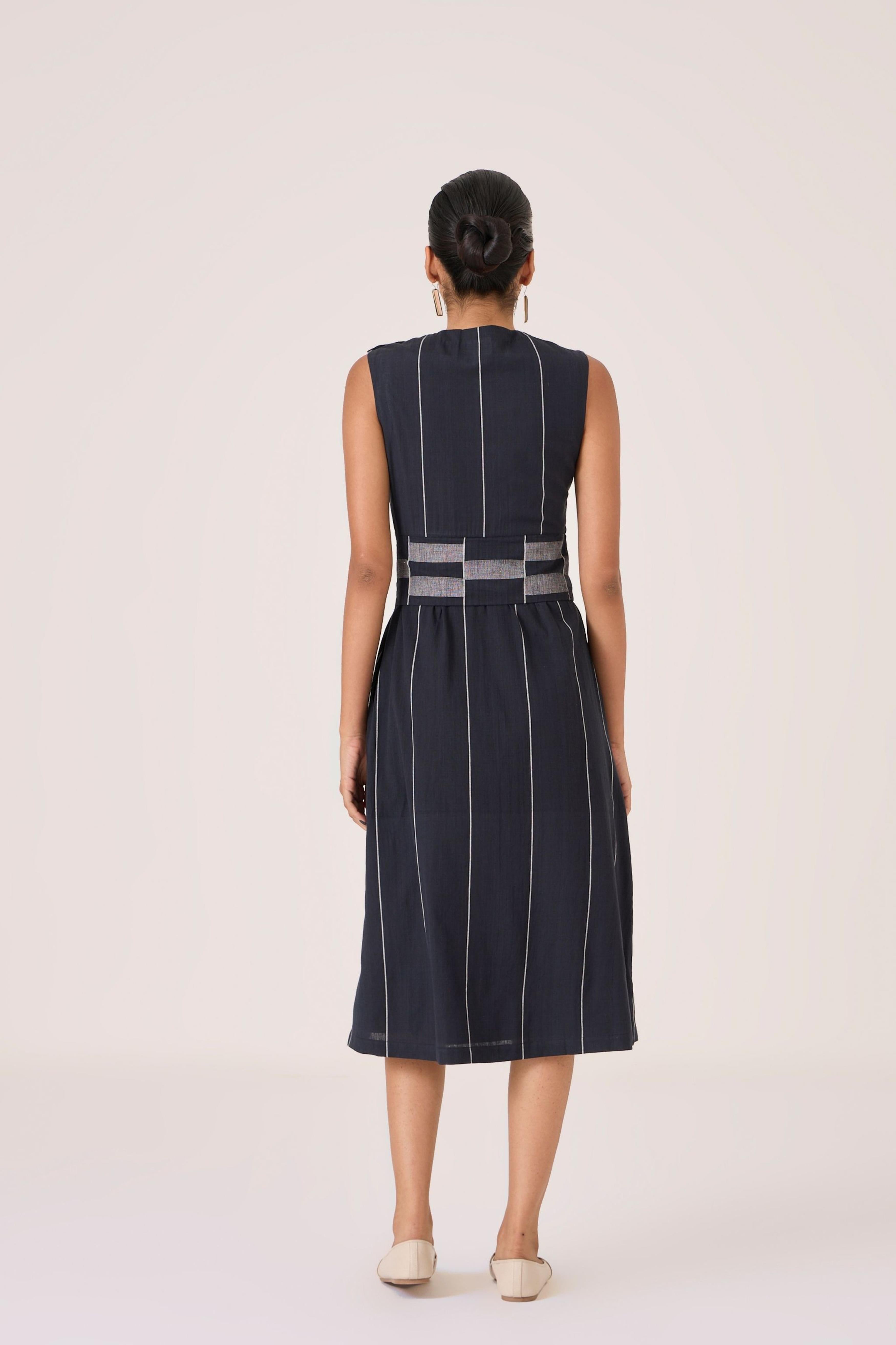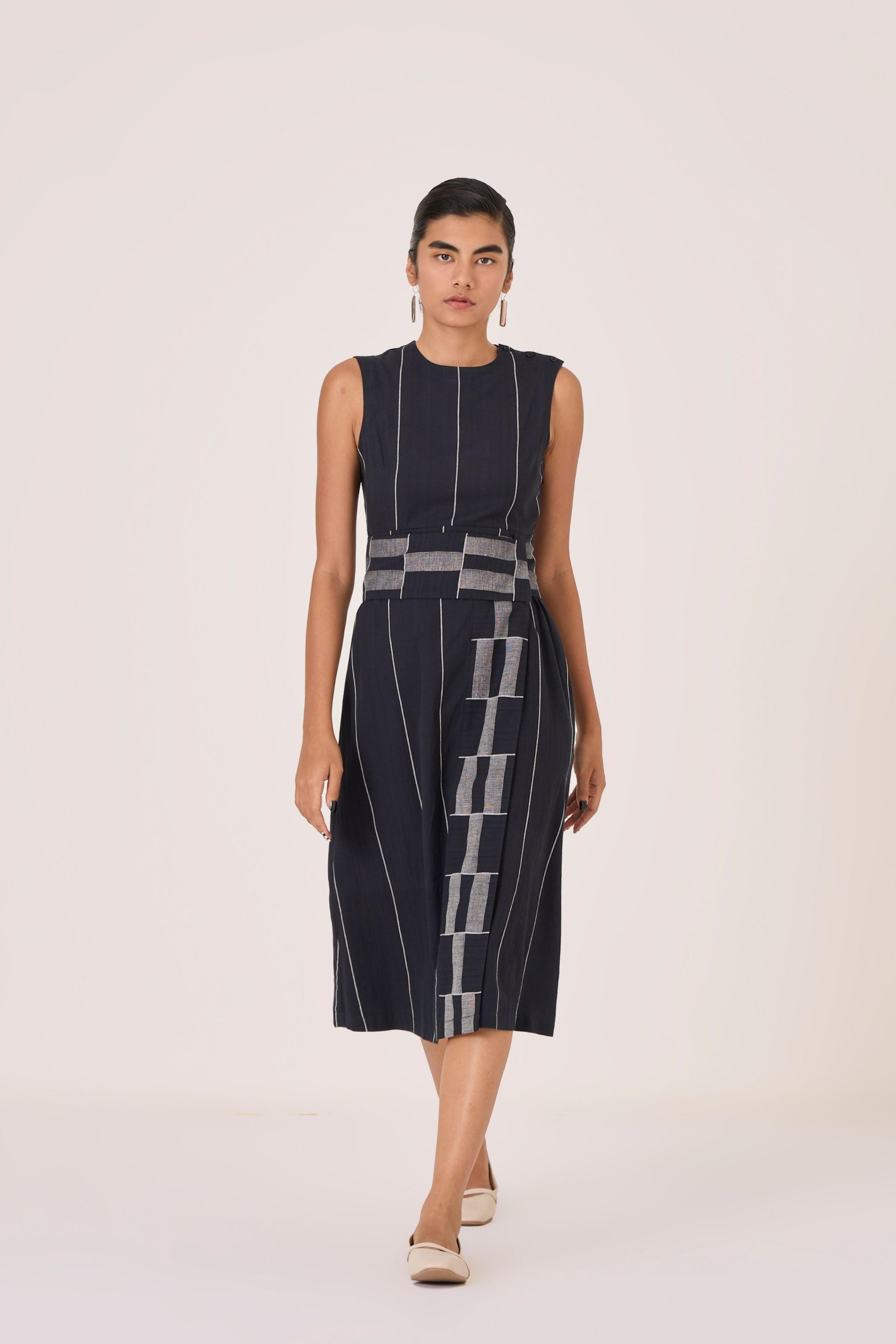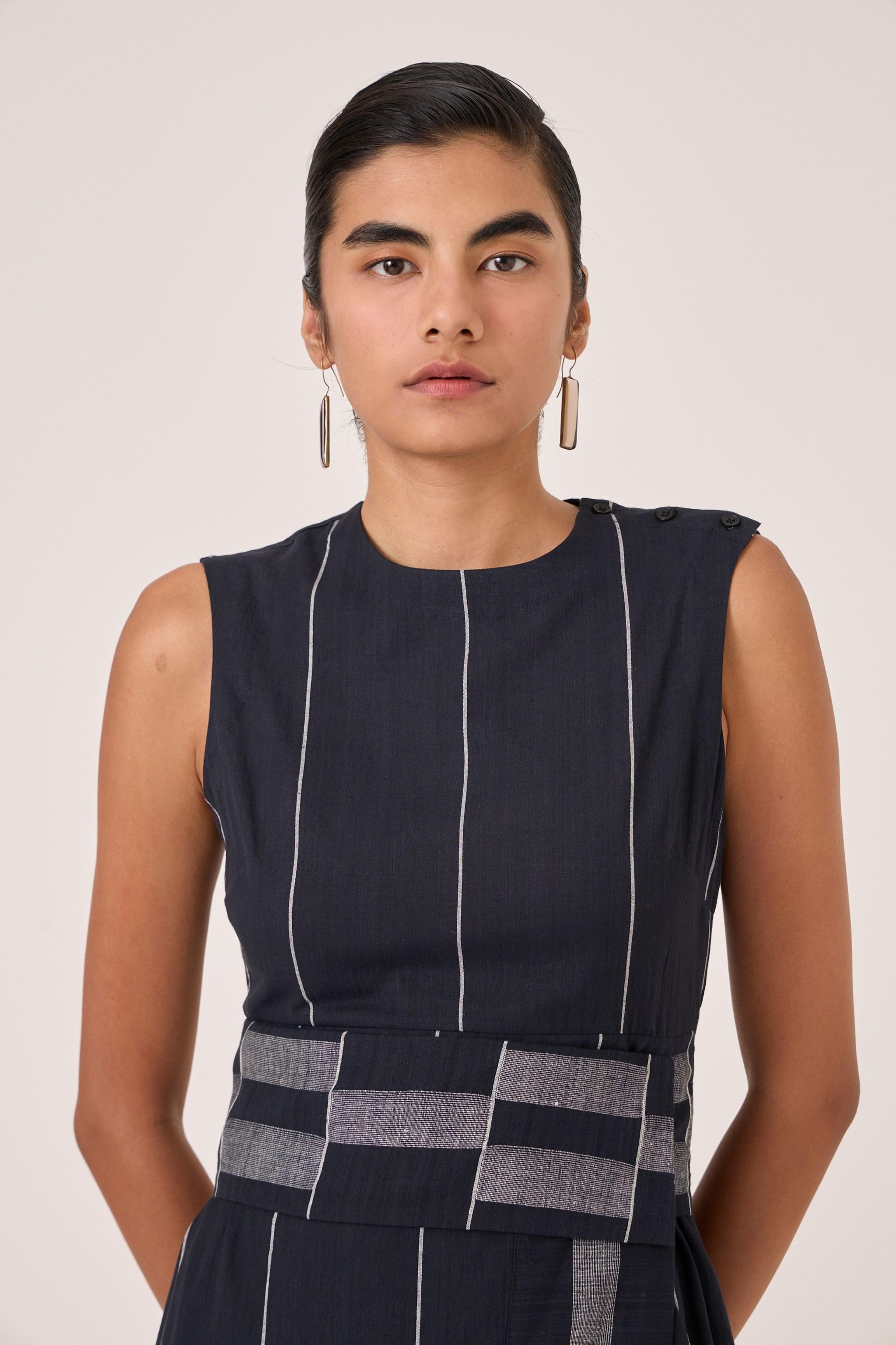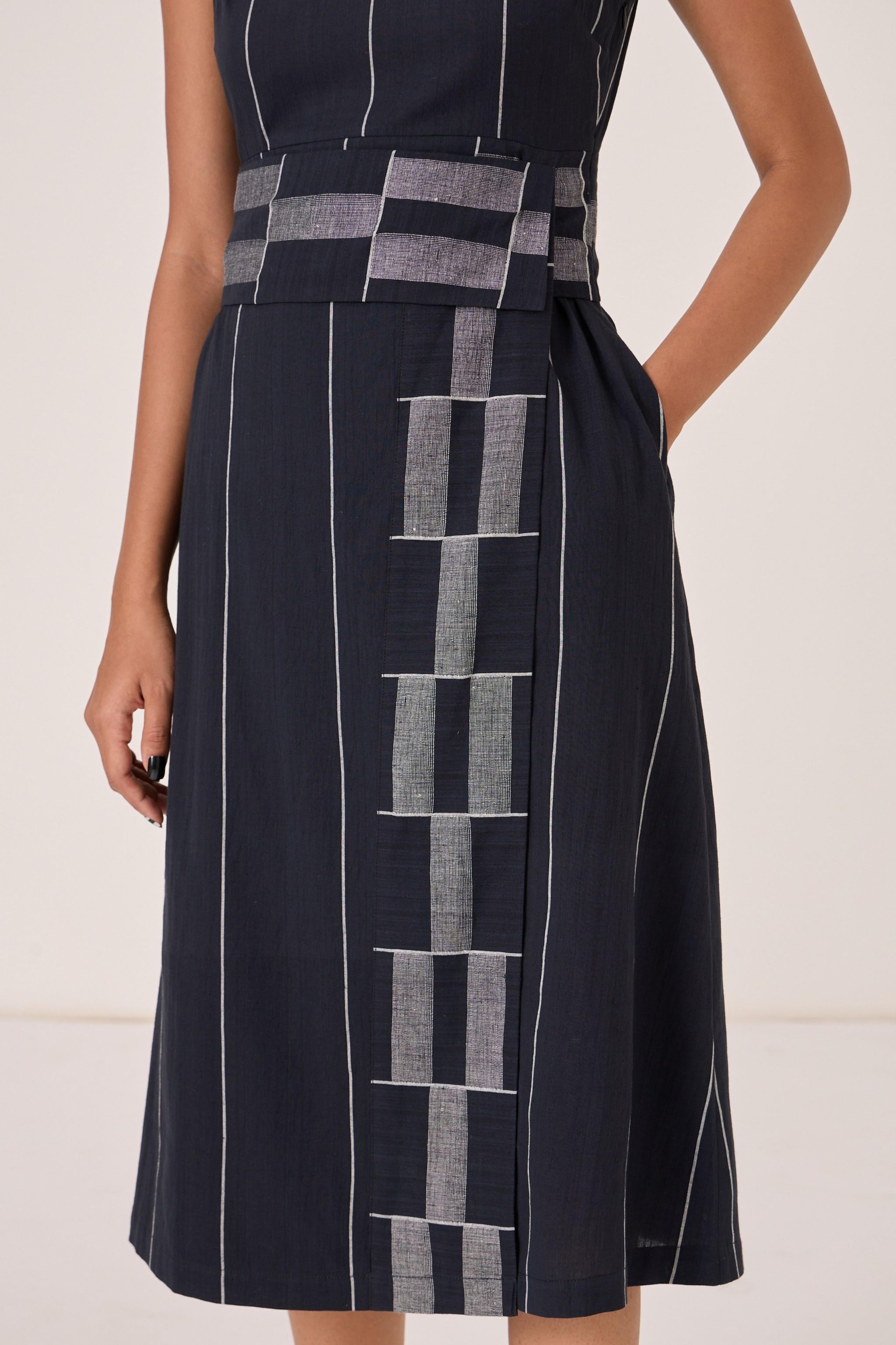 - Sleeveless midi dress - Indian heritage textile - Angular overlap panel with geometric Jamdani border - Shoulder button closure - In-seam pockets - Side zip - This dress is fully lined