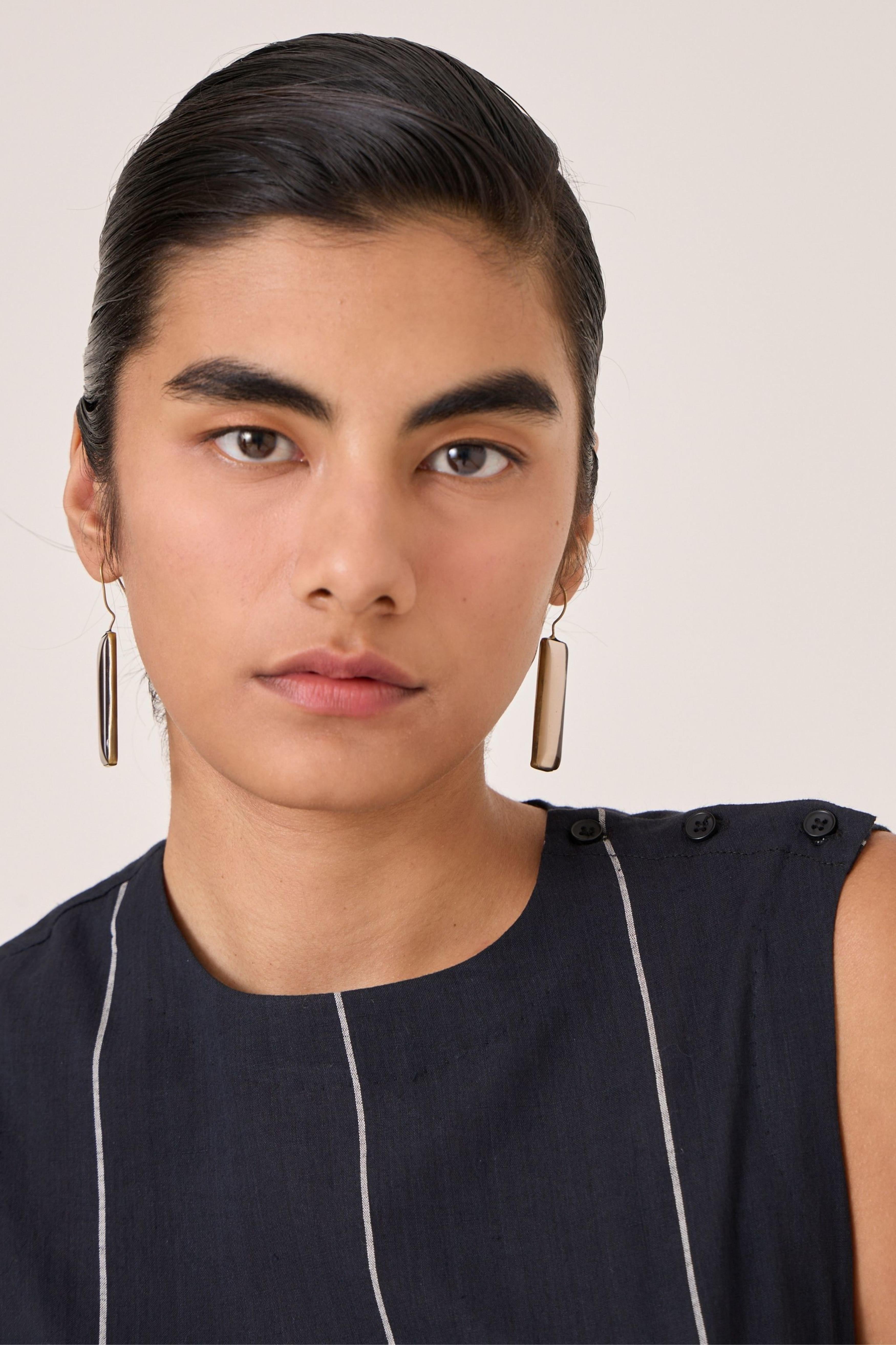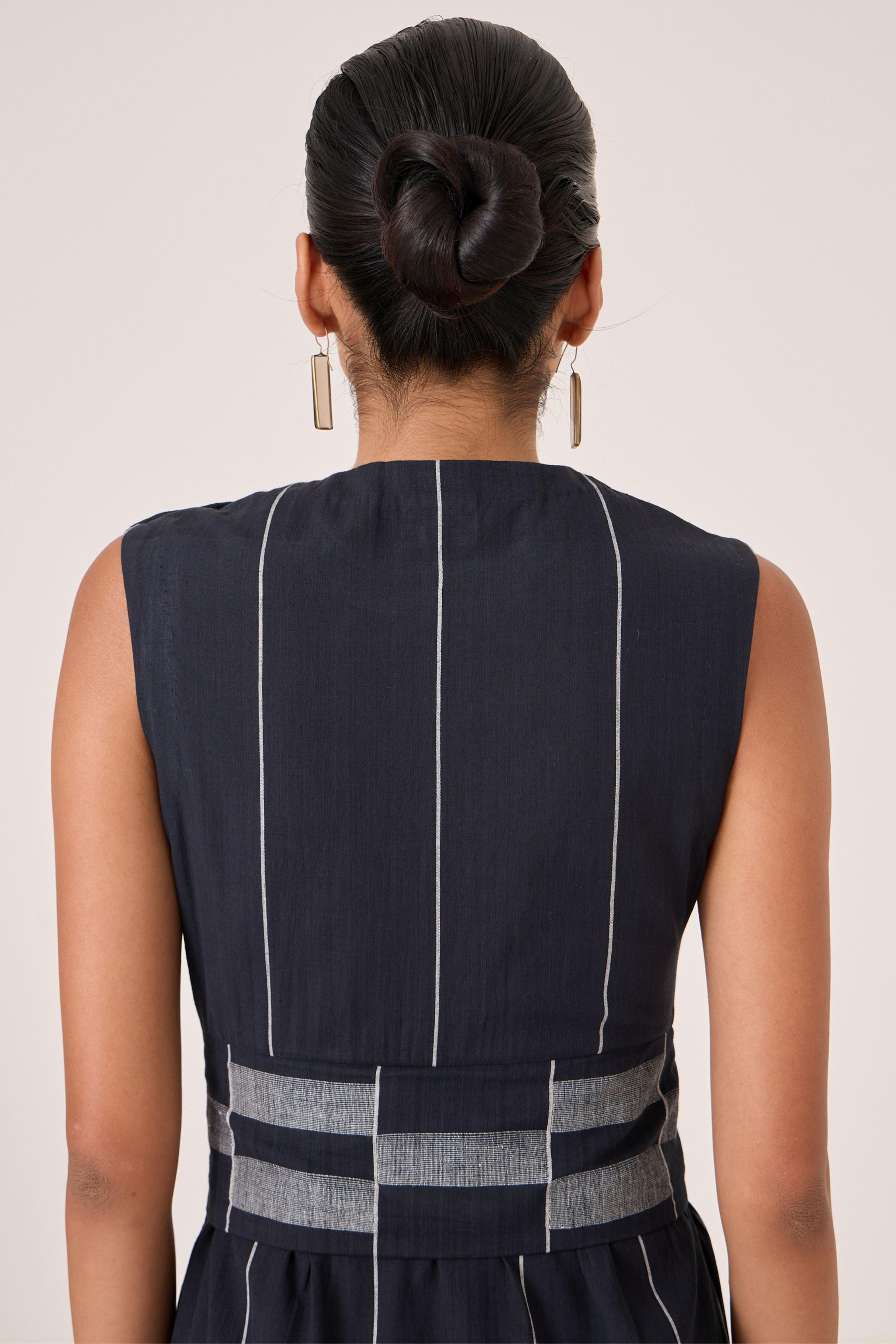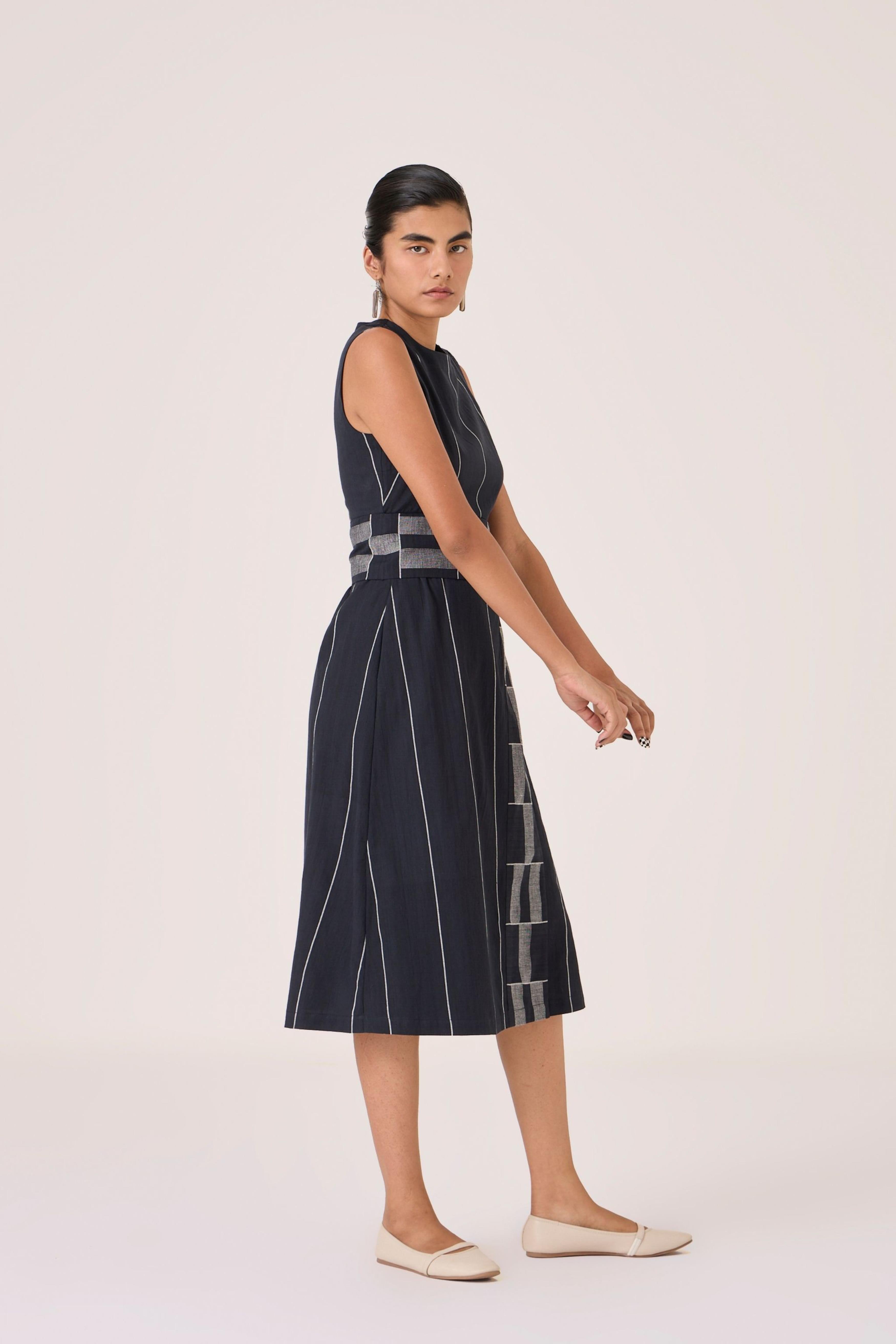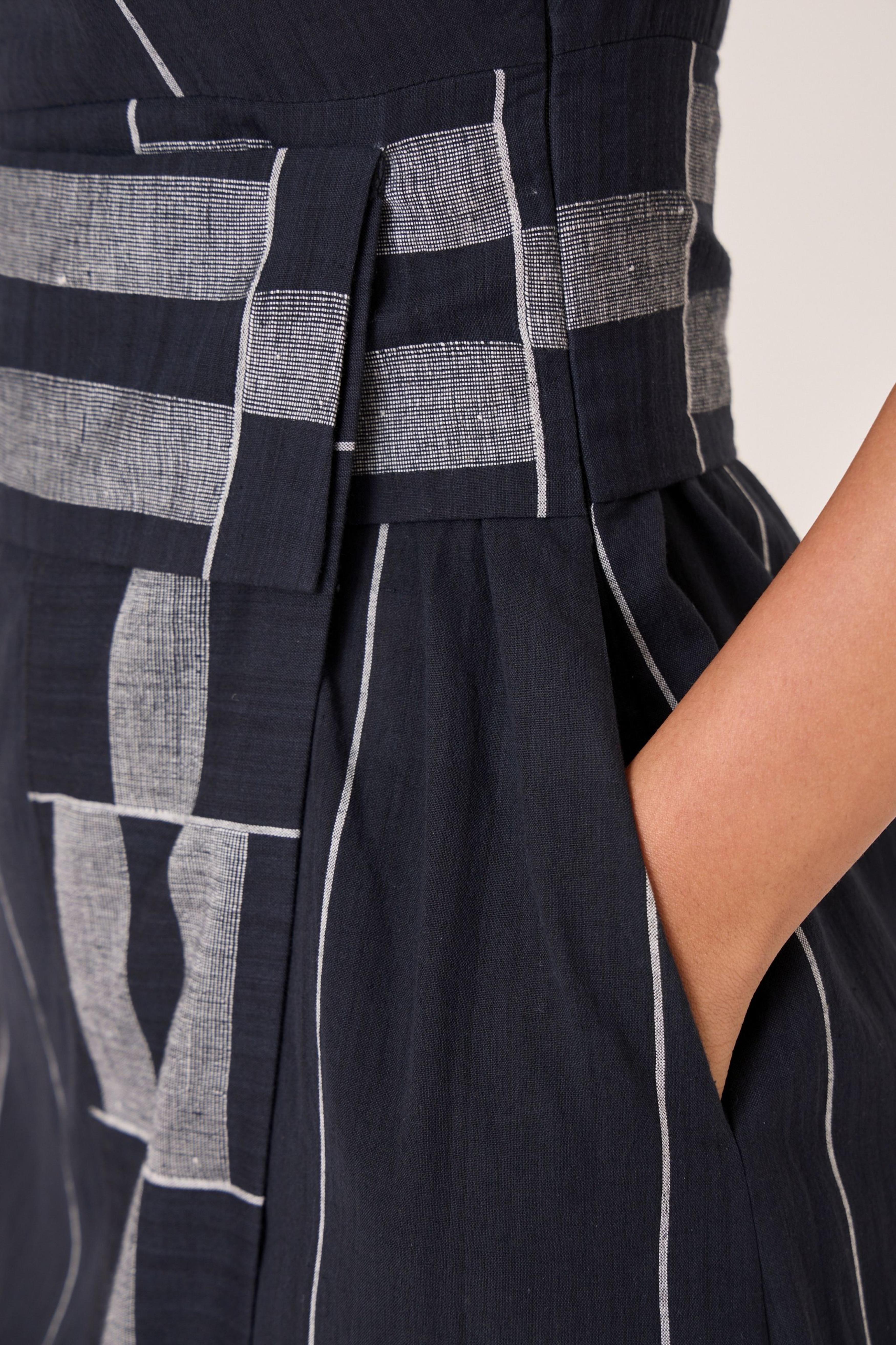 - Sleeveless midi dress - Indian heritage textile - Angular overlap panel with geometric Jamdani border - Shoulder button closure - In-seam pockets - Side zip - This dress is fully lined