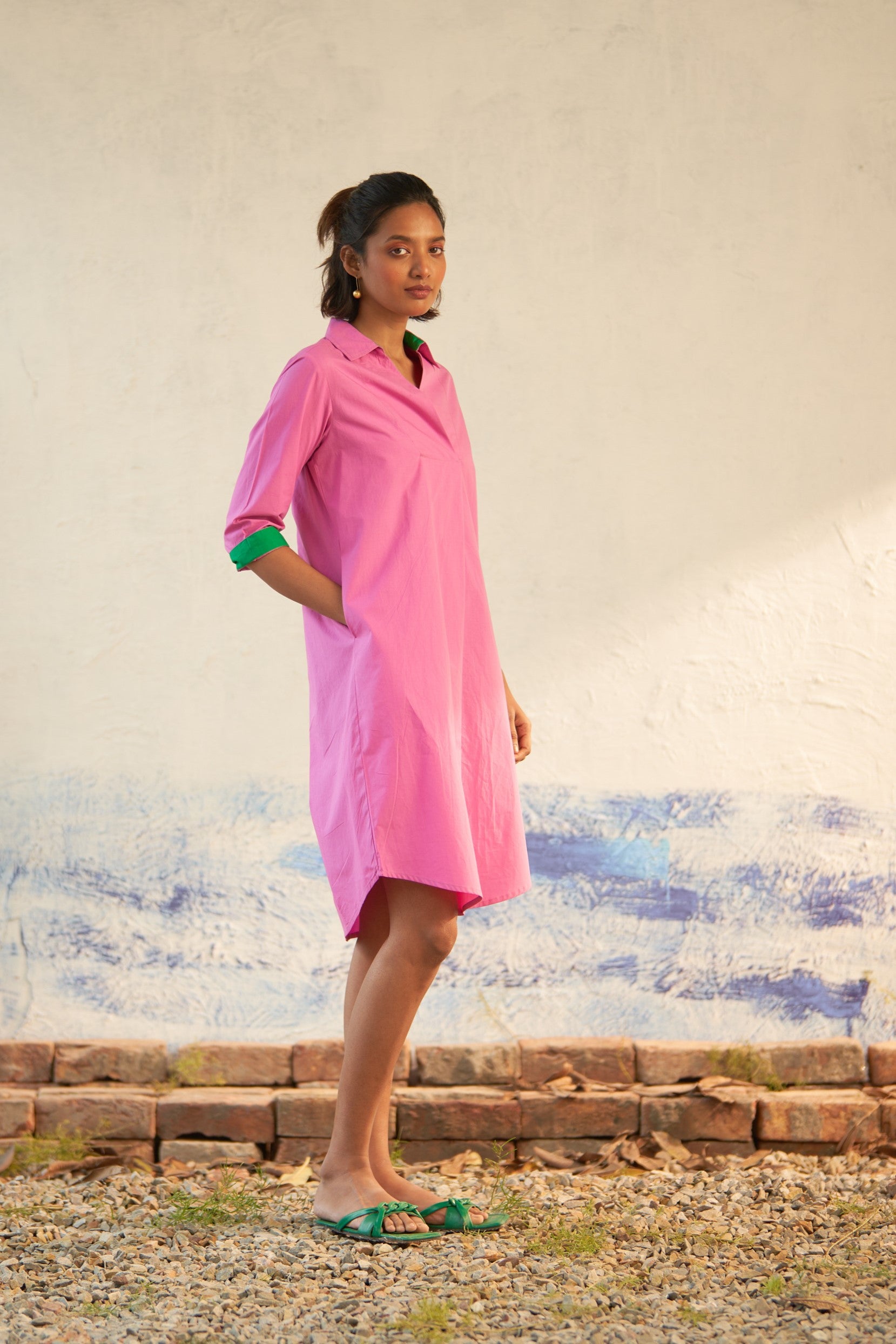 This dress effortlessly marries elegance with modernity. Its standout feature is a distinctive overlapping pleat at the back, which gracefully shapes a soft A-line silhouette. With a classic collared neckline, effortlessly foldable sleeves, and a stylish U-shaped hemline, this dress exudes sophistication and contemporary charm.