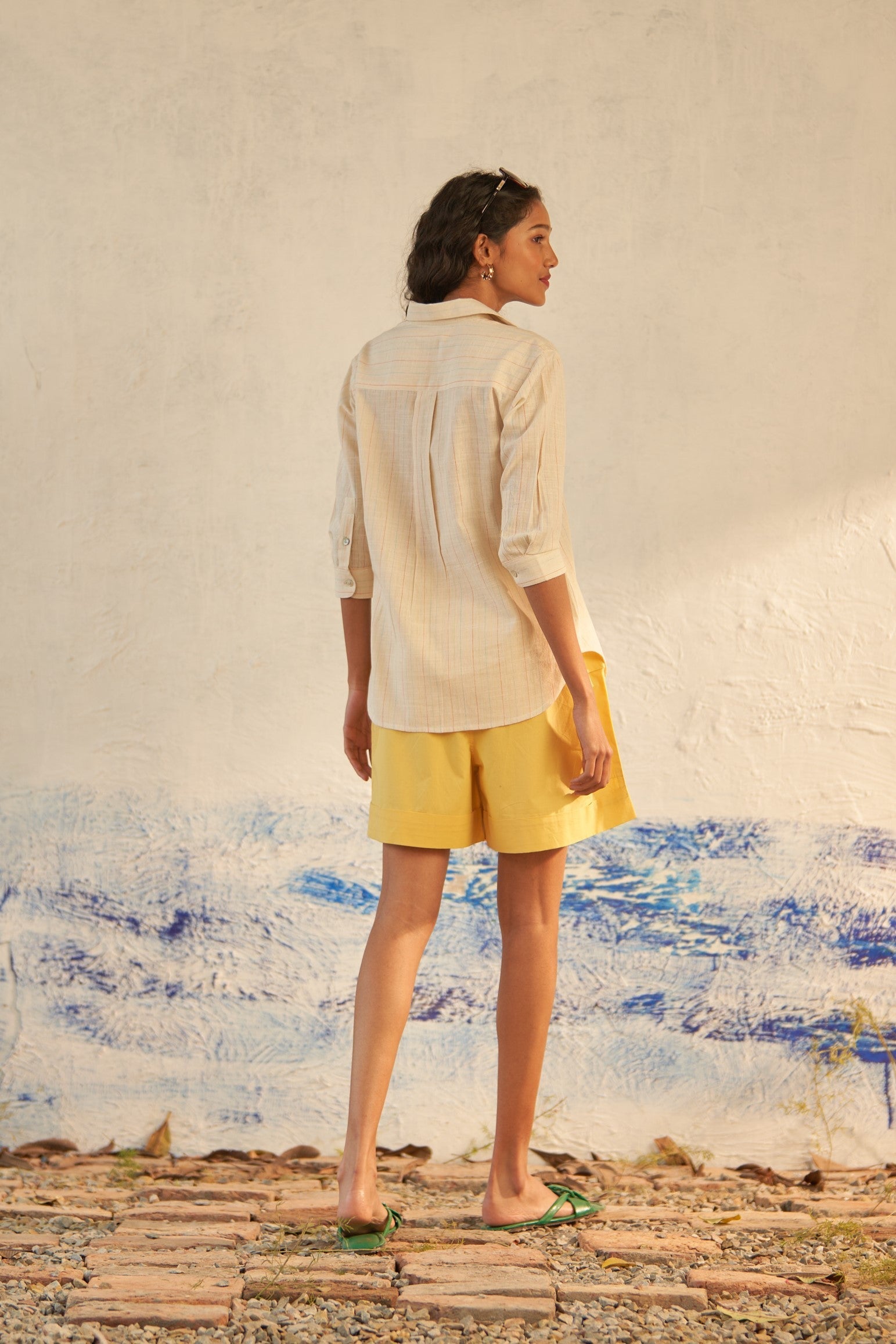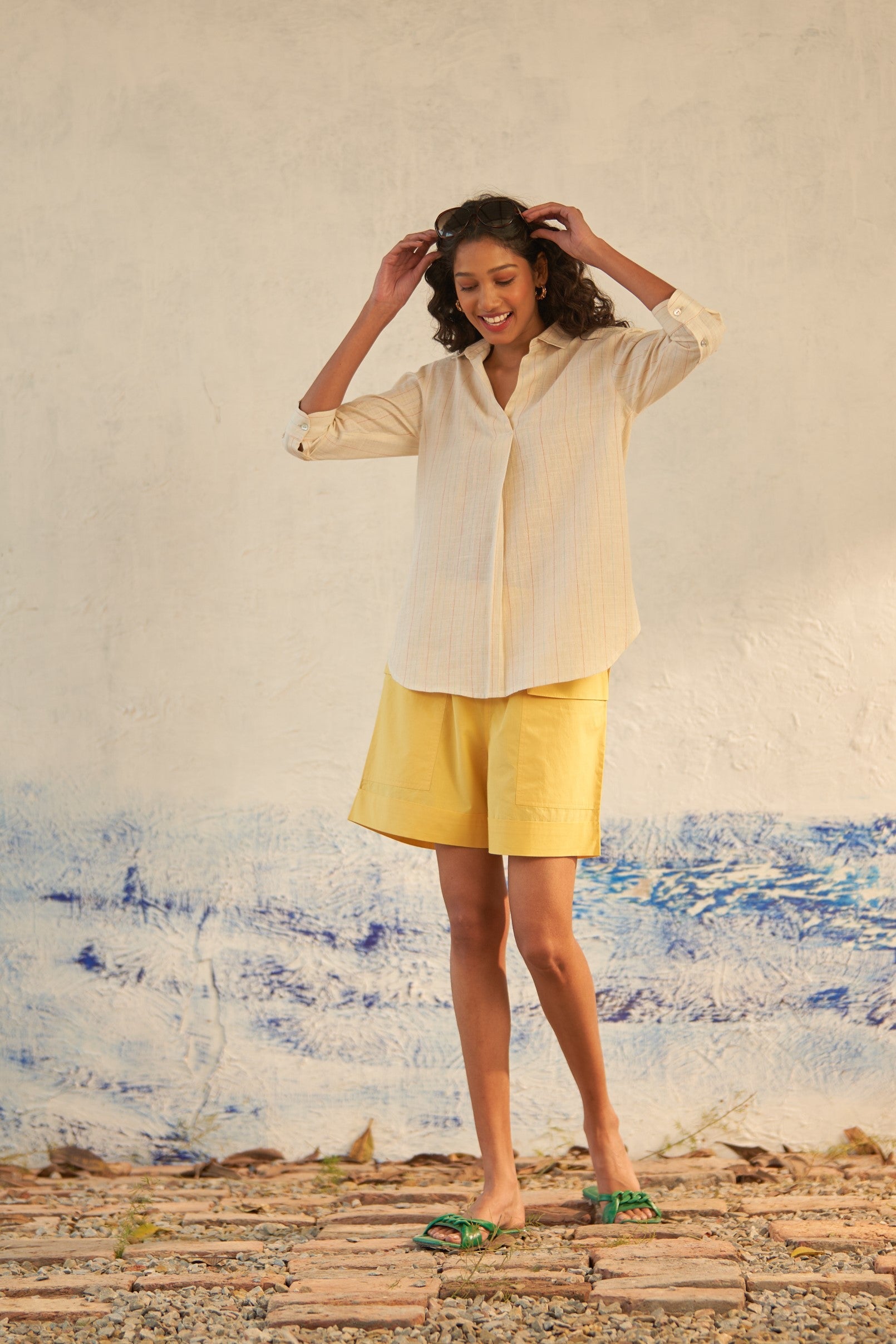 A journey of freshness, this travel set anticipates the delights of the day ahead. The top features a unique front box pleat detail, ideal for light wear on a beautiful day. Crafted from textured cotton, its off-white hue adorned with multicolor stripes injects a refreshing burst of colors. Paired with half elastic waistband shorts boasting flap pockets in a soft yellow shade, this ensemble ensures comfort and style for your adventures.
