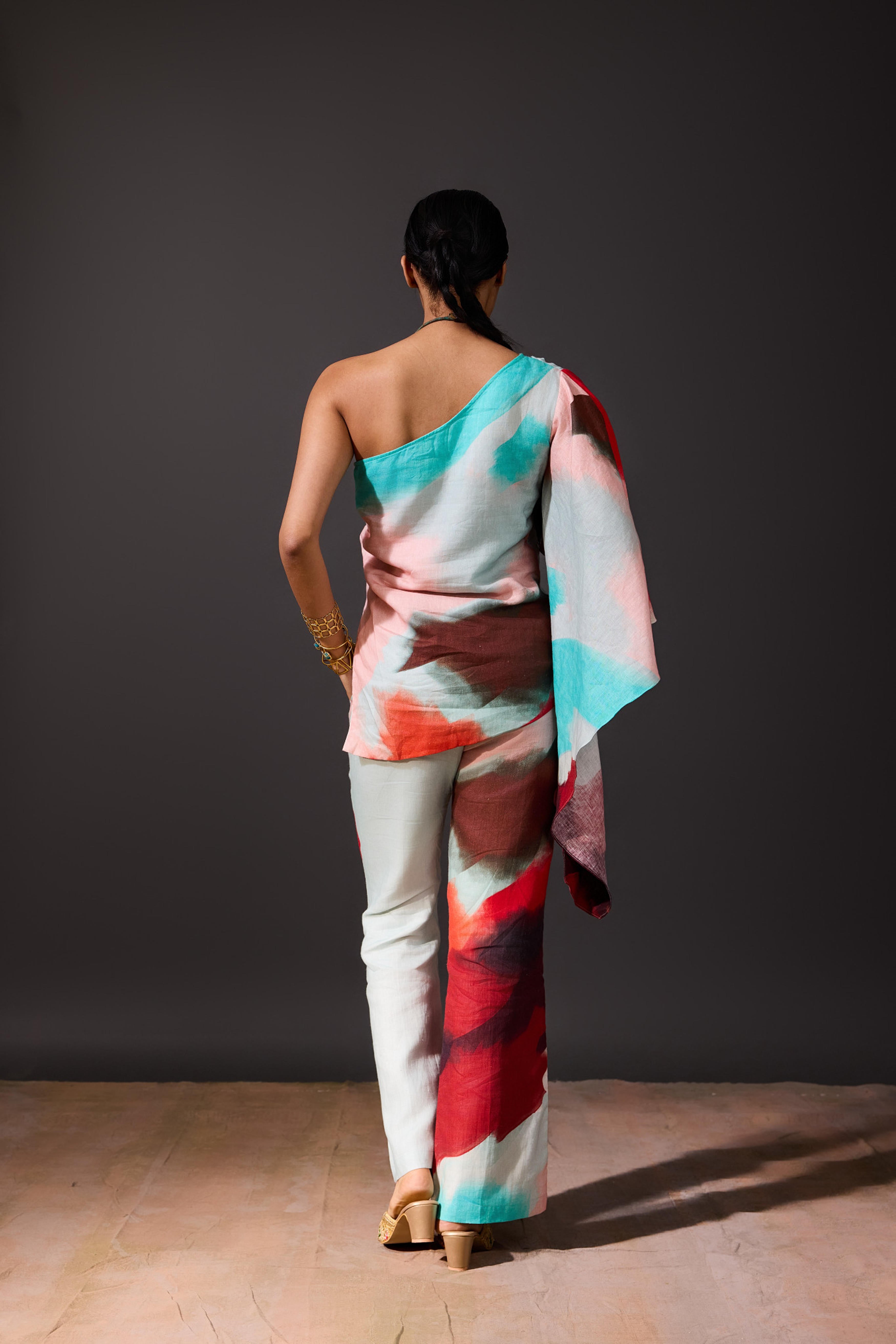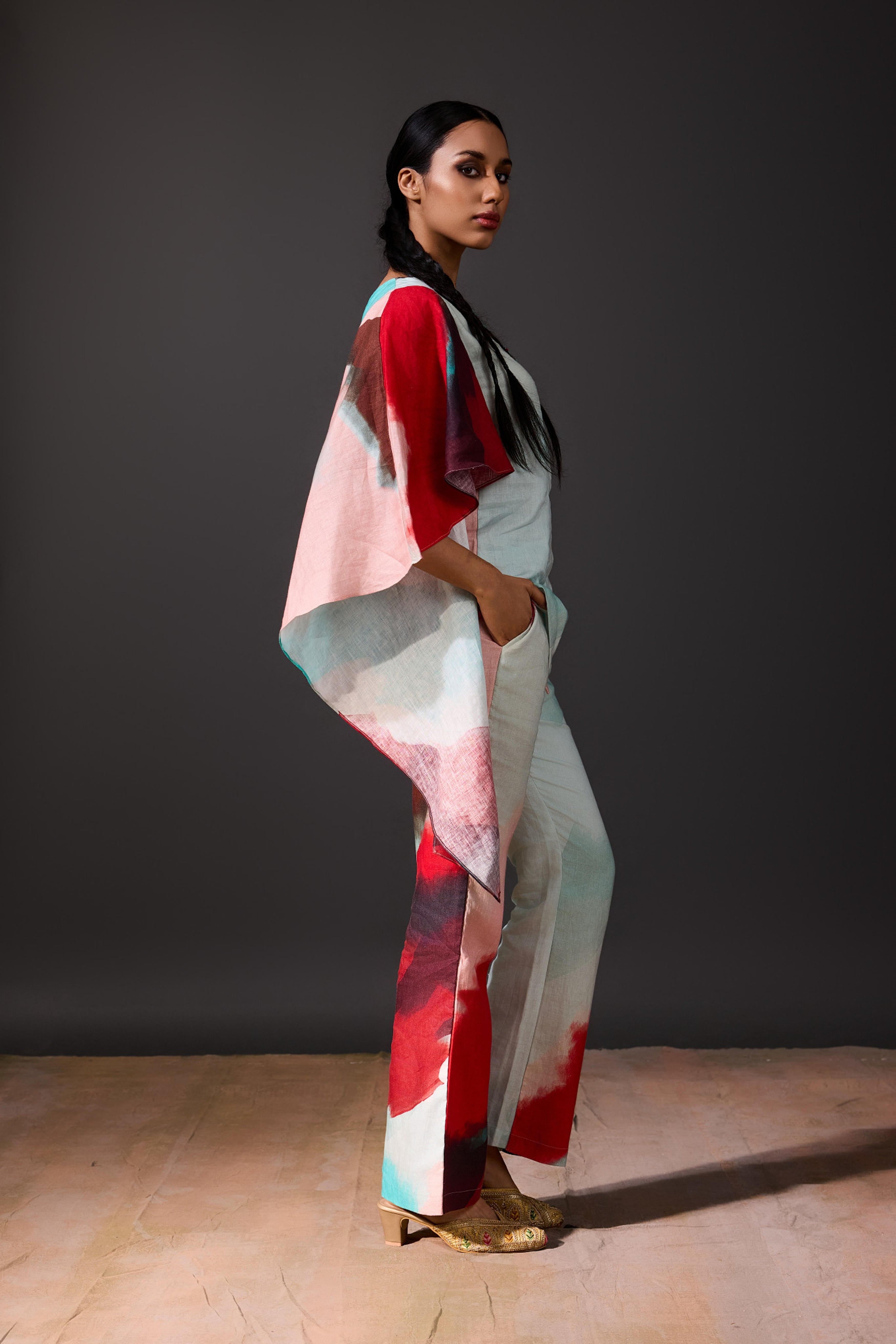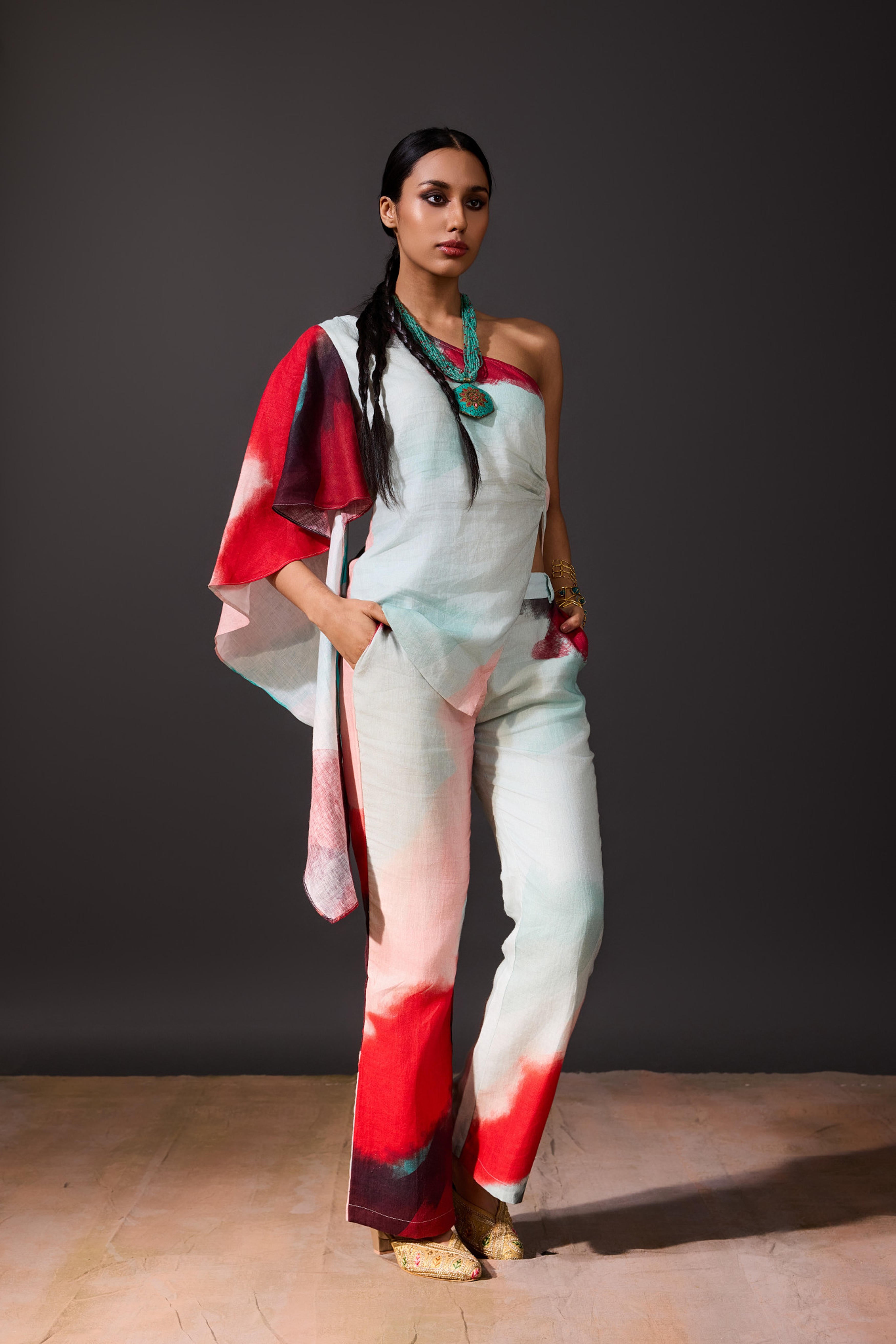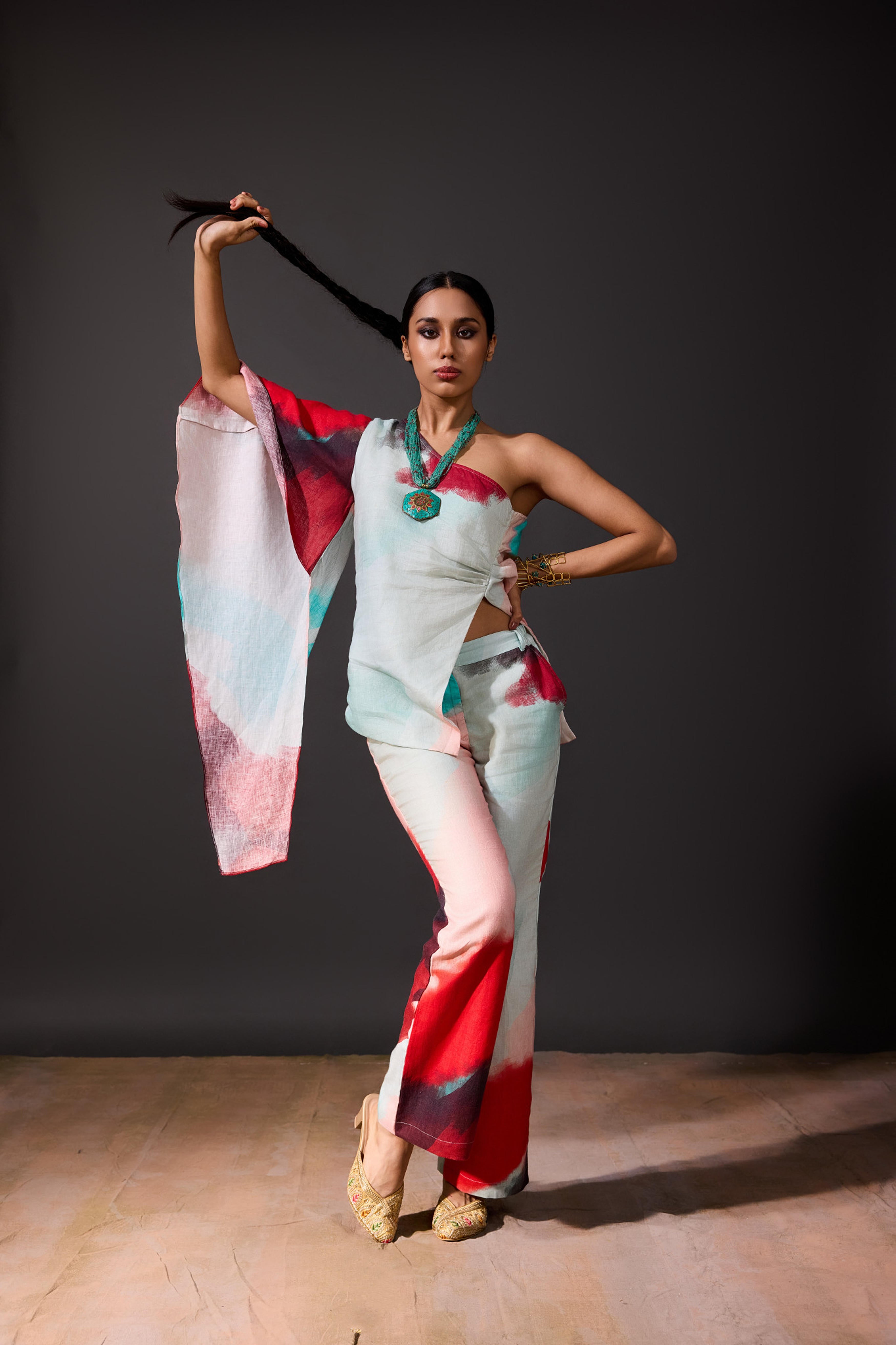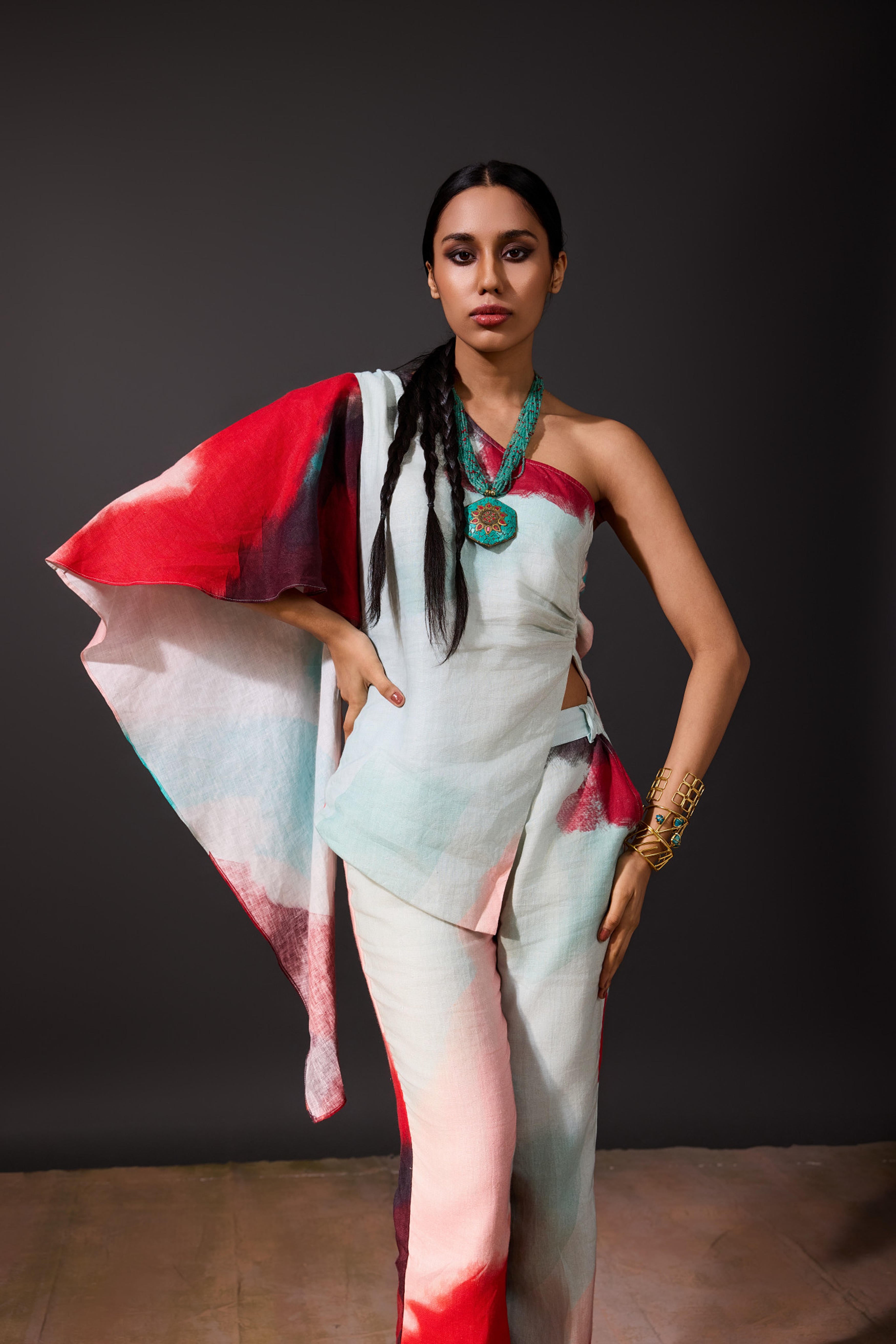 The Shweta Set in Lagoon is a striking contemporary co-ord that blends drama with effortless wearability. Tailored from 100% linen, the set features a one-shoulder asymmetric top with a dramatic draped sleeve cascading down one arm, paired with tailored straight-leg trousers. The silhouette offers a balance of fluidity and structure, making it versatile for both festive and statement occasions. The Lagoon palette merges soft aqua tones with bold bursts of crimson and maroon, printed in expressive brushstroke patterns that lend each piece its unique artistry. Perfect for those who seek modern sophistication rooted in artisanal craftsmanship.