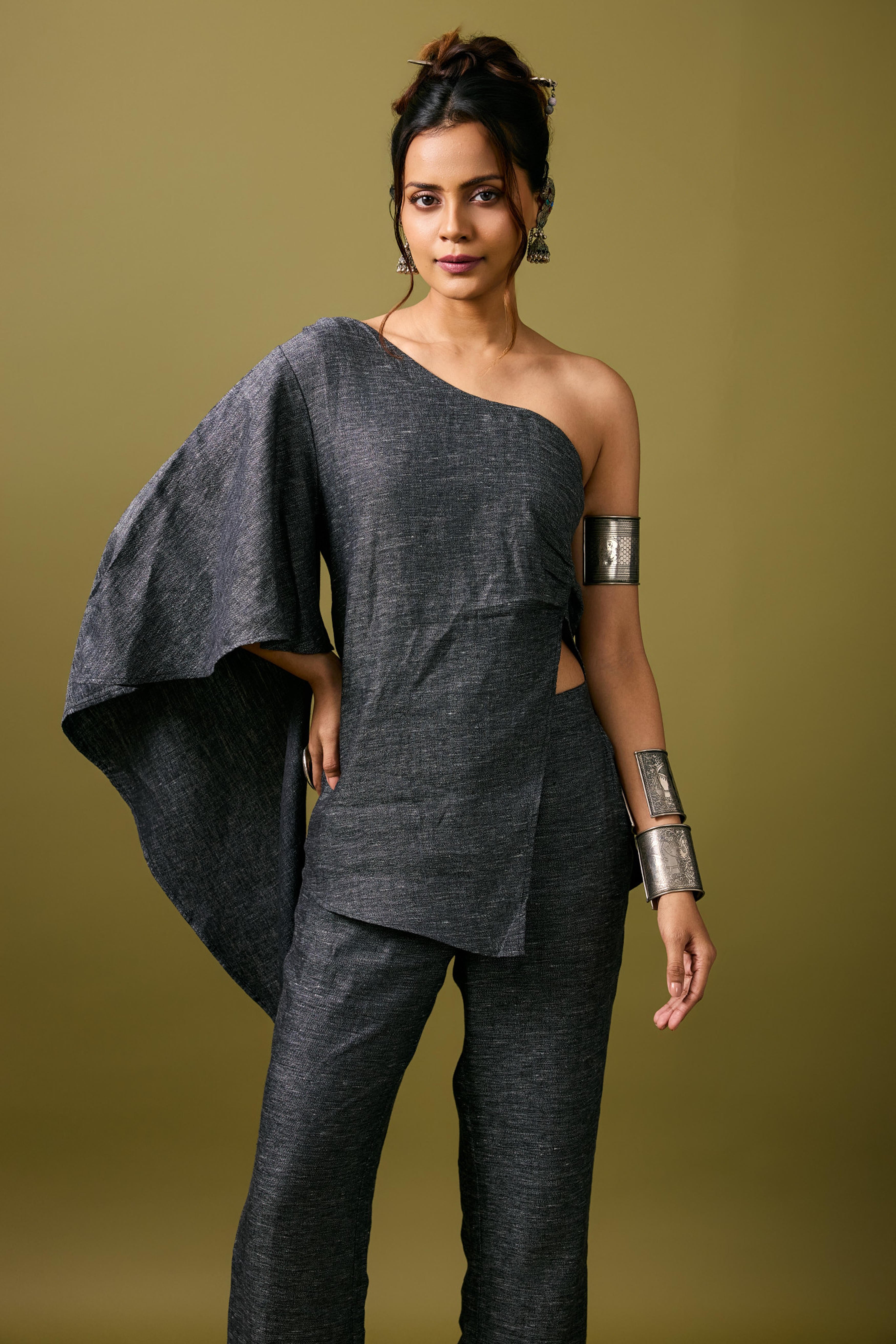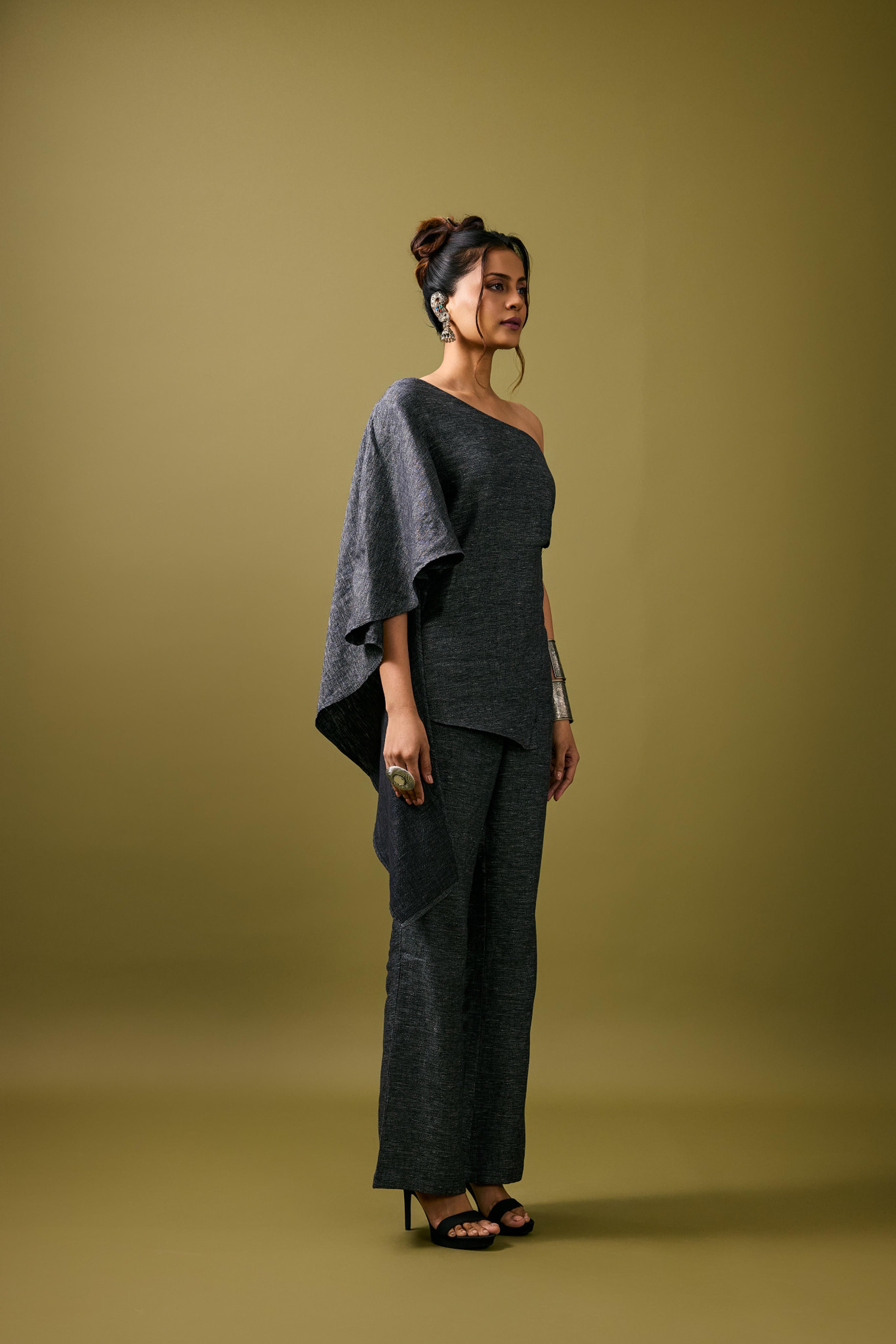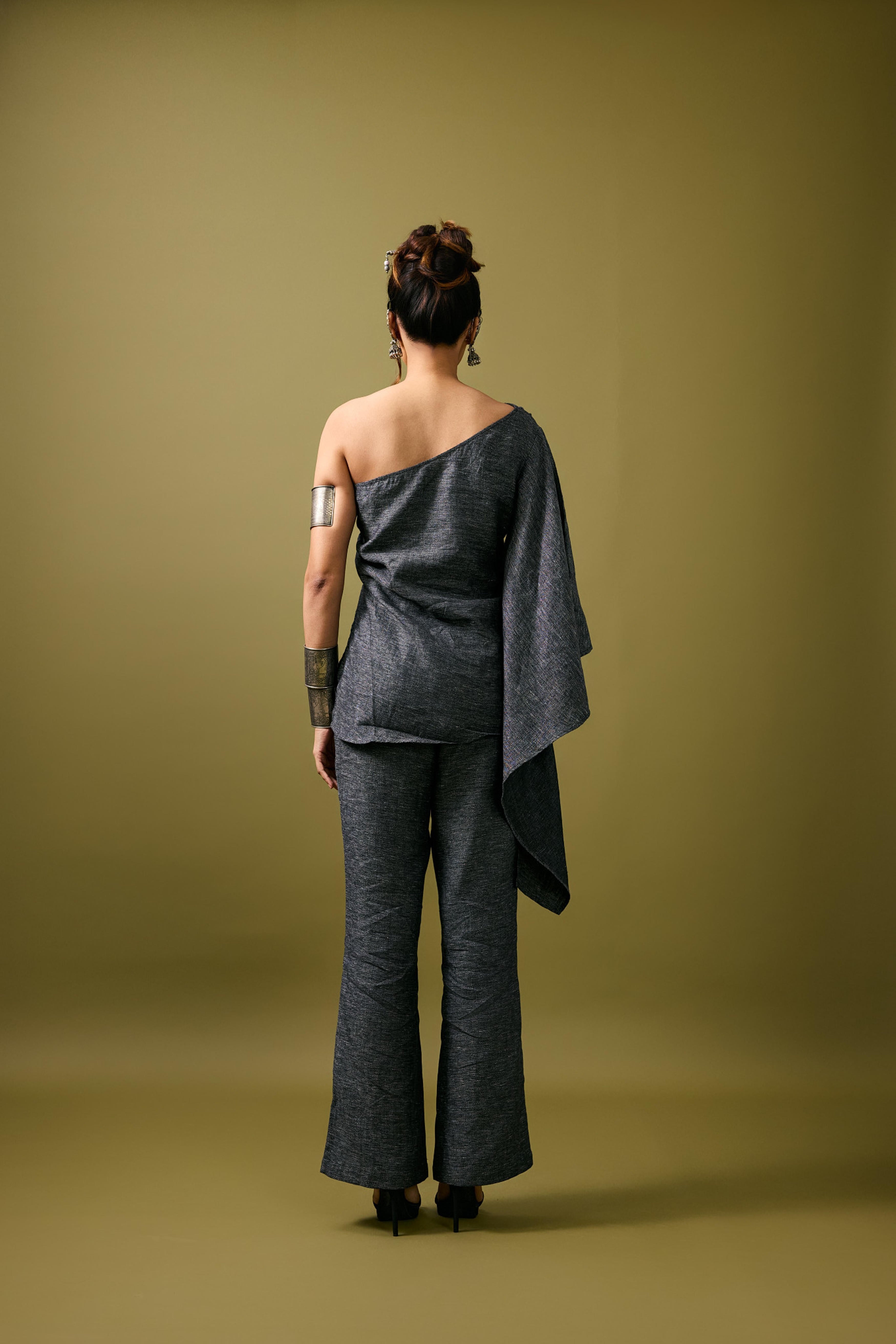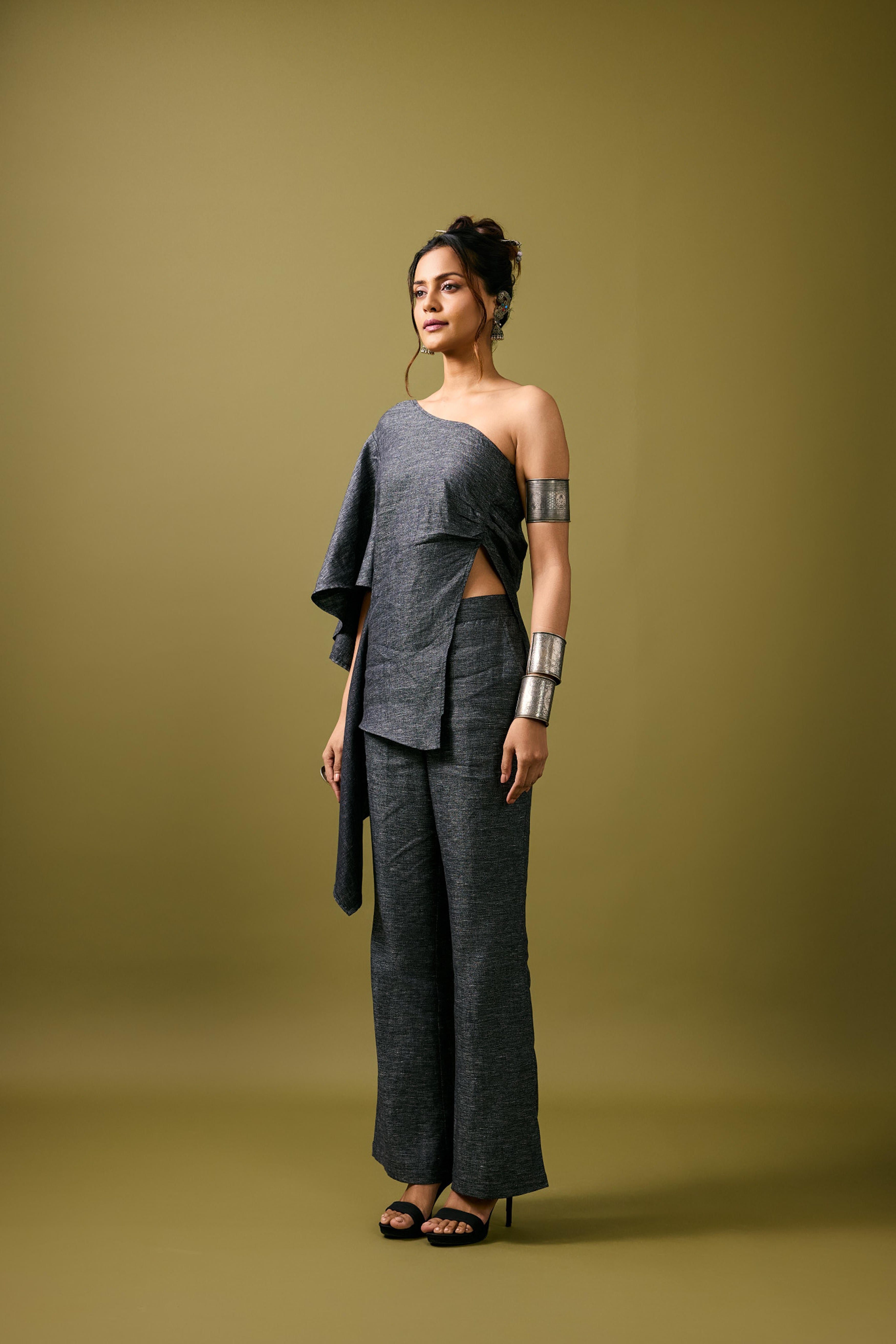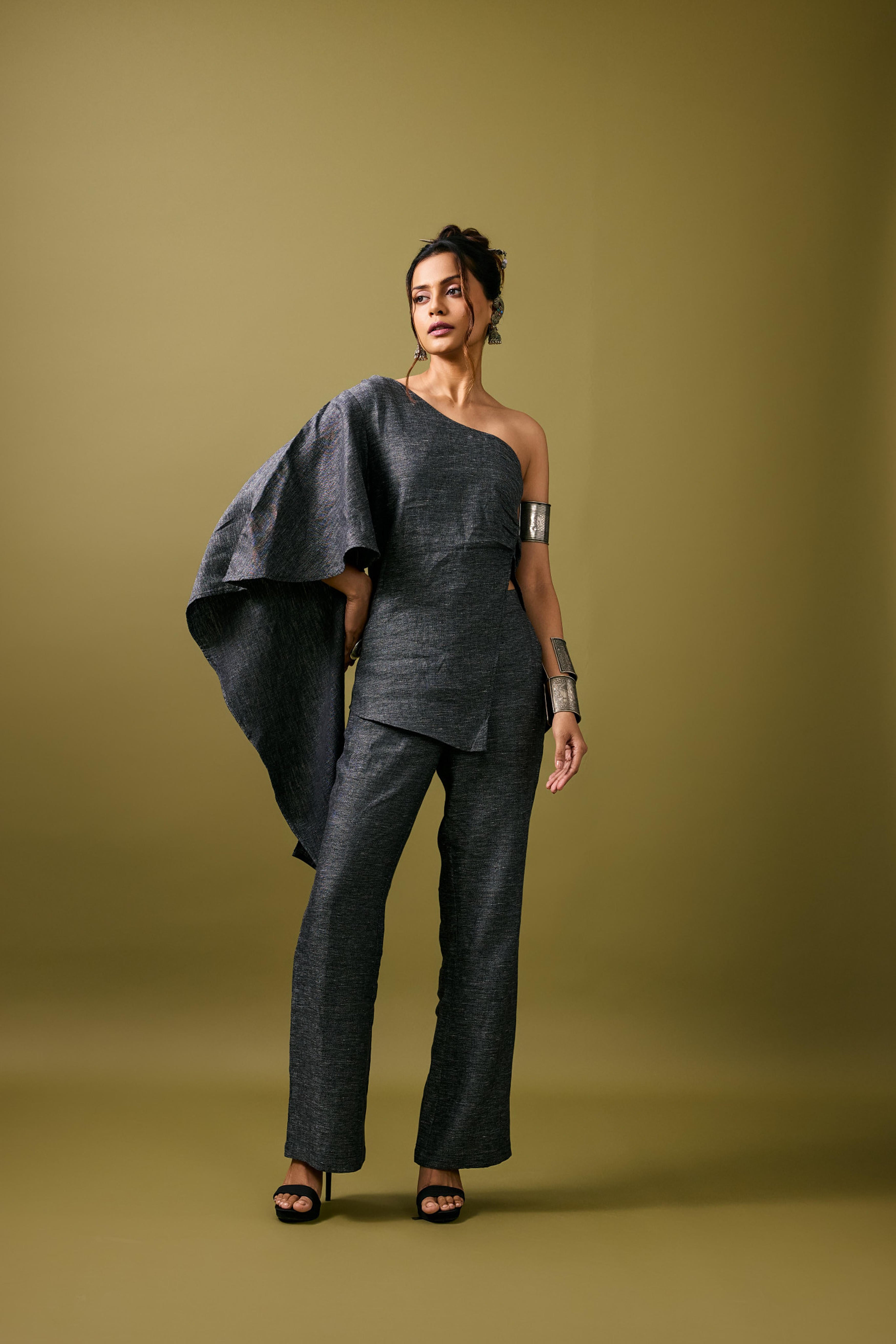 The Shweta Set in Lagoon is a striking contemporary co-ord that blends drama with effortless wearability. Tailored from 100% linen, the set features a one-shoulder asymmetric top with a dramatic draped sleeve cascading down one arm, paired with tailored straight-leg trousers. The silhouette offers a balance of fluidity and structure, making it versatile for both festive and statement occasions. The Lagoon palette merges soft aqua tones with bold bursts of crimson and maroon, printed in expressive brushstroke patterns that lend each piece its unique artistry. Perfect for those who seek modern sophistication rooted in artisanal craftsmanship.