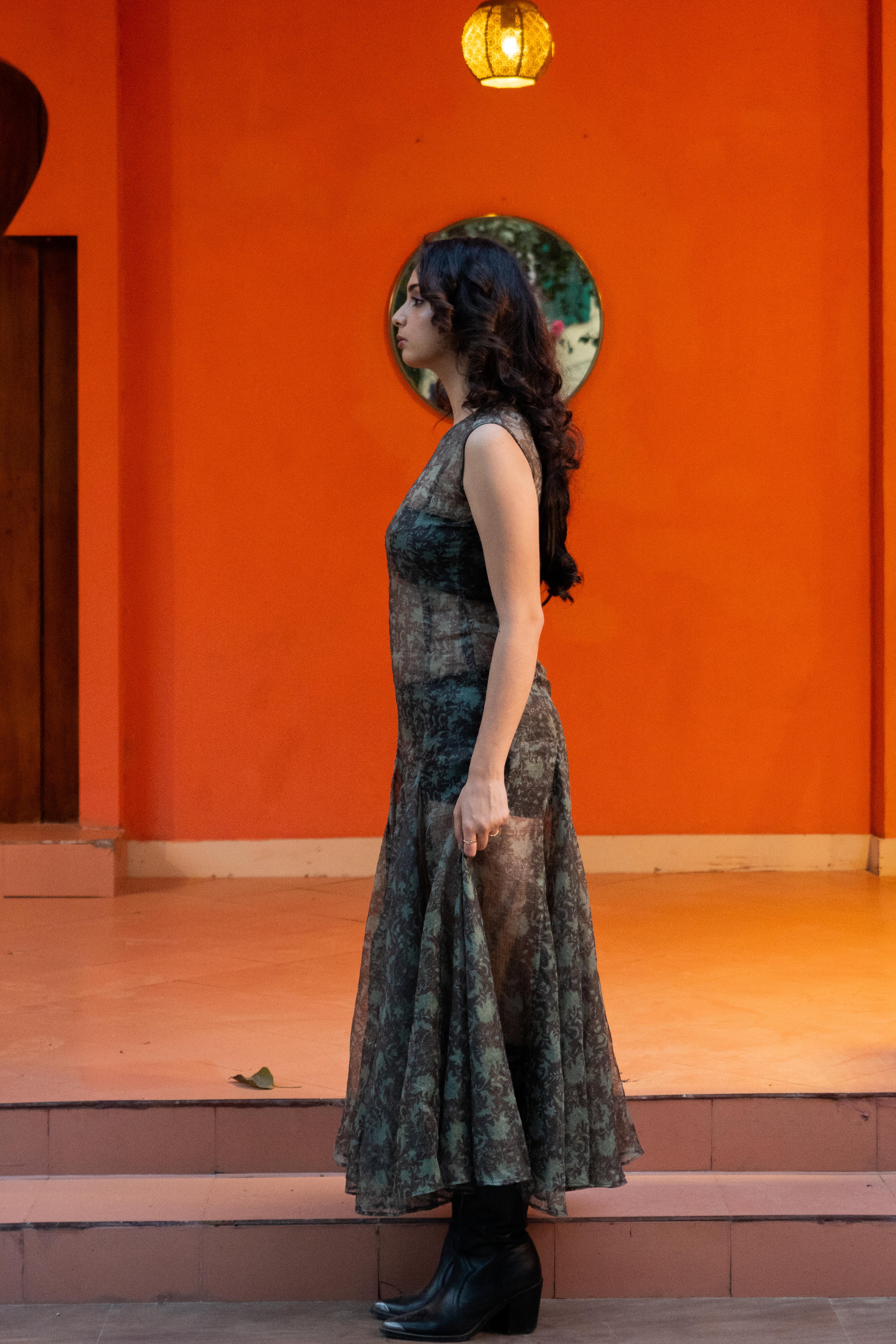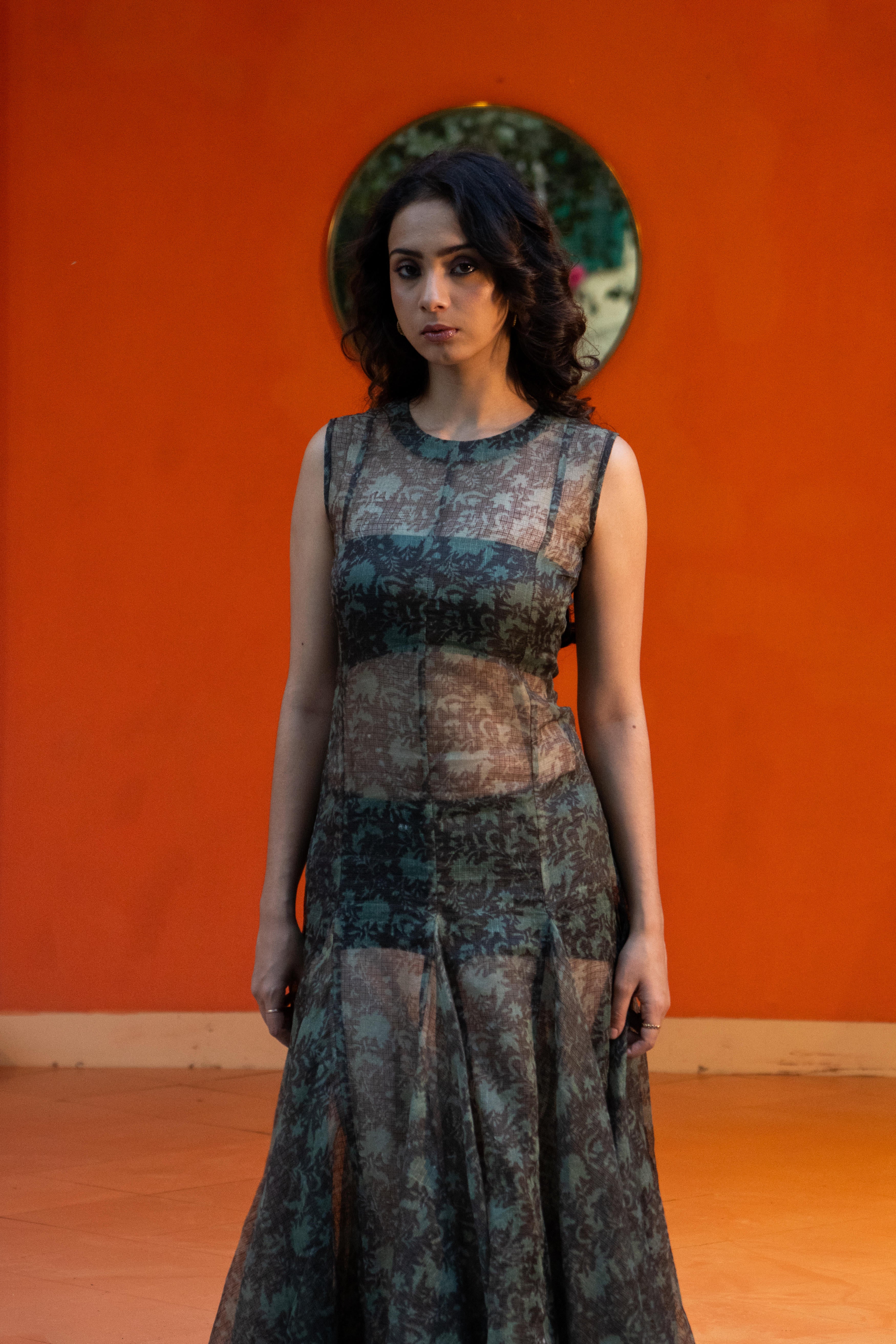 The Siah Sheer Dress balances drama with quiet restraint, crafted in pure Kota Doria—a feather-light, sheer fabric known for its airy weave and subtle translucence. The wide, sleeveless shoulders and clean bodice fall into a flared skirt constructed from multiple kalis, allowing the print to drift, overlap, and diffuse beautifully as you move. Entirely sheer, the dress creates an atmosphere of layered colour and soft shadow, with each step revealing new depths of pattern while still feeling weightless.