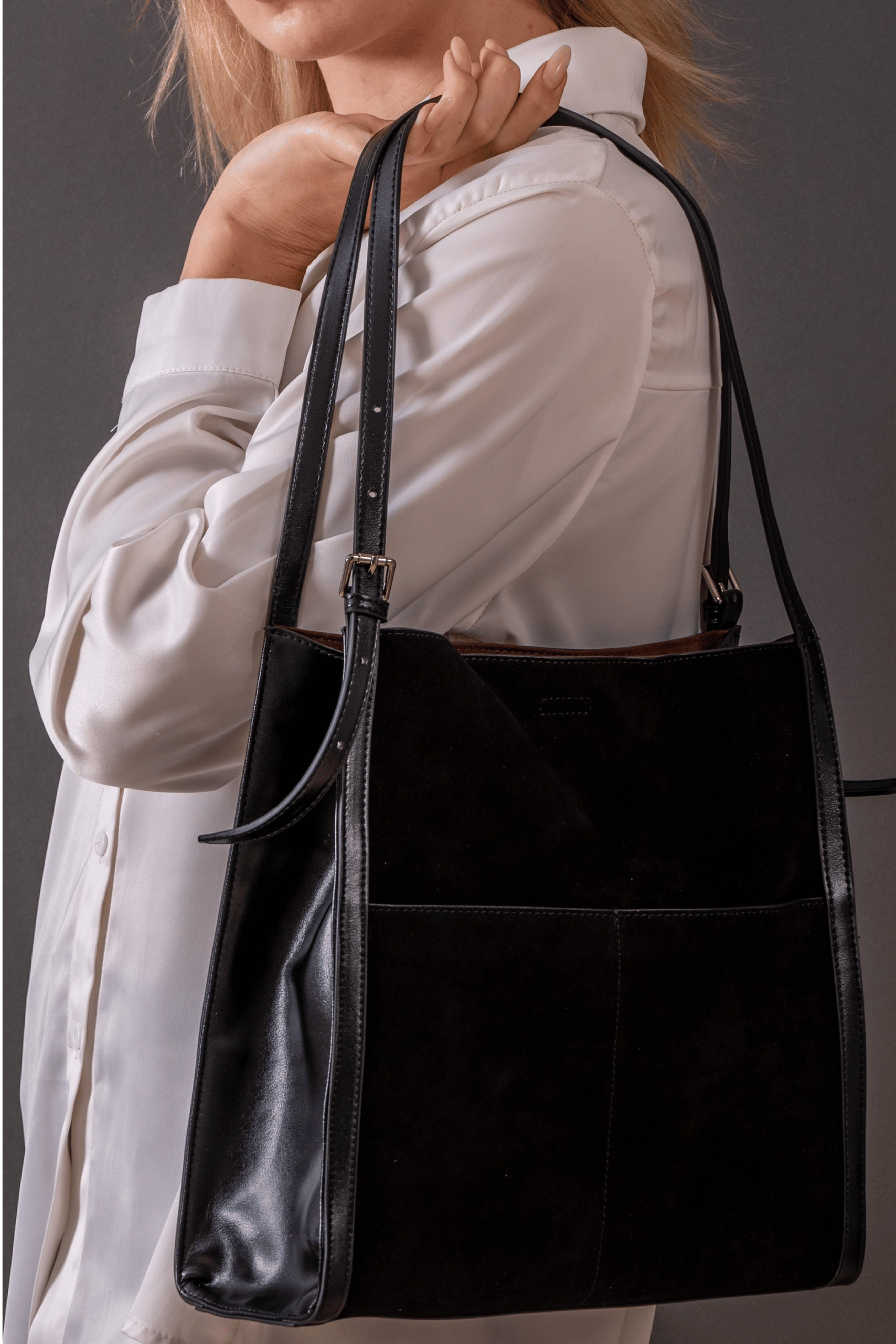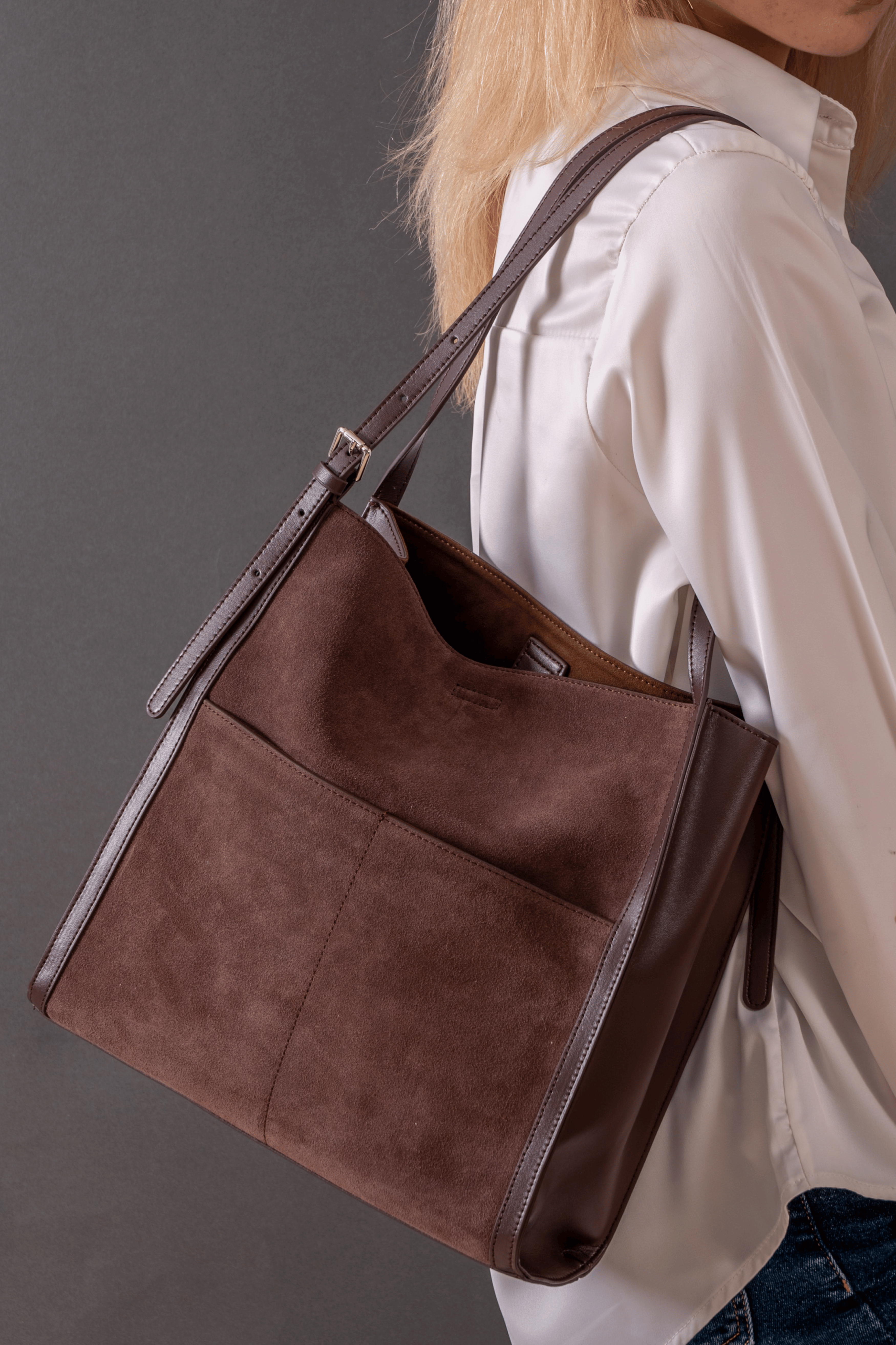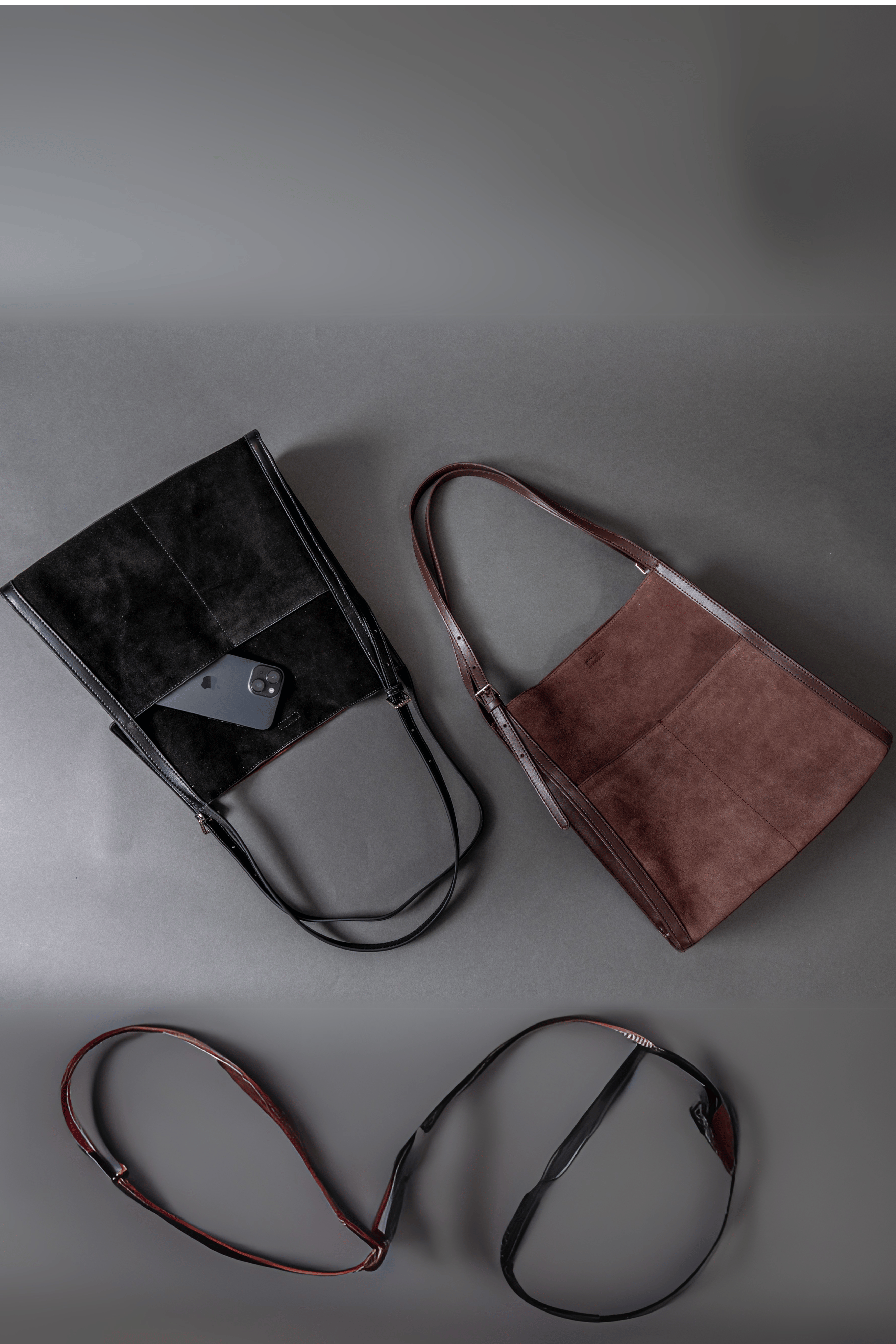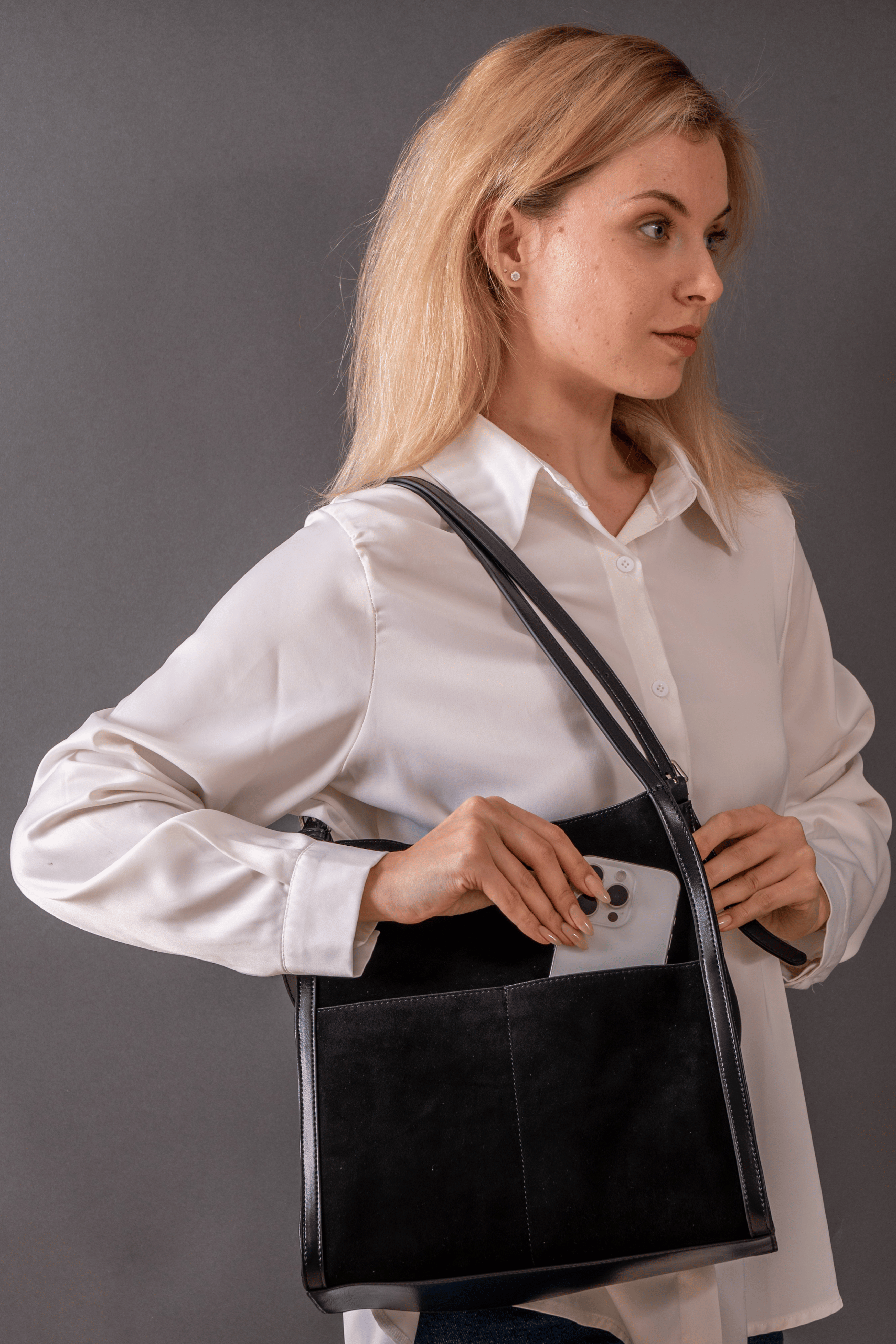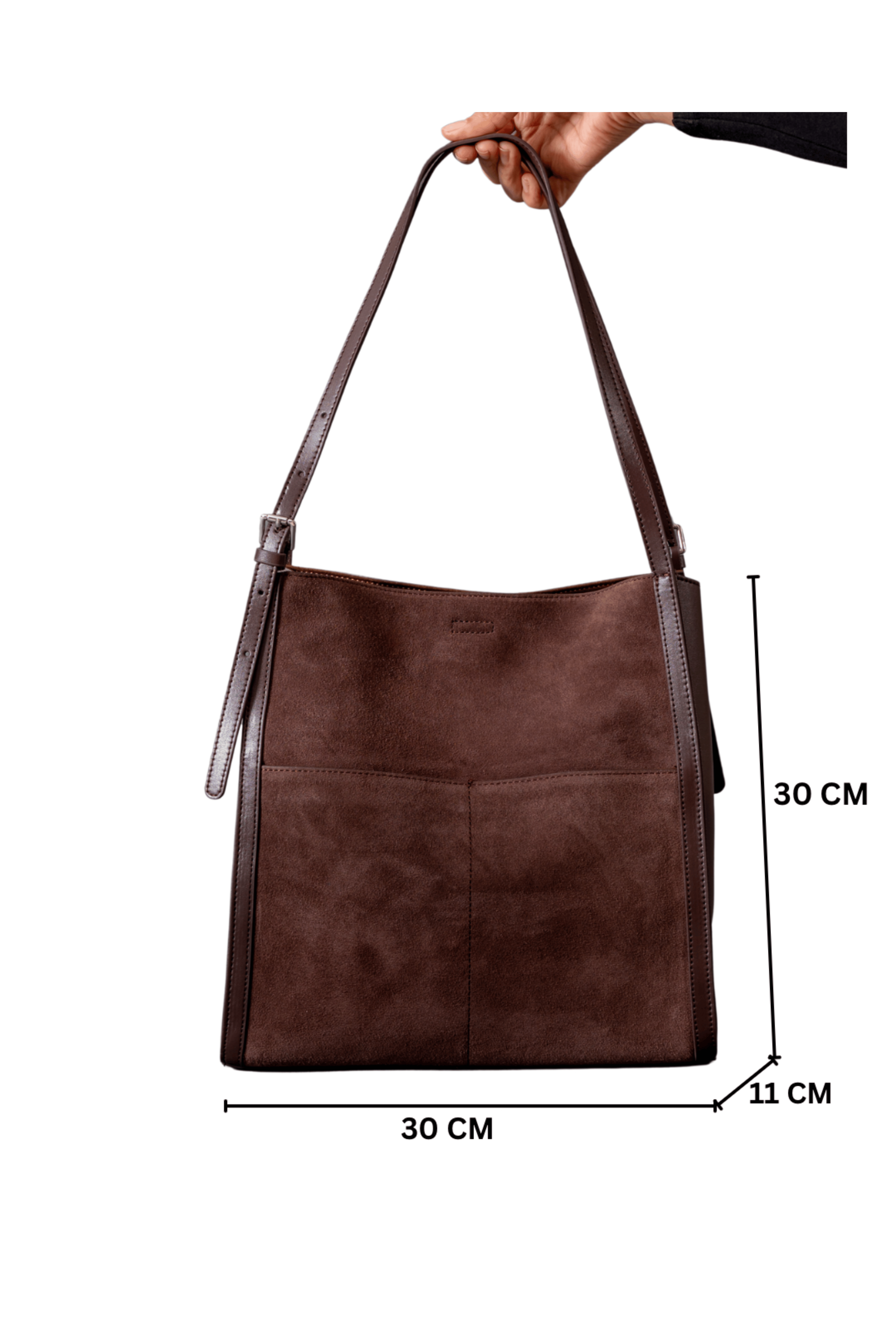 Meticulously crafted with focus on both functionality and style, our medium Tote bag, Siena is here to enhance your everyday style. This versatile Tote features: 1.Premium Material Mix: Suede leather at the front for a velvety, refined texture, paired with durable smooth leather at the back for added strength and elegance. 2. Functional Interior: Two spacious compartments separated by a zippered pocket in the middle along with two pockets at sides, offering excellent organization for your essentials. Main compartment is roomy enough to hold your notebooks, tablet and daily essentials while maintaining a compact profile. 3. Magnetic Button Closure: Ensures secure and easy access to your belongings. 4. Practical Front Pockets: Two functional pockets at the front for quick access to essentials like phone or keys , adding convenience and style. 5. Adjustable Shoulder Straps: for comfortable customized fit. 6. Dust Bag: comes in a cotton dust bag for storing when not in use.
