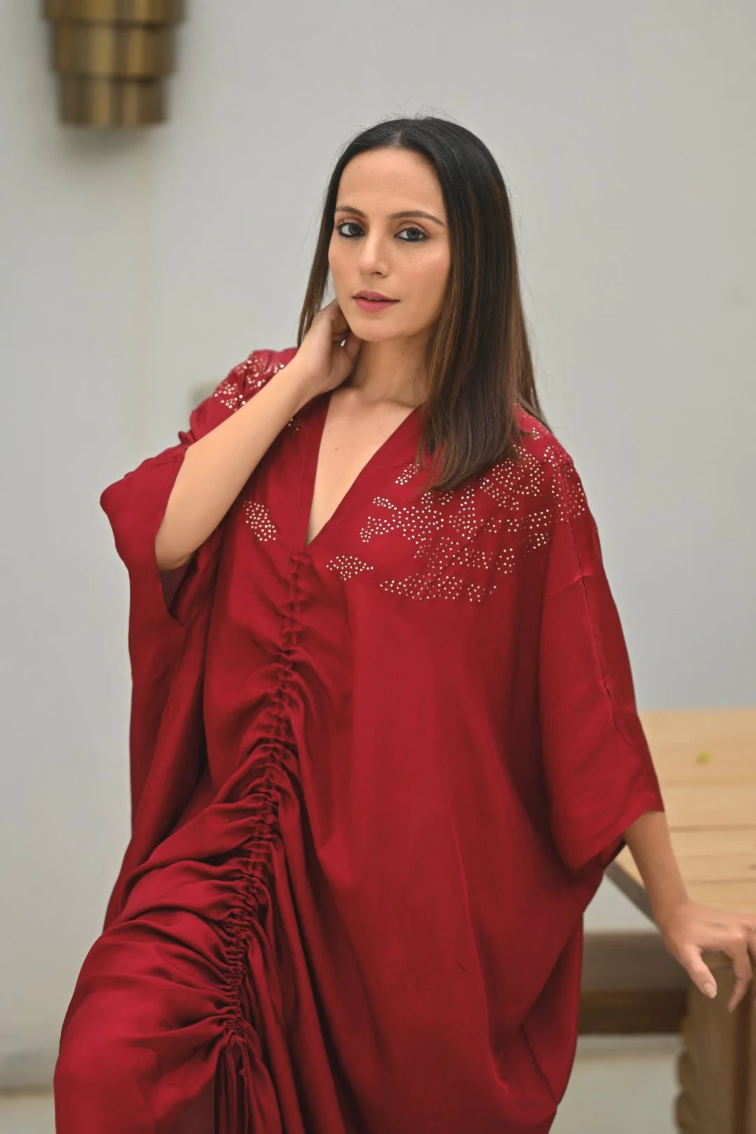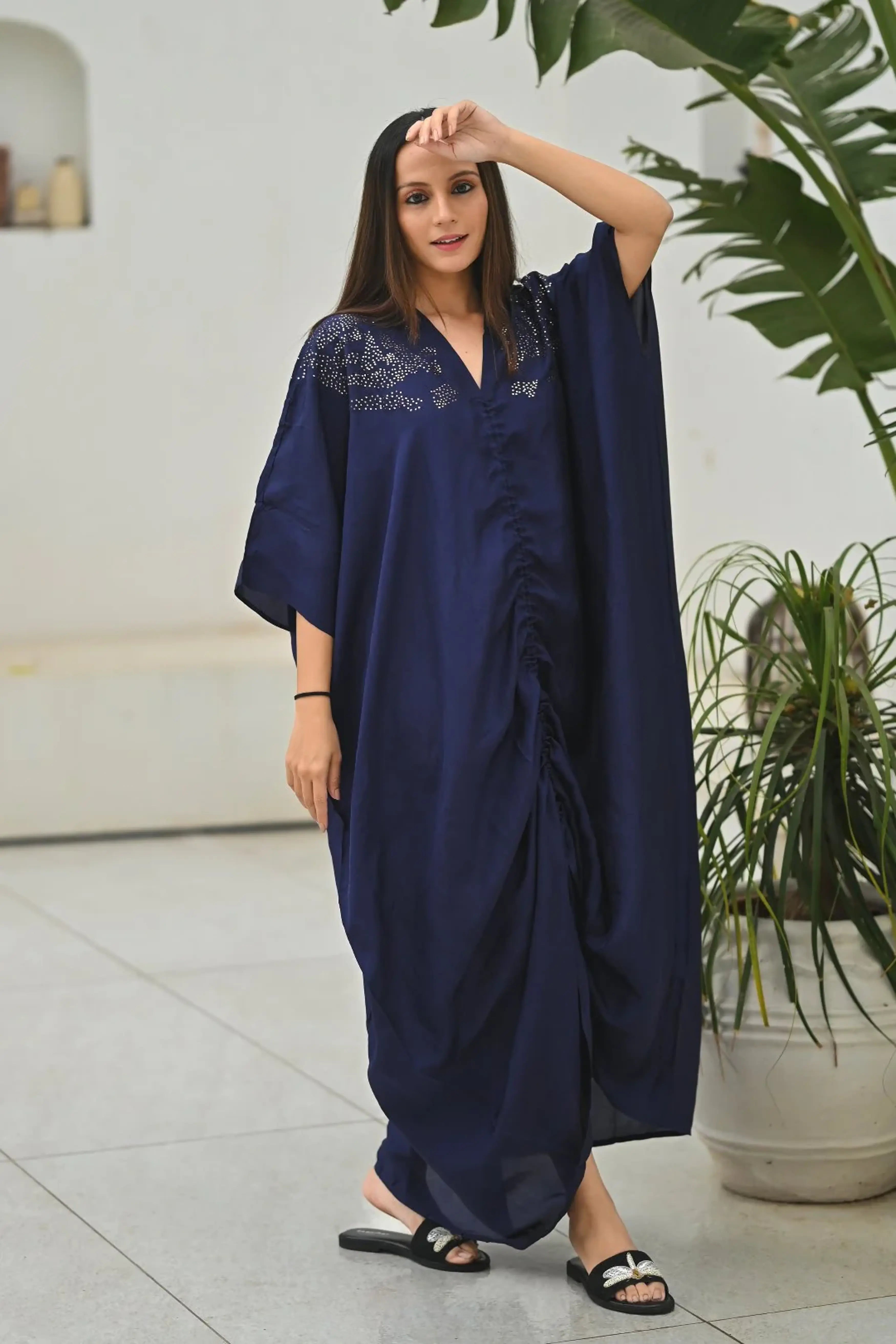 Perfect for the Free-Spirited, Travel-Loving Woman. Its an explosion of exquisite craftmanship by skilled artisans using the traditional technique of Gold metal work. For those who love to travel and embrace their unique style, this Kaftan is a must-have. With its free sizing and drawstring front, you can adjust it to