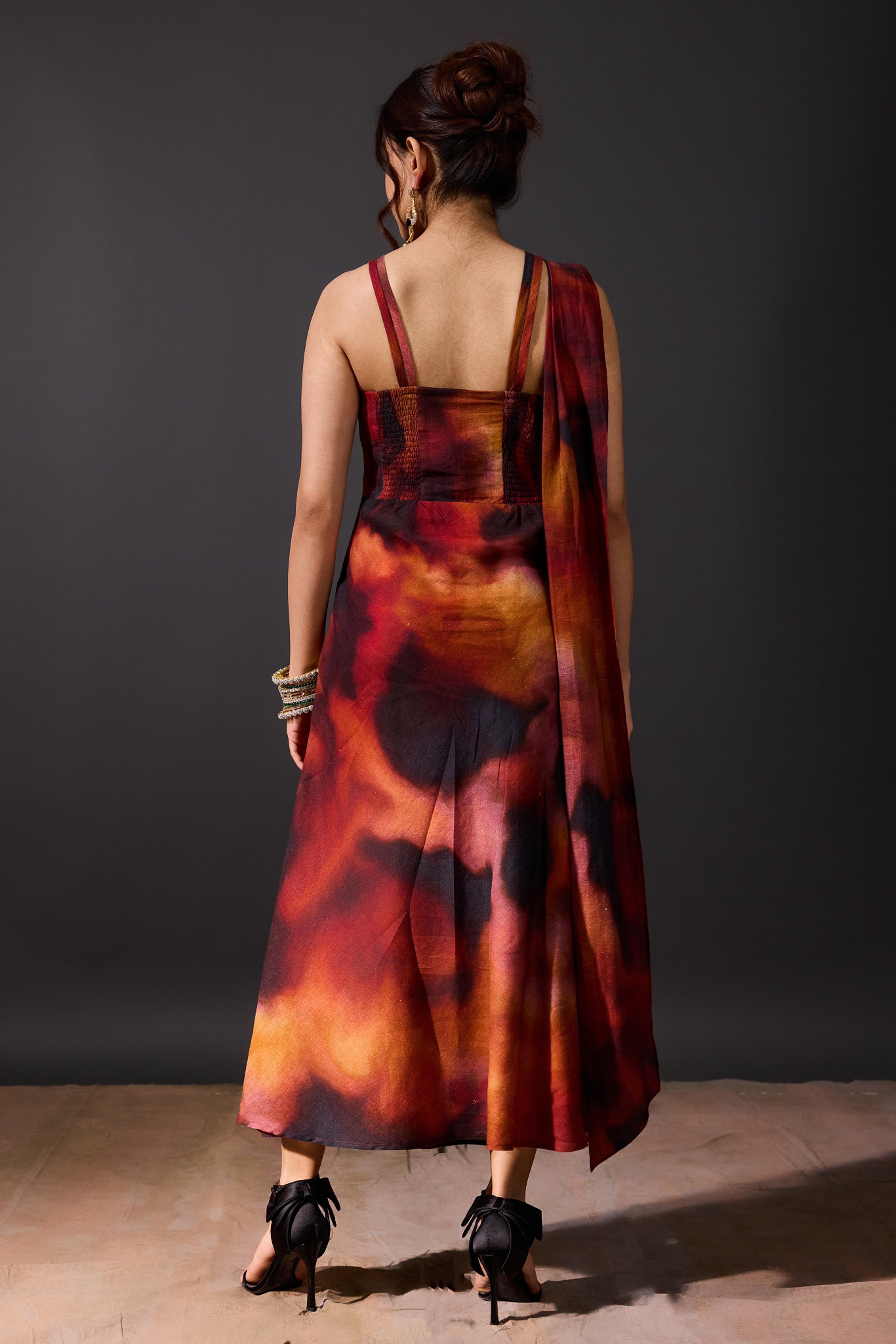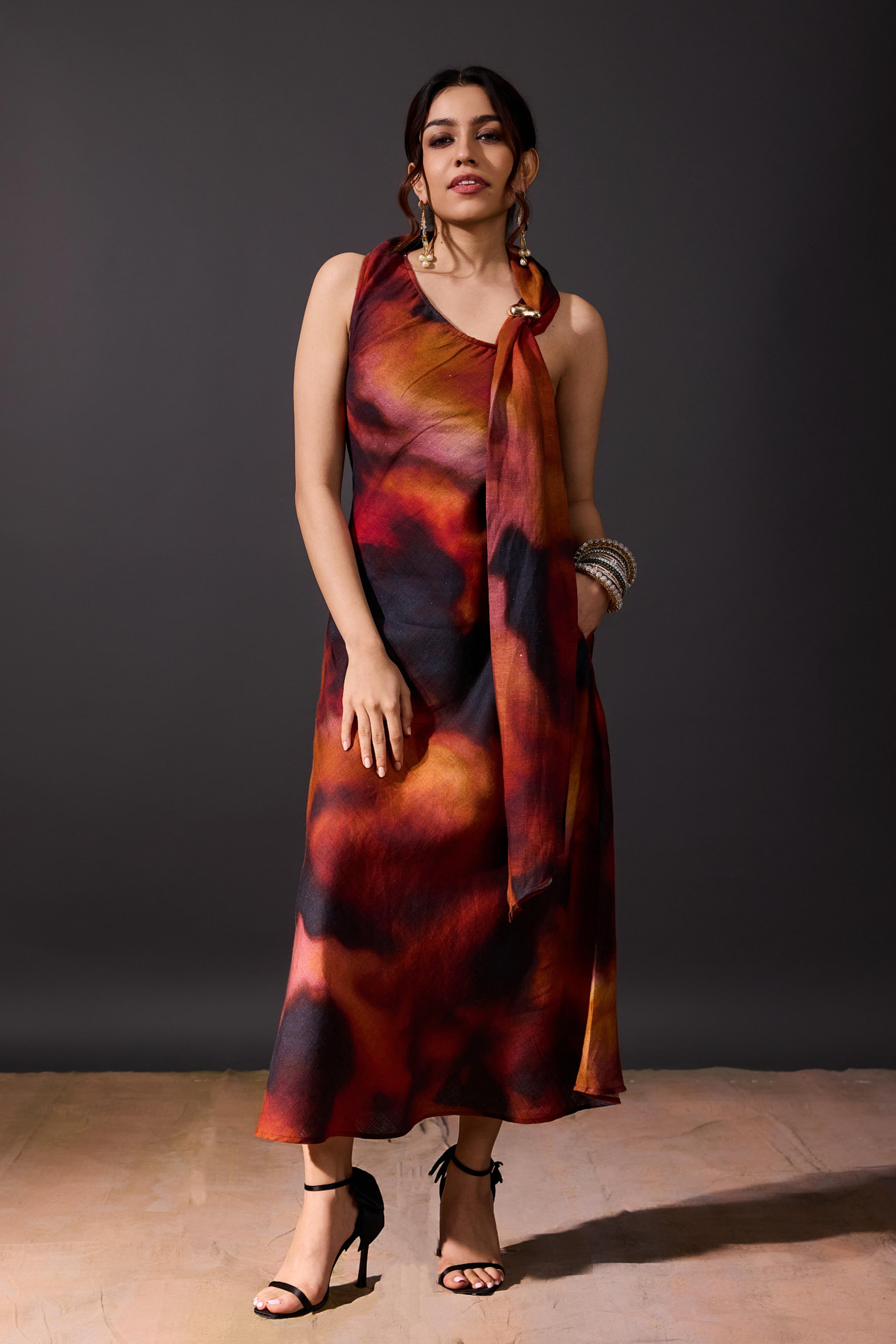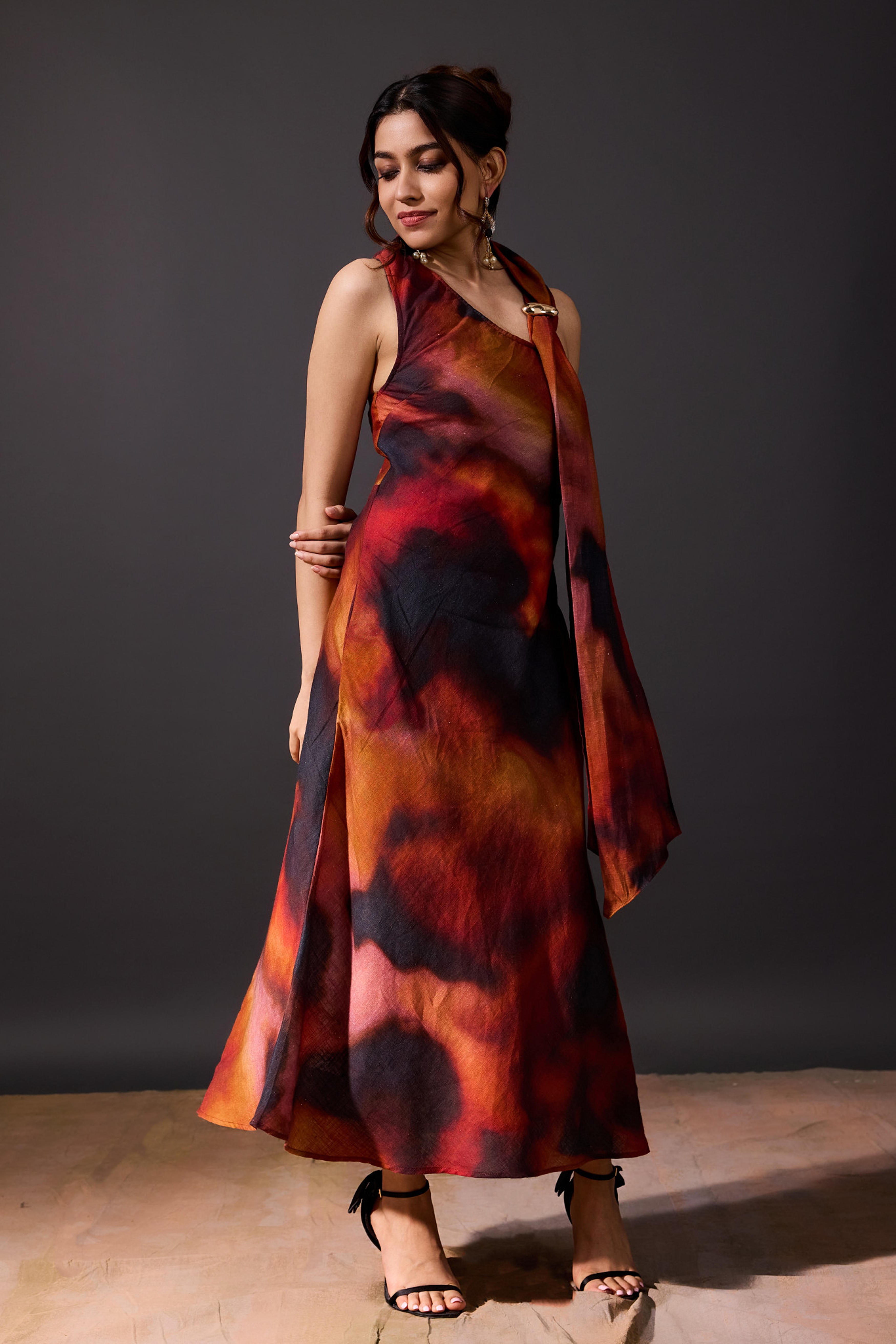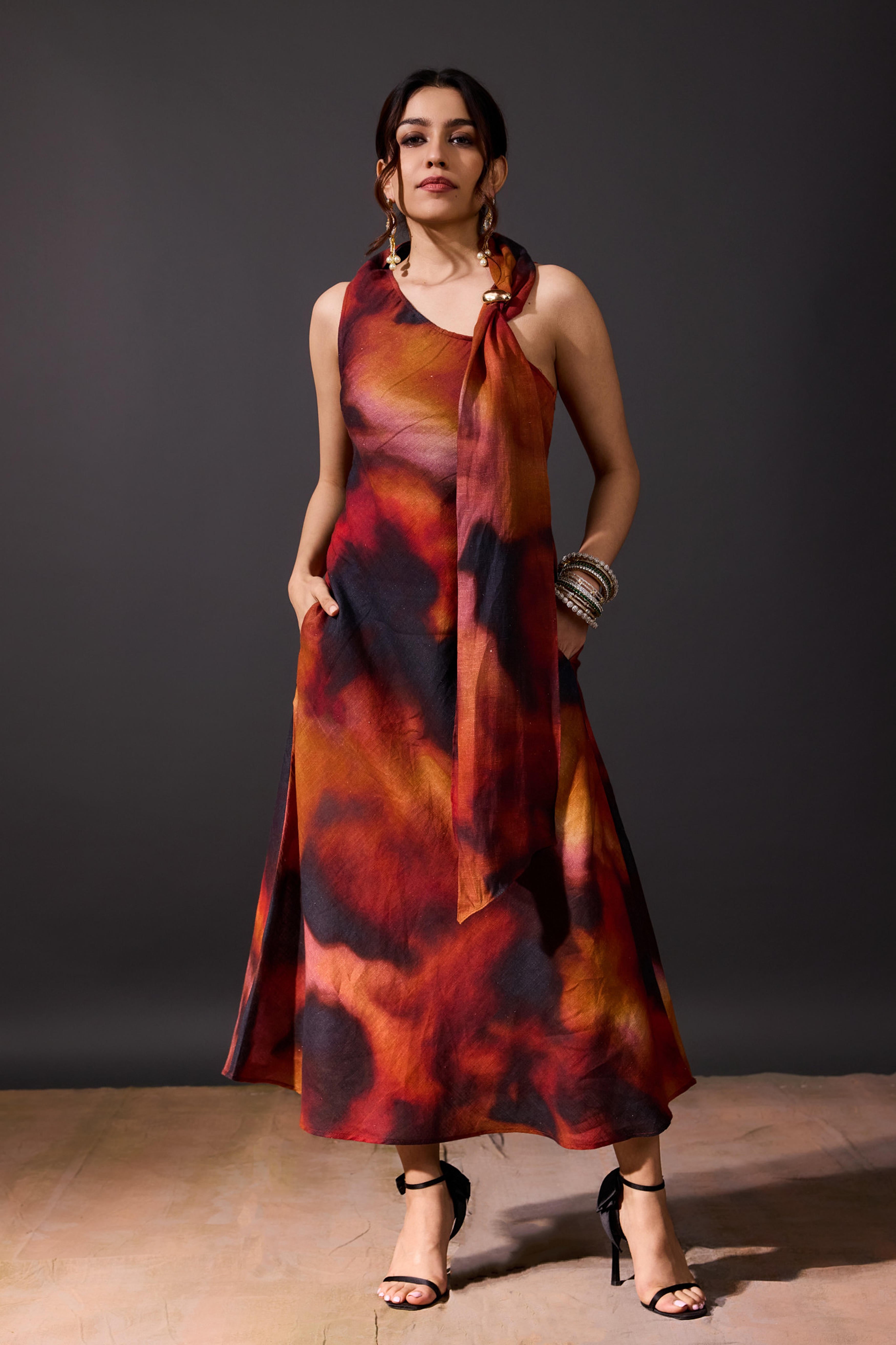 The Smriti Dress in Inferno is a bold statement piece that blends structure with fluidity. Crafted from 100% linen, it features an asymmetrical one-shoulder silhouette anchored with a sculptural metallic brooch. An attached dupatta flows from one shoulder, offering versatile styling, drape it across the front, let it fall loosely at the back, or wrap it around for added drama. The relaxed A-line midi cut ensures effortless movement and elegance. Printed in the fiery Inferno palette of reds, burnt amber, and deep black, the dress is designed for festive soirées, cocktail evenings, and cultural gatherings where elegance meets individuality.