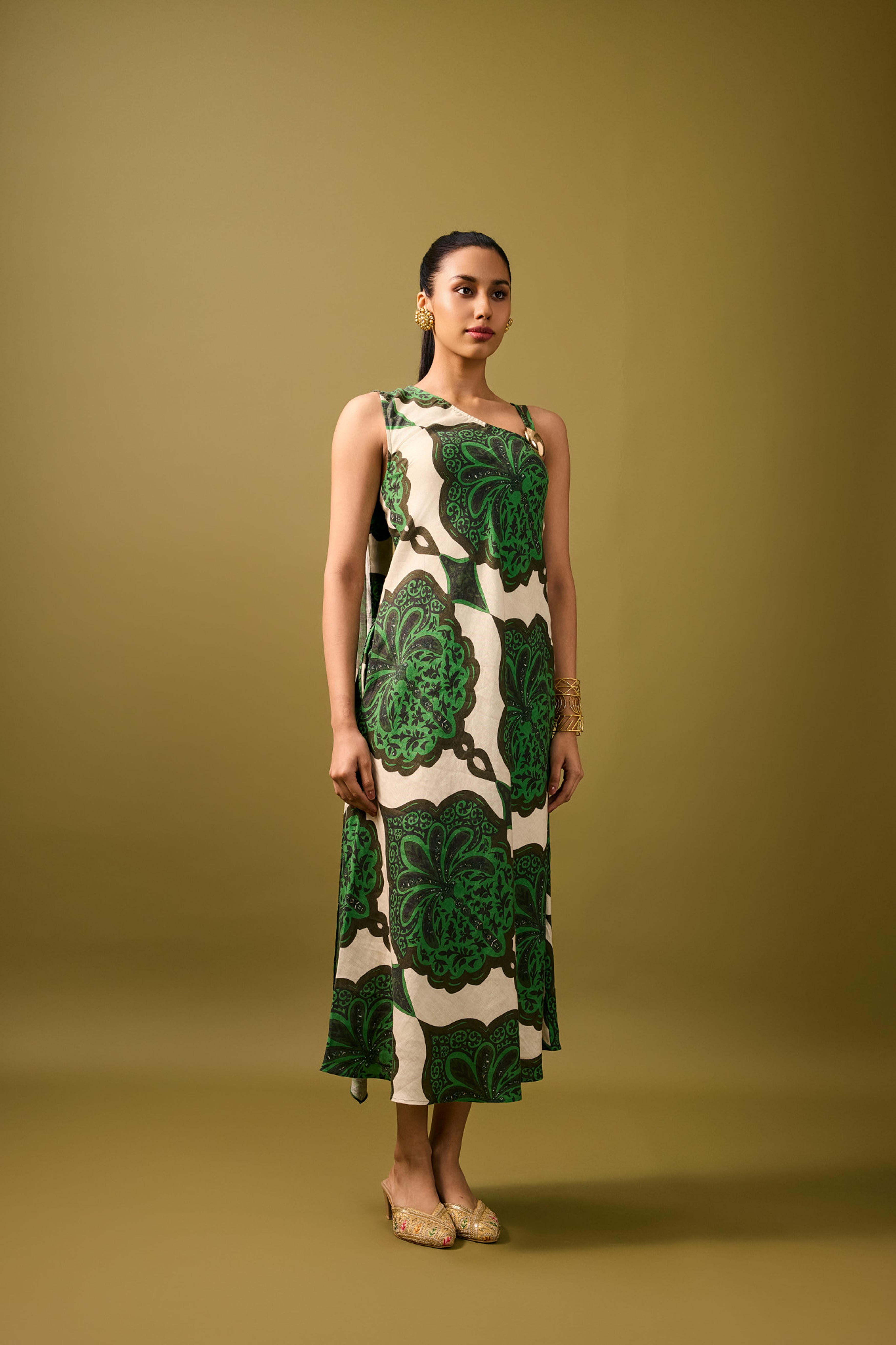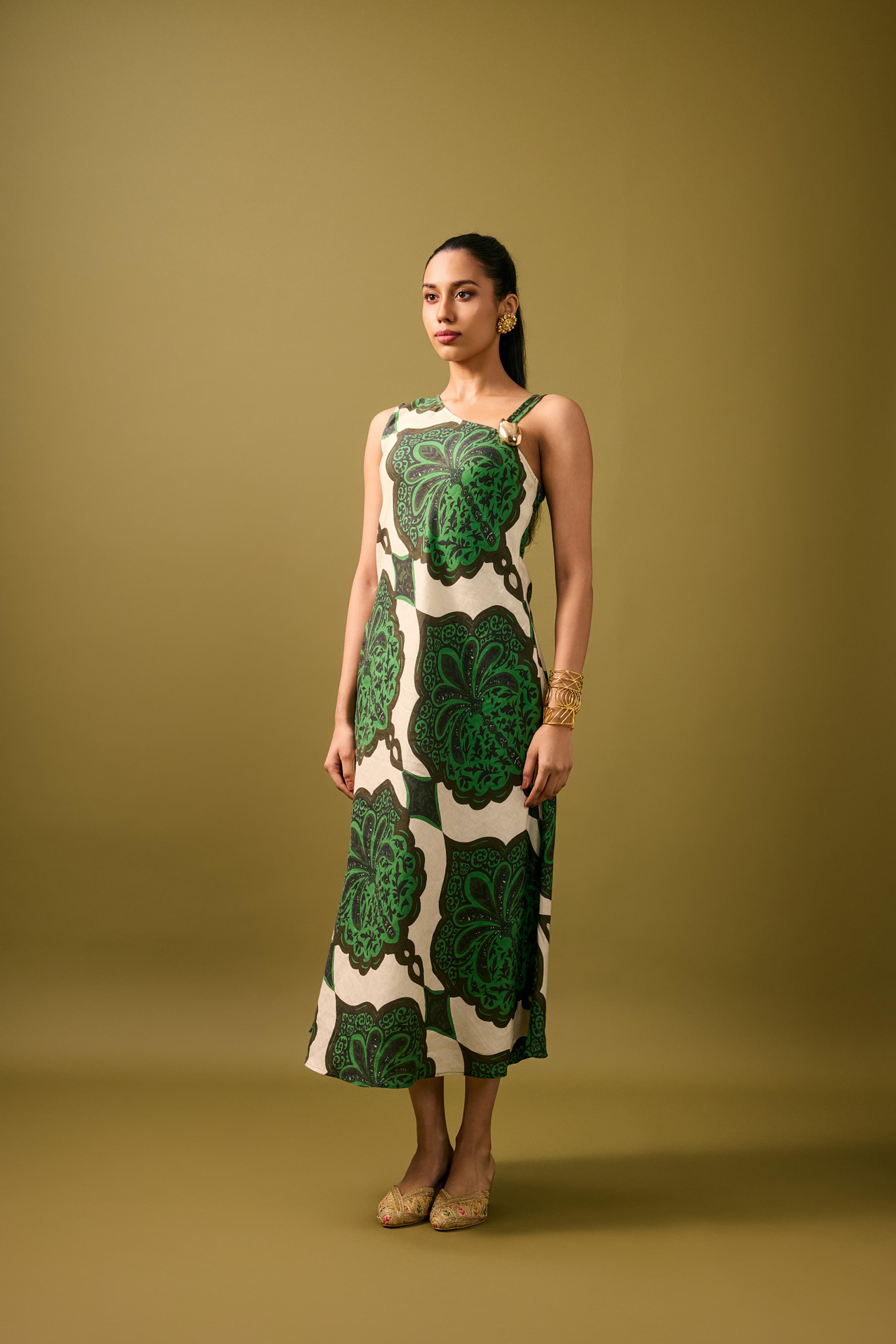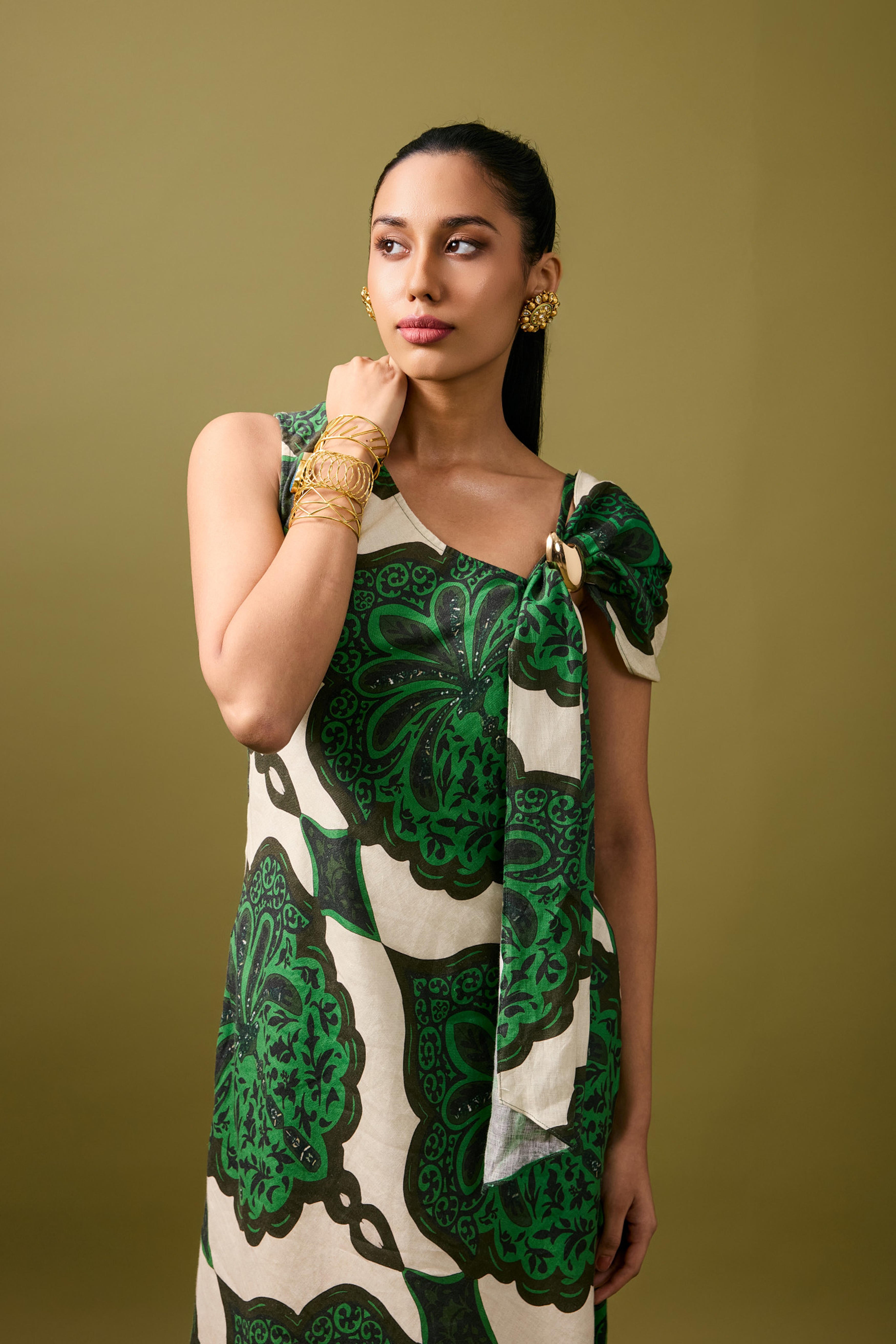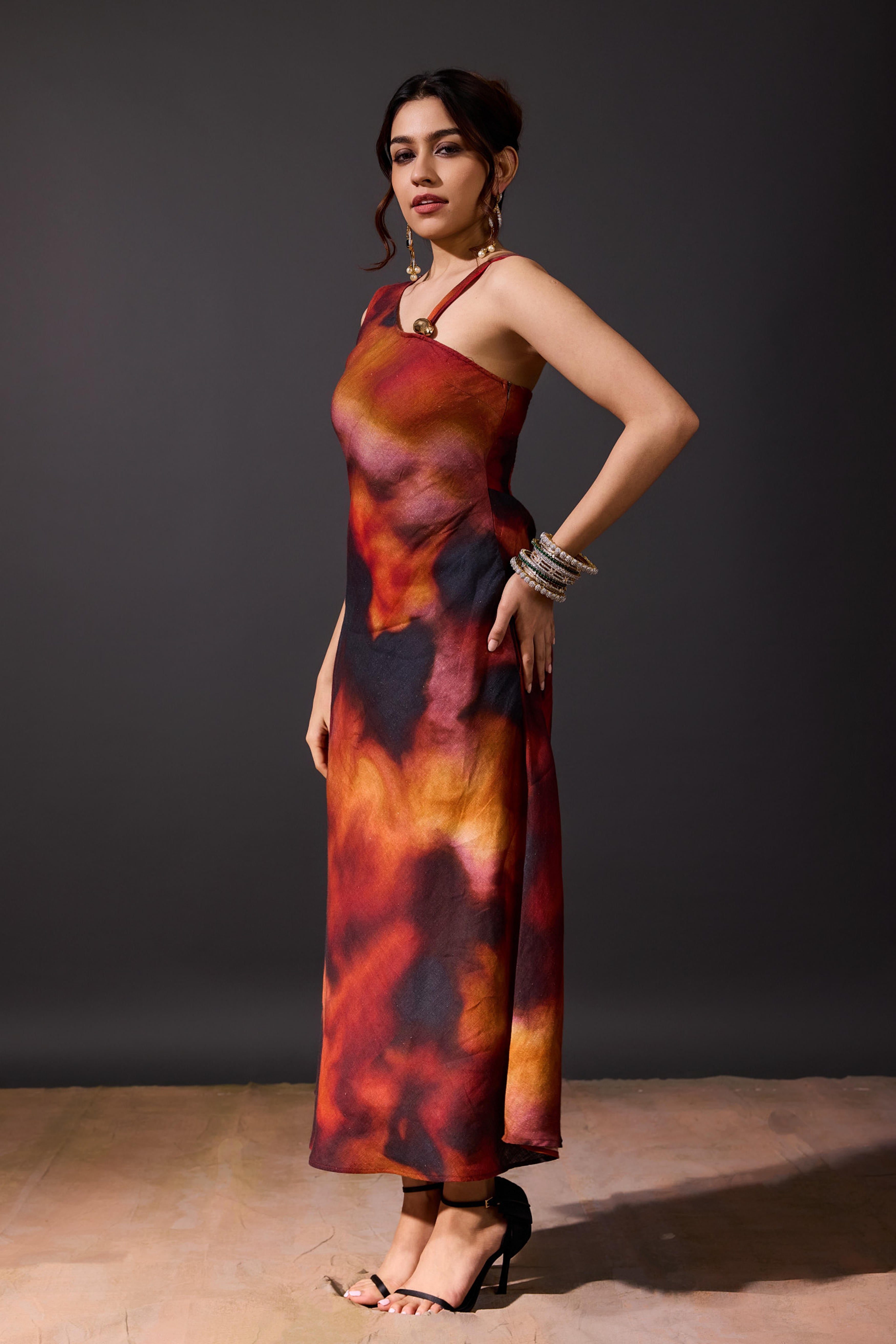 The Smriti Dress in Inferno is a bold statement piece that blends structure with fluidity. Crafted from 100% linen, it features an asymmetrical one-shoulder silhouette anchored with a sculptural metallic brooch. An attached dupatta flows from one shoulder, offering versatile styling, drape it across the front, let it fall loosely at the back, or wrap it around for added drama. The relaxed A-line midi cut ensures effortless movement and elegance. Printed in the fiery Inferno palette of reds, burnt amber, and deep black, the dress is designed for festive soirées, cocktail evenings, and cultural gatherings where elegance meets individuality.