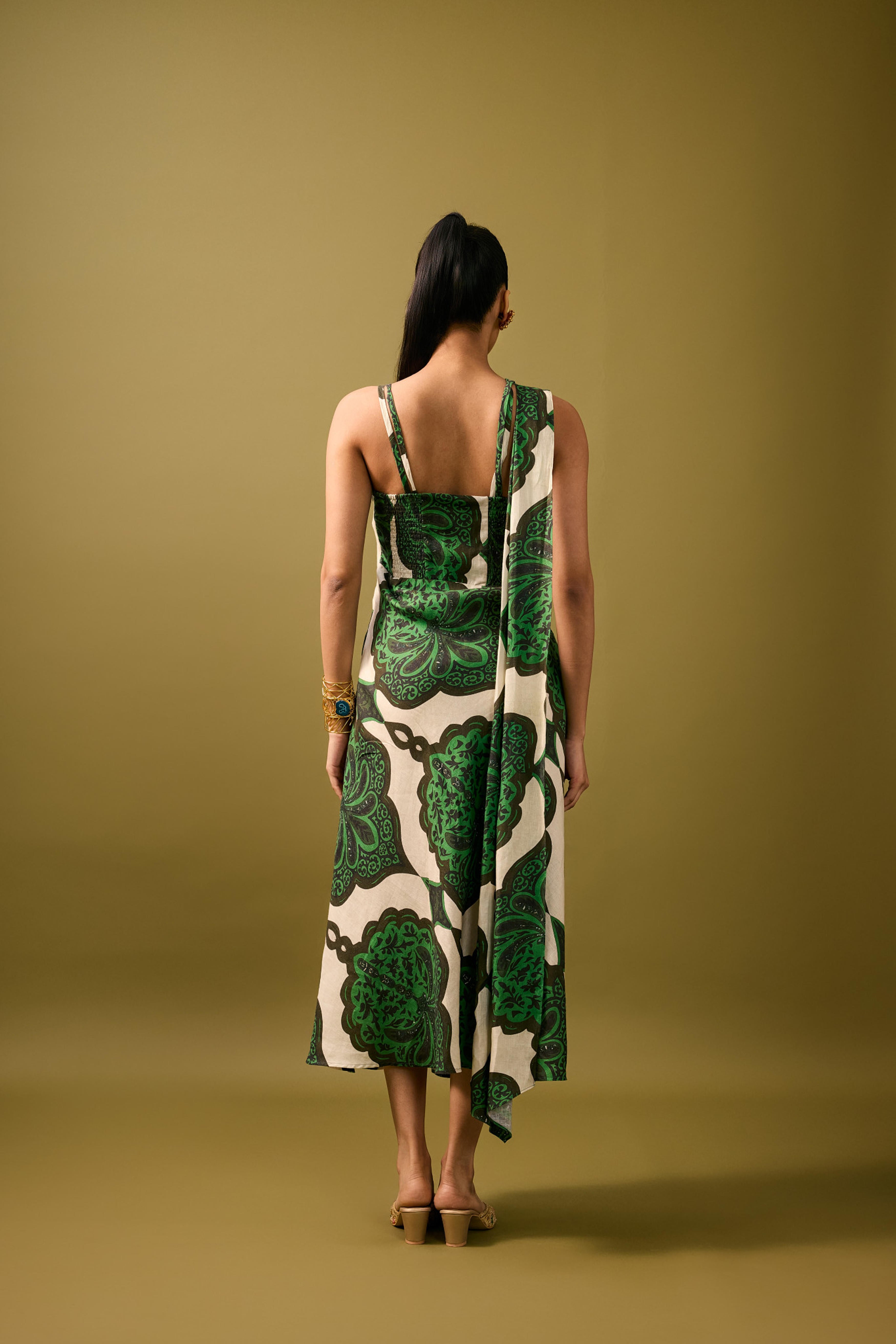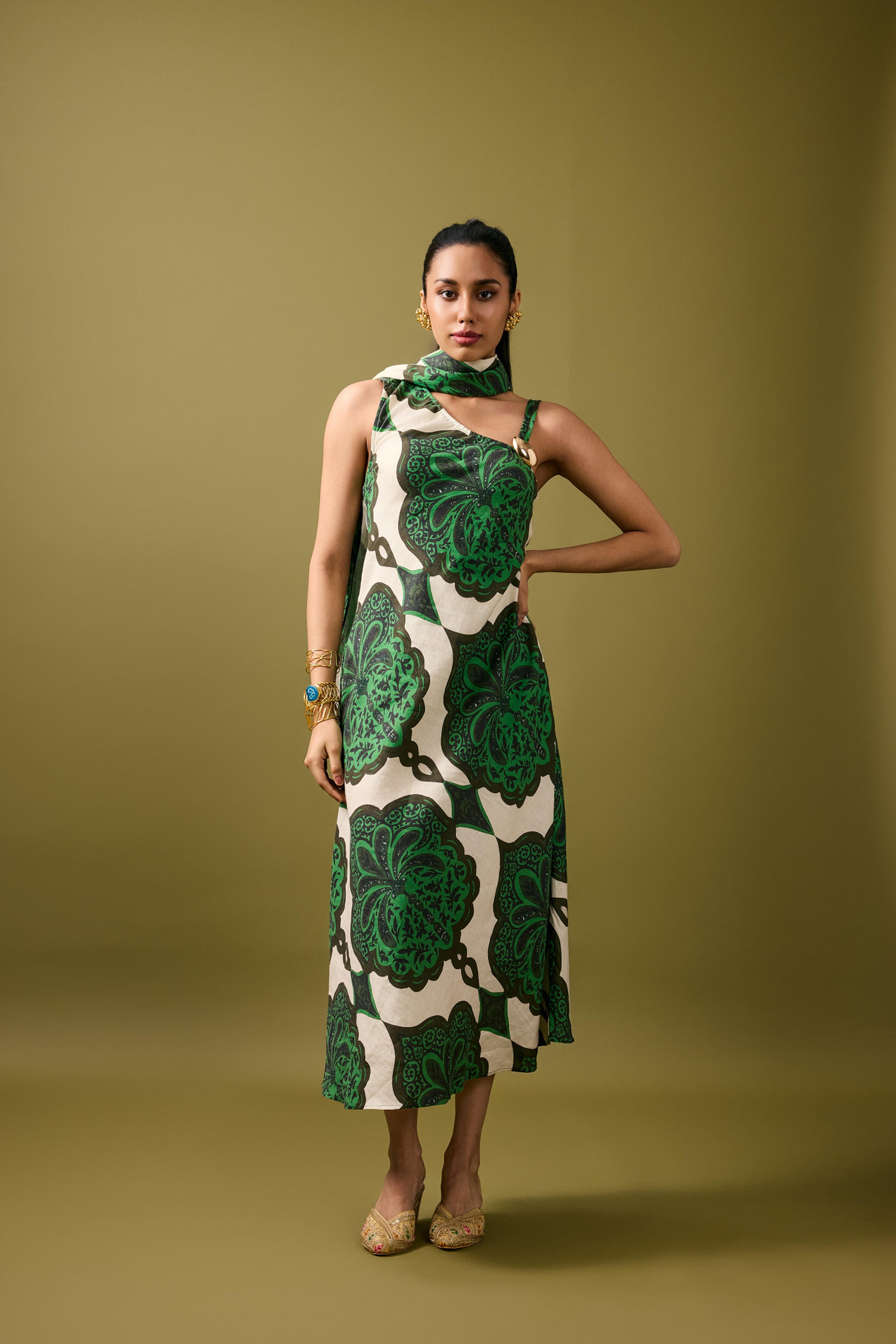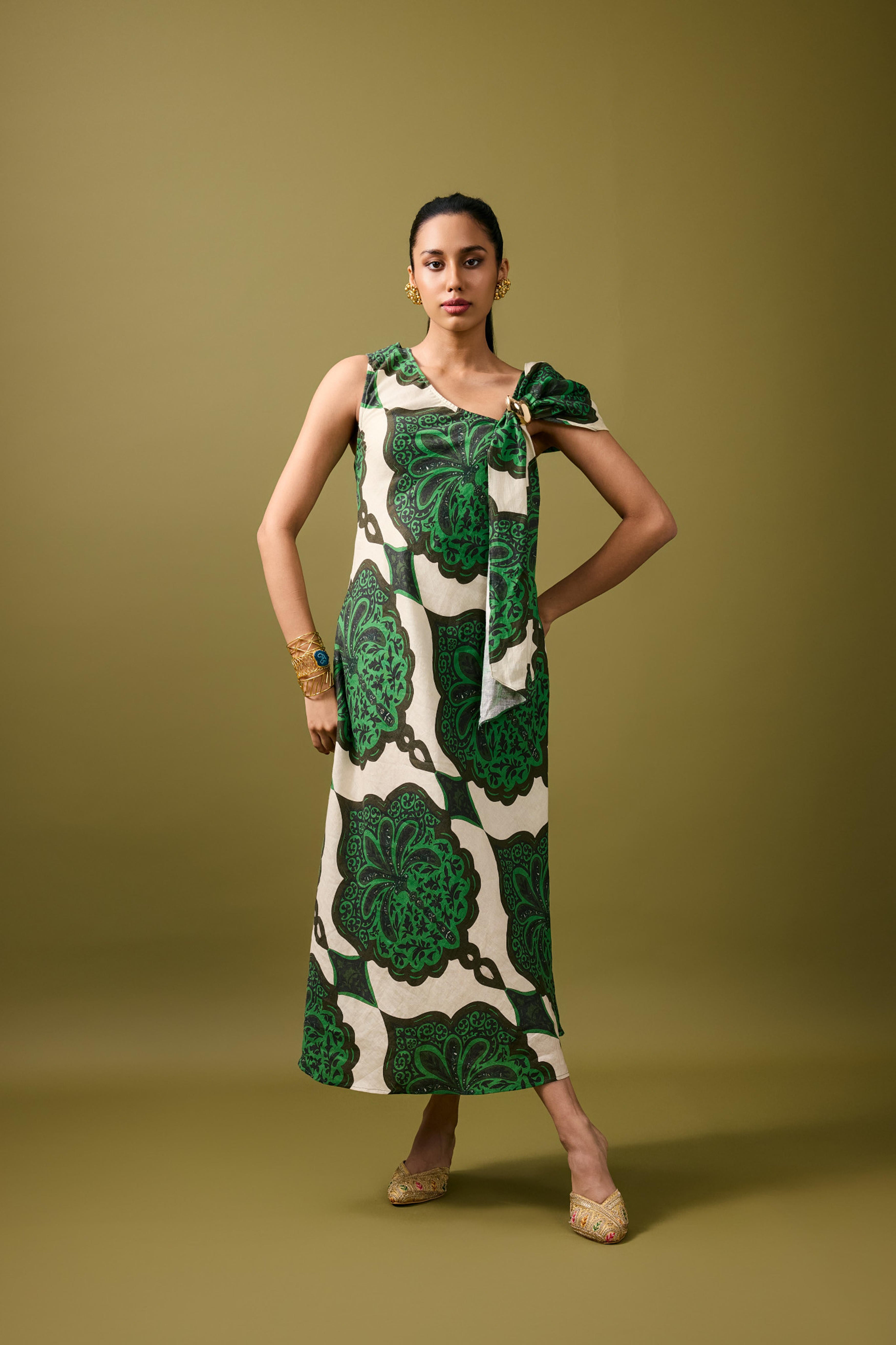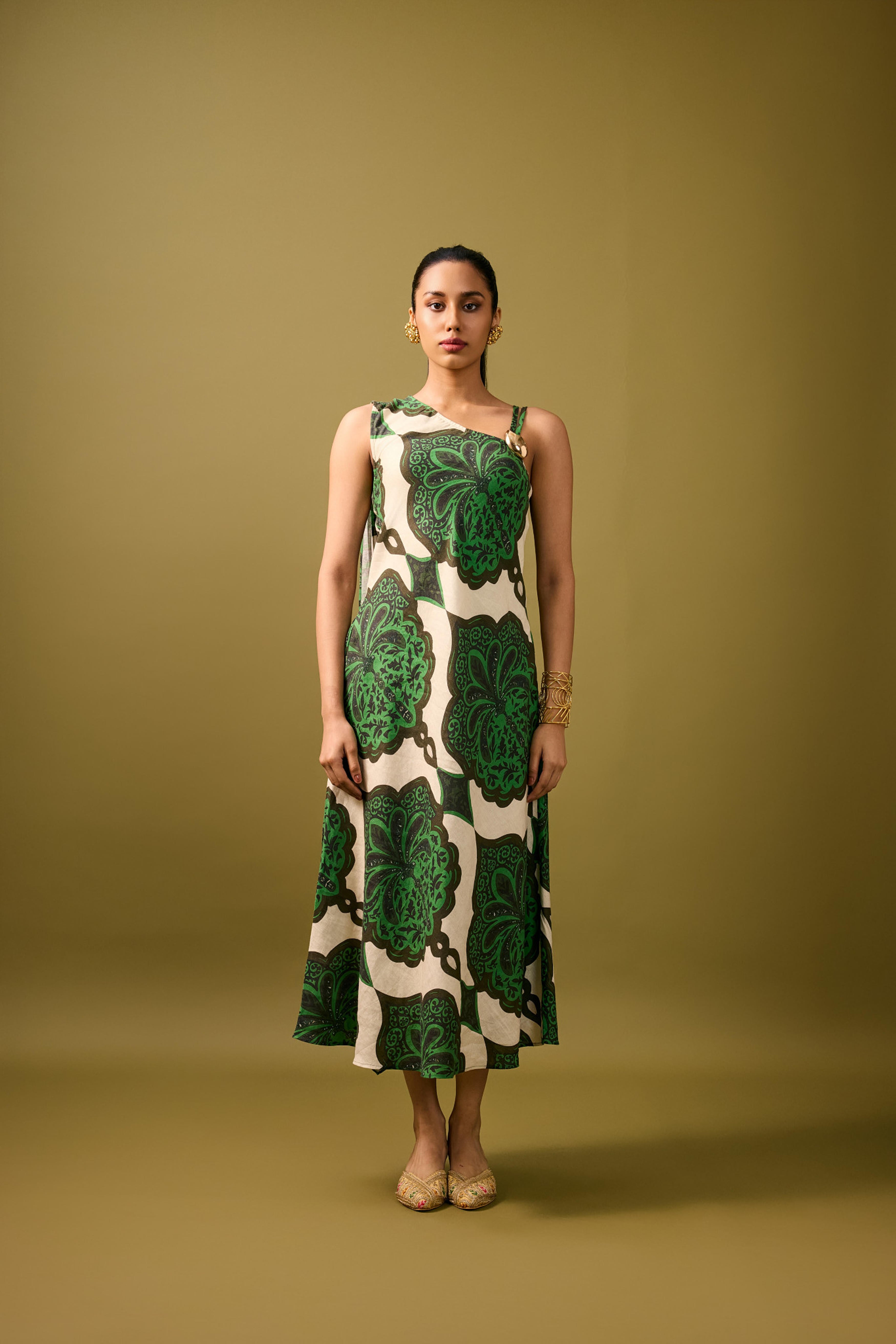 The Smriti Dress in Inferno is a bold statement piece that blends structure with fluidity. Crafted from 100% linen, it features an asymmetrical one-shoulder silhouette anchored with a sculptural metallic brooch. An attached dupatta flows from one shoulder, offering versatile styling, drape it across the front, let it fall loosely at the back, or wrap it around for added drama. The relaxed A-line midi cut ensures effortless movement and elegance. Printed in the fiery Inferno palette of reds, burnt amber, and deep black, the dress is designed for festive soirées, cocktail evenings, and cultural gatherings where elegance meets individuality.