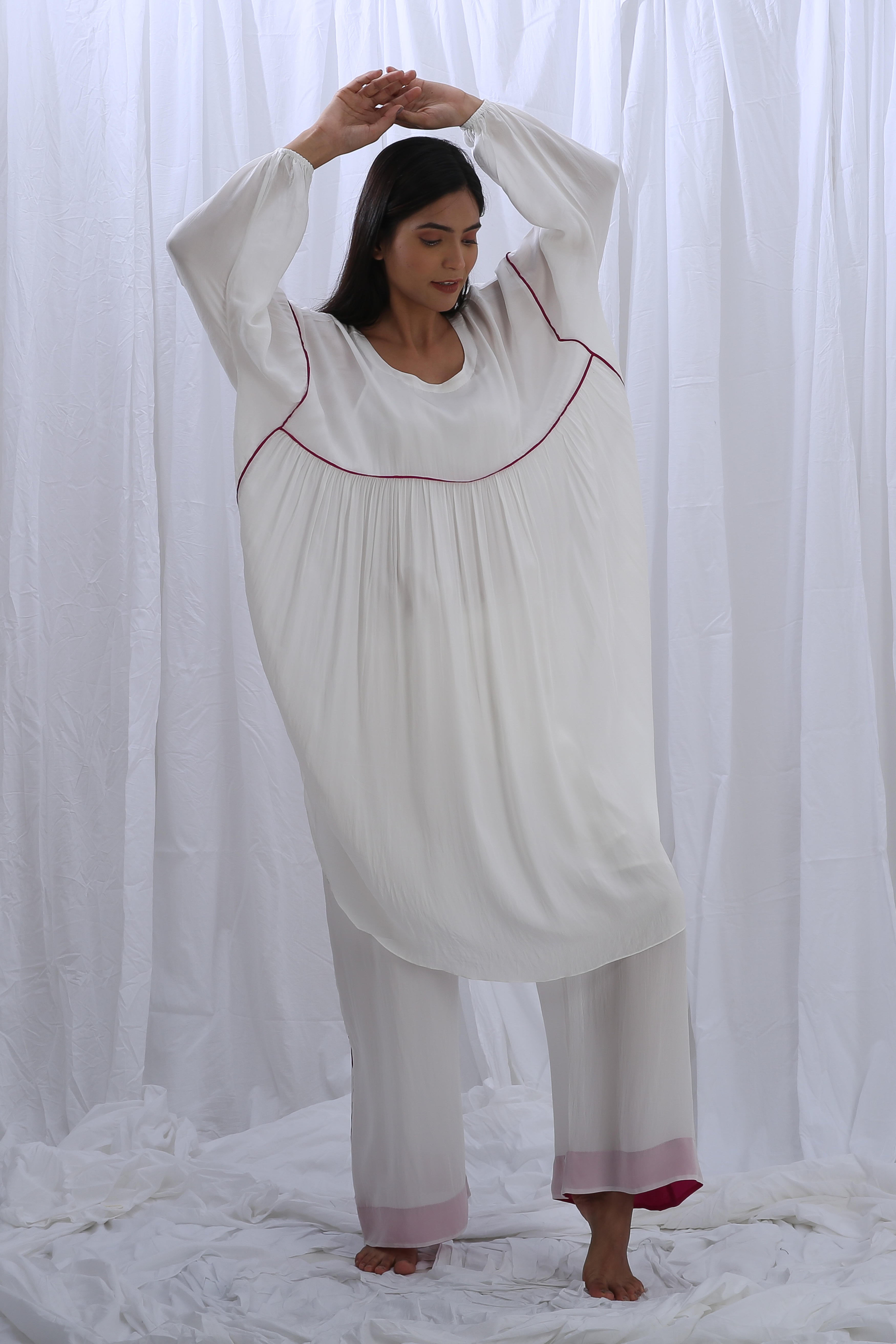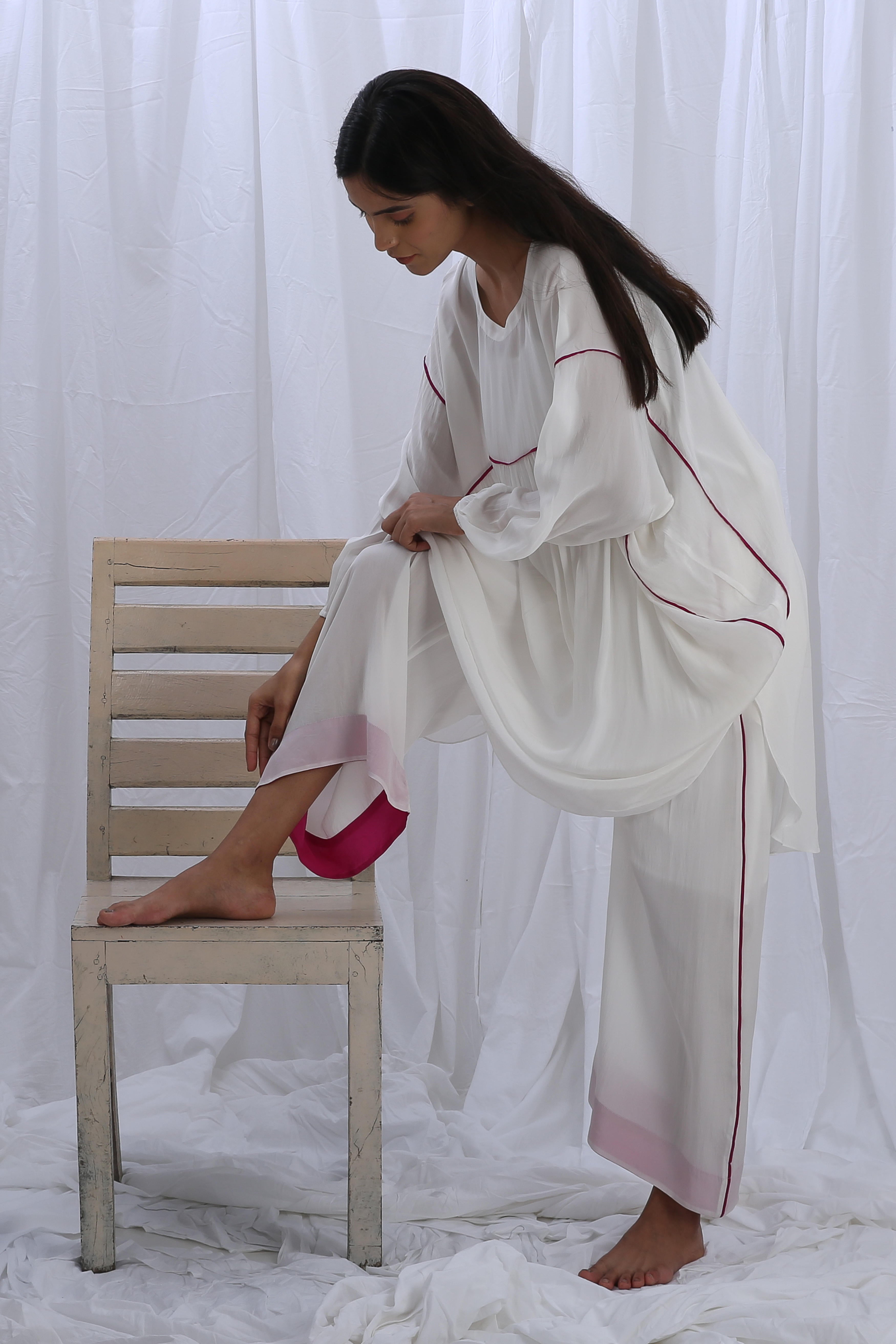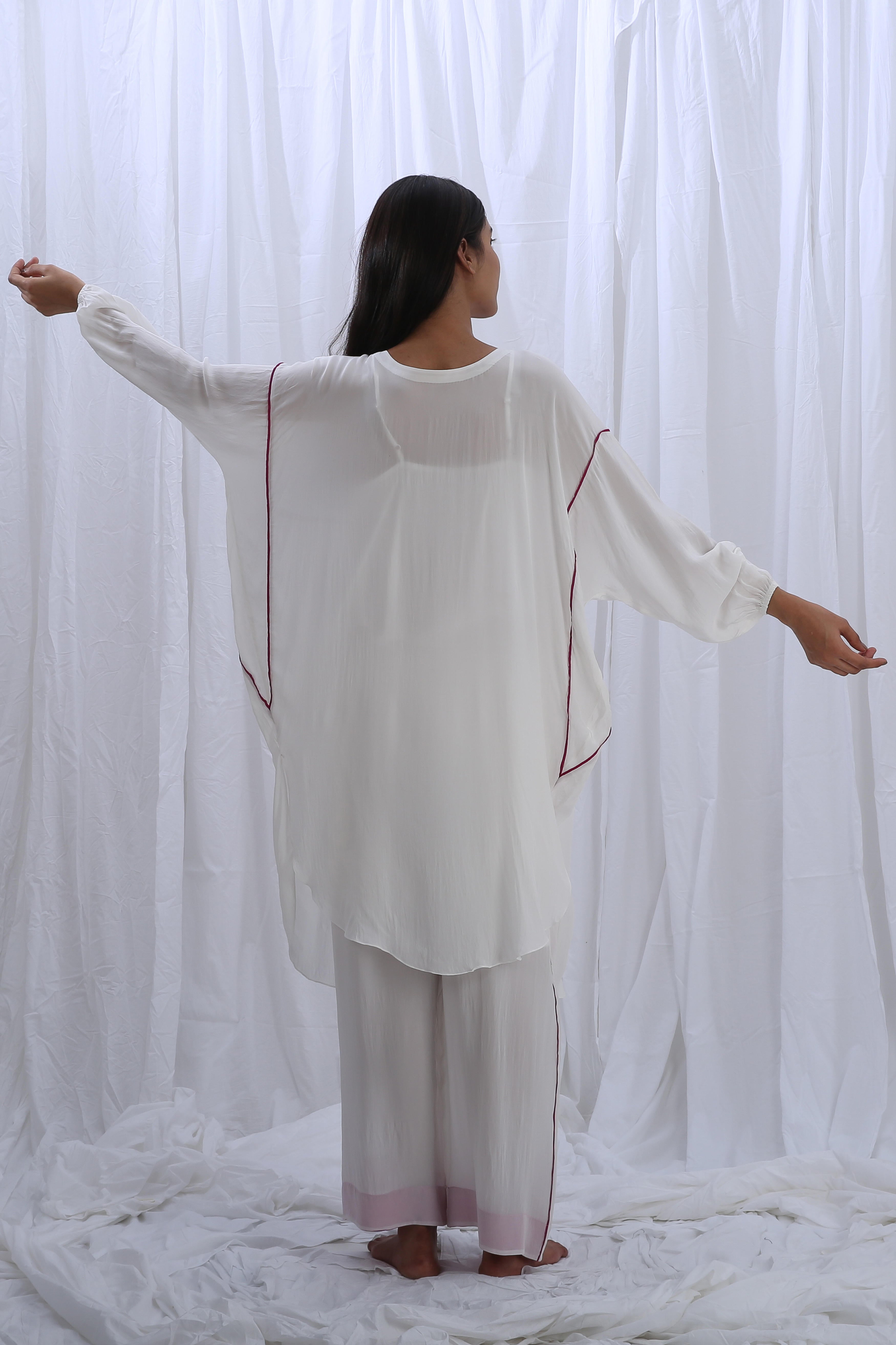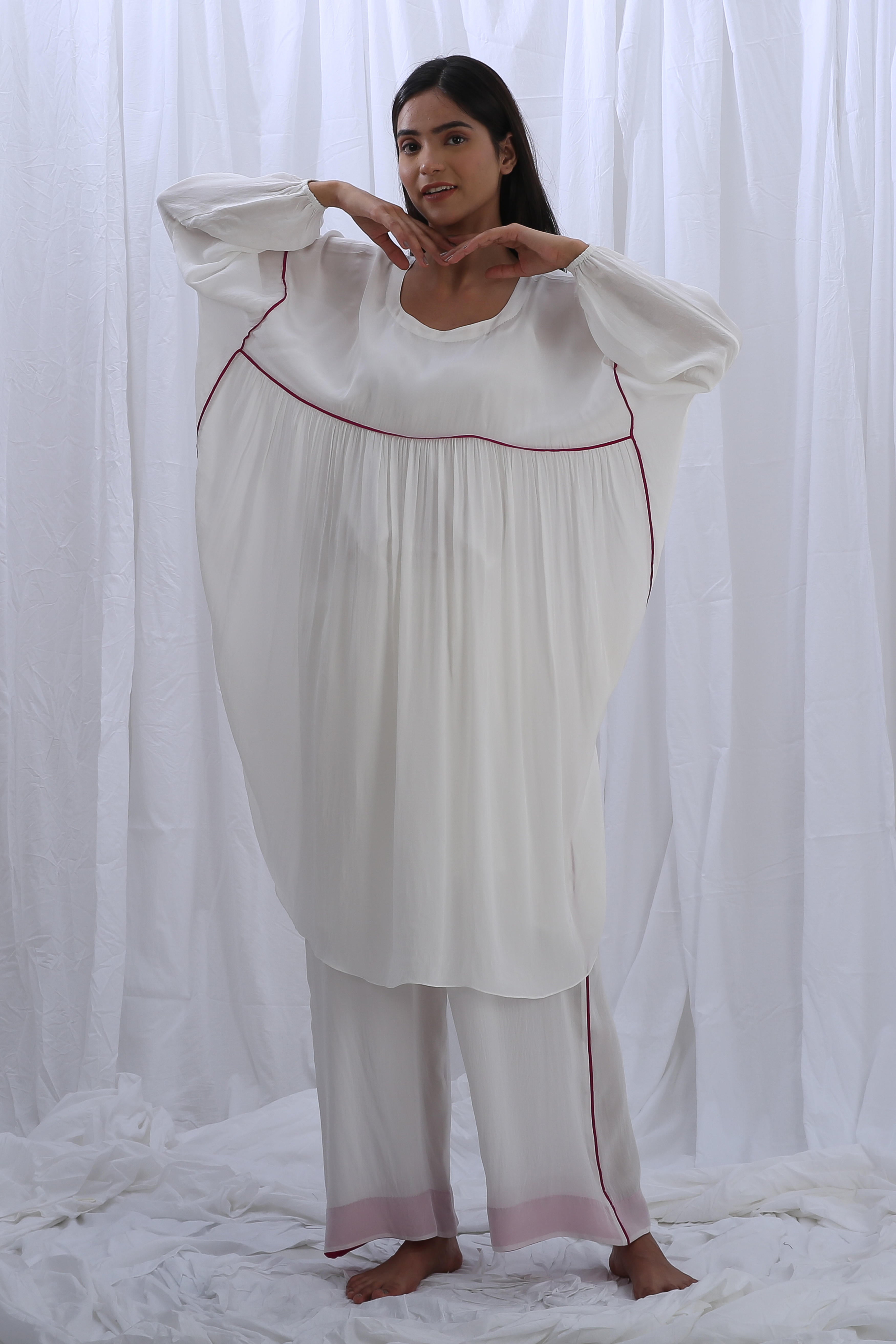 This elegant crepe silk set includes 2 pieces: kaftan and pants in a luminous white. The top features a full length of 44 inches, a 7-inch deep neck, and 16-inch long sleeves for a graceful silhouette. The coordinating pants offers a length of 38 inches, designed with a fully elasticated waistband for all-day comfort and ease.