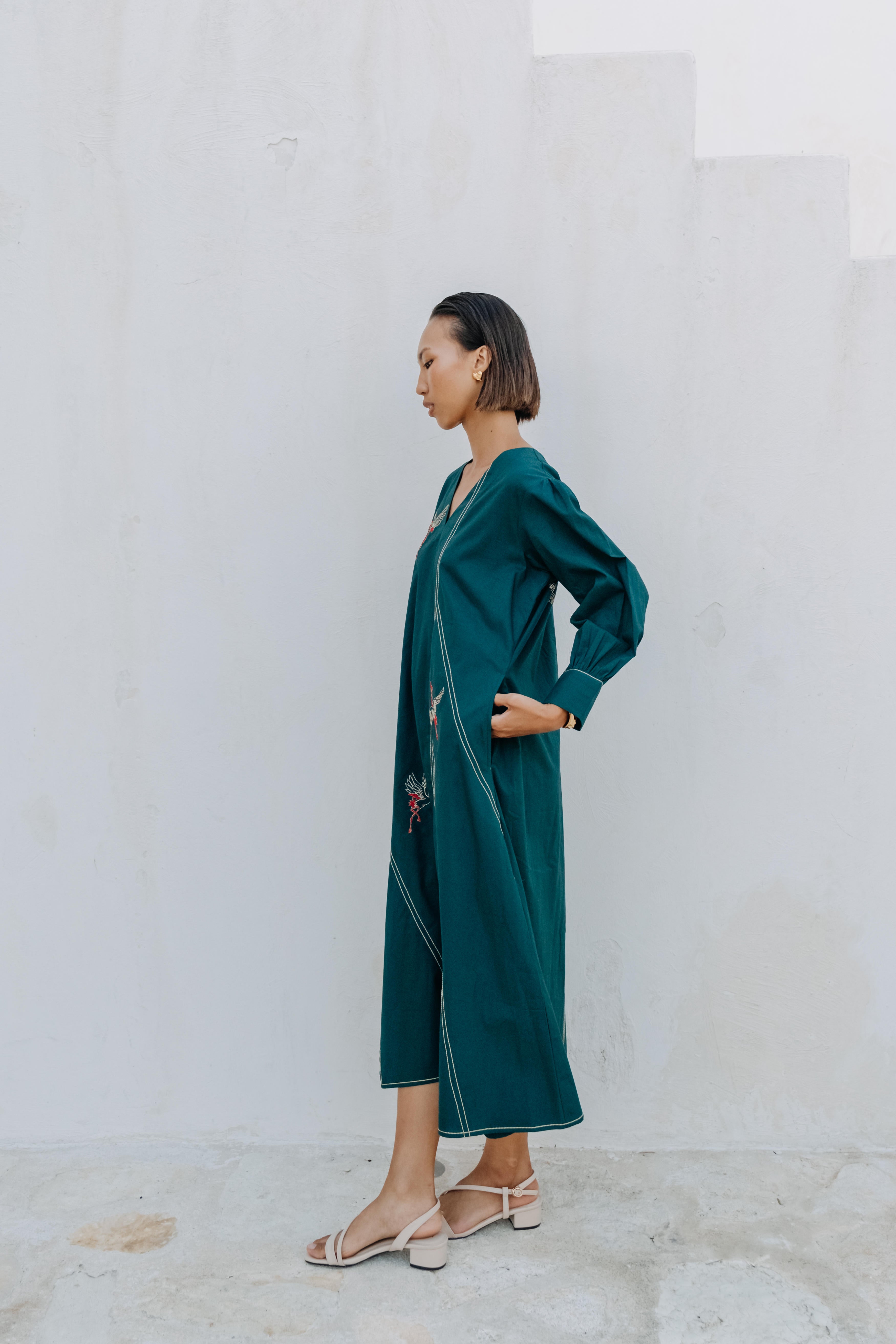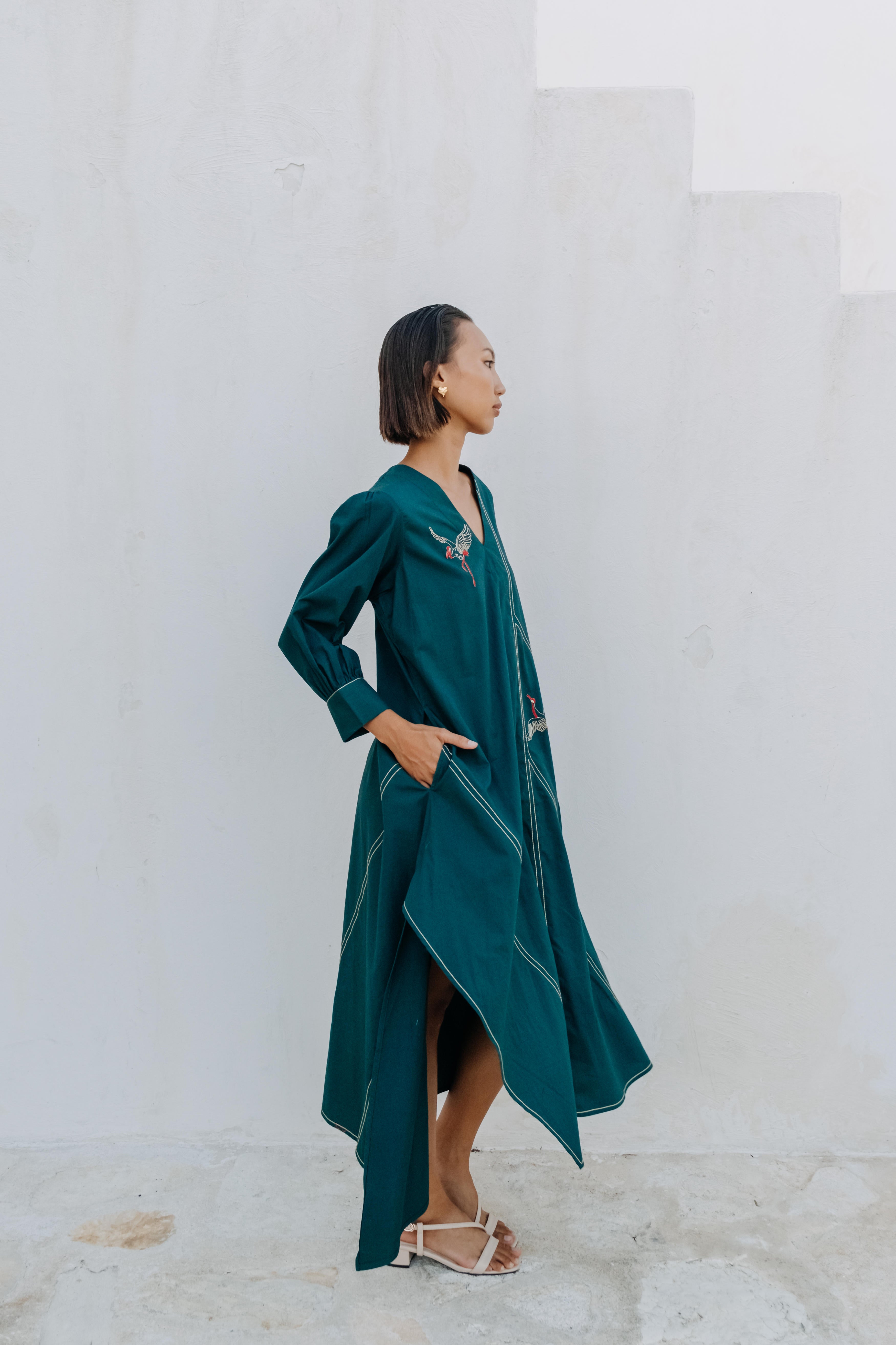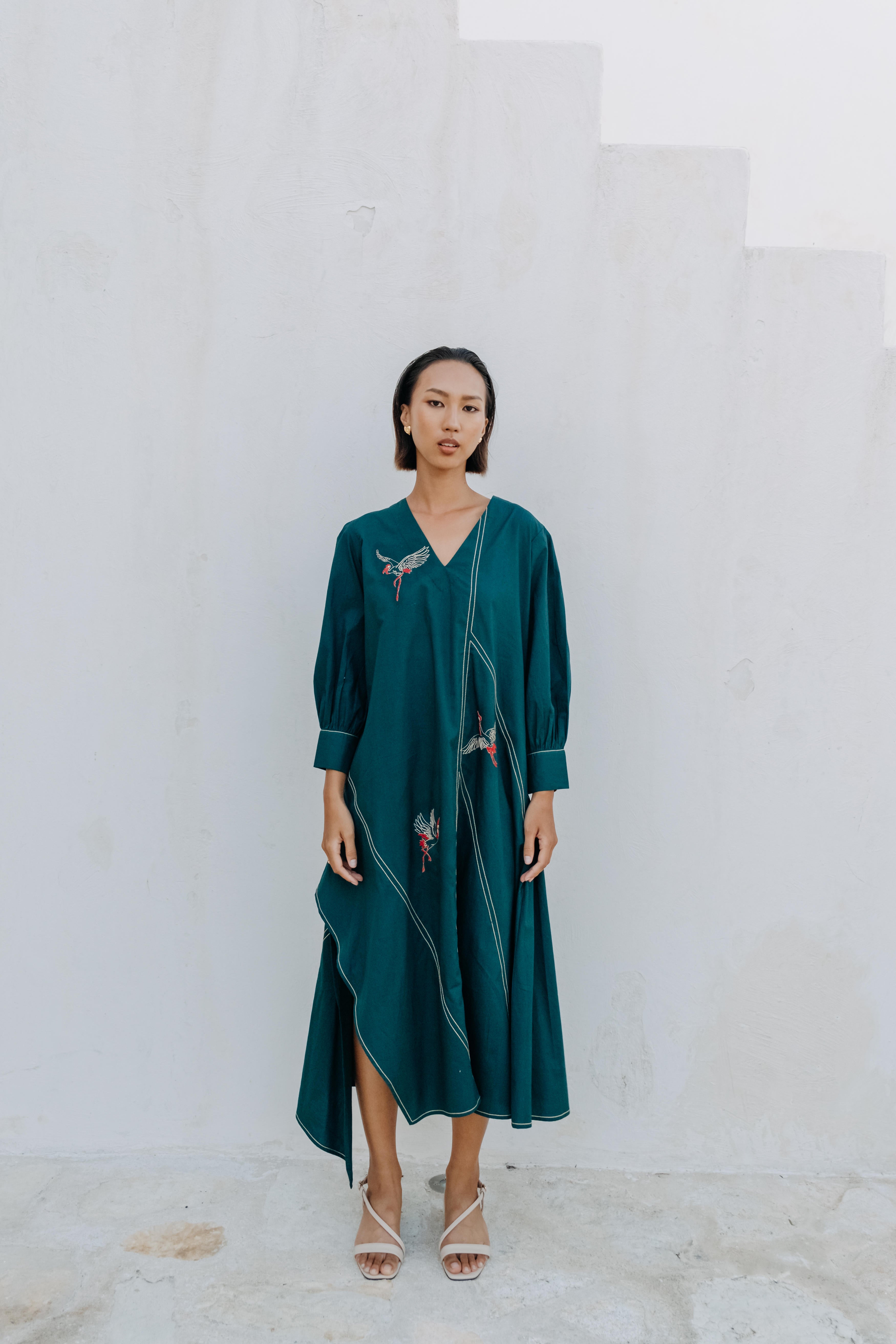 Asymmetric Dress with side inseam pockets and gathered sleeves gives comfortable yet an elegant look. The dress has hand-embroidered bird motifs and stitching detailing all over the seam line of the dress. Embrace effortless elegance with this flowing handcrafted dress. This product will be exclusively handcrafted for you, making the pattern/texture/color slightly vary from the image shown, due to multiple artisan led techniques and processes involved. Color may also slightly vary due to photographic lighting sources. Length - 48"