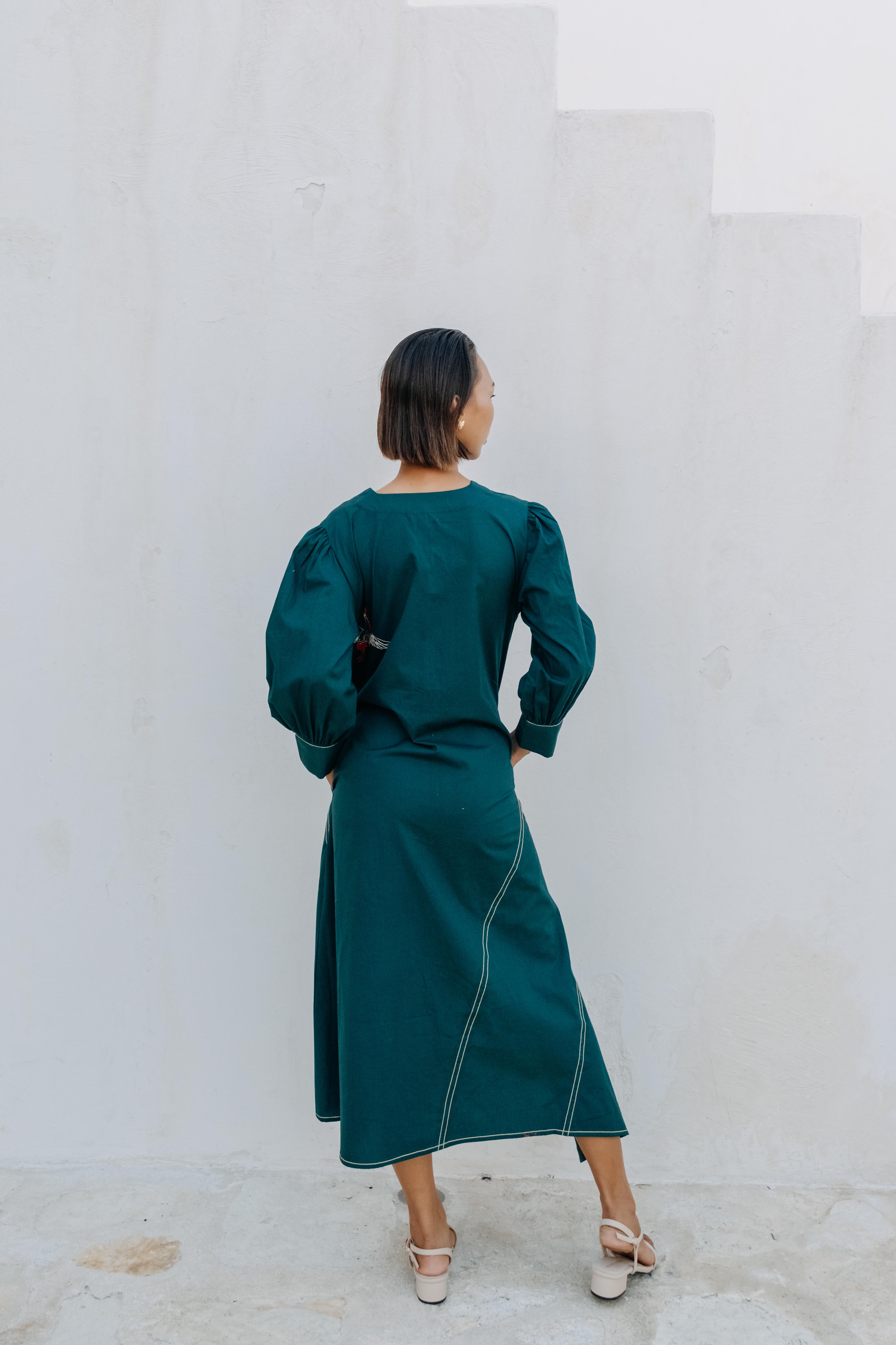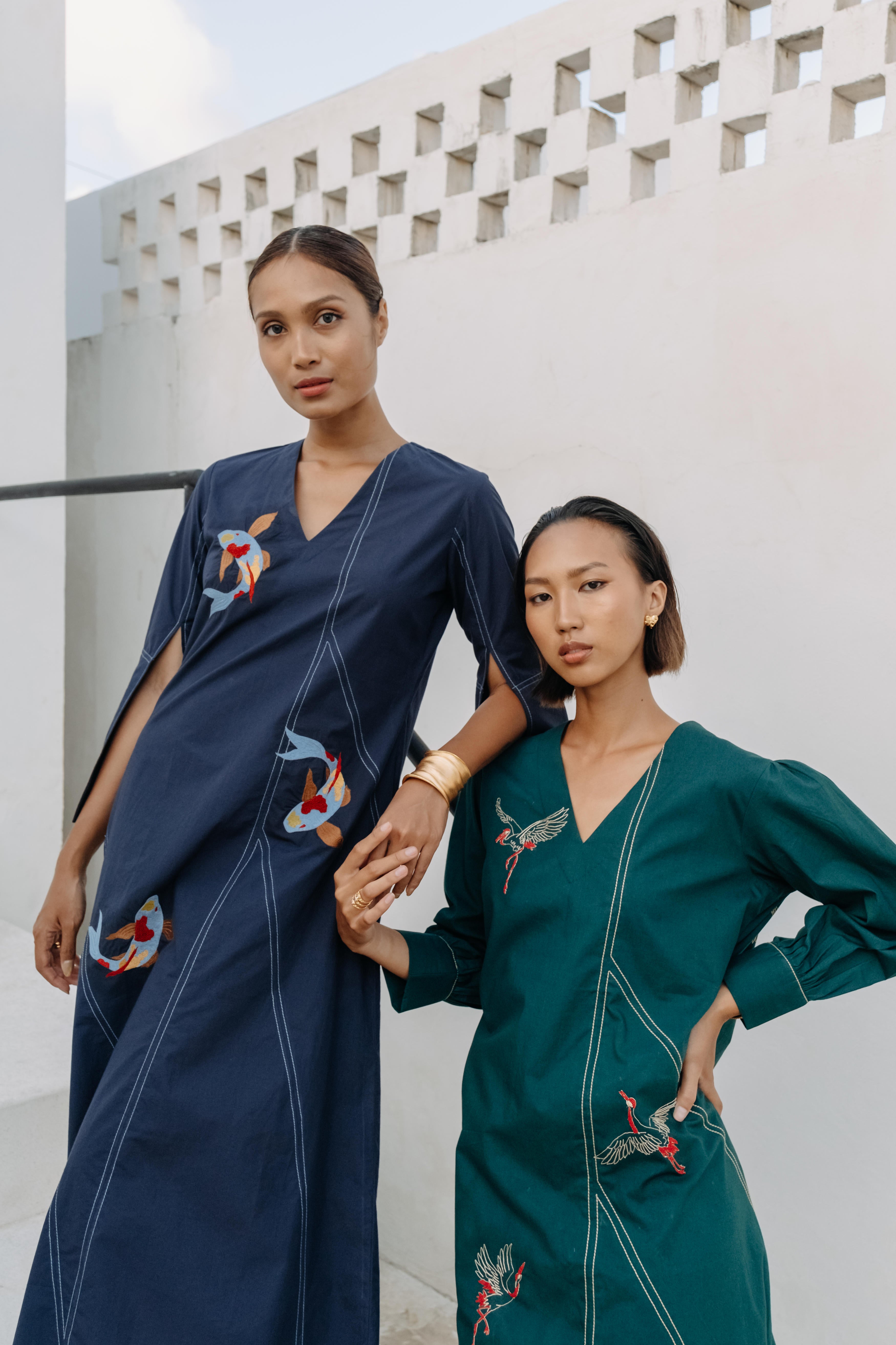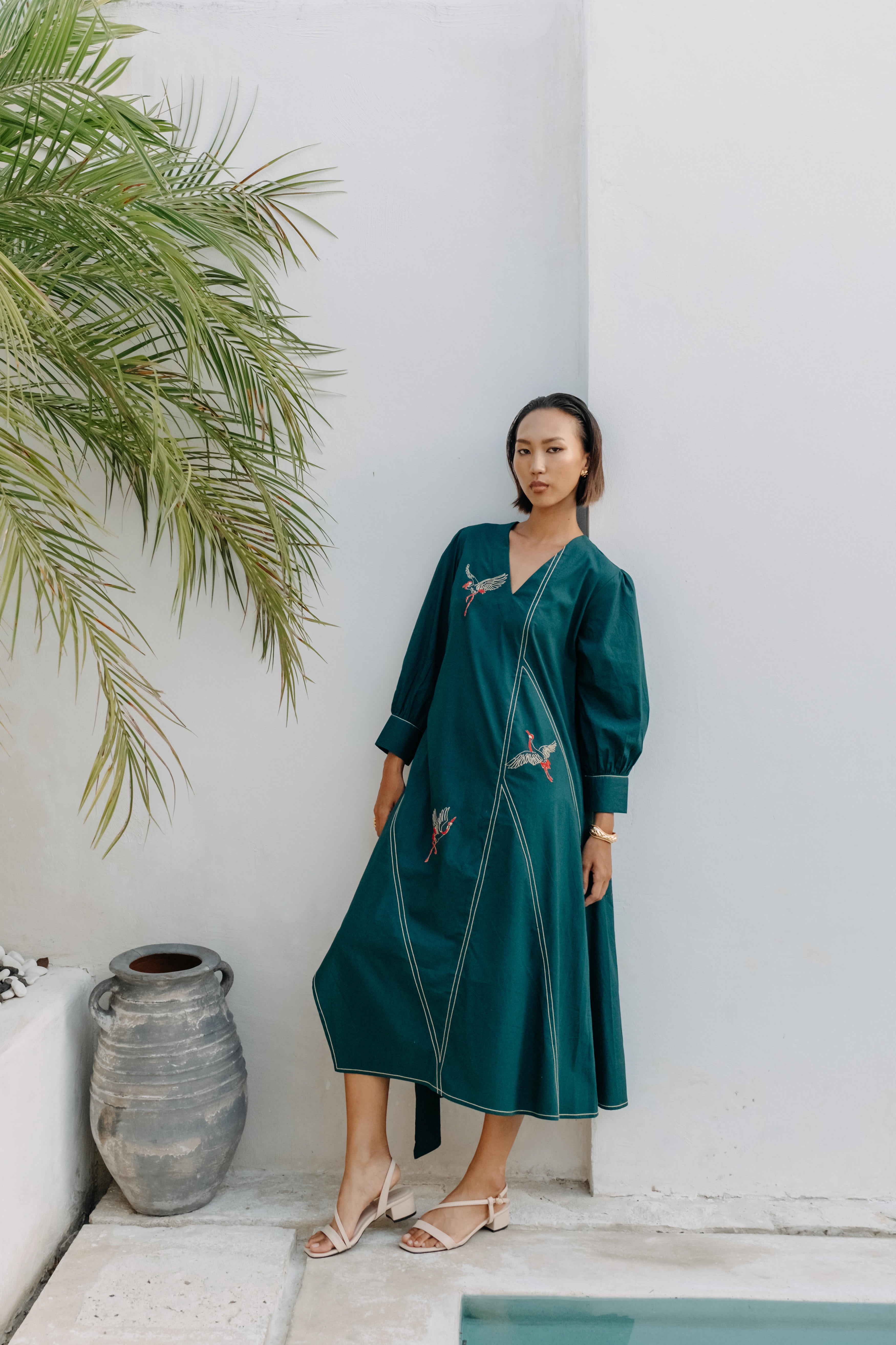 Asymmetric Dress with side inseam pockets and gathered sleeves gives comfortable yet an elegant look. The dress has hand-embroidered bird motifs and stitching detailing all over the seam line of the dress. Embrace effortless elegance with this flowing handcrafted dress. This product will be exclusively handcrafted for you, making the pattern/texture/color slightly vary from the image shown, due to multiple artisan led techniques and processes involved. Color may also slightly vary due to photographic lighting sources. Length - 48"