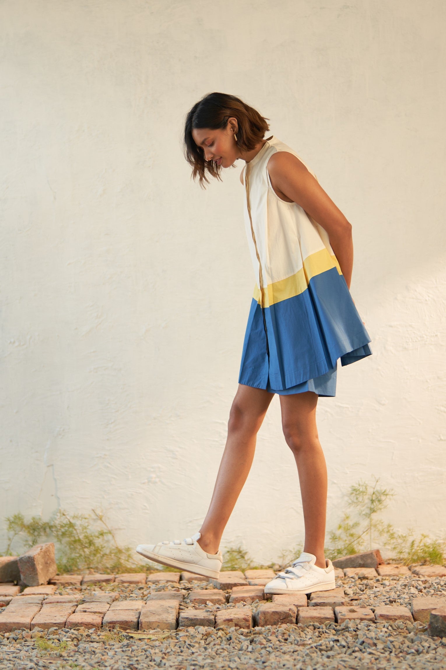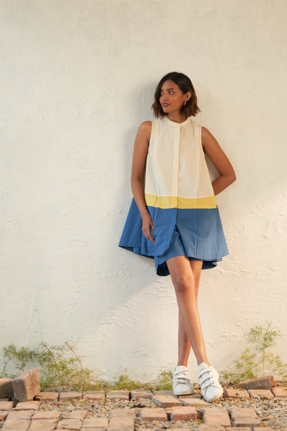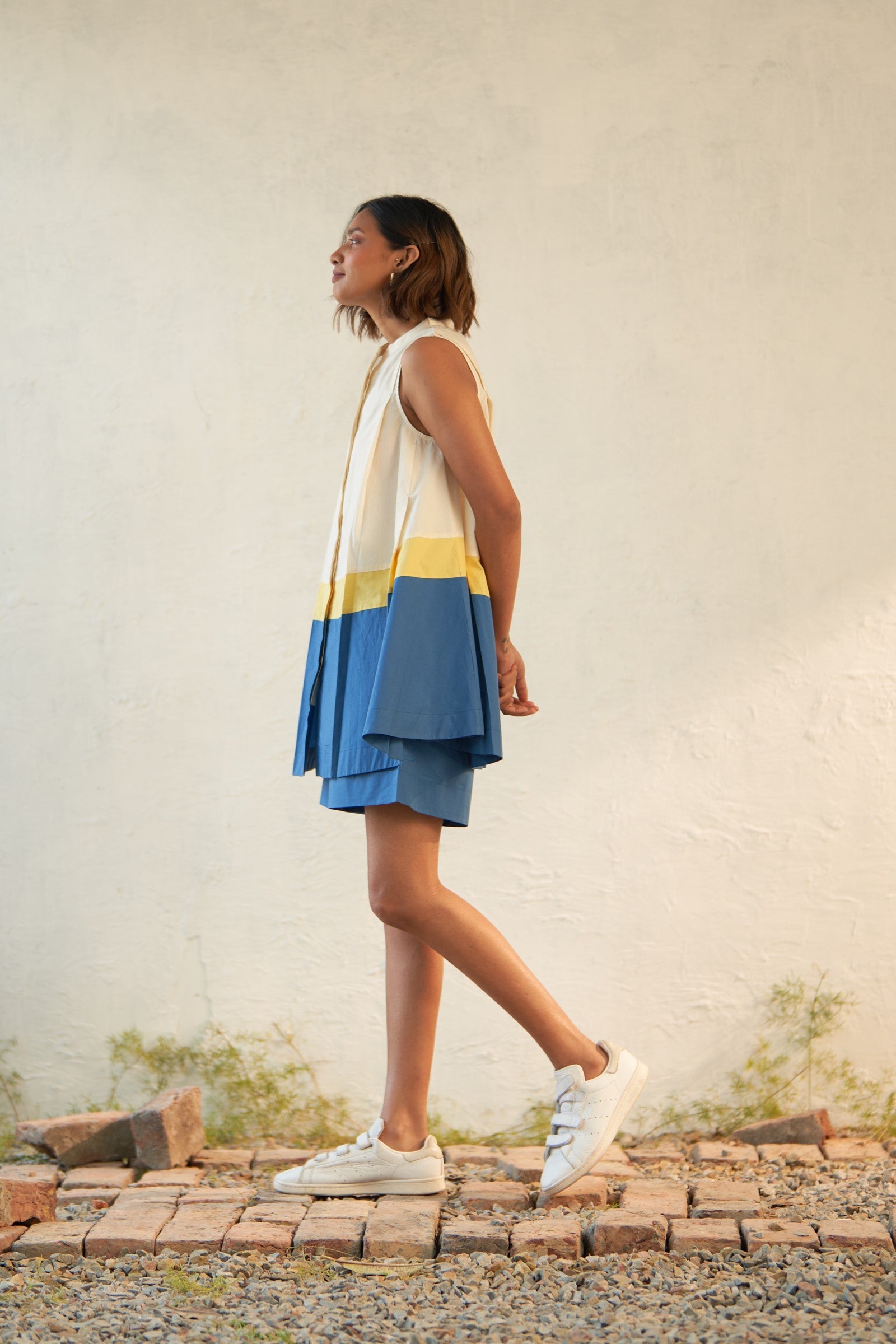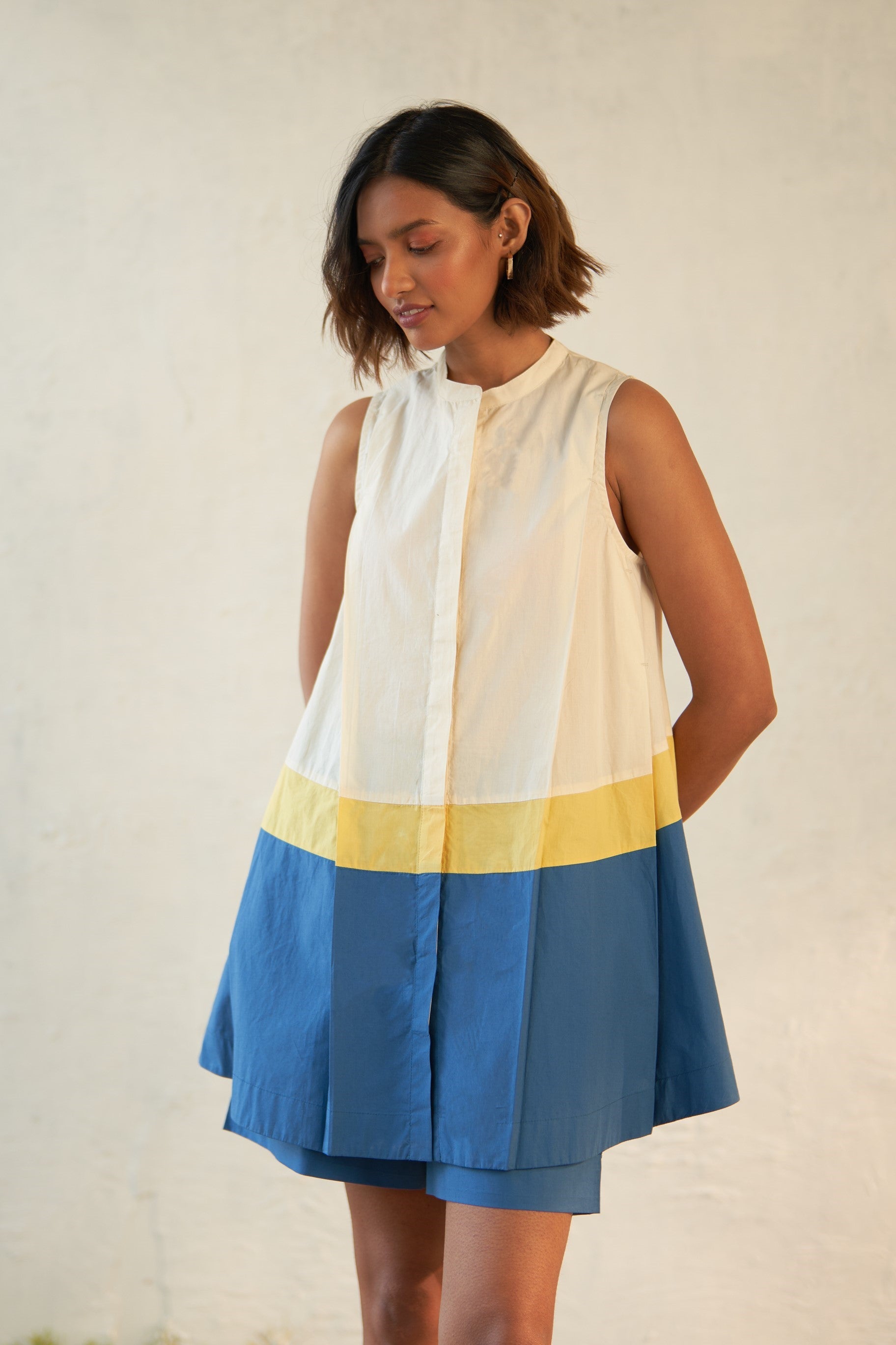 This versatile co-ord ensemble is ready to be embraced, offering a contemporary silhouette that can also be worn as a dress when styled individually. Crafted from crisp cotton fabric, it showcases a flared silhouette with a center placket forming a natural V neckline. Pleated highlights add texture and visual interest to the look. Paired with half elastic waistband shorts featuring flap pockets, this ensemble ensures both style and practicality for any occasion.