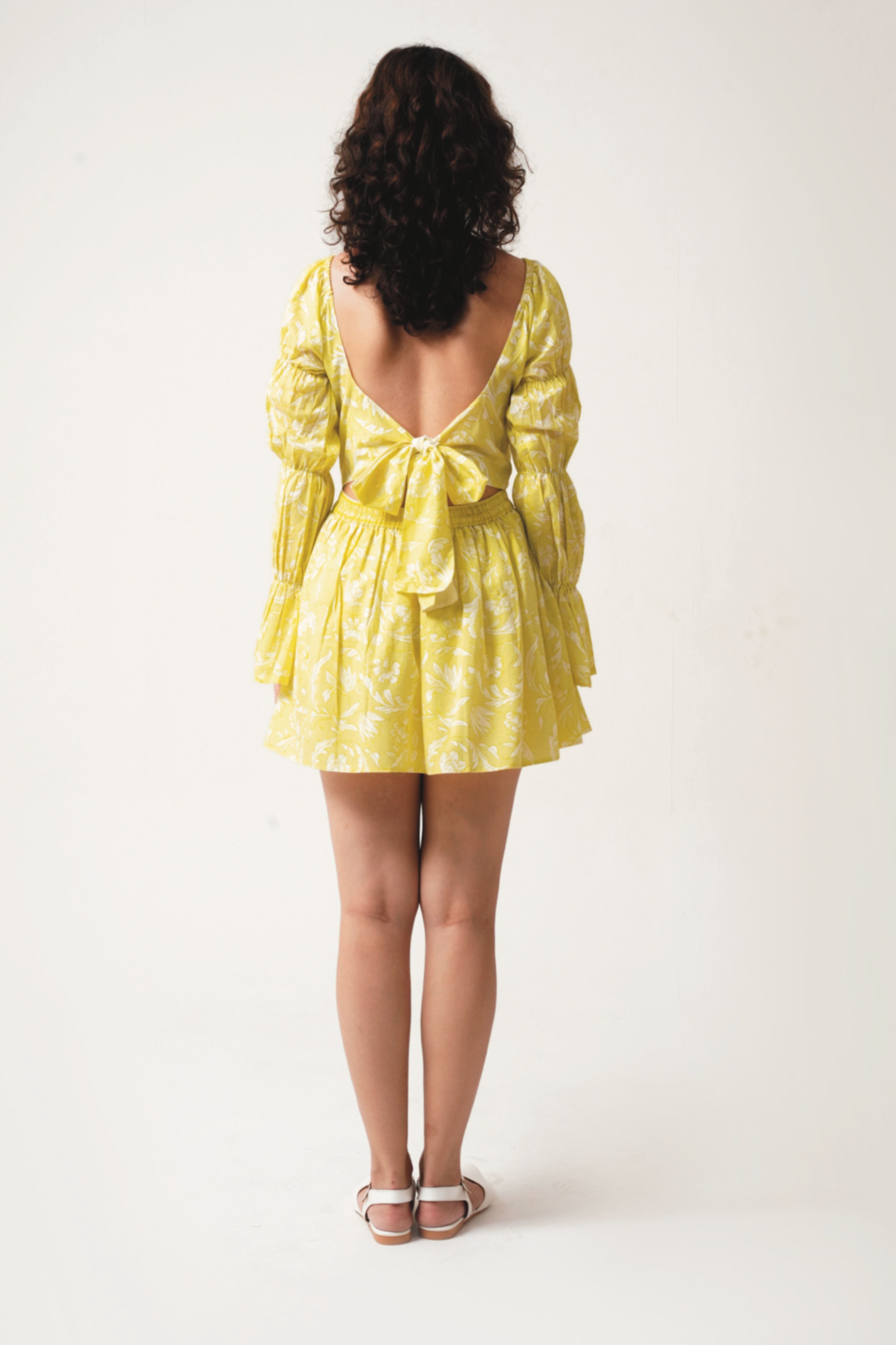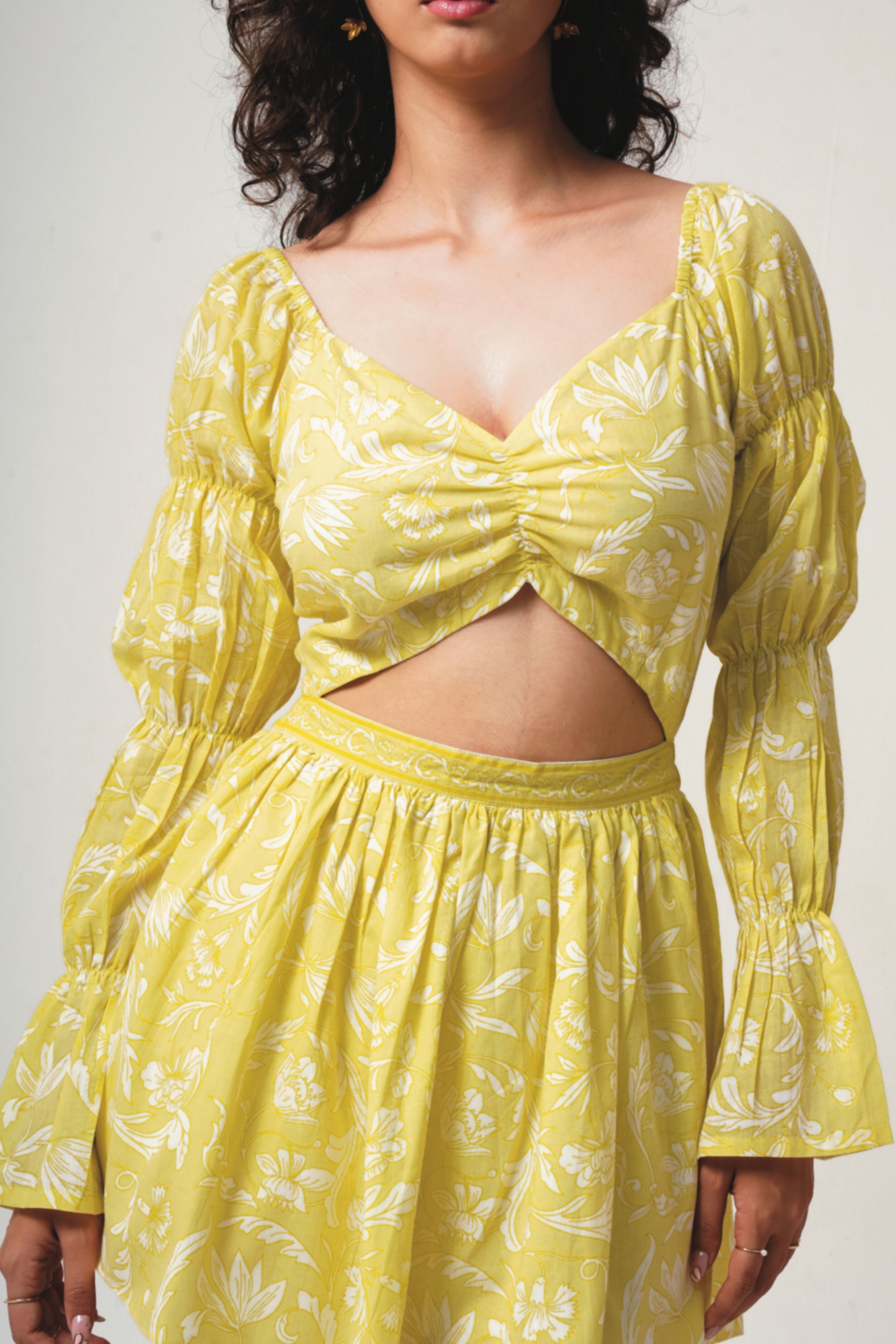 With its refined silhouette and delicate details, this dress radiates charm and sophistication featuring gathered bodice, soft puffed sleeves, and flowing skirt. The flowing skirt adds movement and charm, while the vibrant yellow hue, adorned with a subtle floral pattern, enhances its fresh and lively appeal. Crafted from breathable, lightweight fabric, lined with cotton mul ensuring a soft, comfortable feel against the skin. Model is 5'8 and is wearing a size XS.