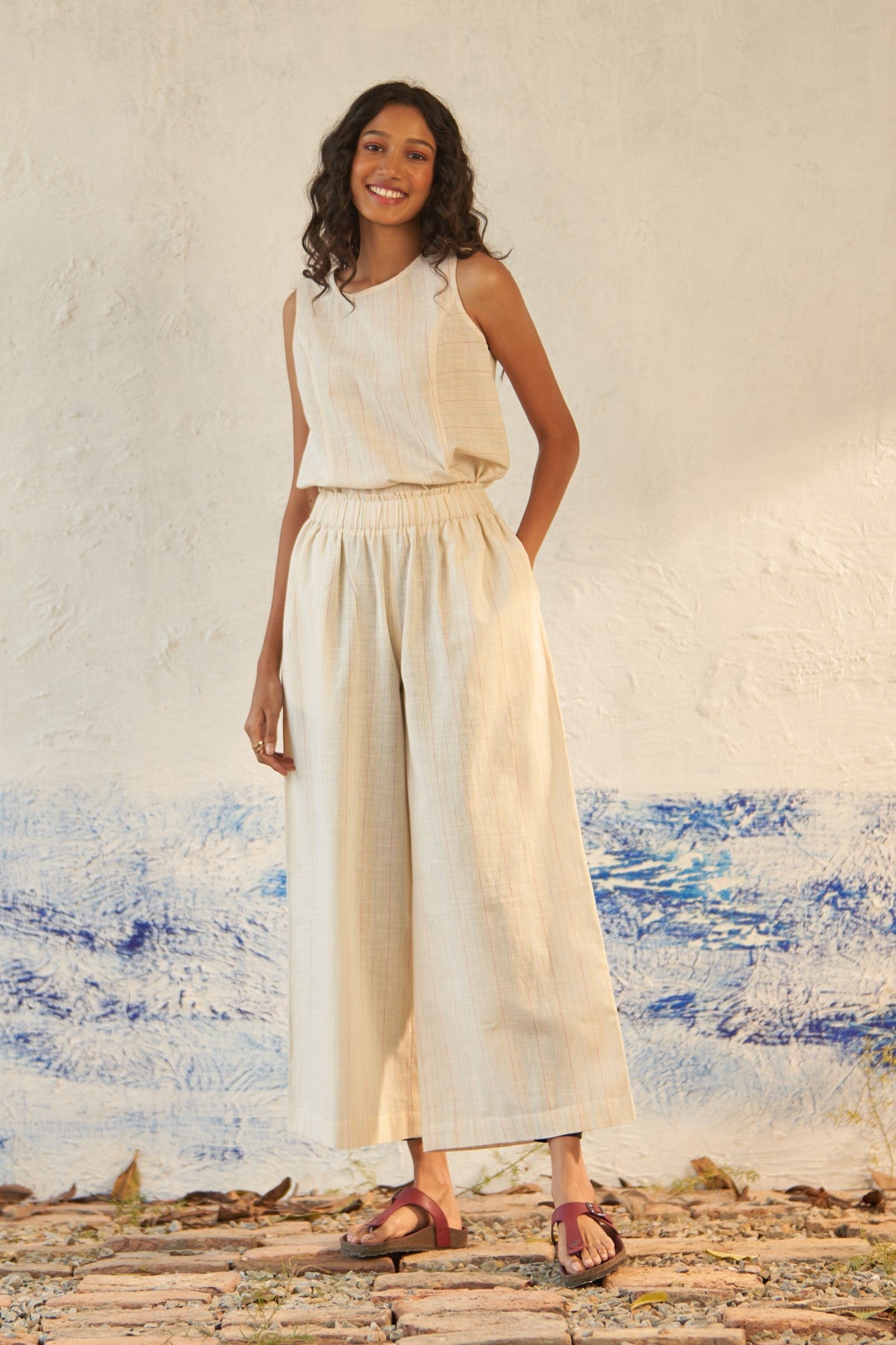 Experience comfort, ease, and spontaneity with our textured cotton flared pants adorned with hints of multi-color stripes. These wide-legged wonders boast a simple gathered elasticated waist and practical side pockets, ensuring you're perfectly comfortable for any outing, ready to step outside at a moment's notice.