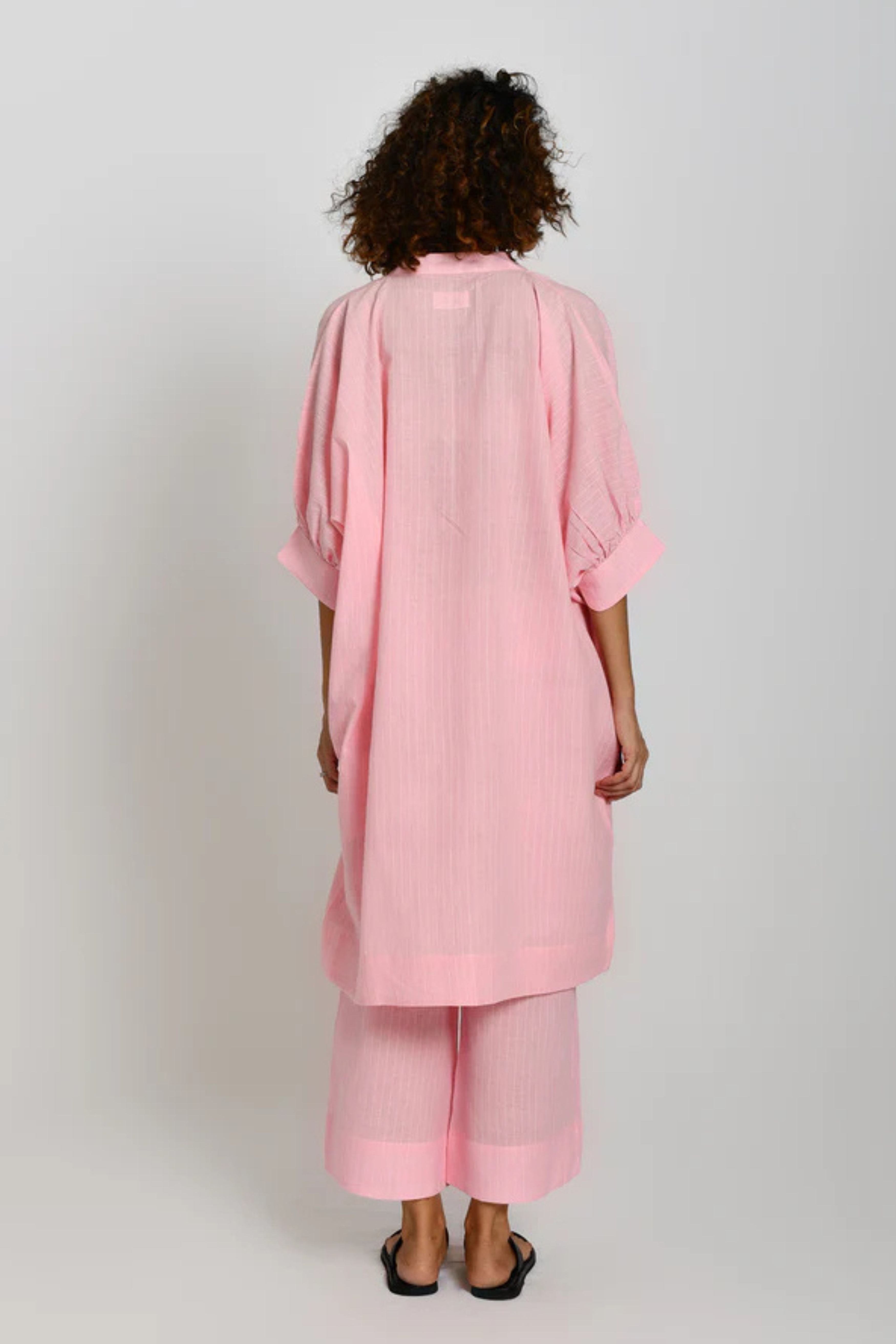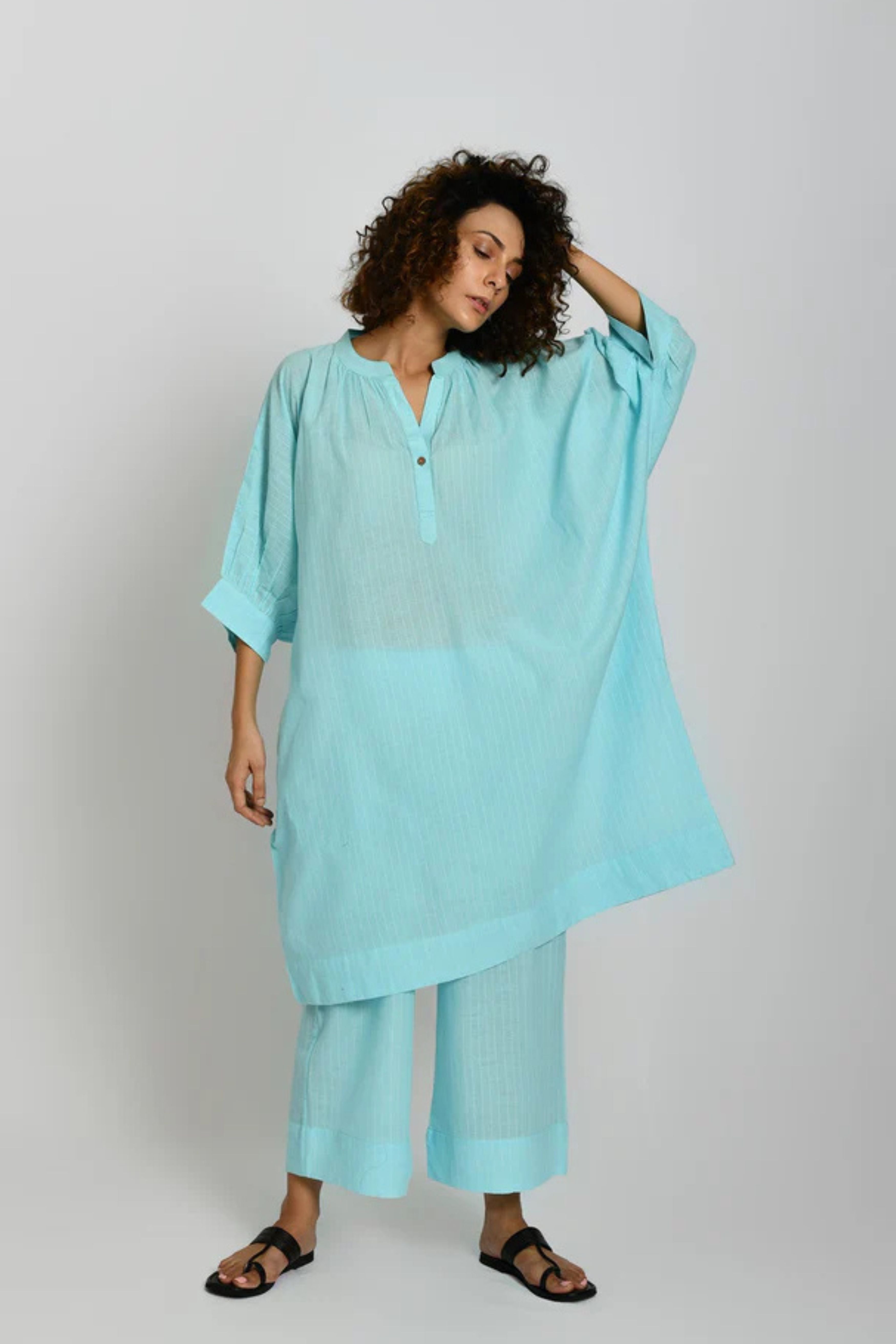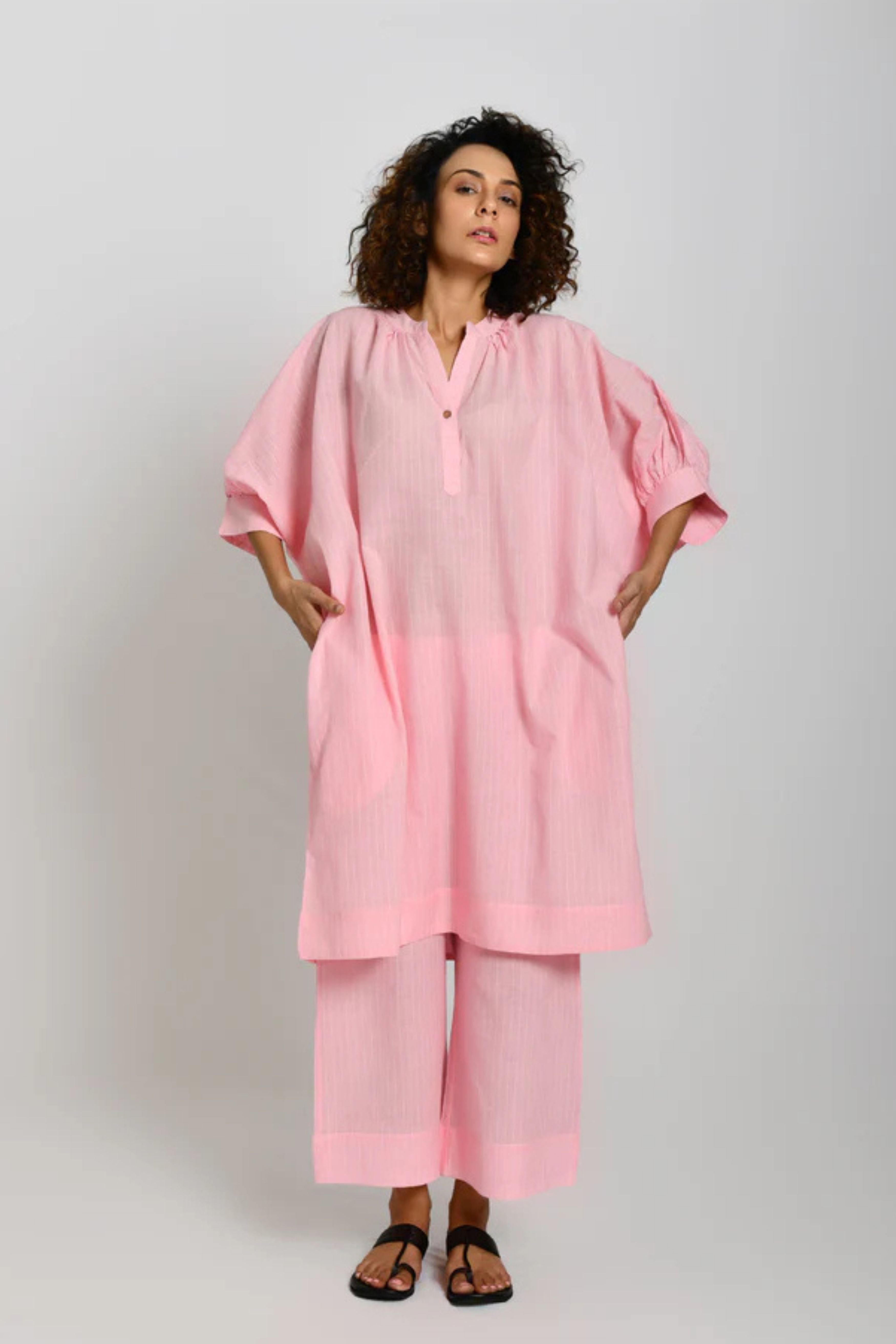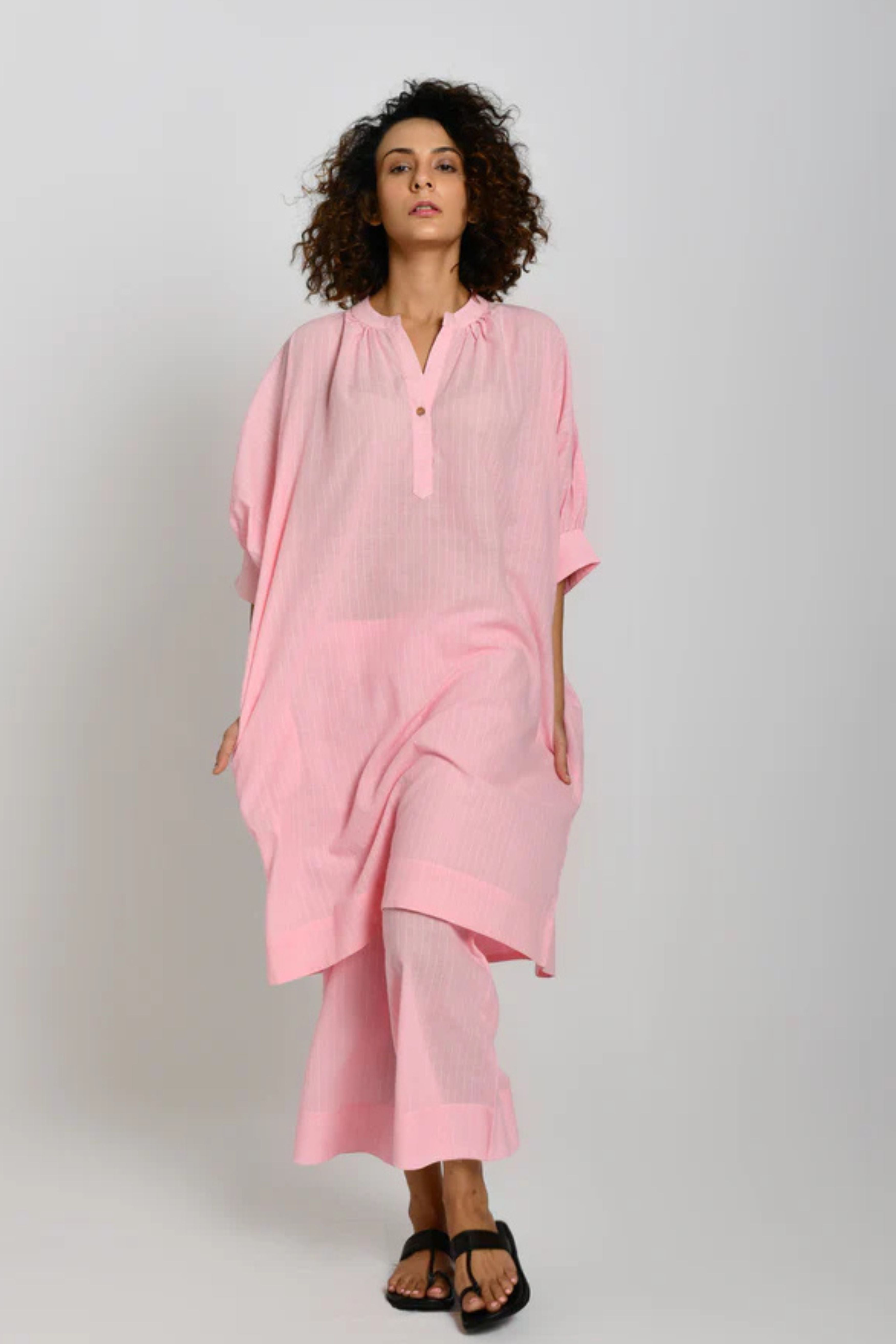 This kaftan in tunic style features a striped design crafted from hand-spun cotton fabric in 3 charming colours. The detailing includes gathers on the neck and cuffs, which create subtle pleats and add dimension to the design.