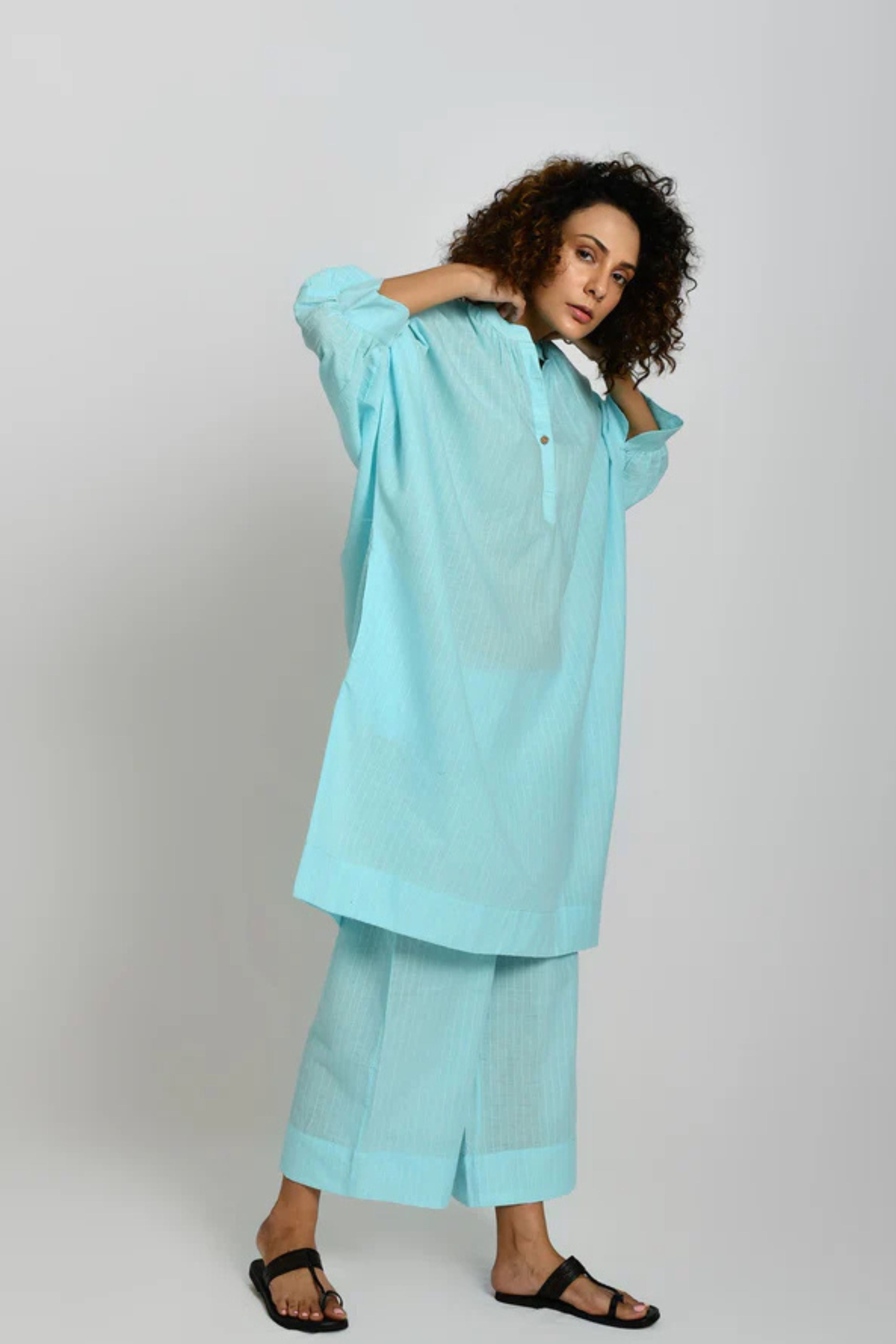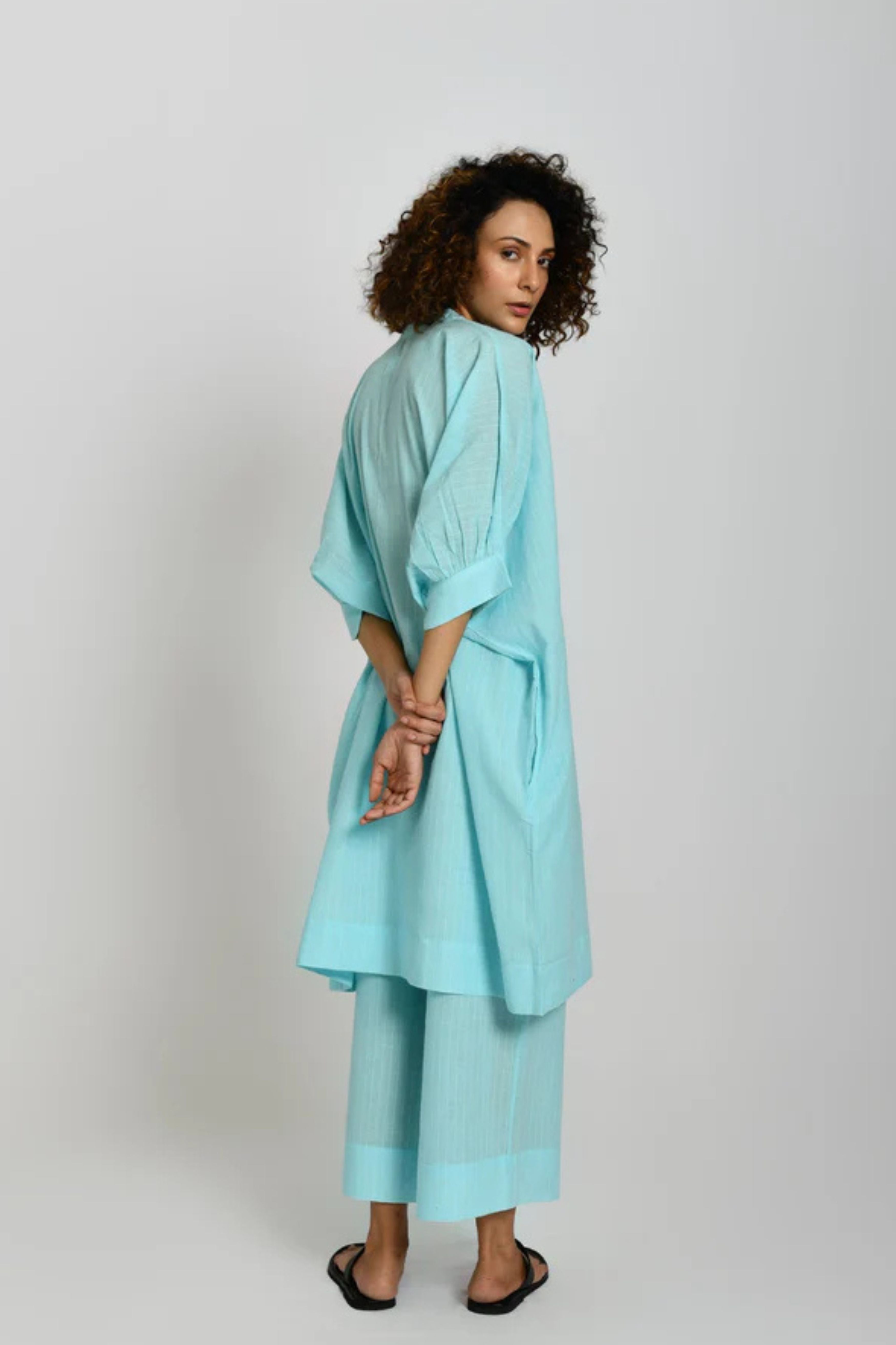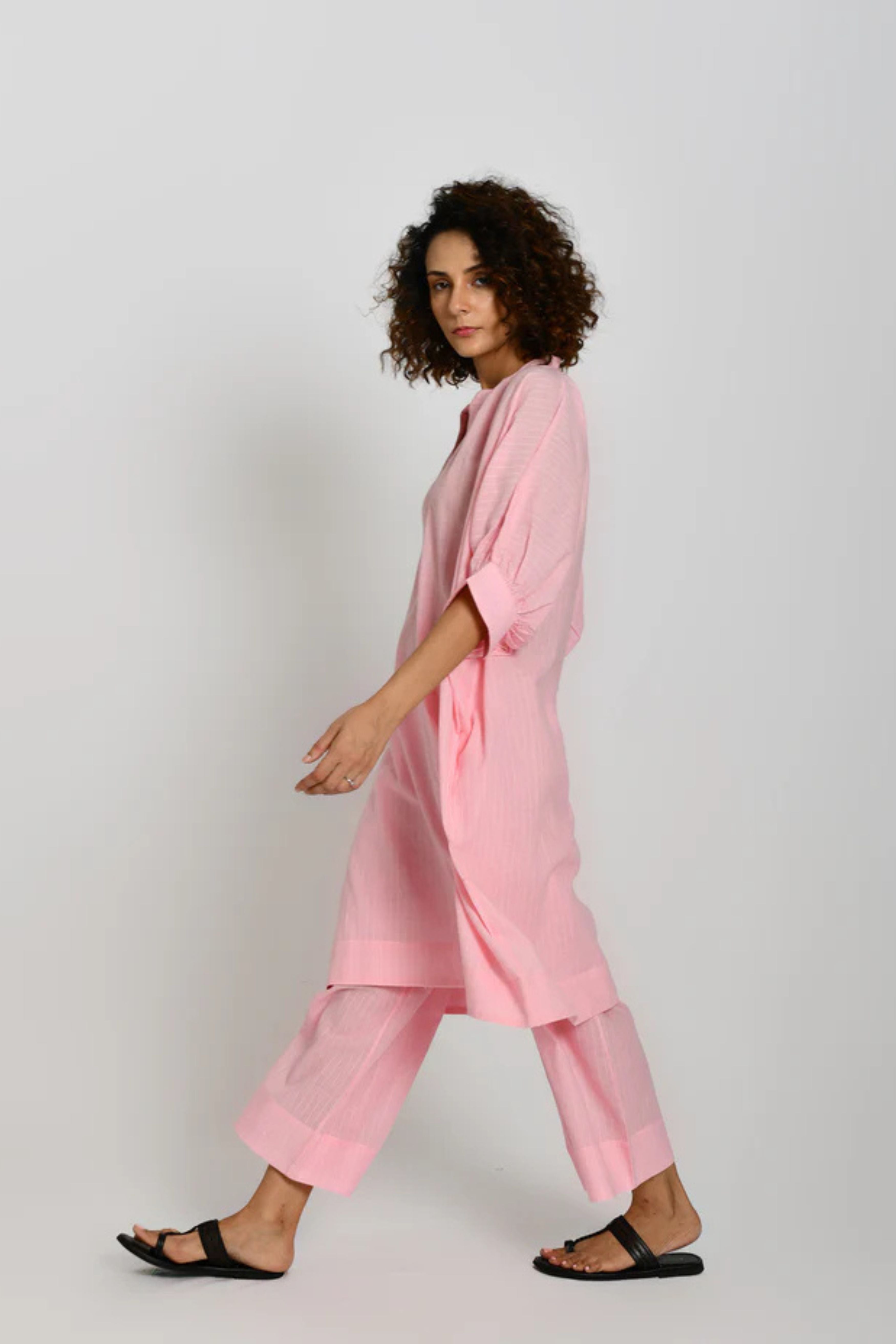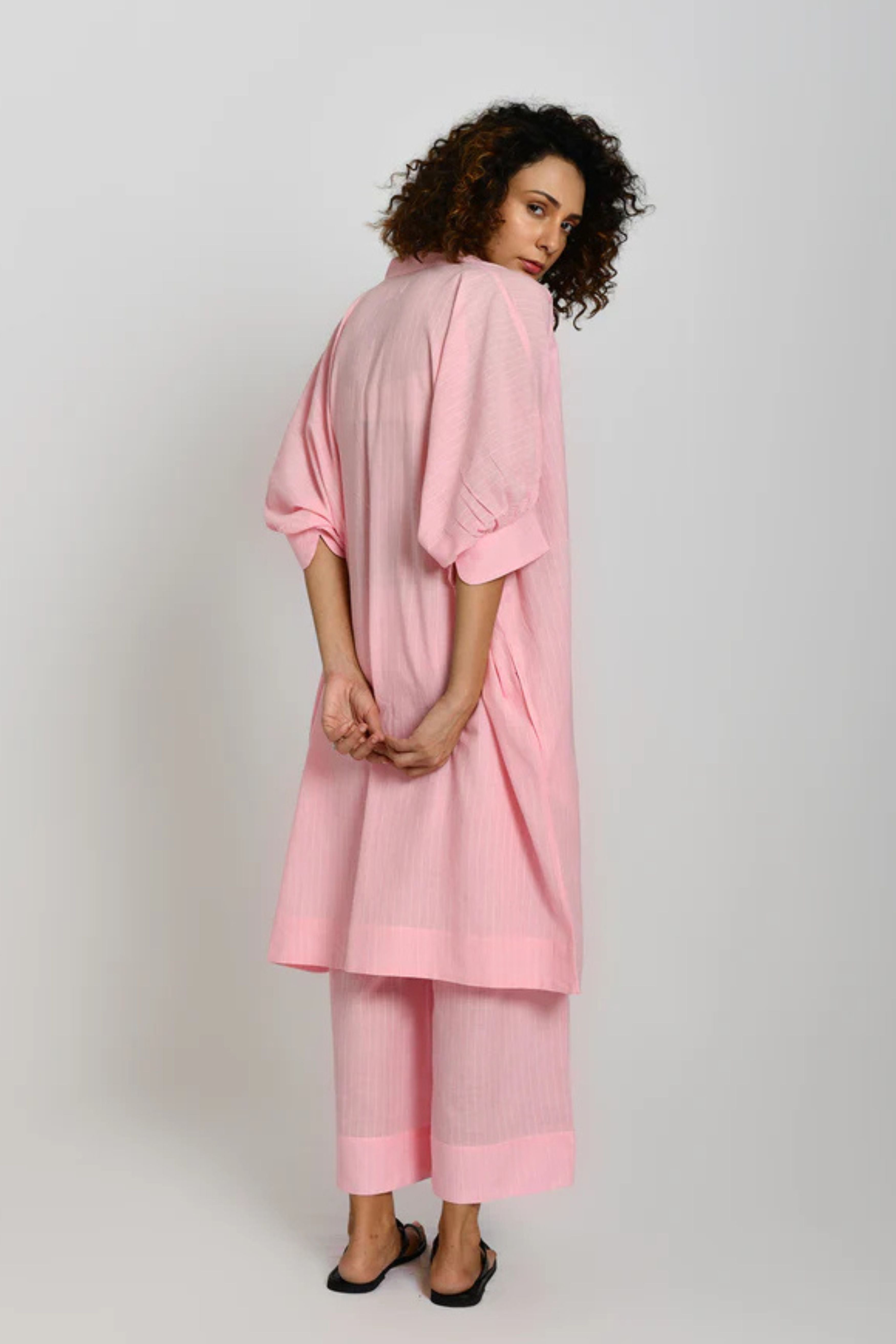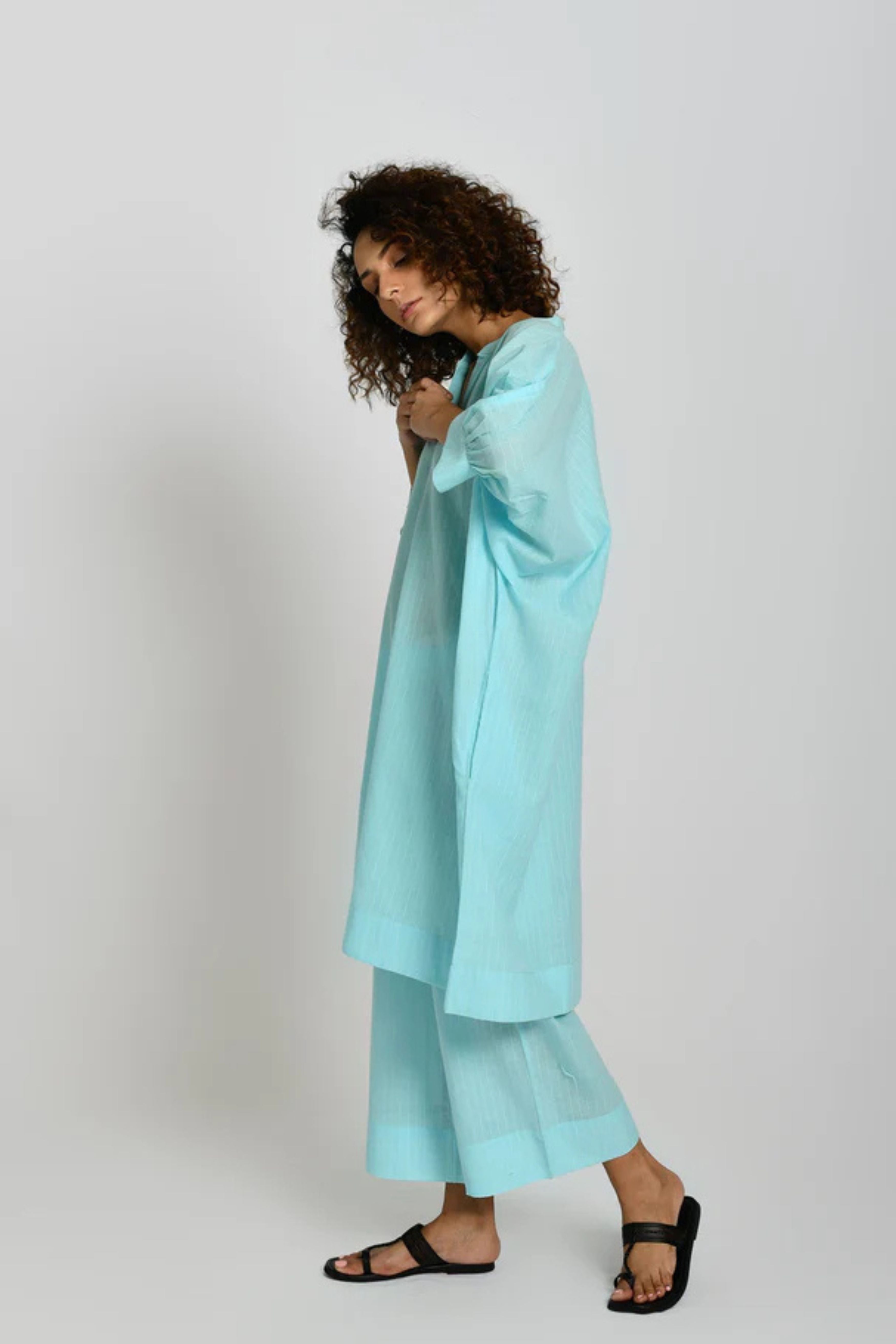 This kaftan in tunic style features a striped design crafted from hand-spun cotton fabric in 3 charming colours. The detailing includes gathers on the neck and cuffs, which create subtle pleats and add dimension to the design.
