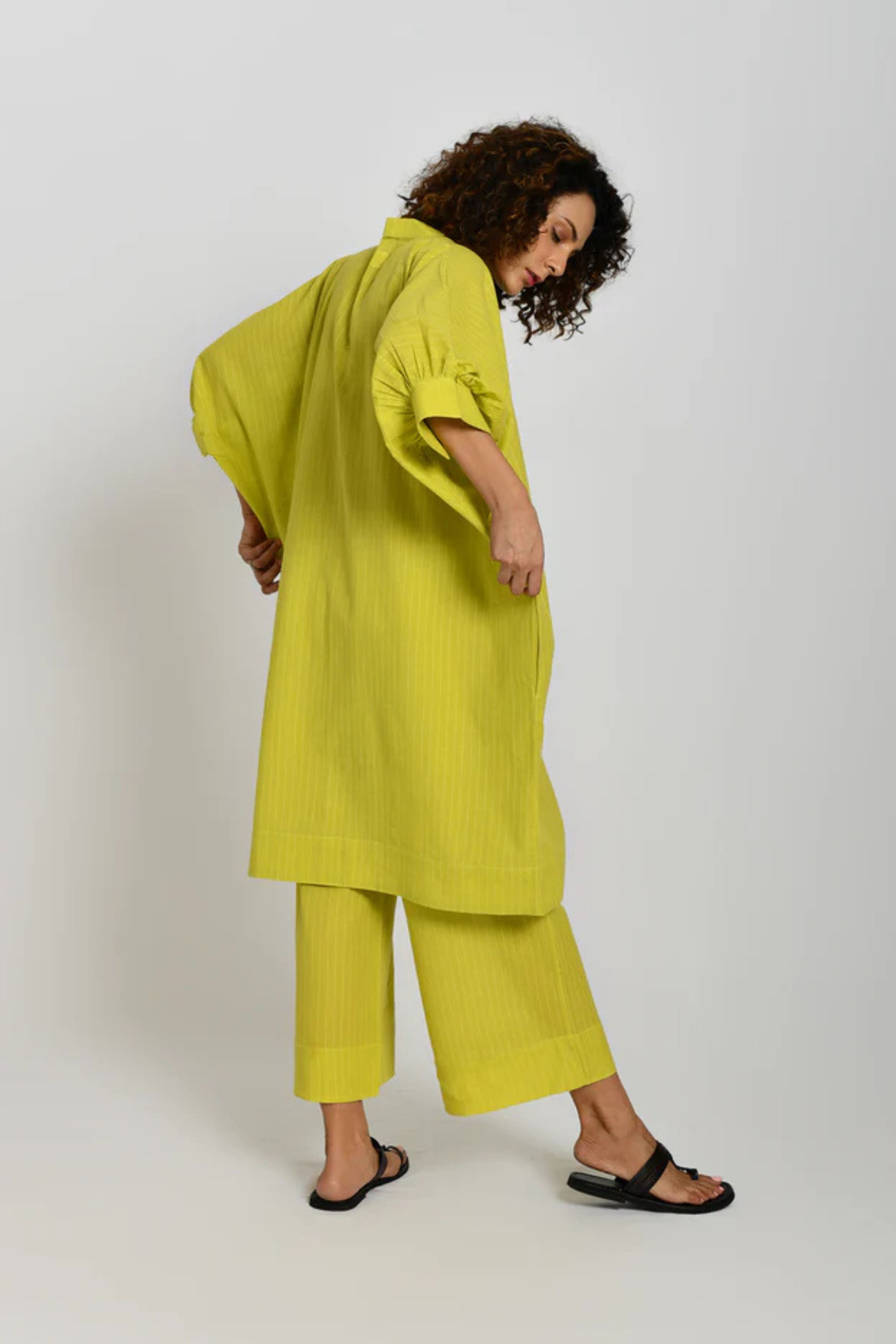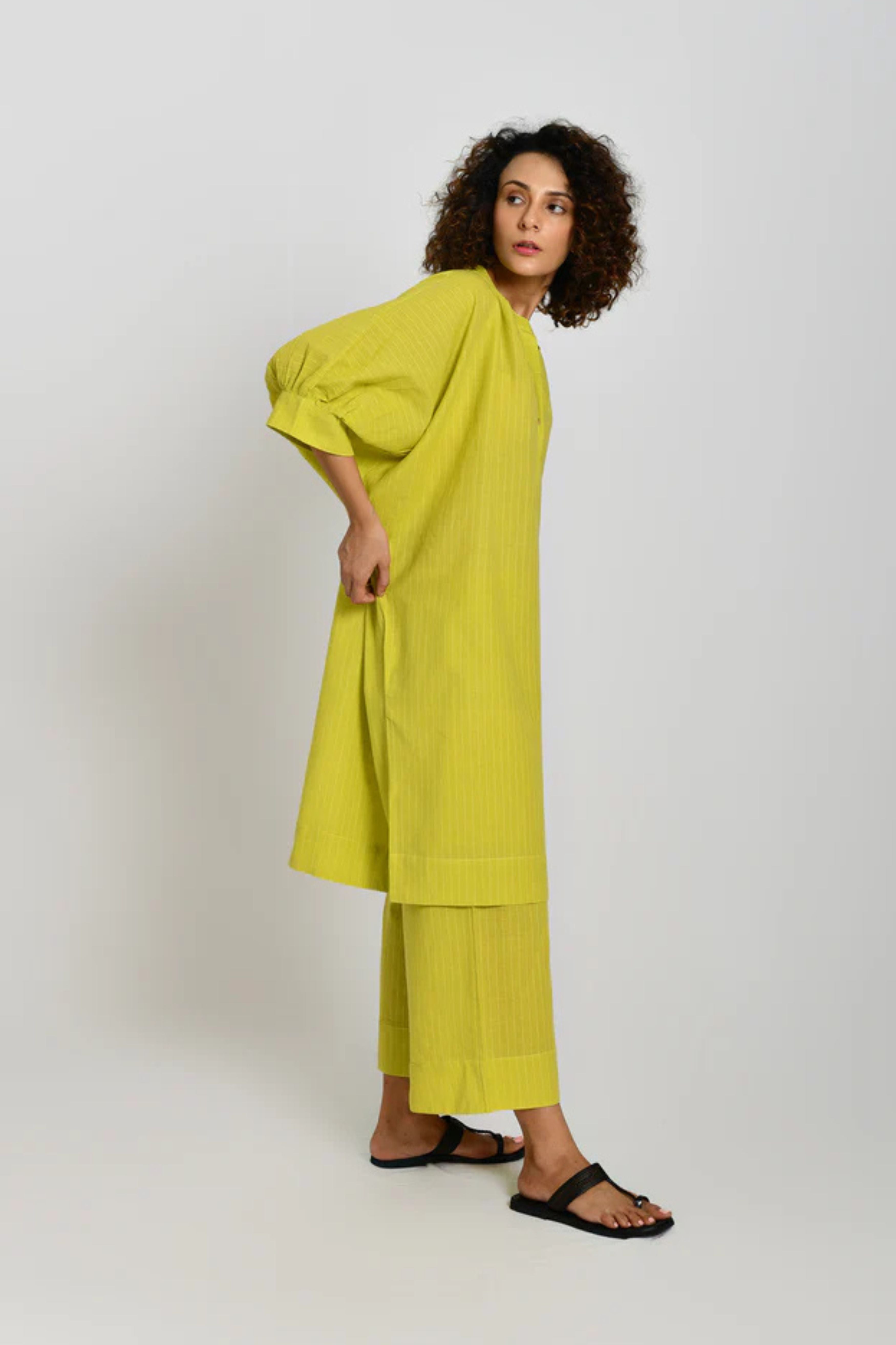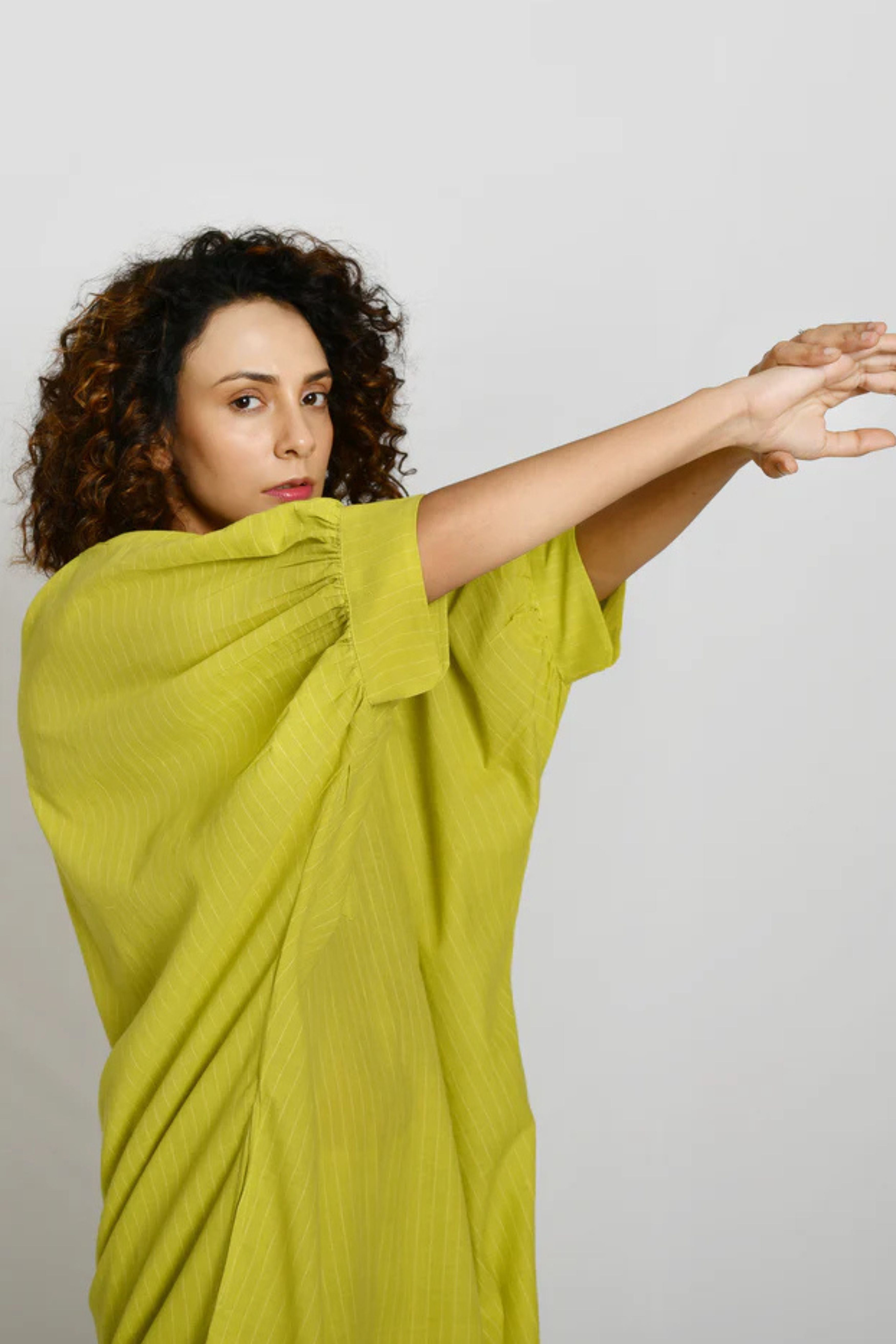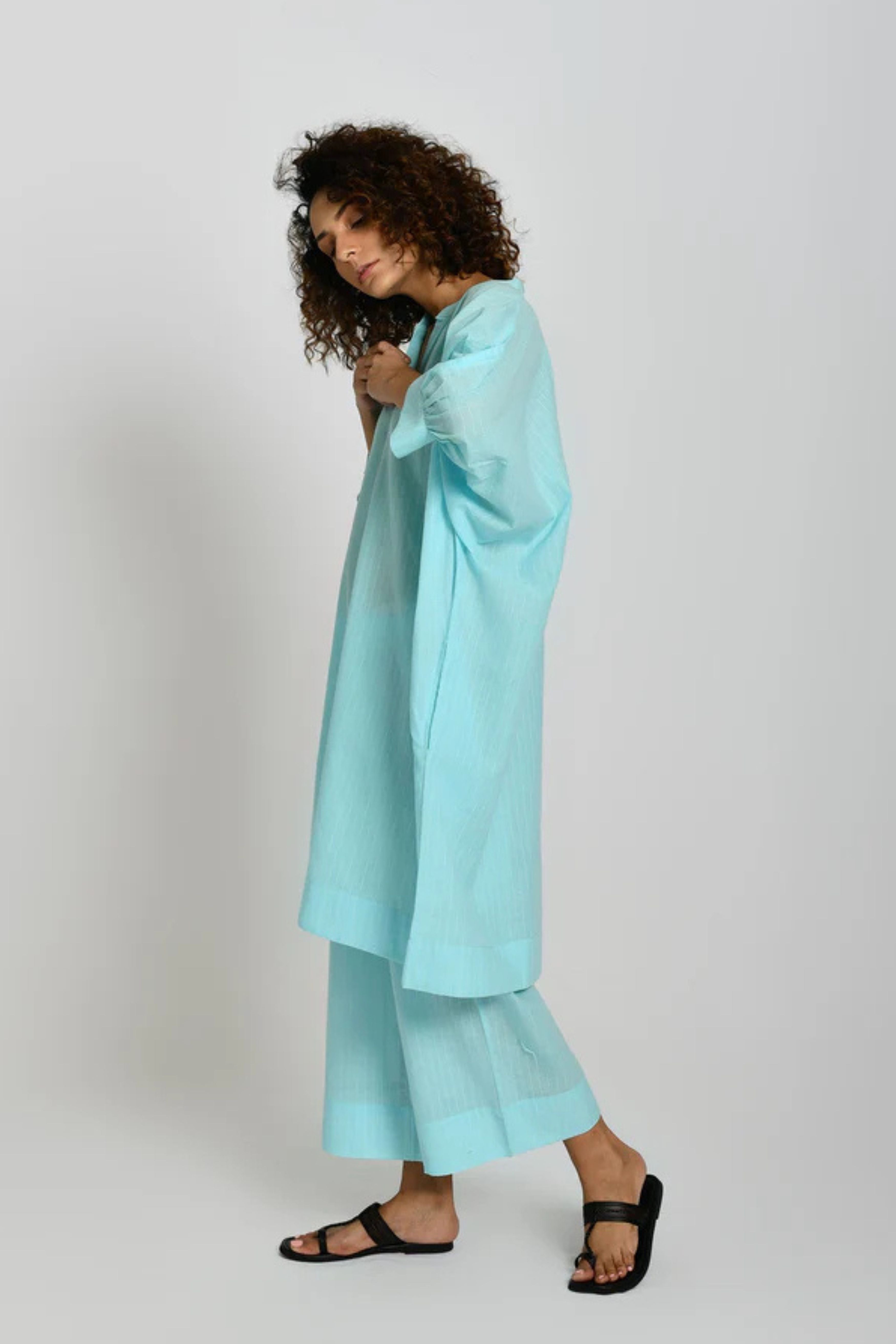 This kaftan in tunic style features a striped design crafted from hand-spun cotton fabric in 3 charming colours. The detailing includes gathers on the neck and cuffs, which create subtle pleats and add dimension to the design.