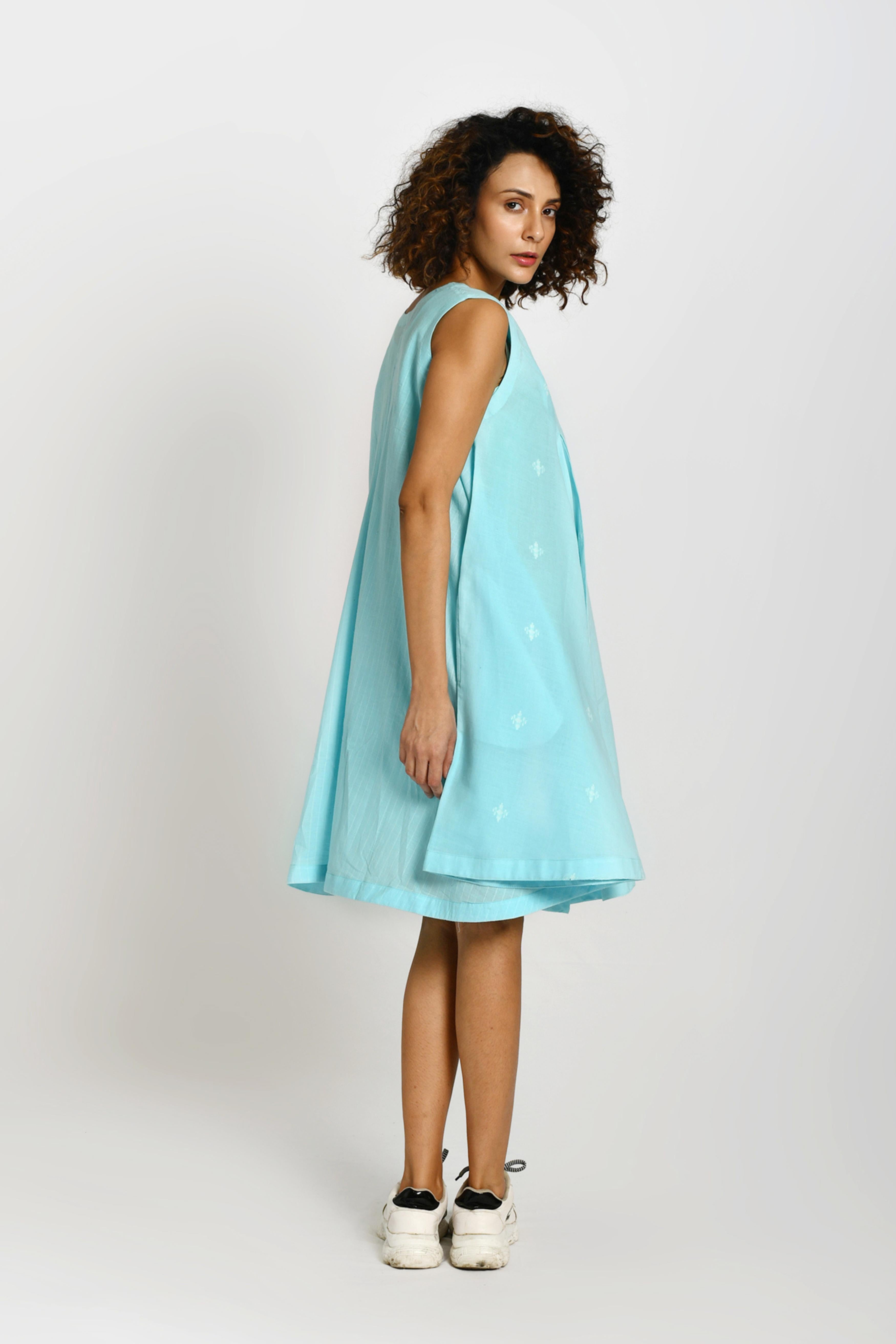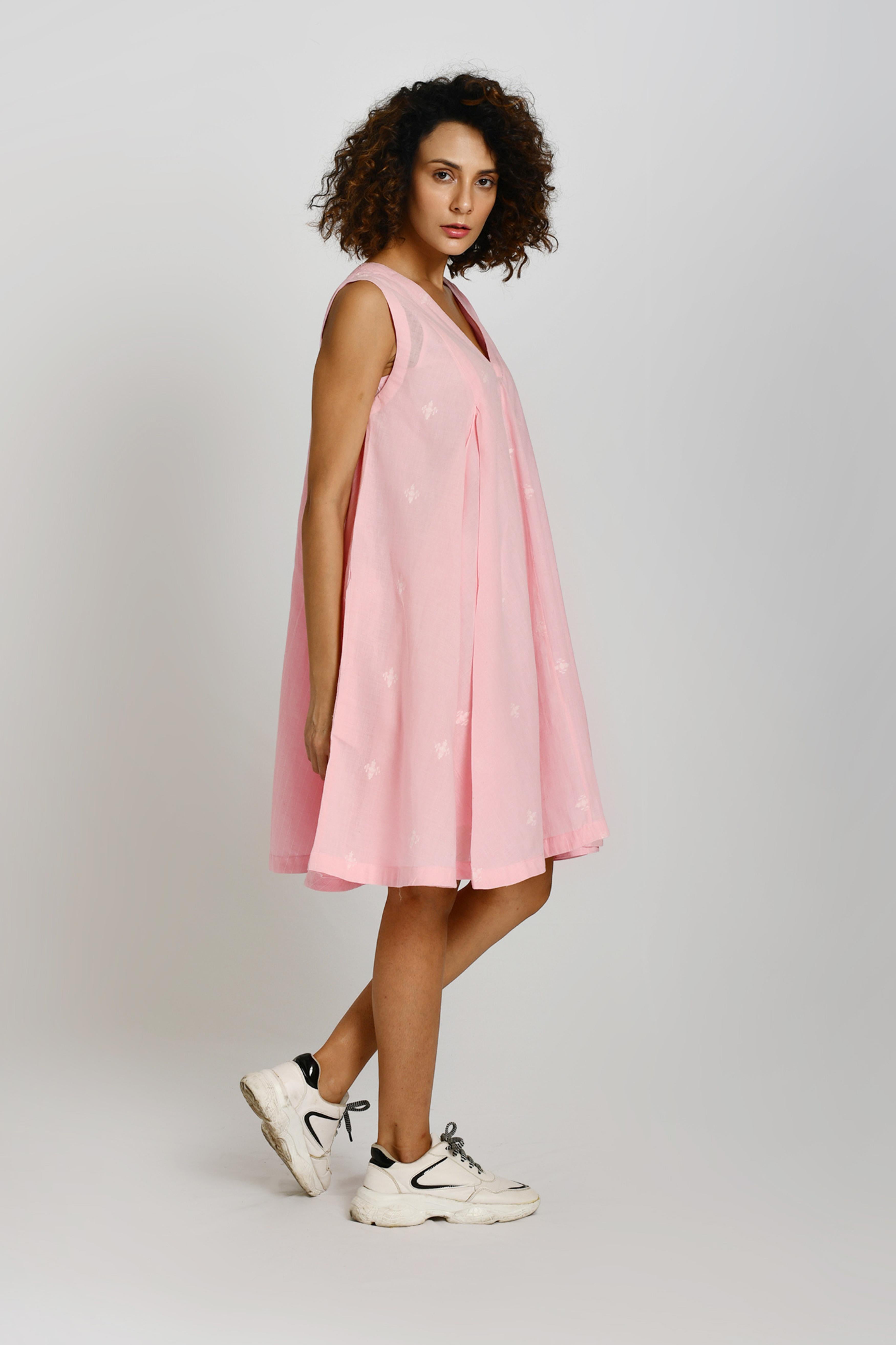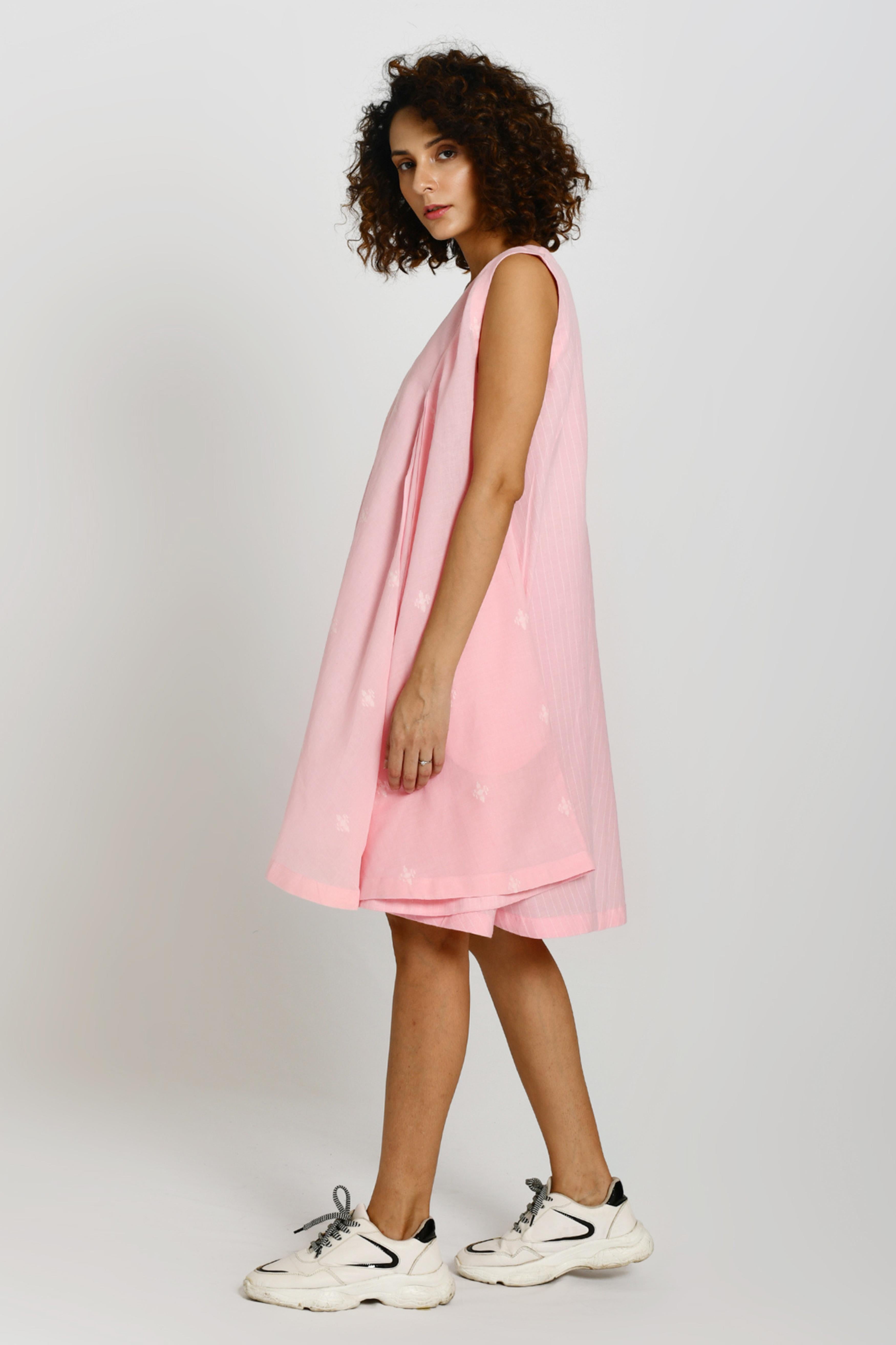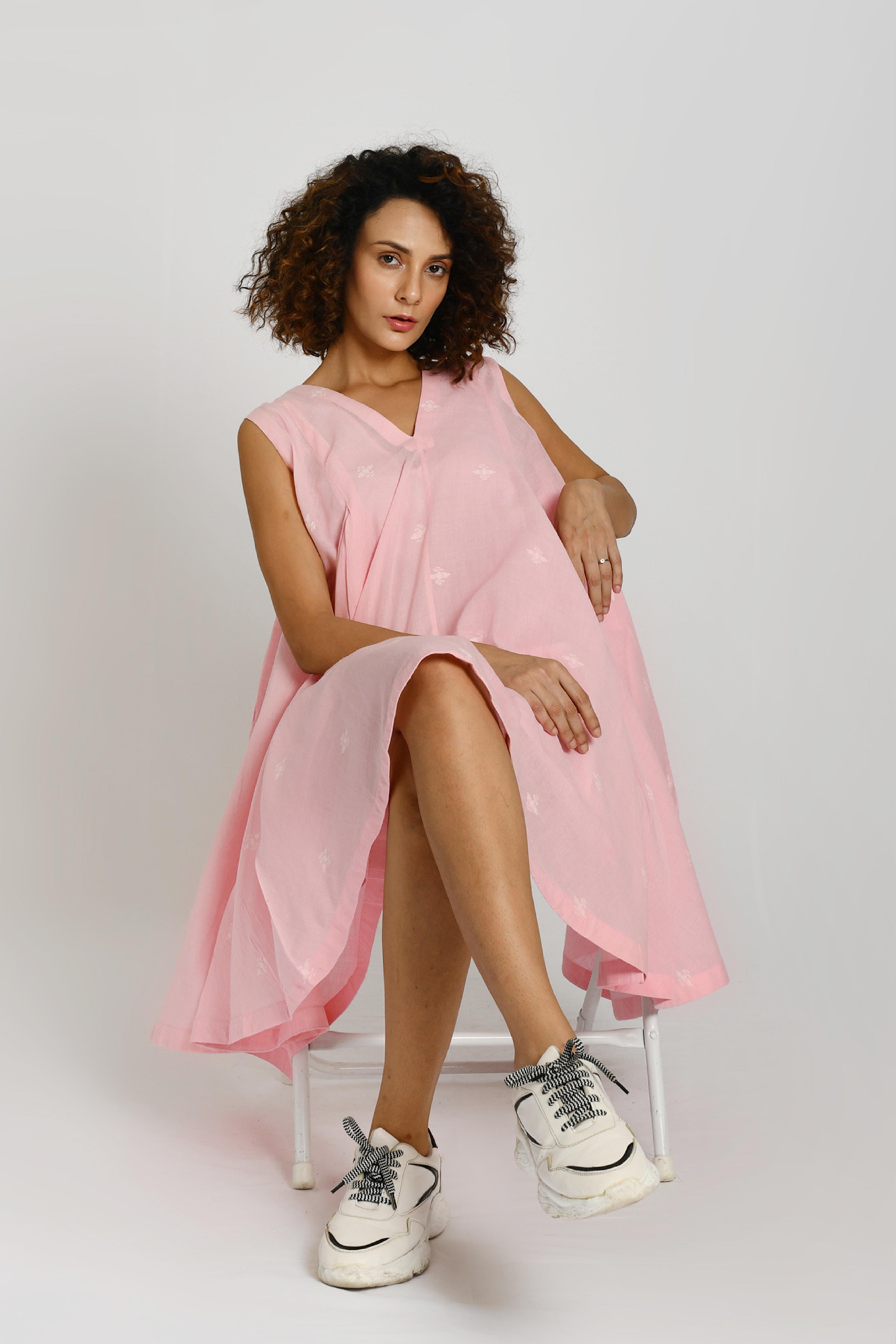We present a stunning knee-length dress in 3 charming hueS, crafted with care and artistry. This exquisite dress features intricate hand-spun and hand-woven cotton fabric, showcasing the timeless beauty of jamdani craftsmanship. With its box pleats enhancing both the front and back, this dress offers a flattering silhouette that effortlessly blends style and comfort.