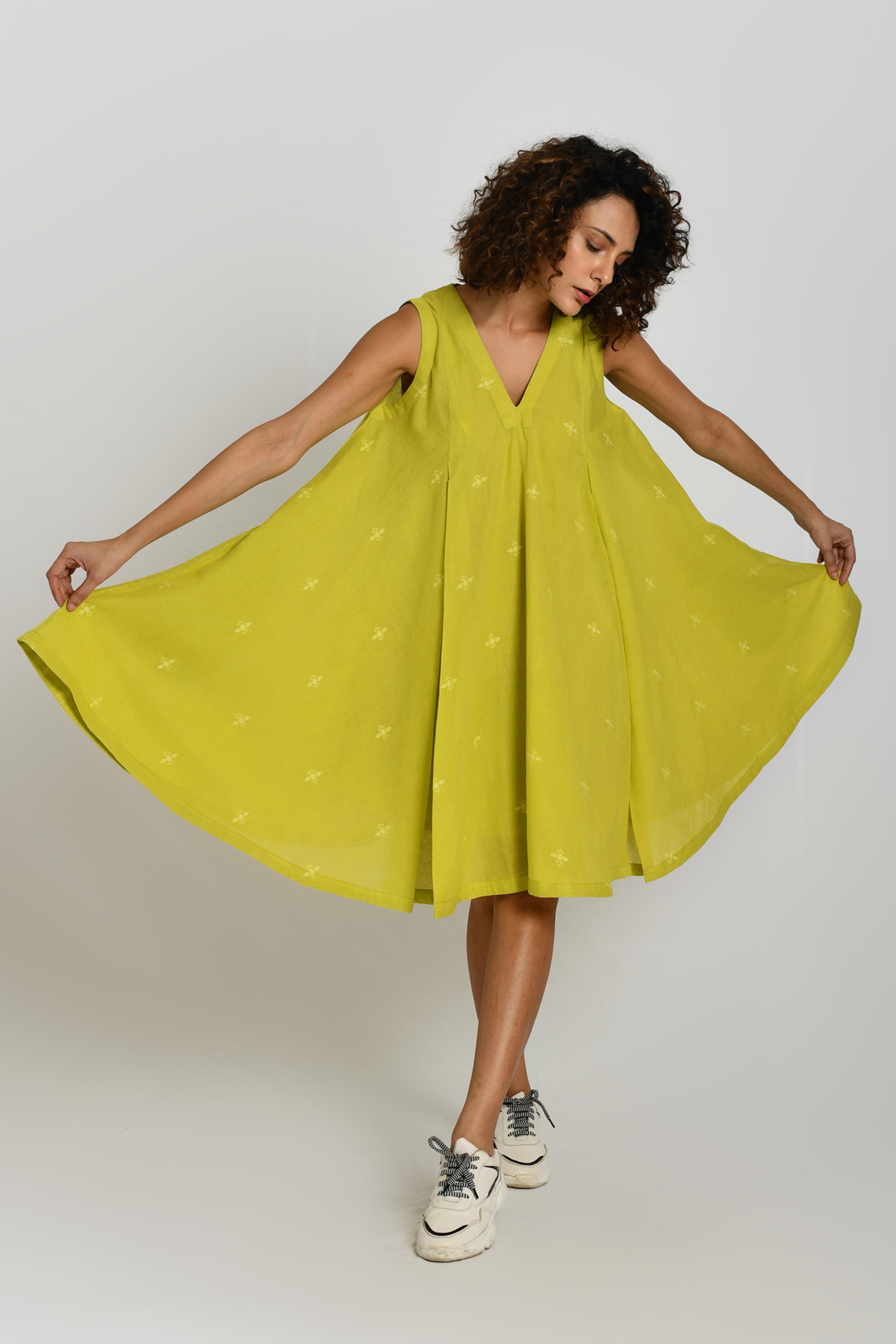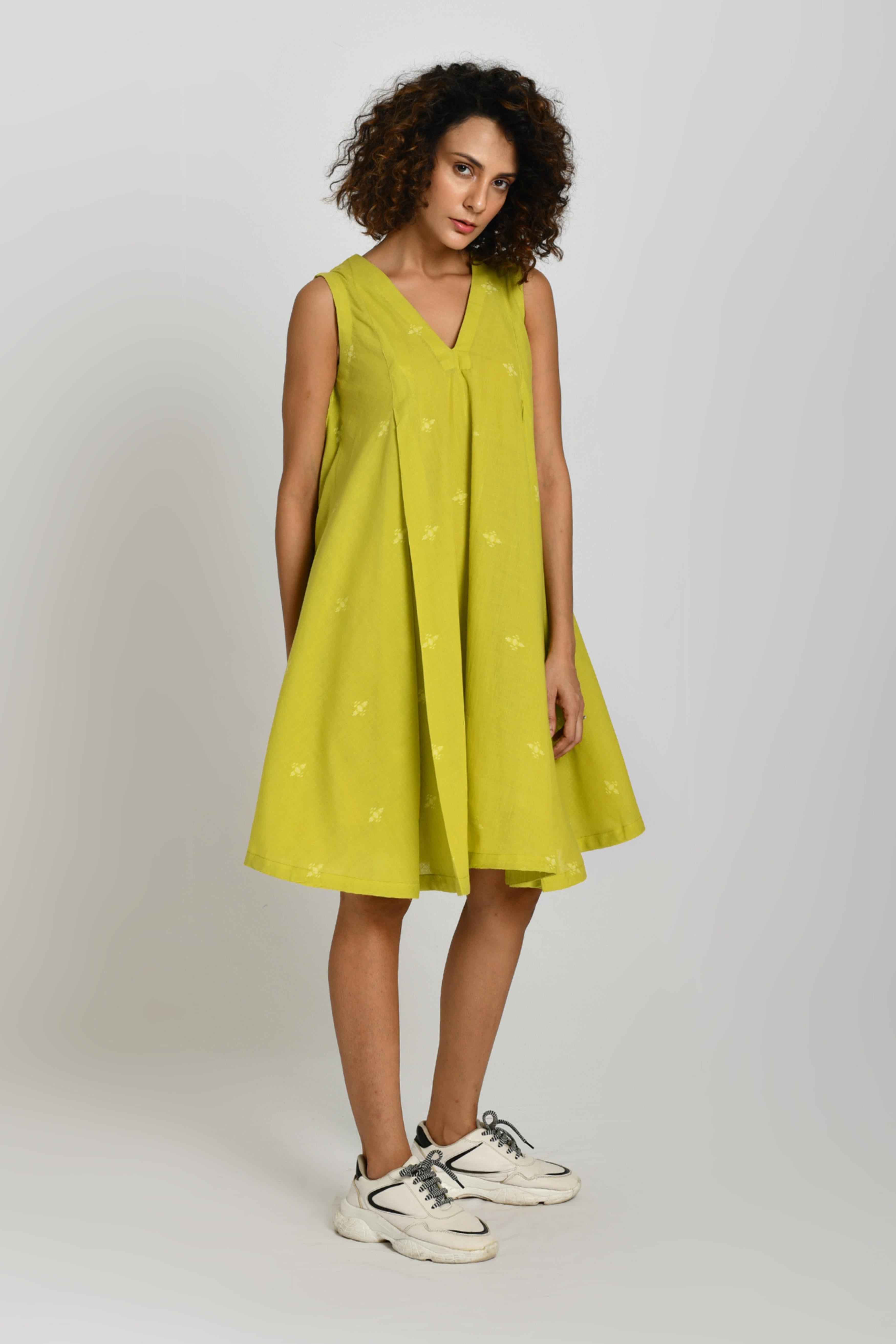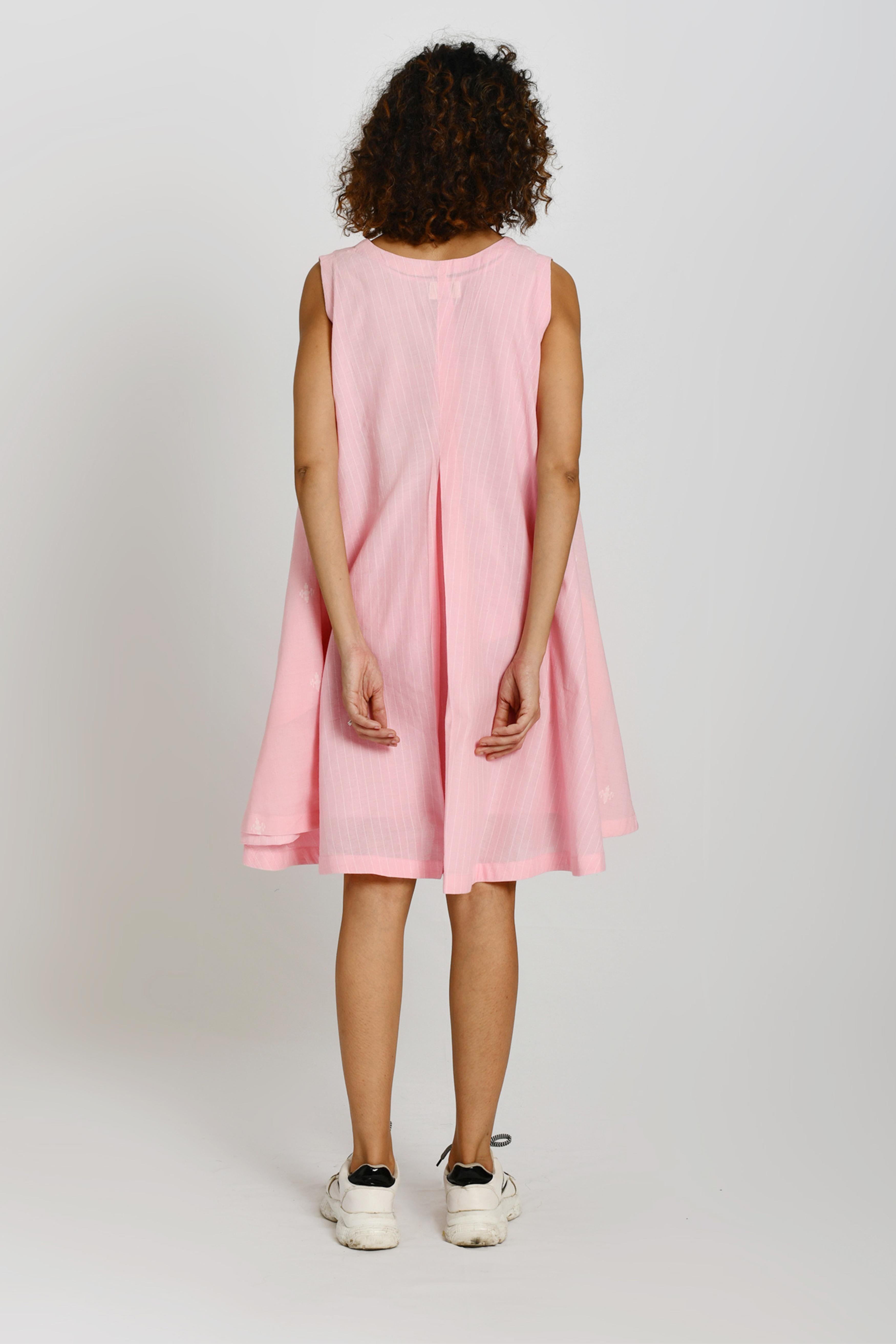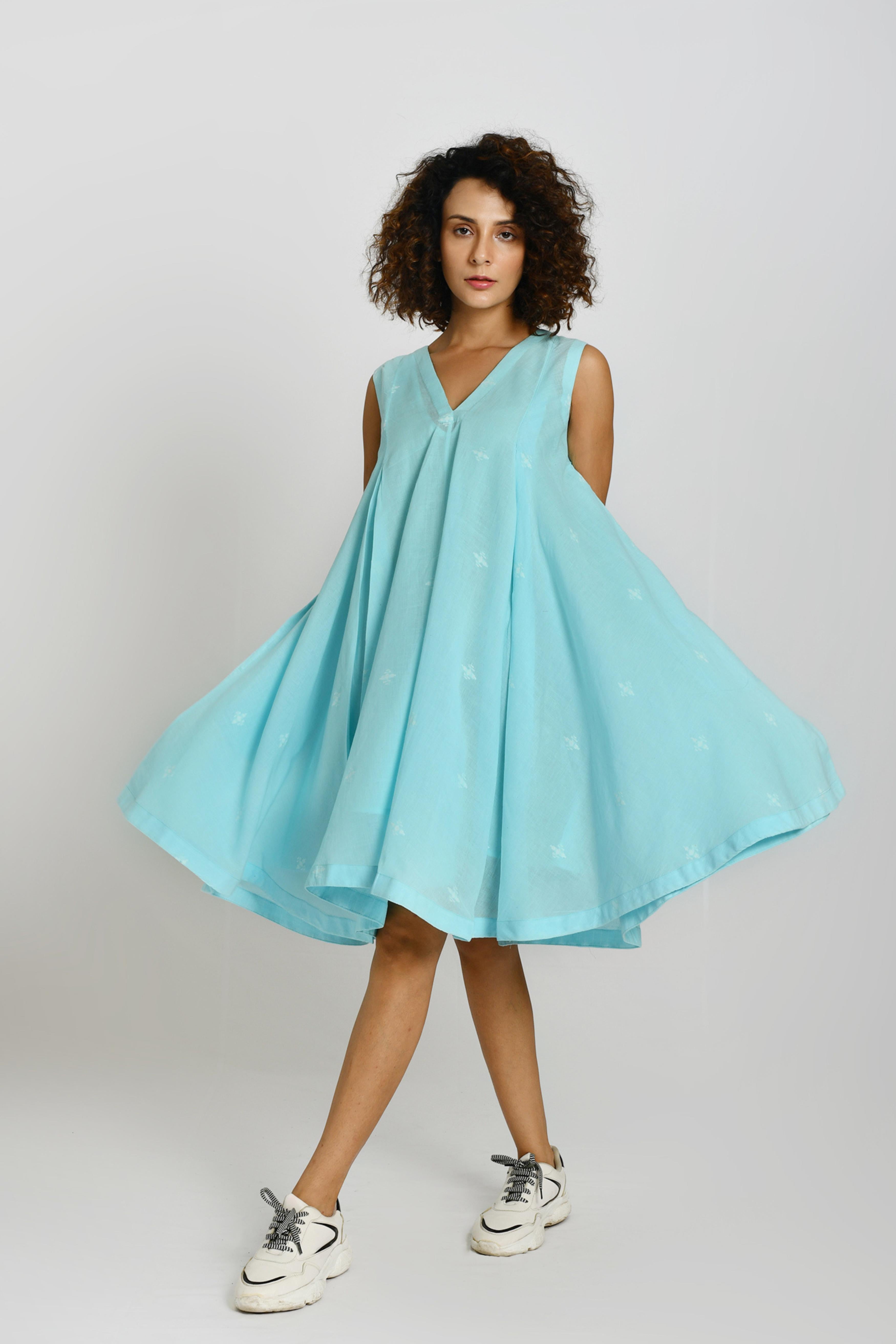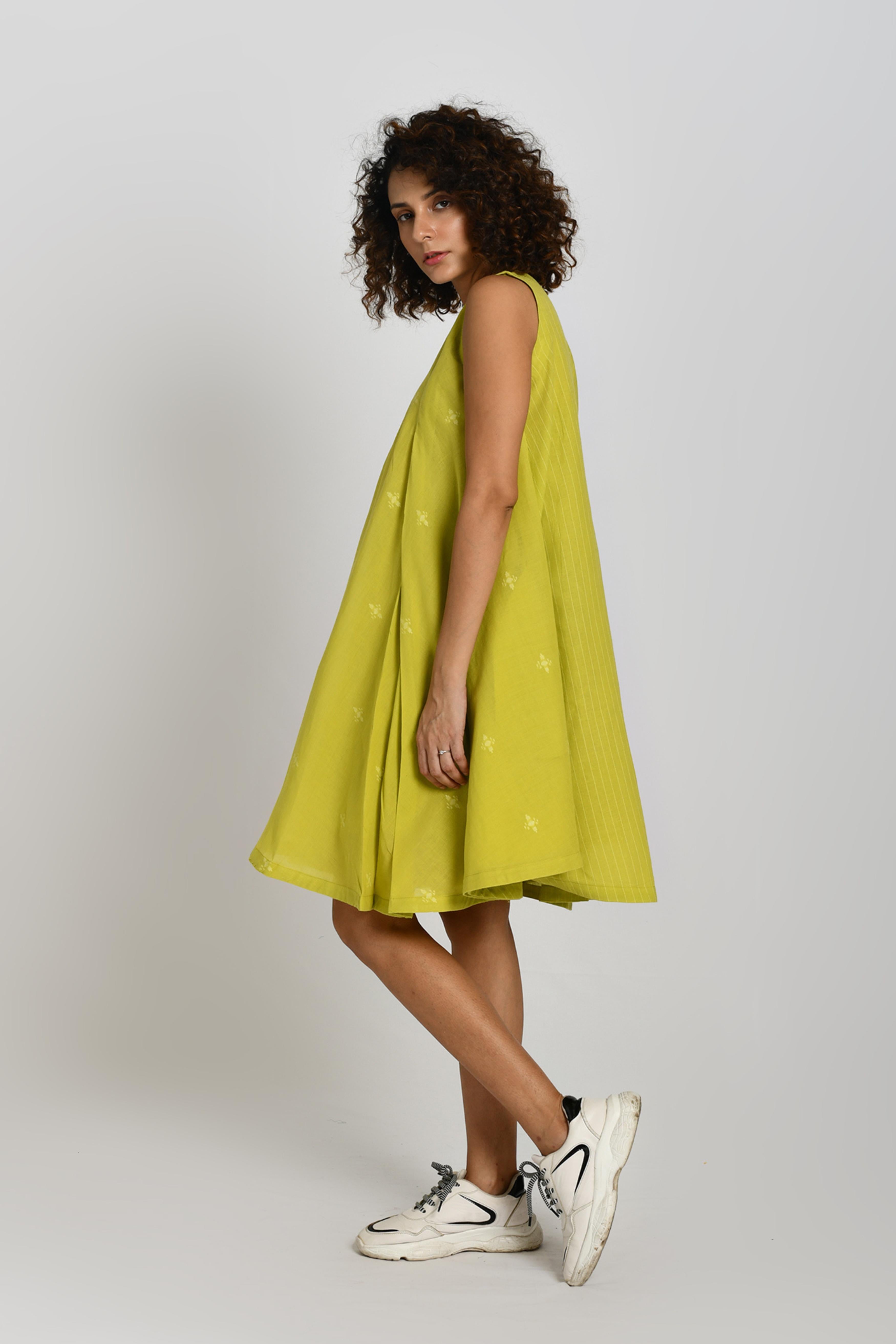 We present a stunning knee-length dress in 3 charming hueS, crafted with care and artistry. This exquisite dress features intricate hand-spun and hand-woven cotton fabric, showcasing the timeless beauty of jamdani craftsmanship. With its box pleats enhancing both the front and back, this dress offers a flattering silhouette that effortlessly blends style and comfort.