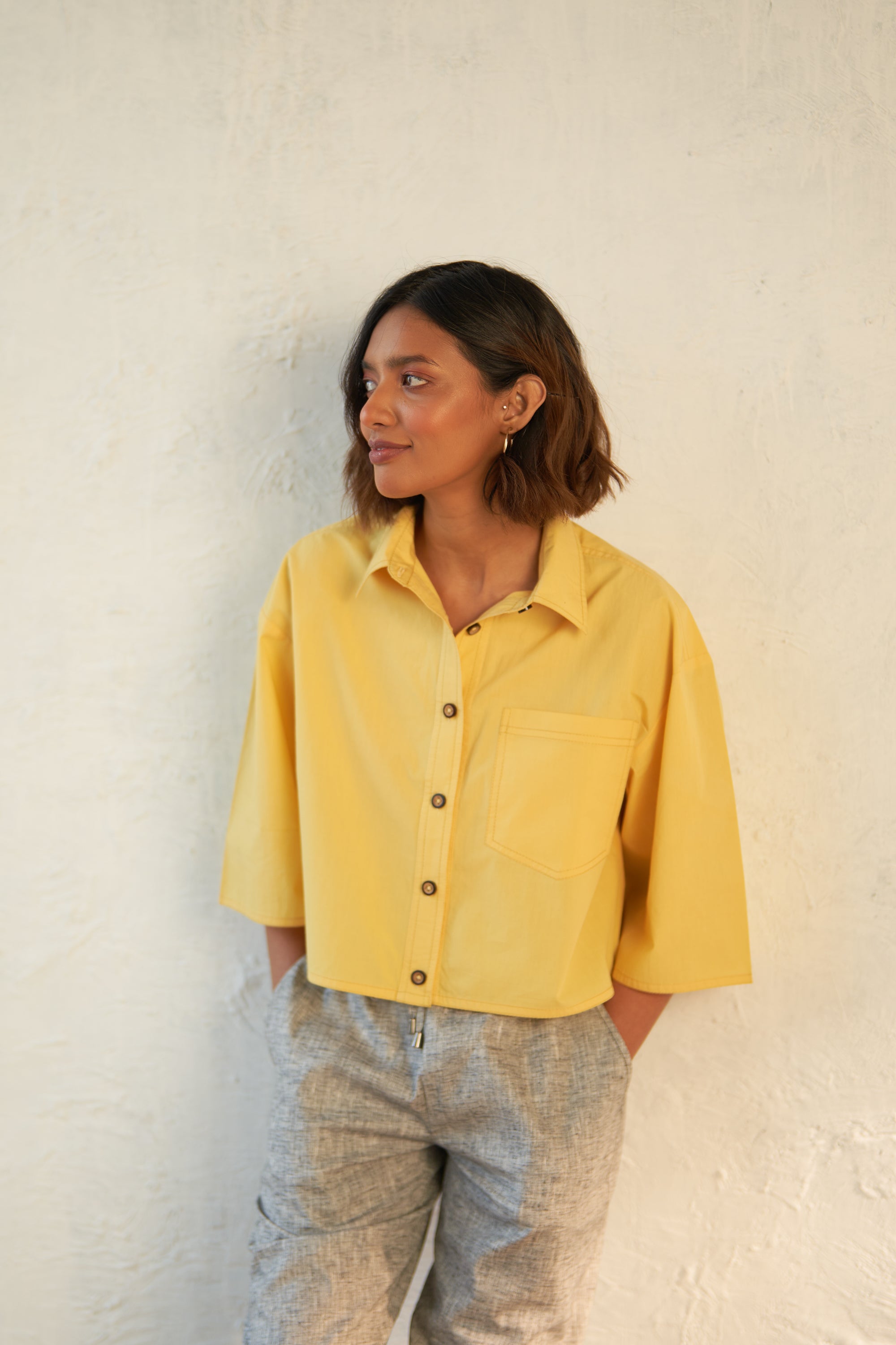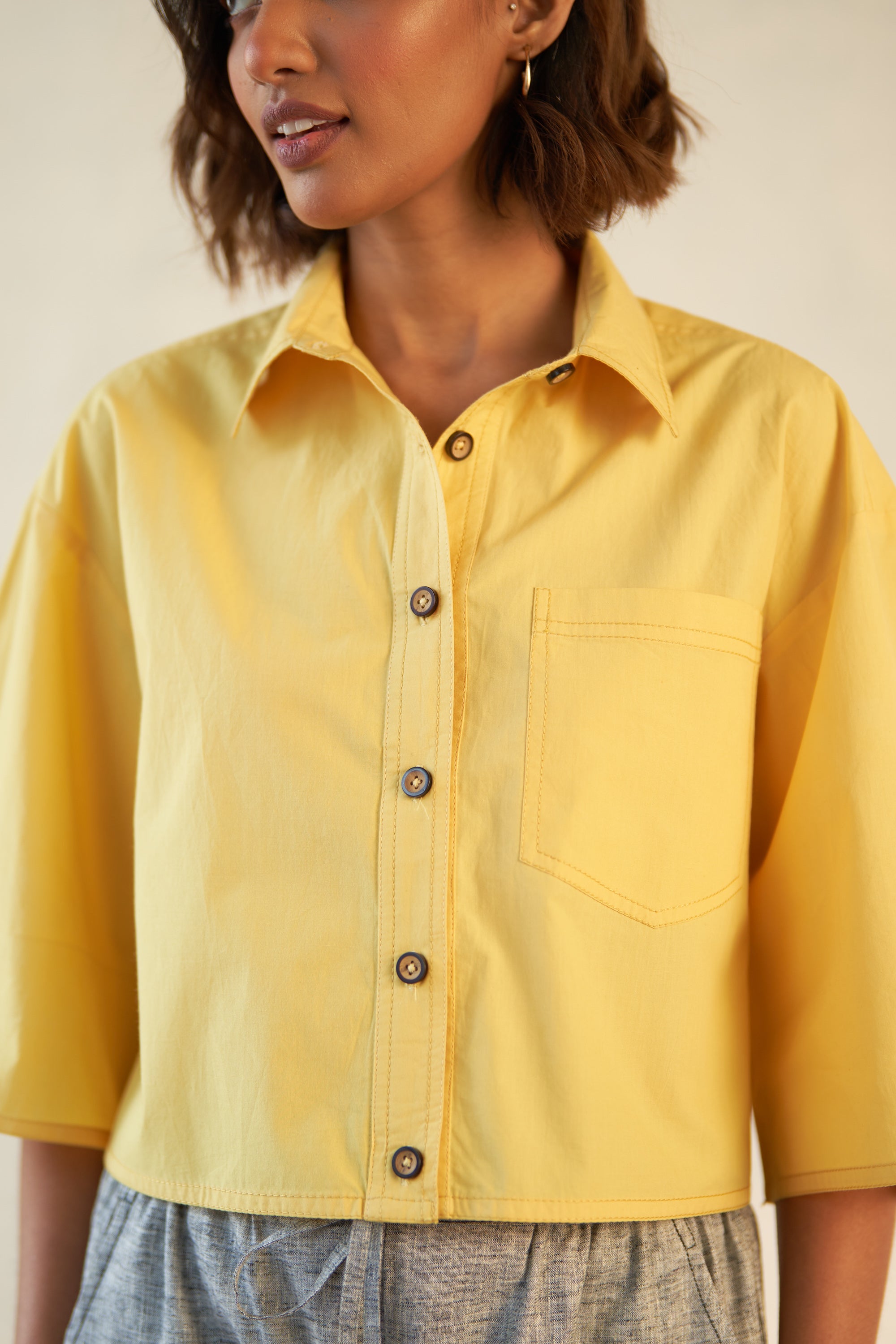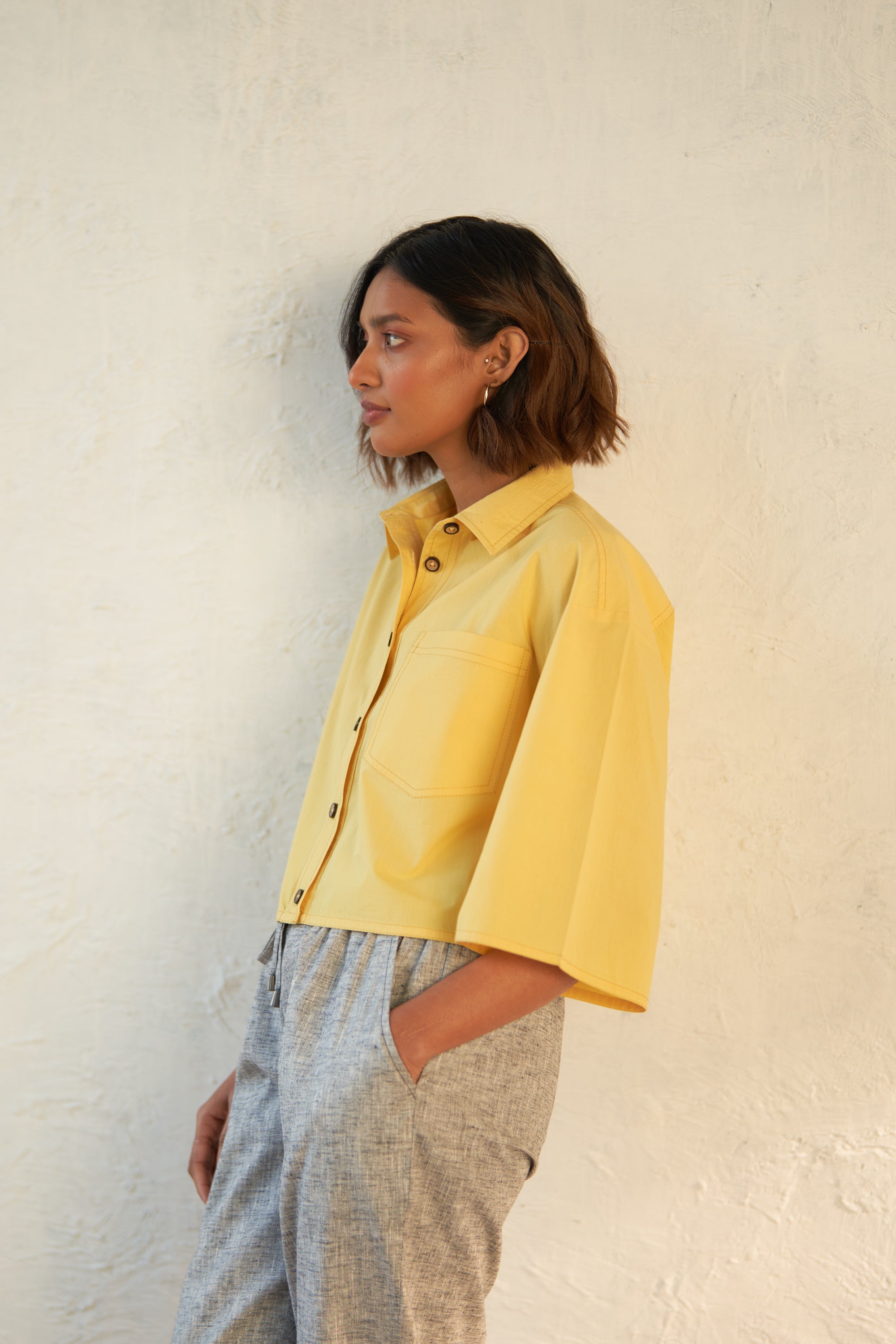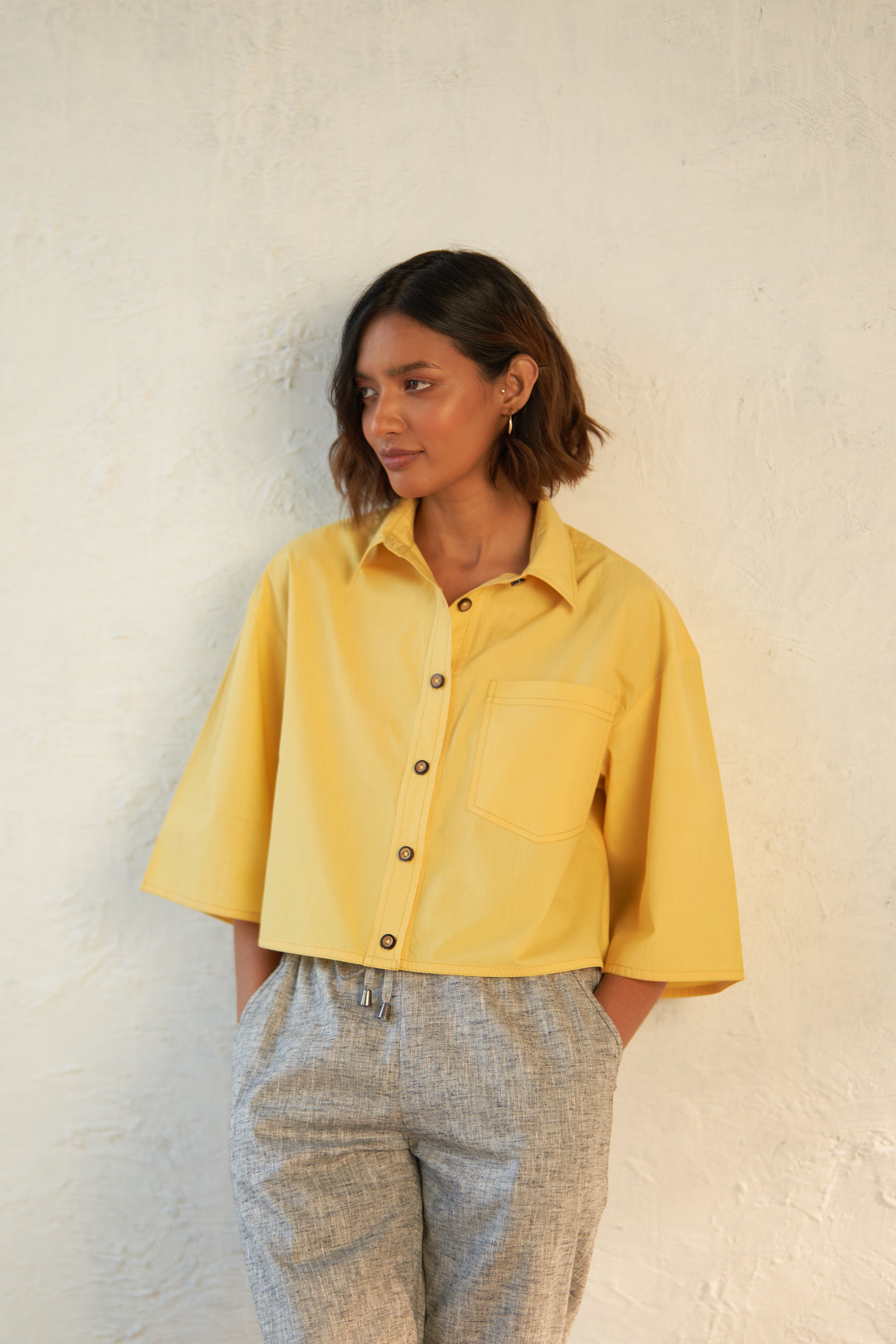 Crafted in soft cotton fabric reminiscent of a sunny lemony gush, our shirt is cut in a boxy profile that exudes casual comfort. It's adorned with patch pockets and bold black buttons, while subtle stitch detailing adds a unique touch. Embodying the vibrant spirit of yellow, this shirt radiates a cheerful and uplifting vibe perfect for any casual occasion.
