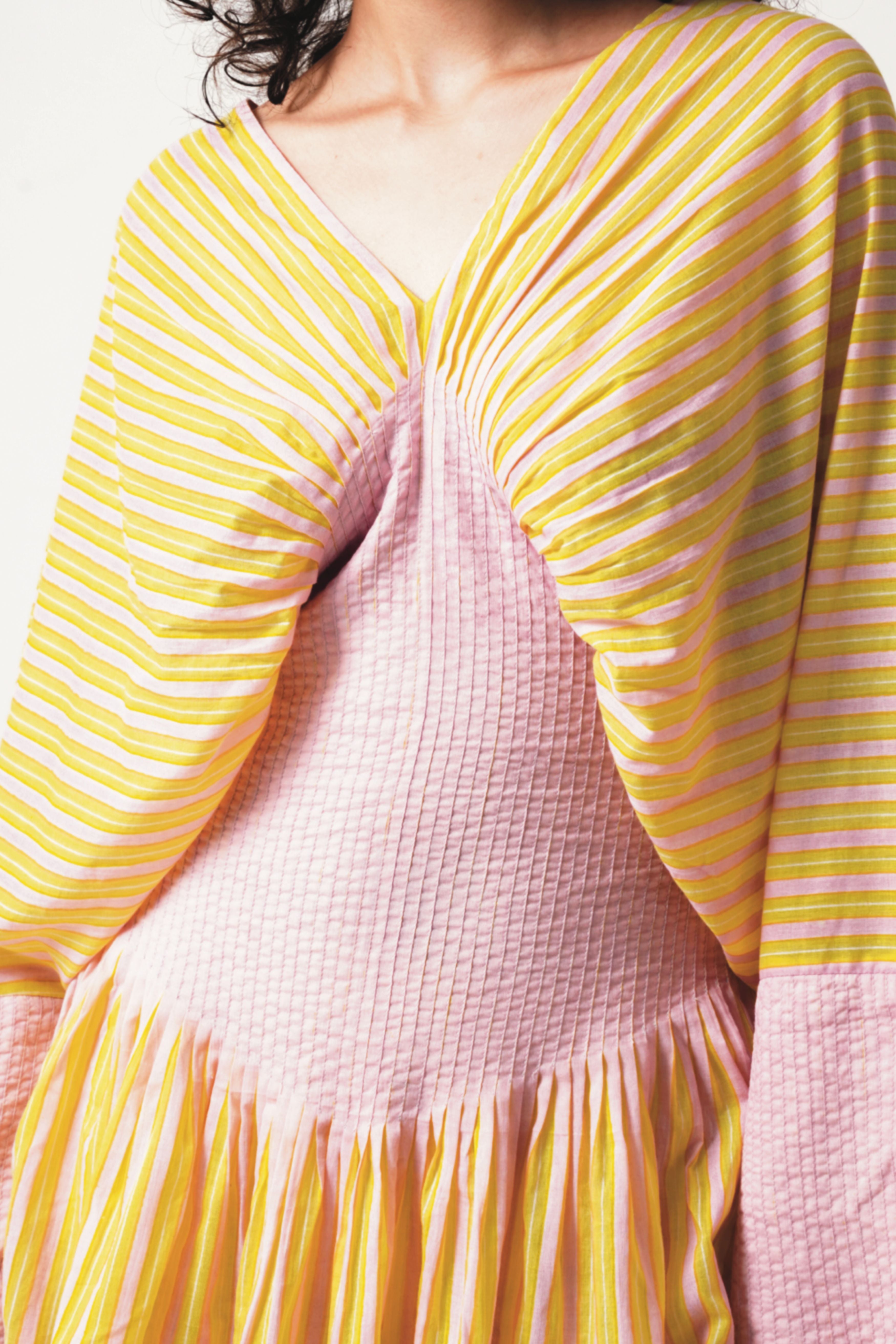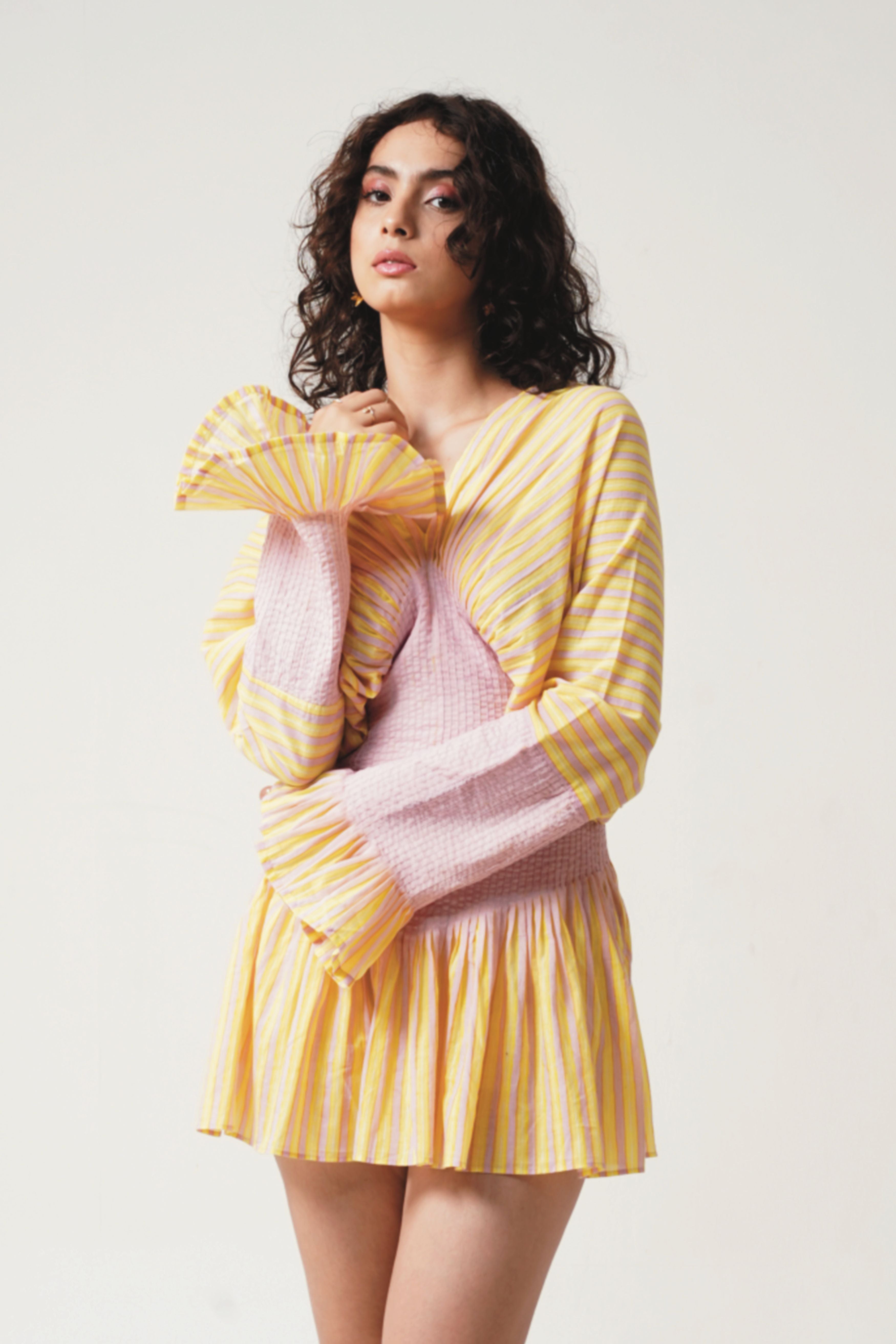 This dress is a burst of joy wrapped in soft textures and pastel tones. With blush-pink and sunshine-yellow stripes, it feels like a celebration of light. The pleated bodice flatters, while the ruffled hem and sleeves add whimsy with every step. Made for golden afternoons and spontaneous laughter, it’s a dress that dances with you. Model is 5'8 and is wearing a size XS.