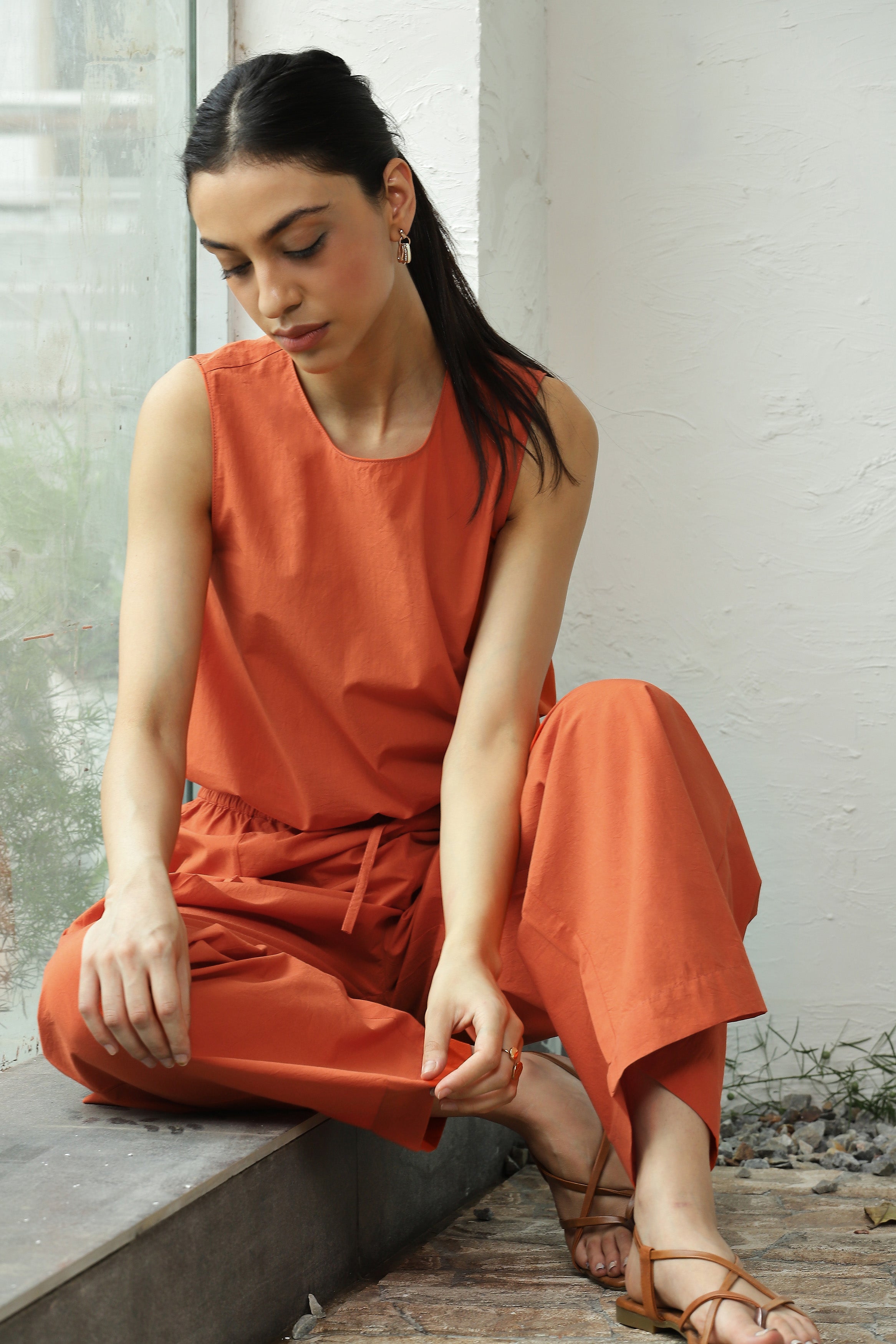 Radiate Sunshine All Day with Our Orange Co-ord Set. Created from lightweight, soft cotton, it features drawstring detailing at the hem for a perfect waistline fit. The added knot adds a charming touch to the ensemble. Combined with our flared palazzo, this outfit is an essential addition to your summer wardrobe.