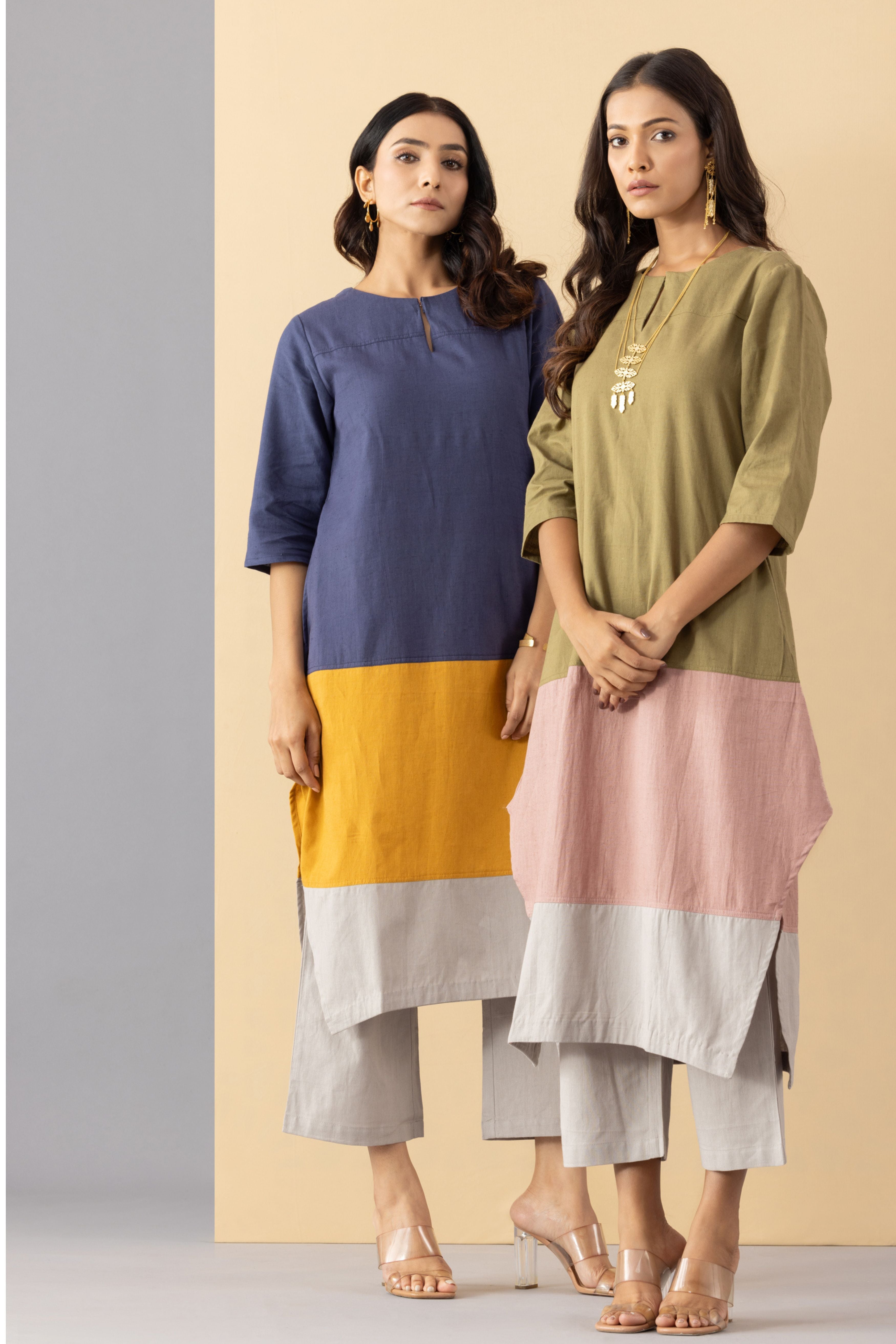 This three colour paneled kurti tunic is crafted in light weight Khadi Cotton. Designed to be worn with our Grey khadi pants . This tunic is made with breathable, comfort fabric. It is perfect for daily wear or festive occasions for that subtle minimal look. - Front opening ,tunic has side pockets - Regular fit - Model is wearing size S - This is a textile fabric. The subtle imperfections in the weave, texture and colors are a natural outcome of handcrafted textiles and not a defect.