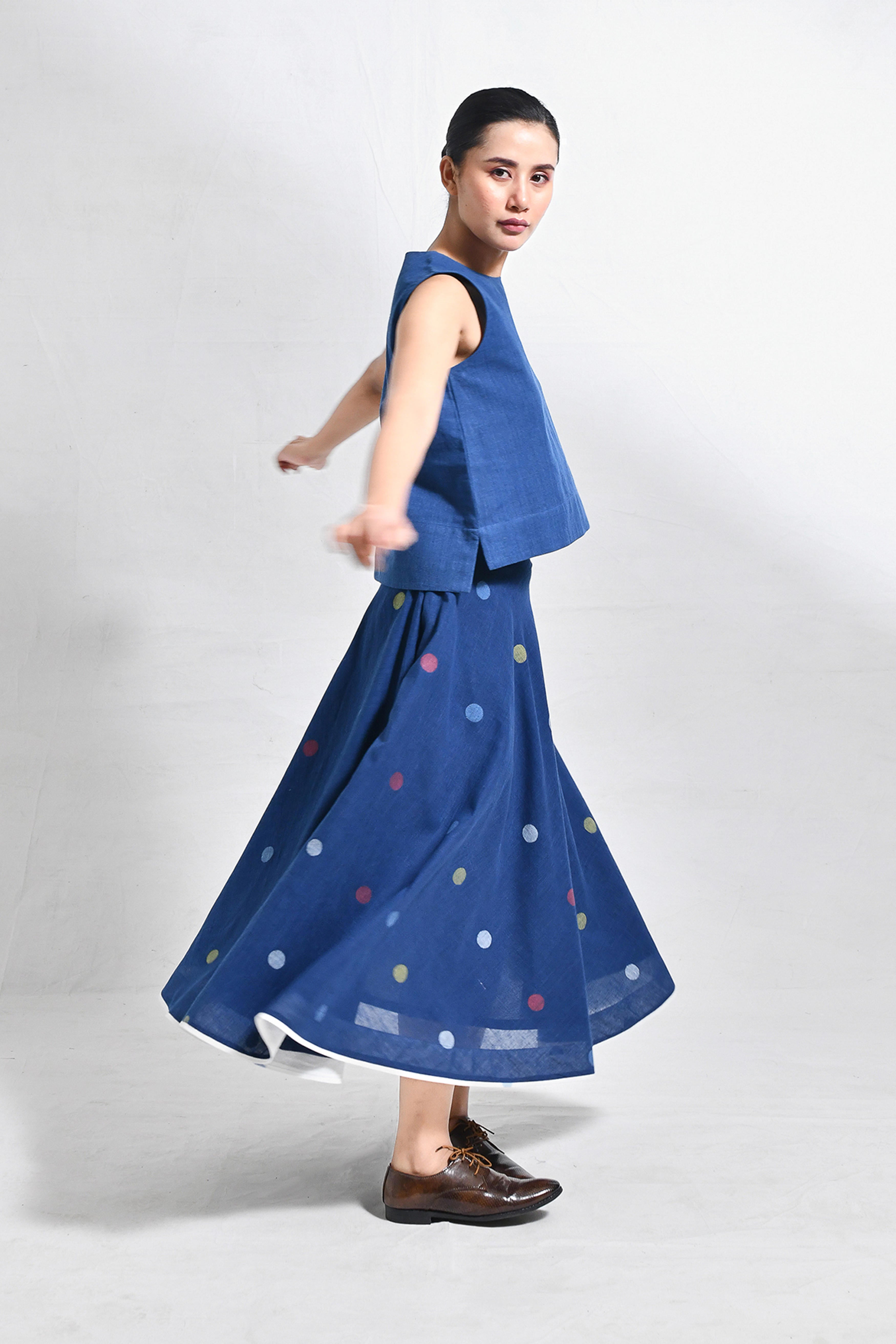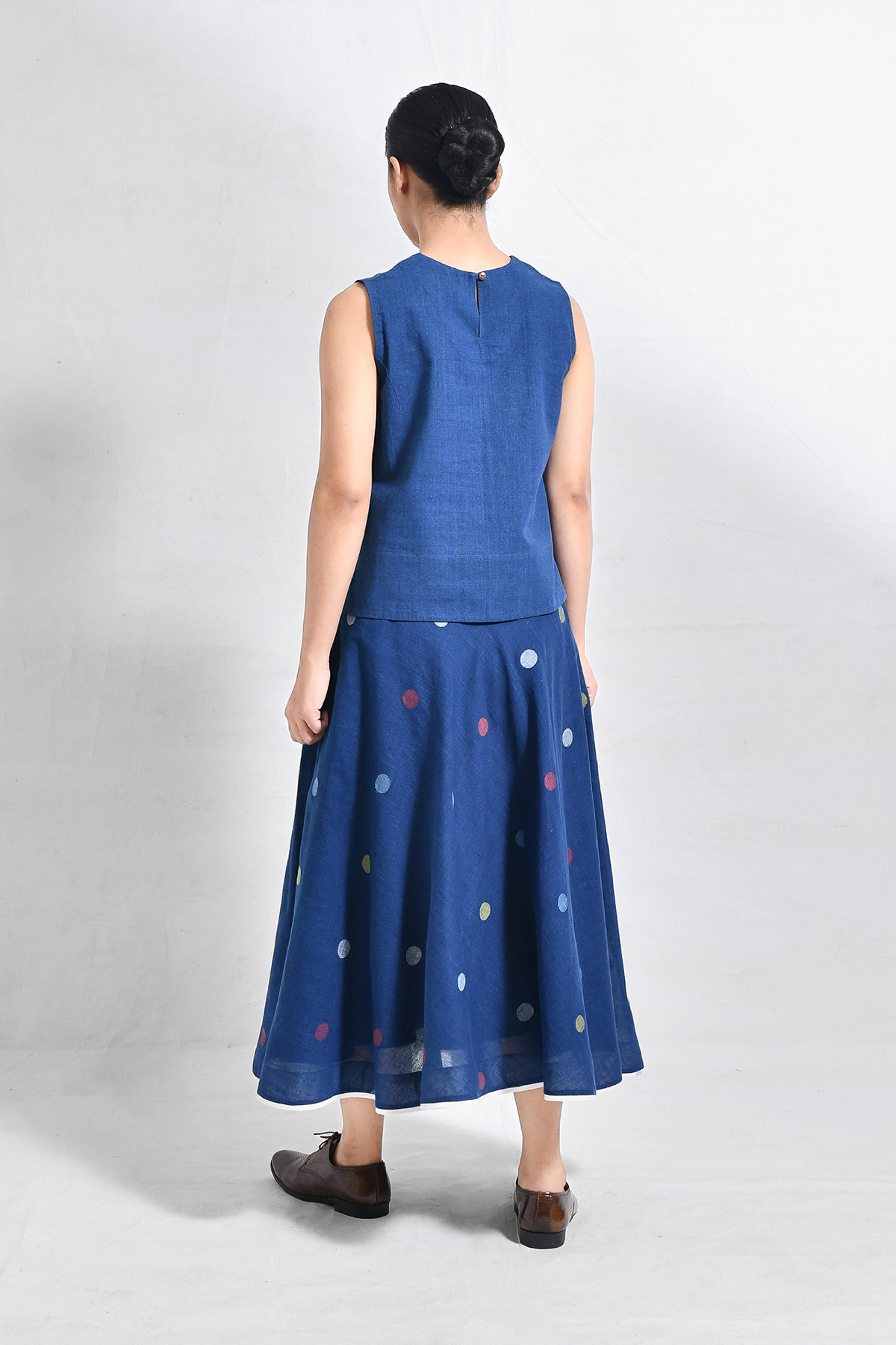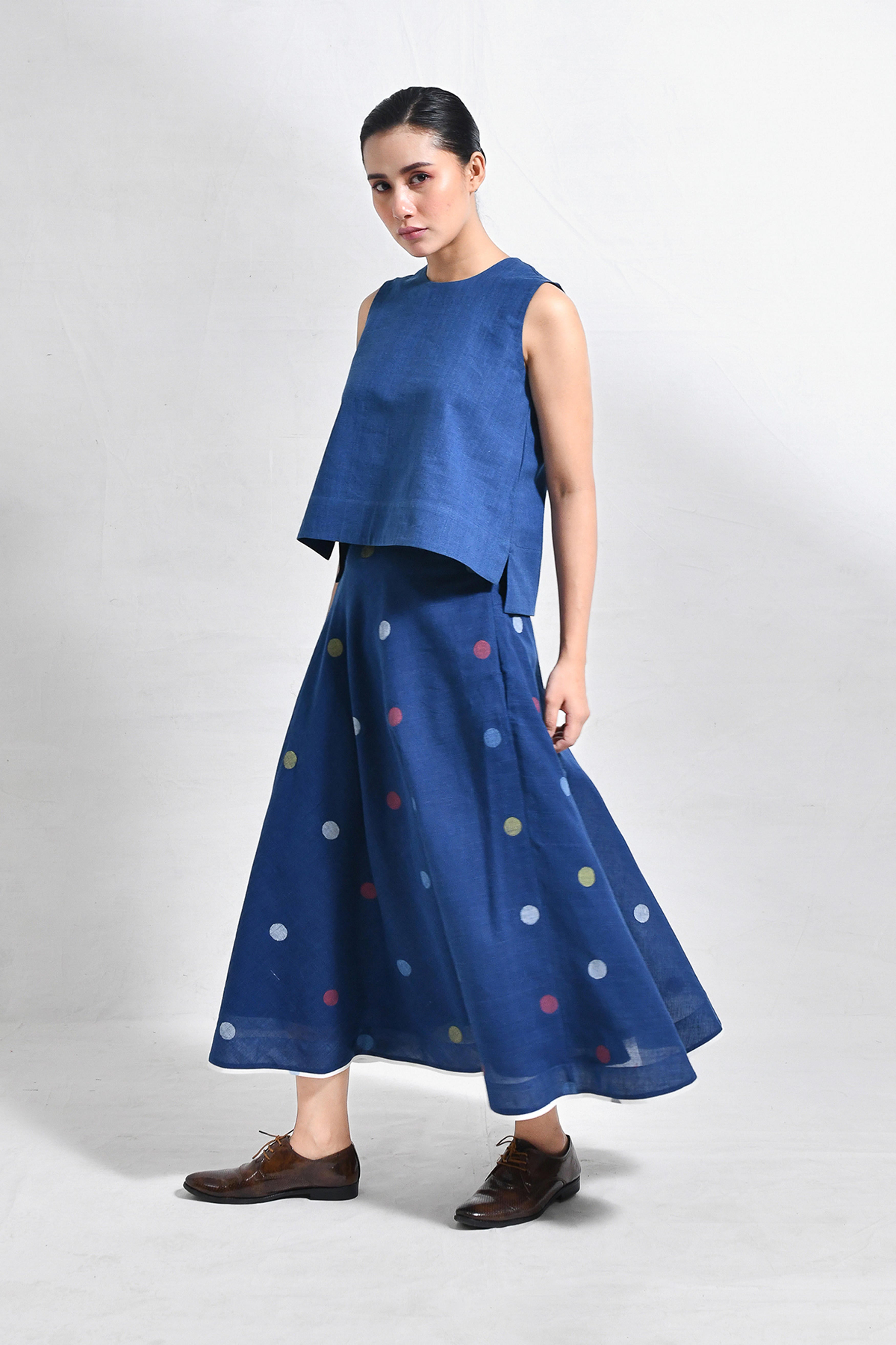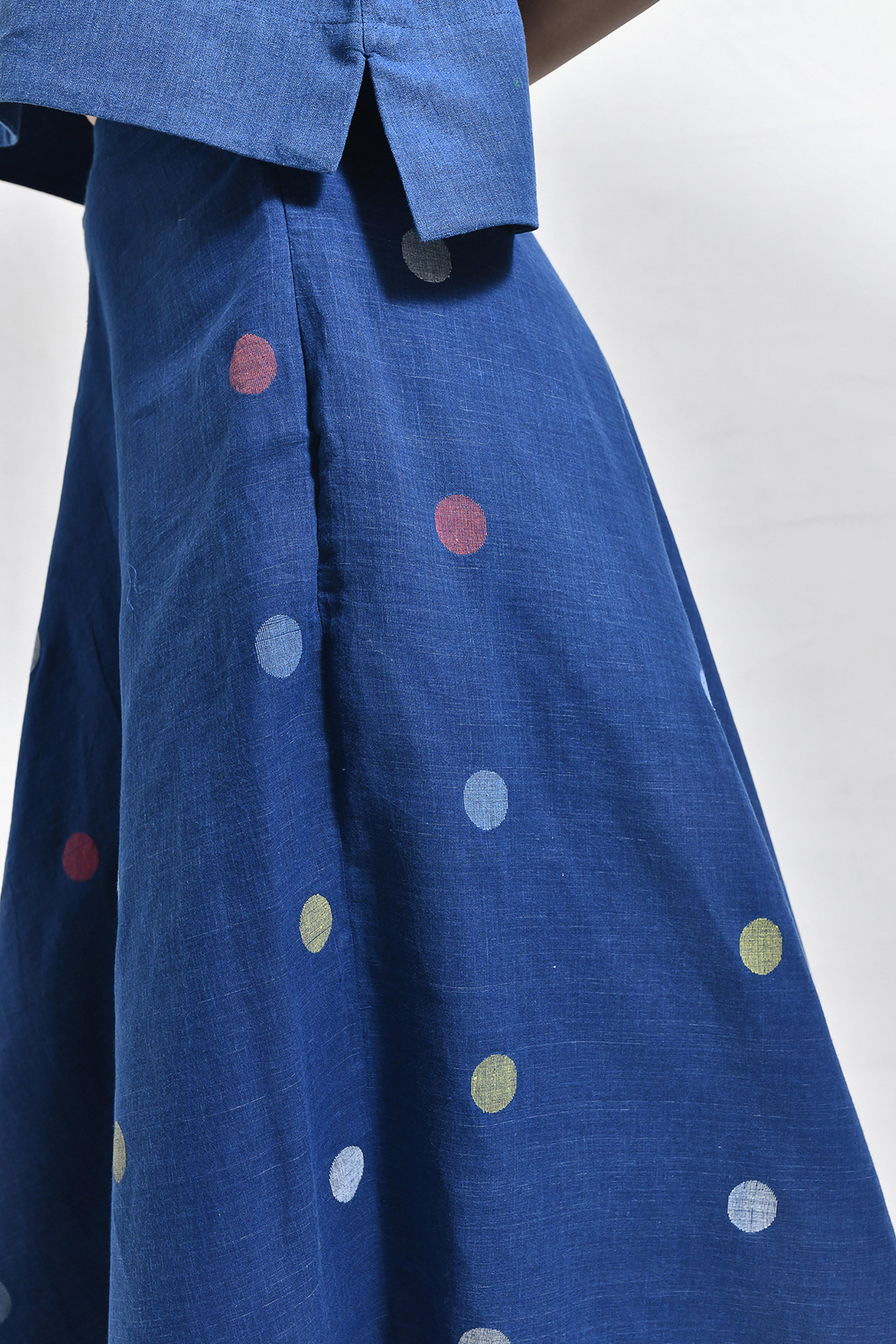 Naturally dyed in rich indigo, this khadi crop top and skirt set exudes effortless charm. The minimal crop top with a round neckline pairs seamlessly with the flared, ankle-length skirt, adorned with playful, multicolored polka dot motifs handwoven in Jamdani. A versatile ensemble that balances comfort and modern elegance. Model is 5'5, wearing a Size S.