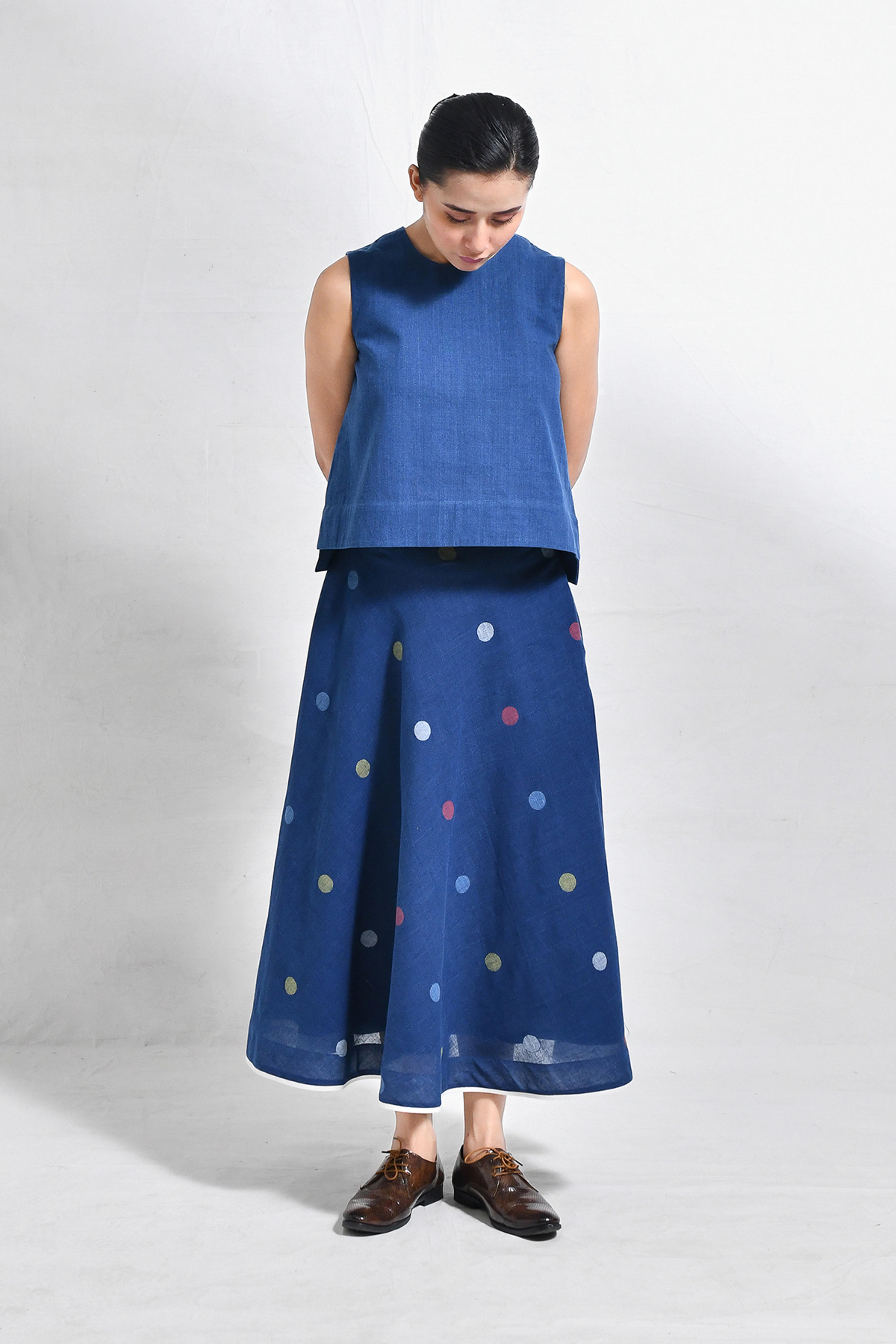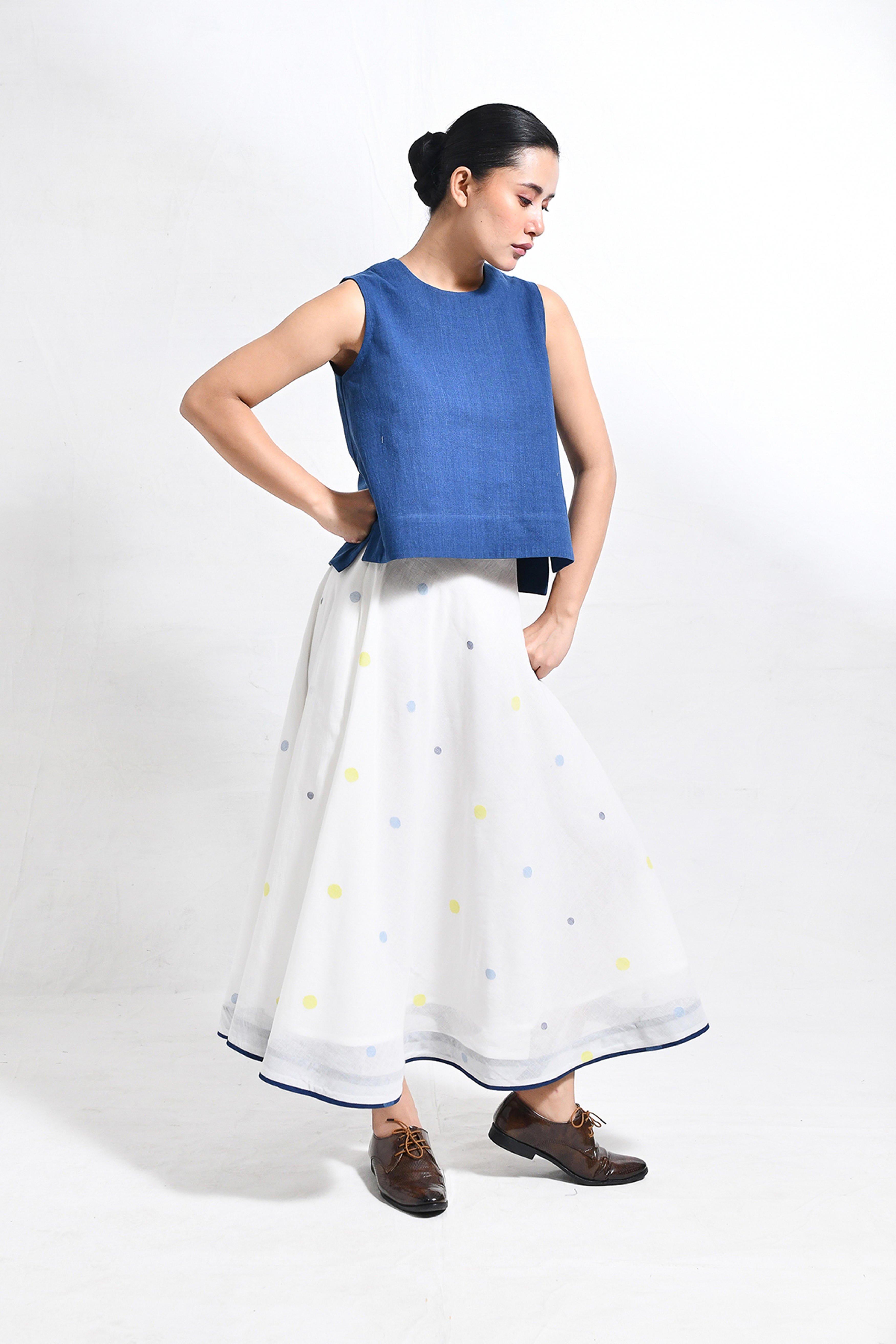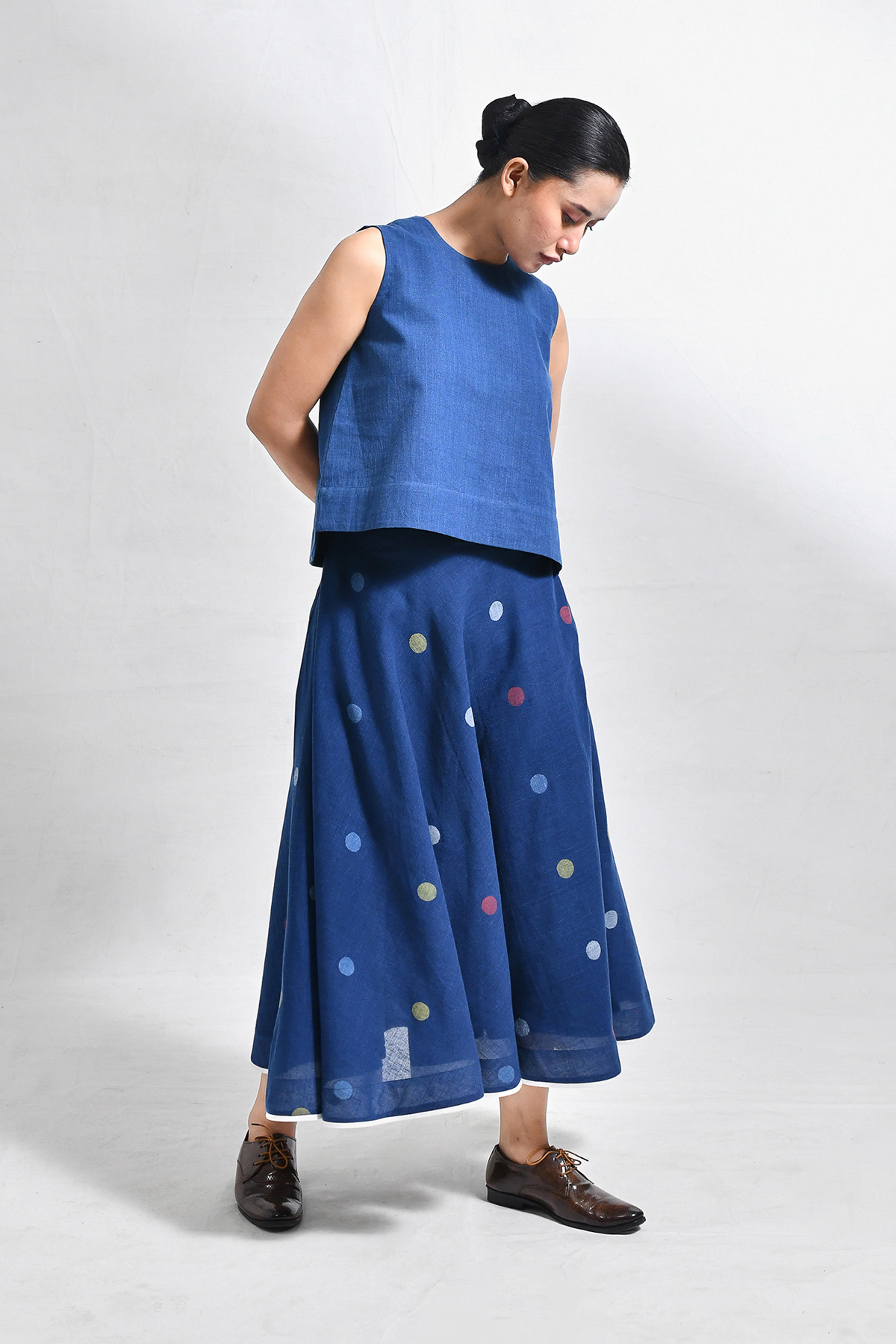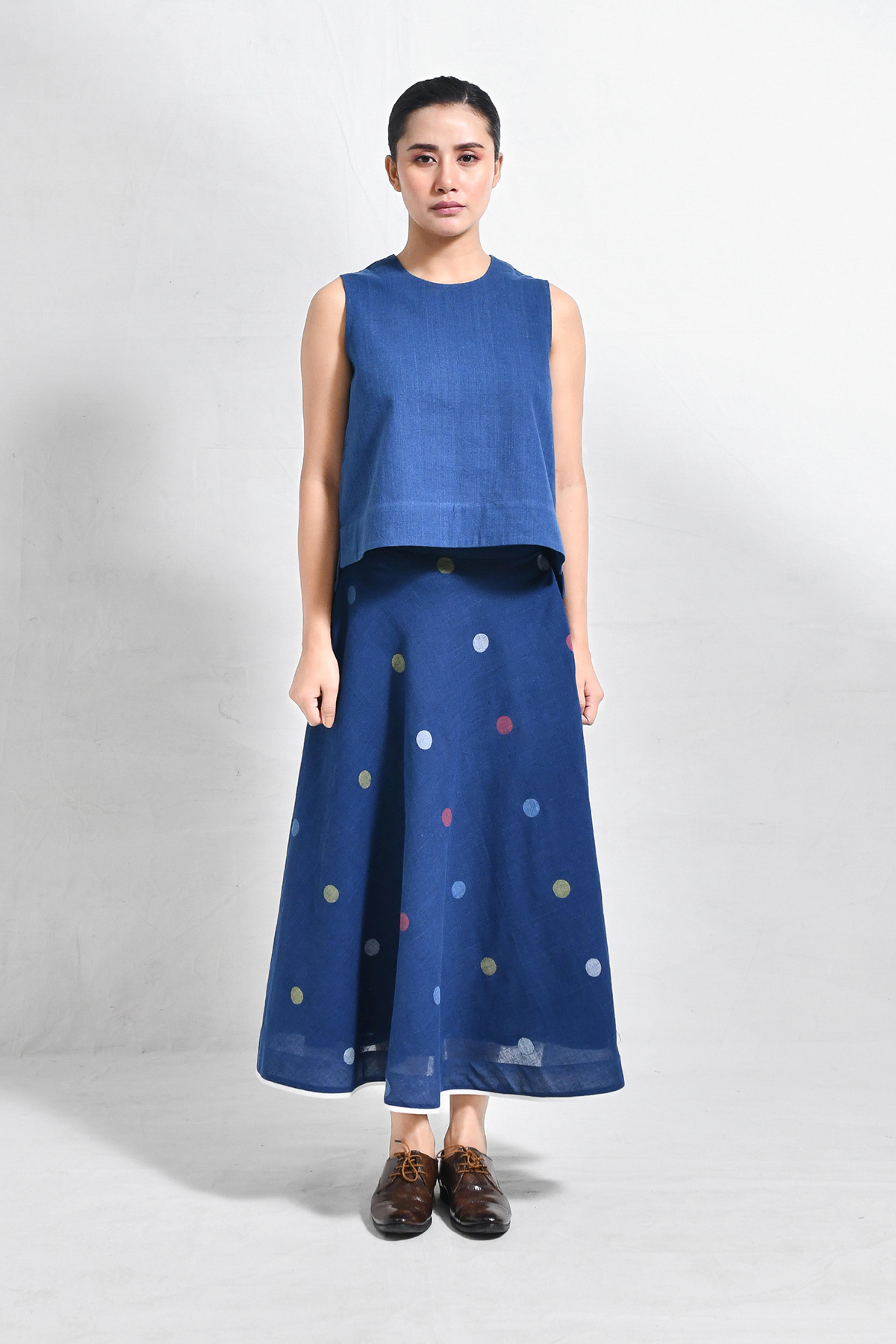 Naturally dyed in rich indigo, this khadi crop top and skirt set exudes effortless charm. The minimal crop top with a round neckline pairs seamlessly with the flared, ankle-length skirt, adorned with playful, multicolored polka dot motifs handwoven in Jamdani. A versatile ensemble that balances comfort and modern elegance. Model is 5'5, wearing a Size S.