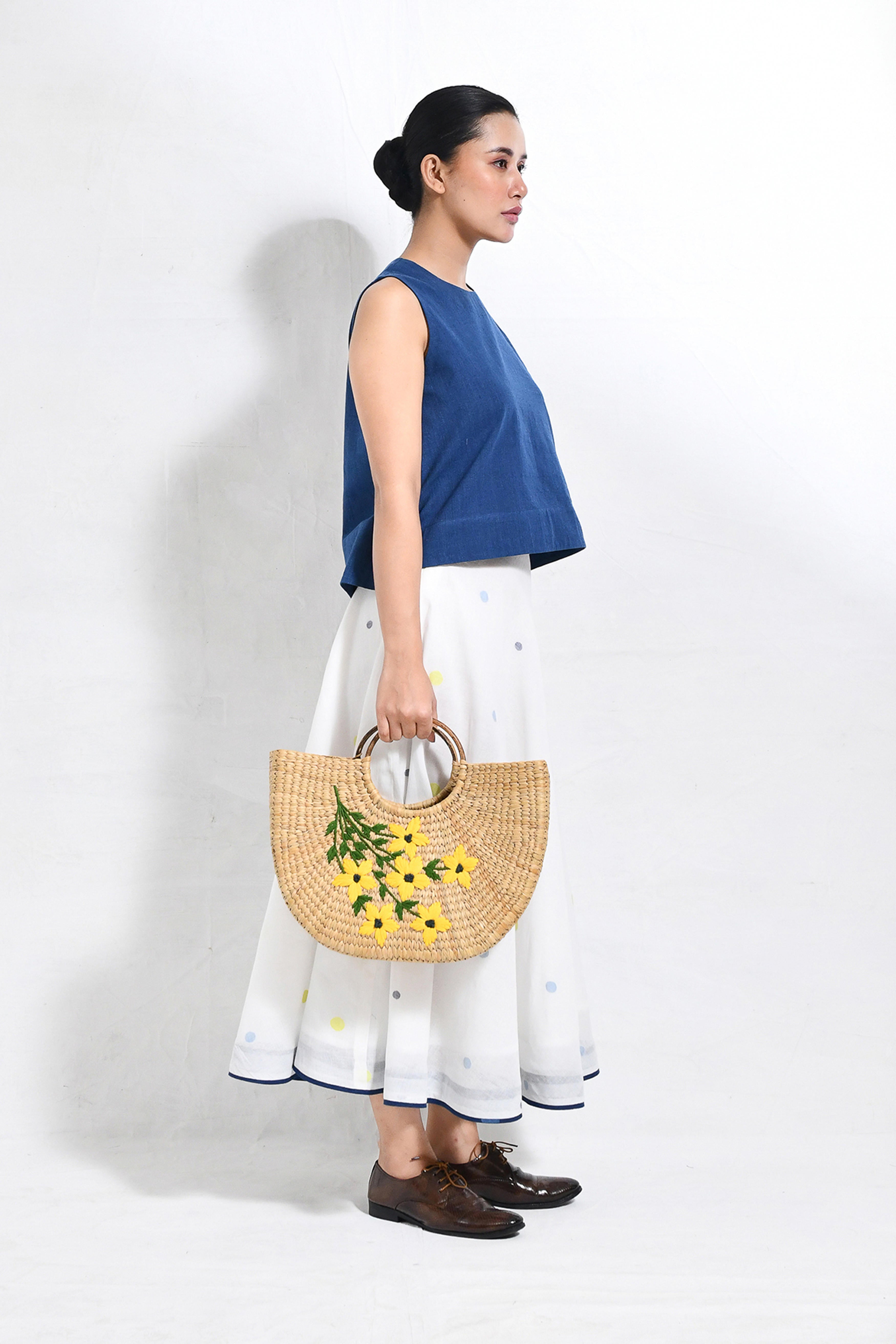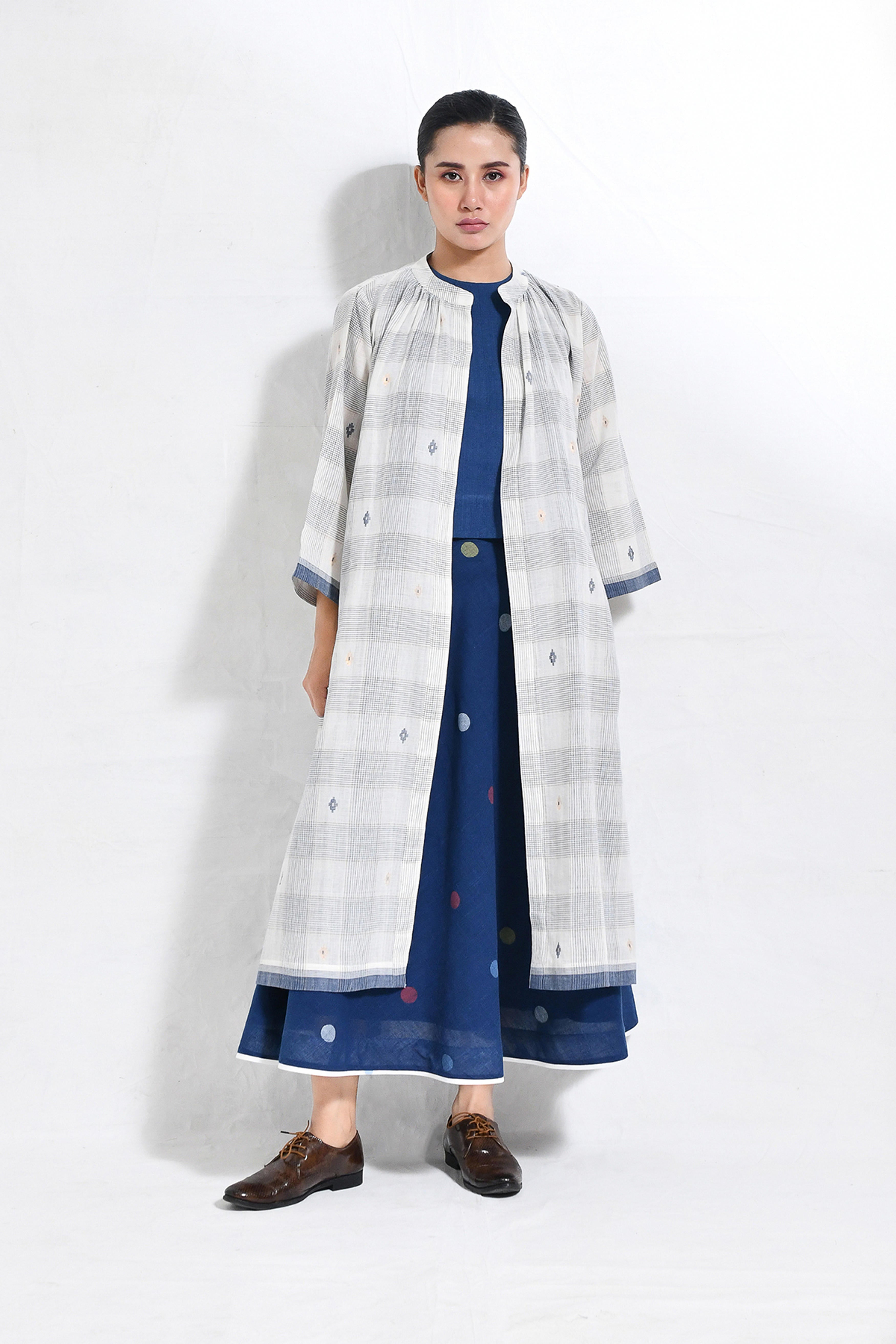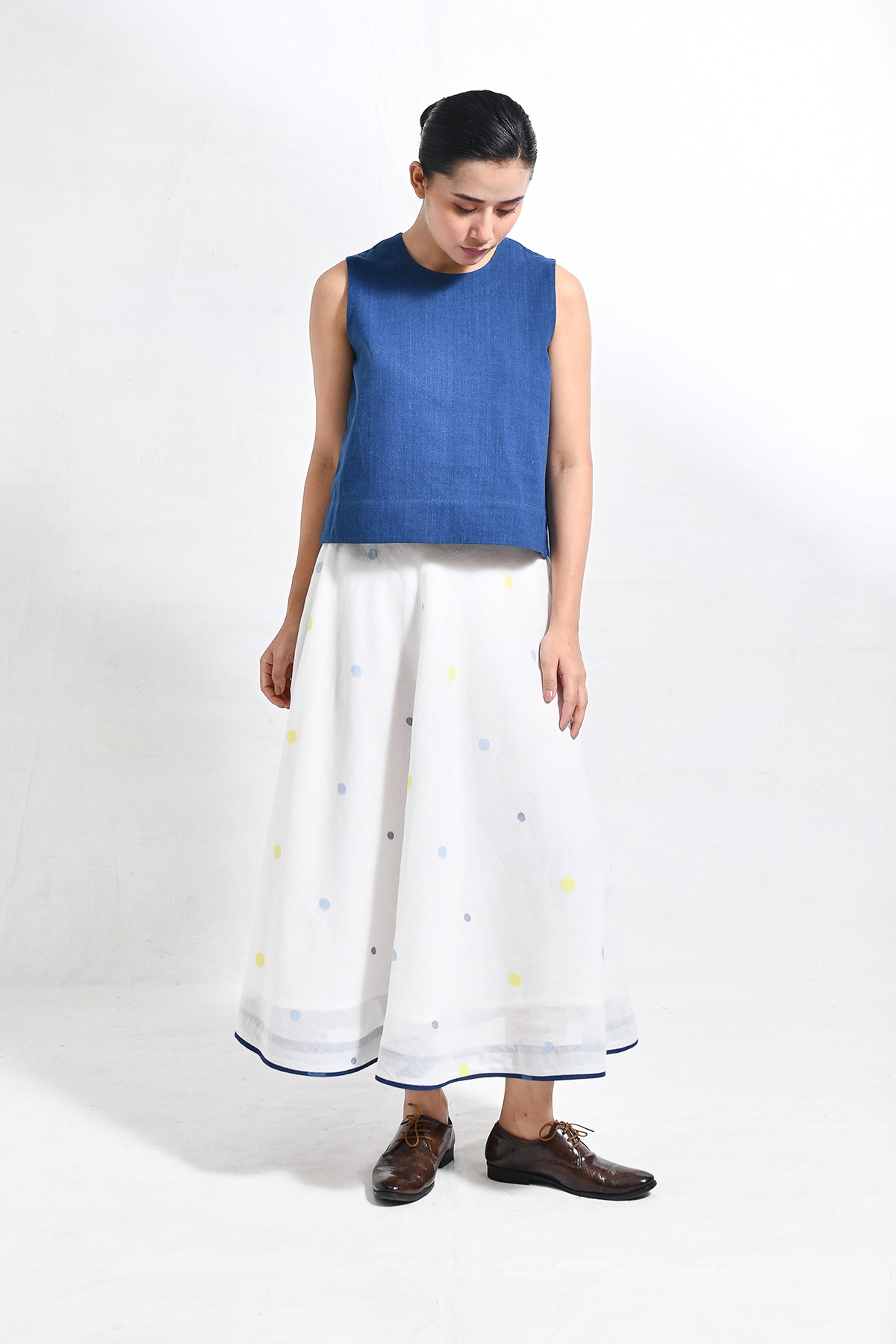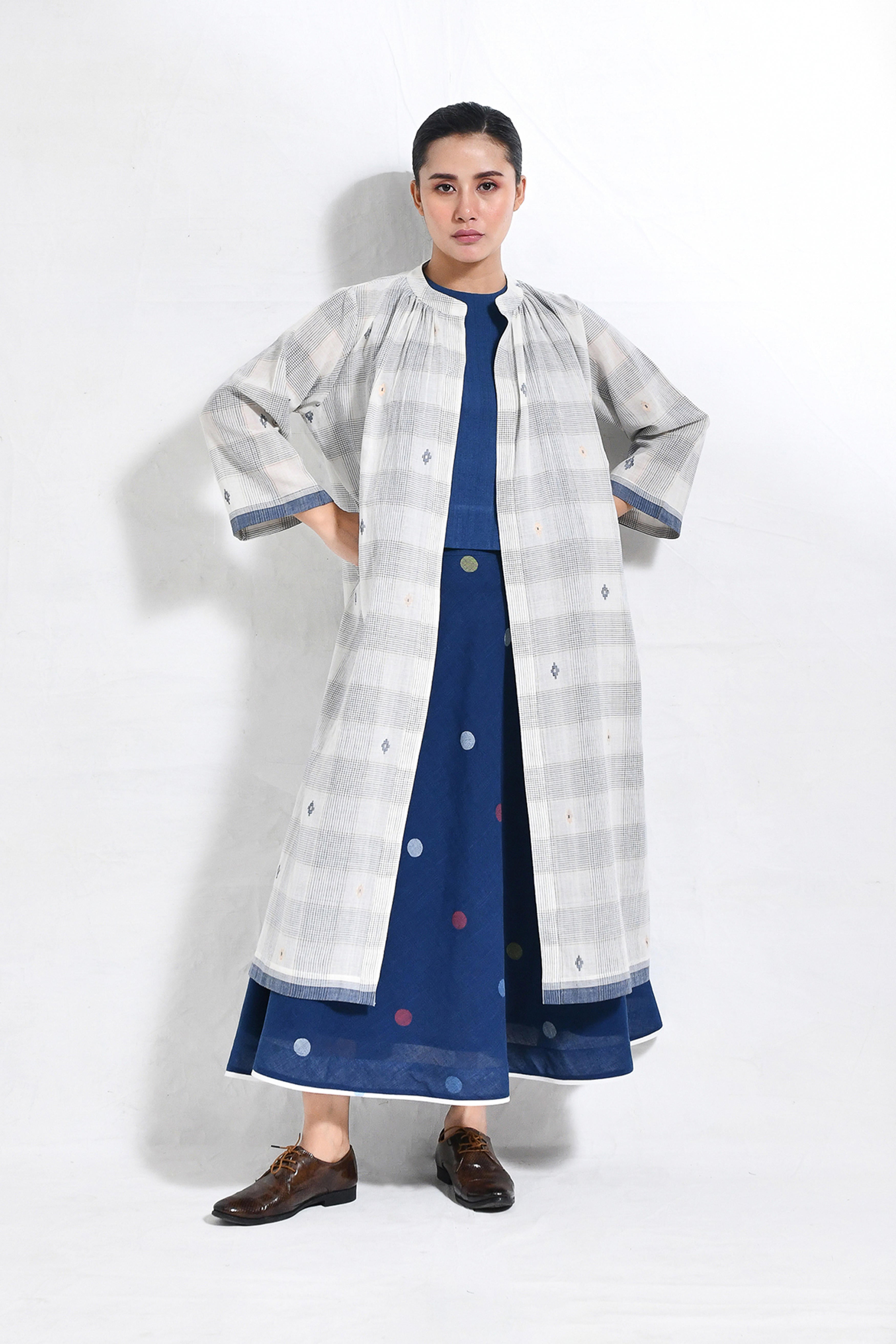 Naturally dyed in rich indigo, this khadi crop top and skirt set exudes effortless charm. The minimal crop top with a round neckline pairs seamlessly with the flared, ankle-length skirt, adorned with playful, multicolored polka dot motifs handwoven in Jamdani. A versatile ensemble that balances comfort and modern elegance. Model is 5'5, wearing a Size S.