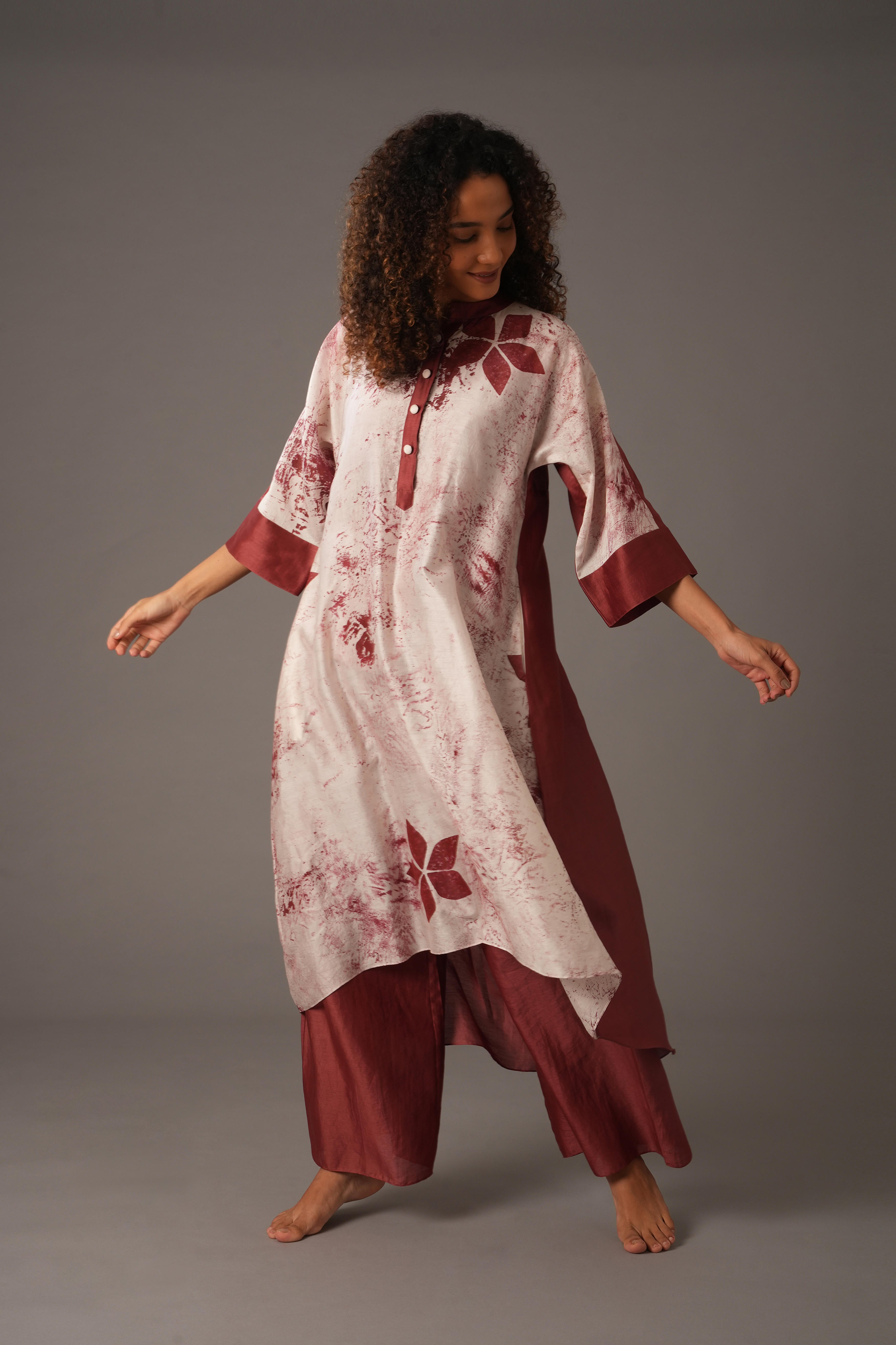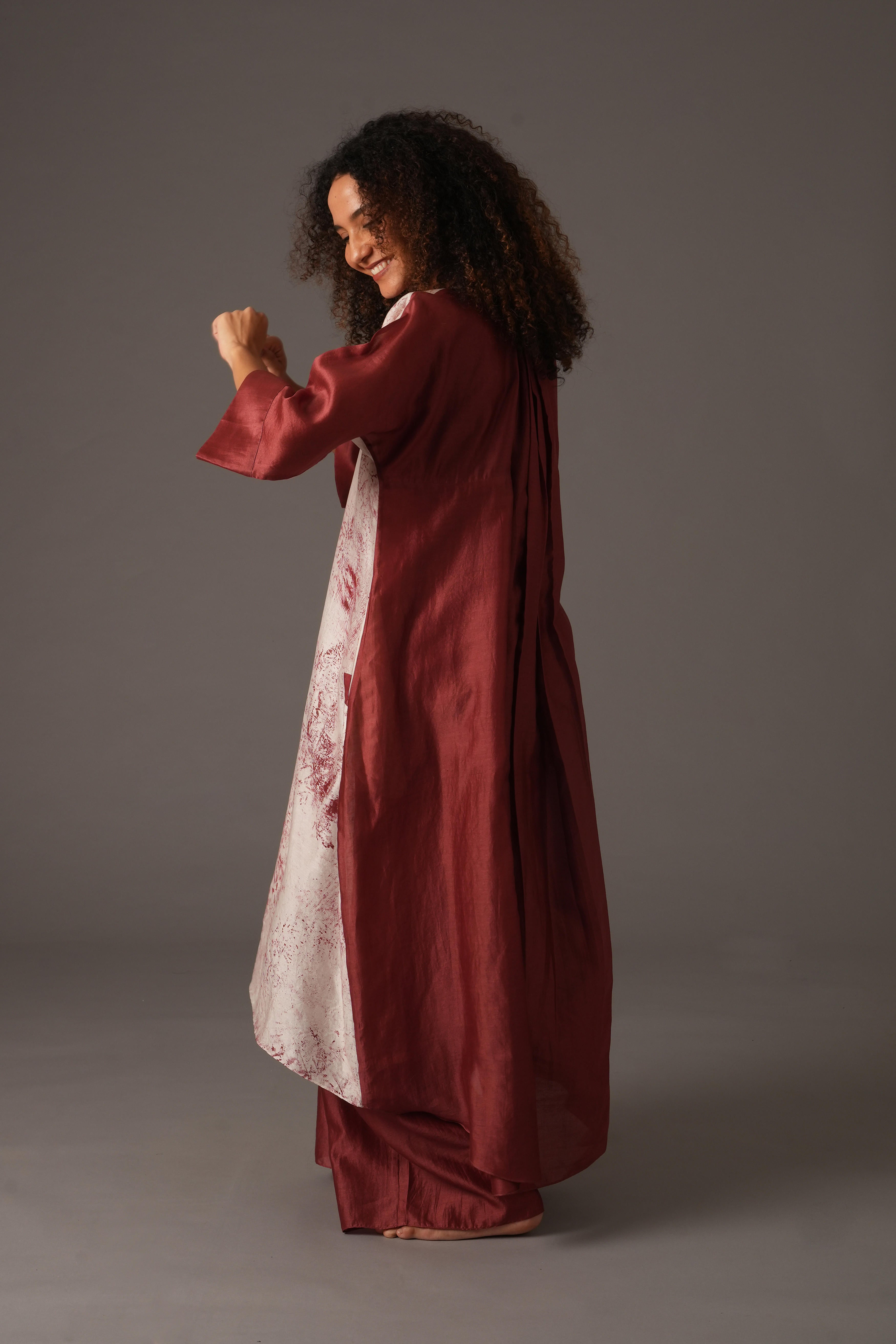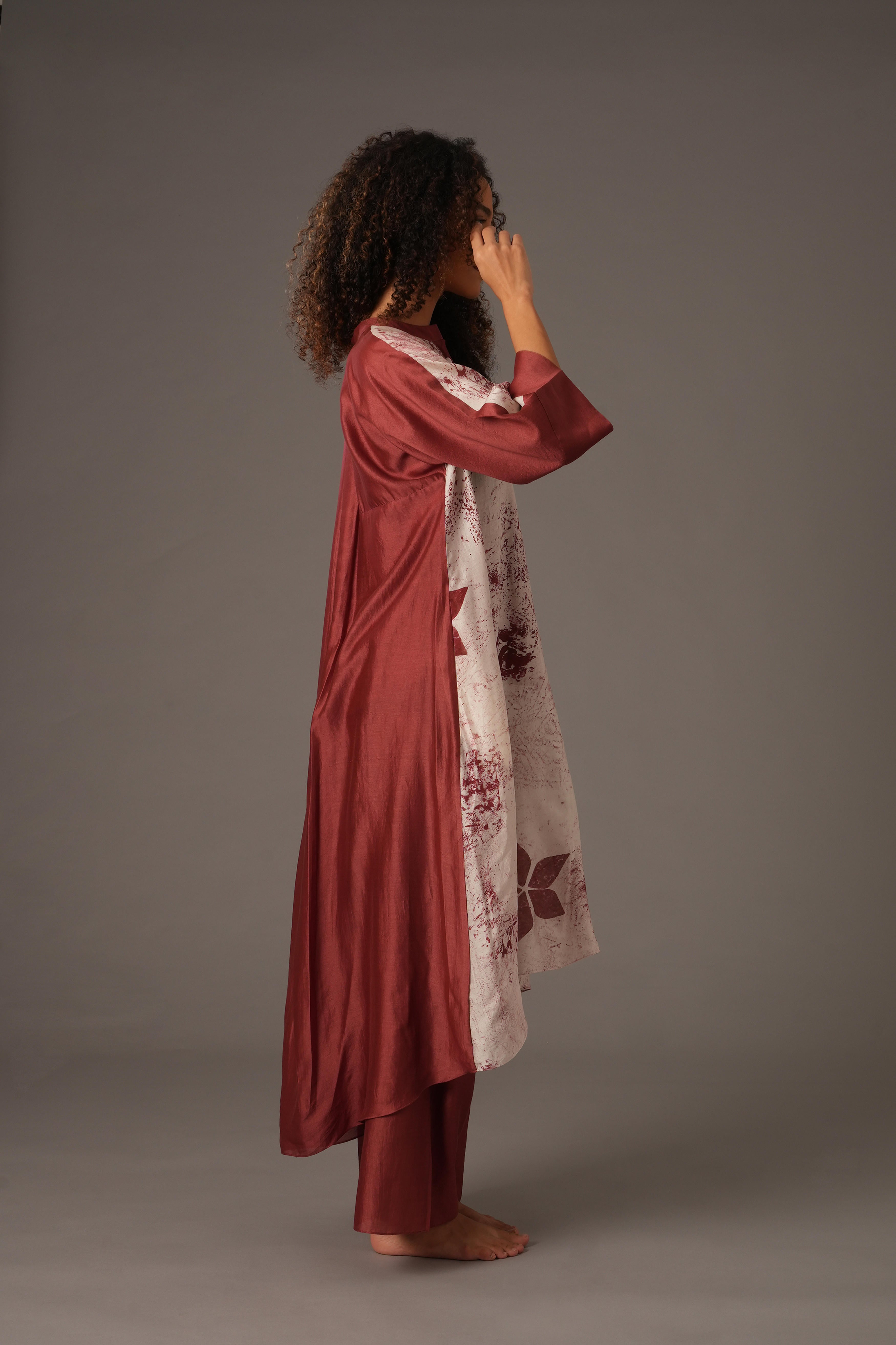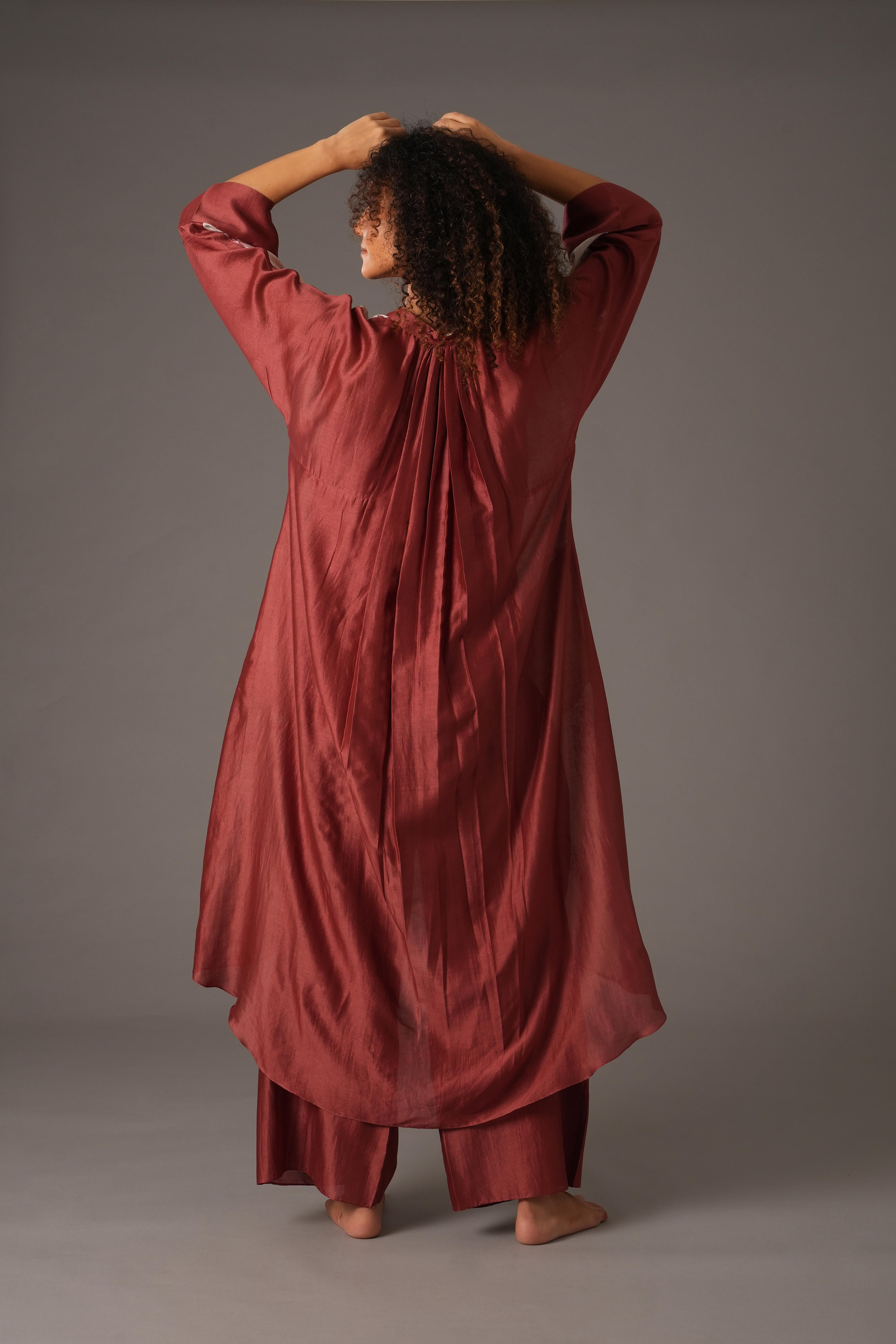 This Chanderi Silk set includes 3 pieces: Dress, Slip, and Bottom, all in a beautiful Cherry Red colour. The dress is 42 inches in full length, with a back length of 48 inches. It features 15-inch long sleeves with 2.5-inch cuffs for an elegant finish. The bottom has a 38-inch pants length, a 26-inch waist, and 26-inch Mohri for a perfect fit. Our model, standing 5'8", is wearing a size S.