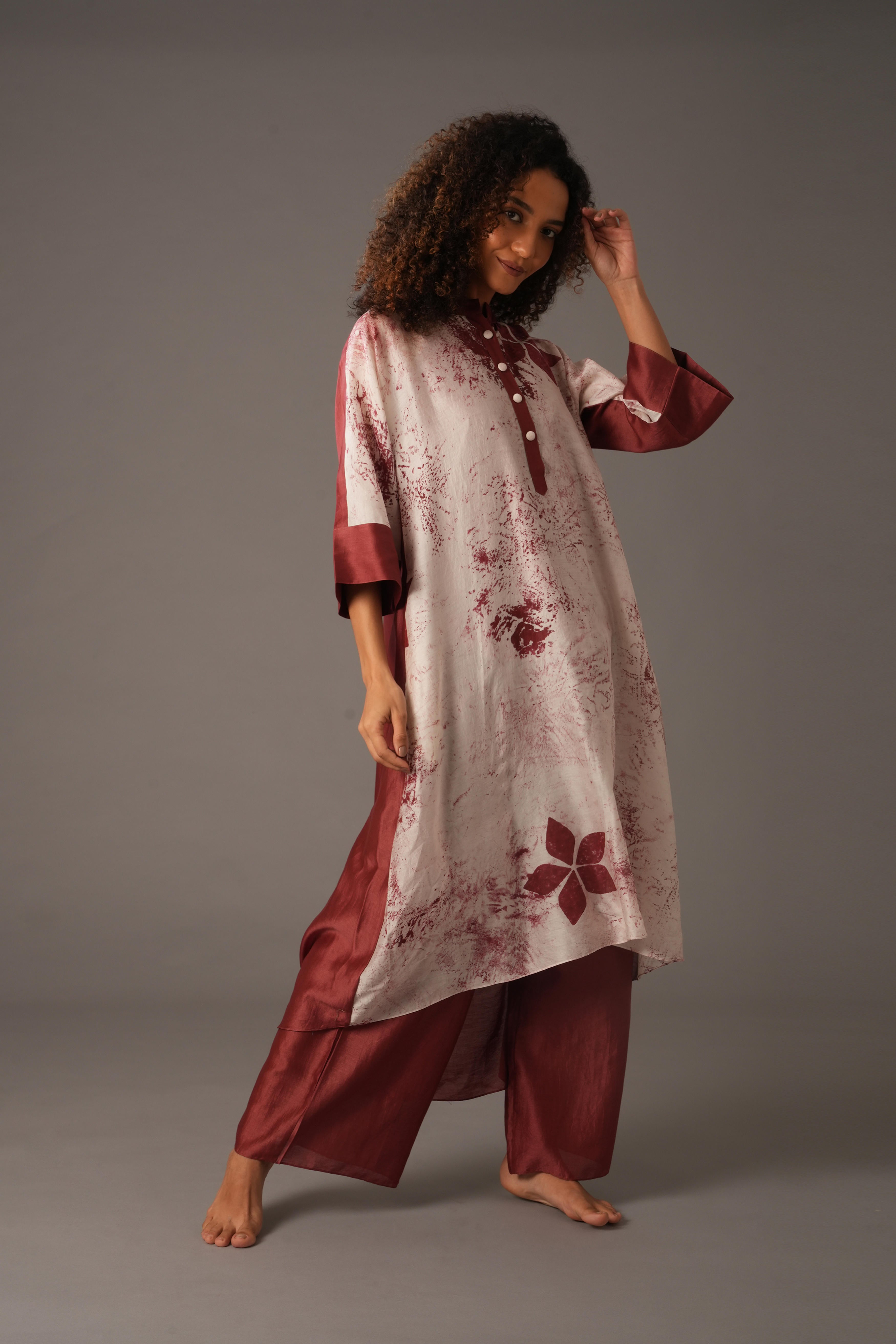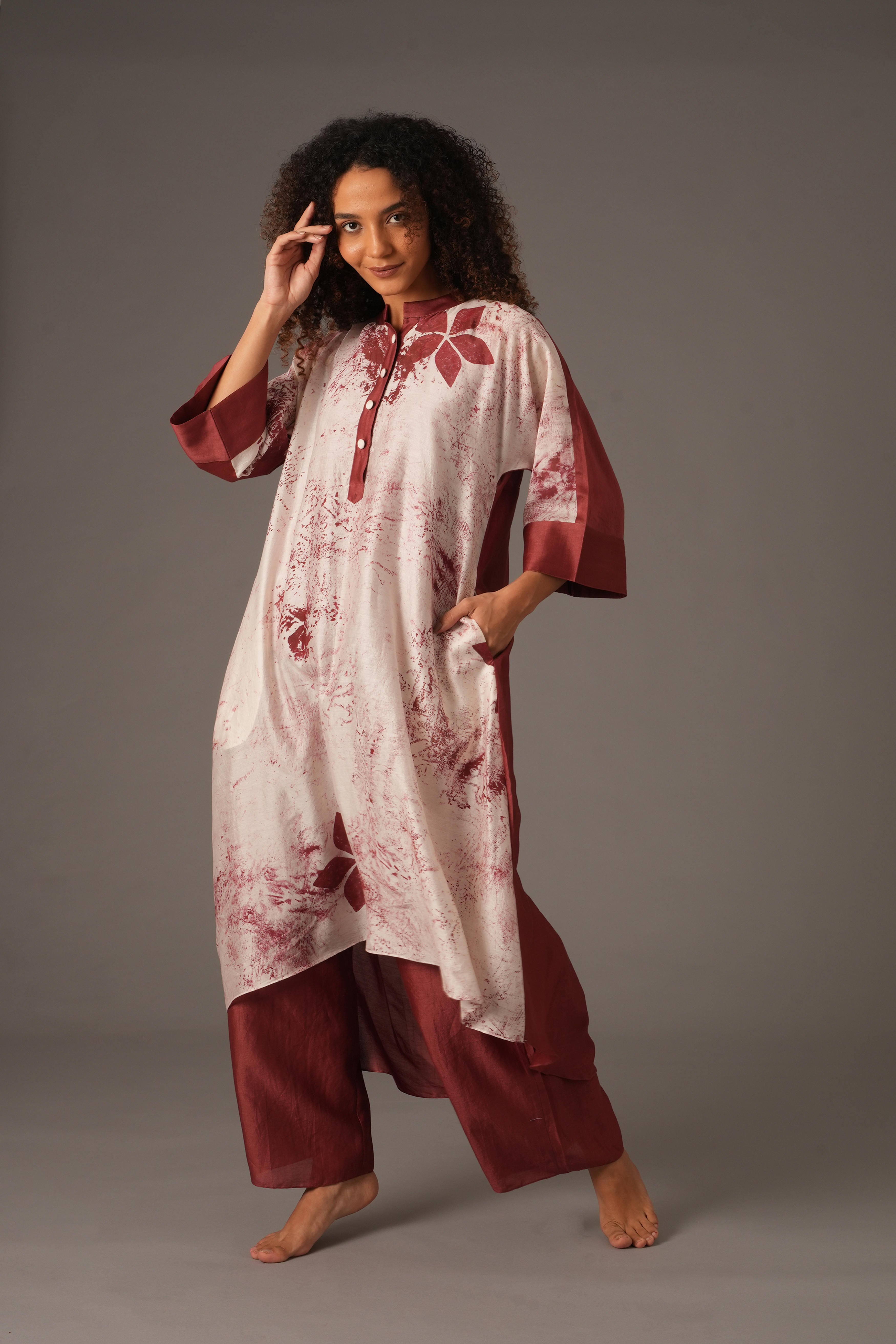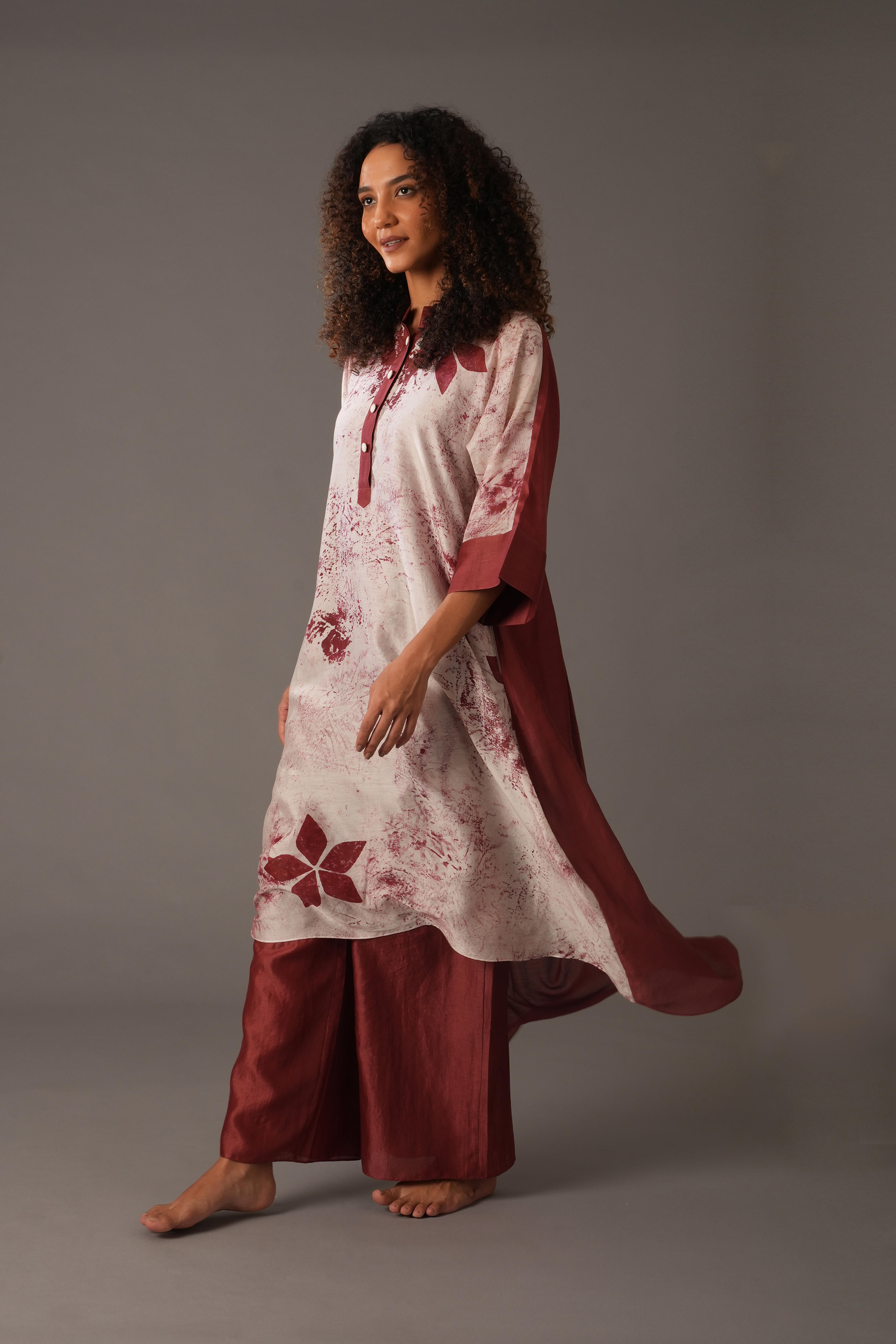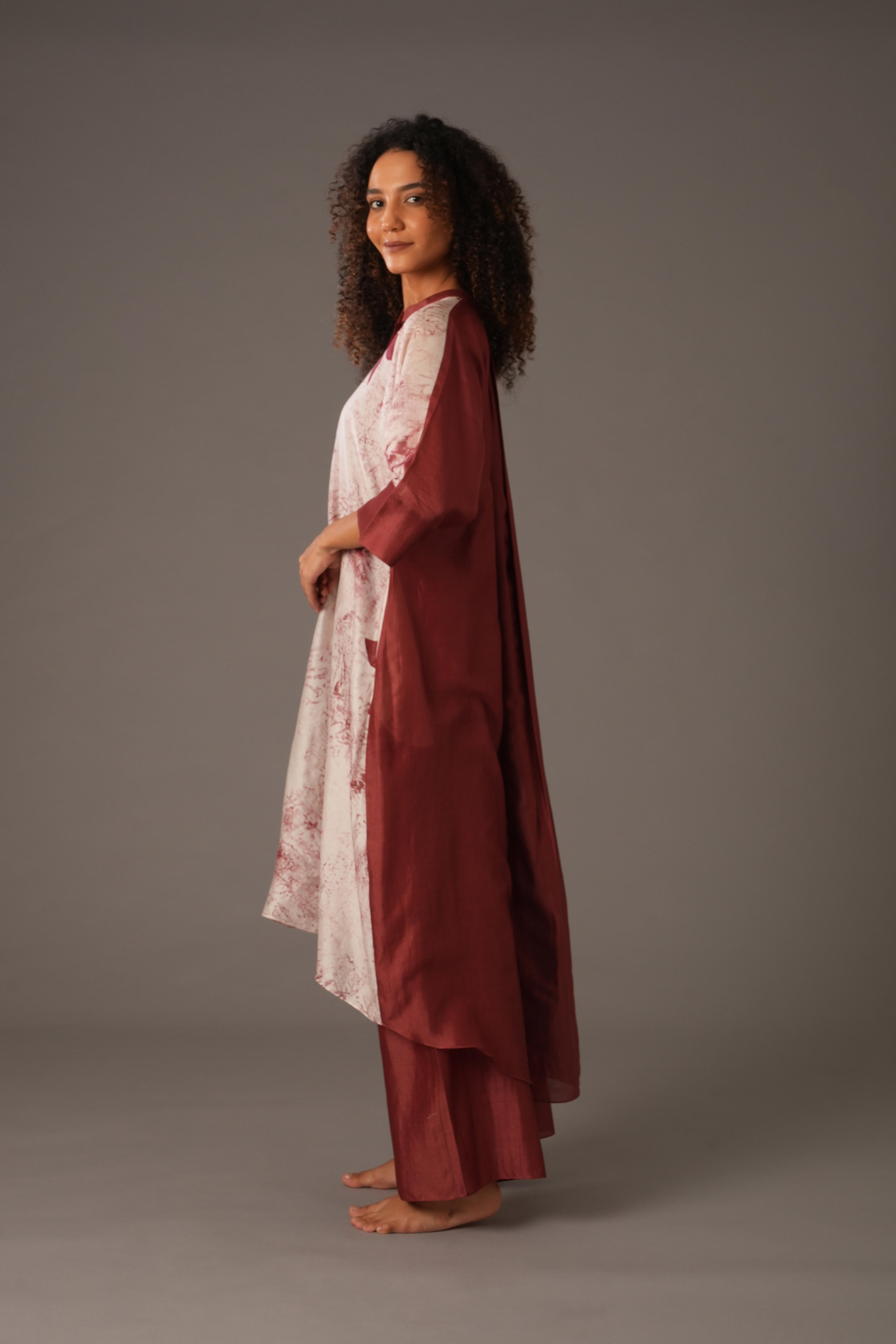 This Chanderi Silk set includes 3 pieces: Dress, Slip, and Bottom, all in a beautiful Cherry Red colour. The dress is 42 inches in full length, with a back length of 48 inches. It features 15-inch long sleeves with 2.5-inch cuffs for an elegant finish. The bottom has a 38-inch pants length, a 26-inch waist, and 26-inch Mohri for a perfect fit. Our model, standing 5'8", is wearing a size S.