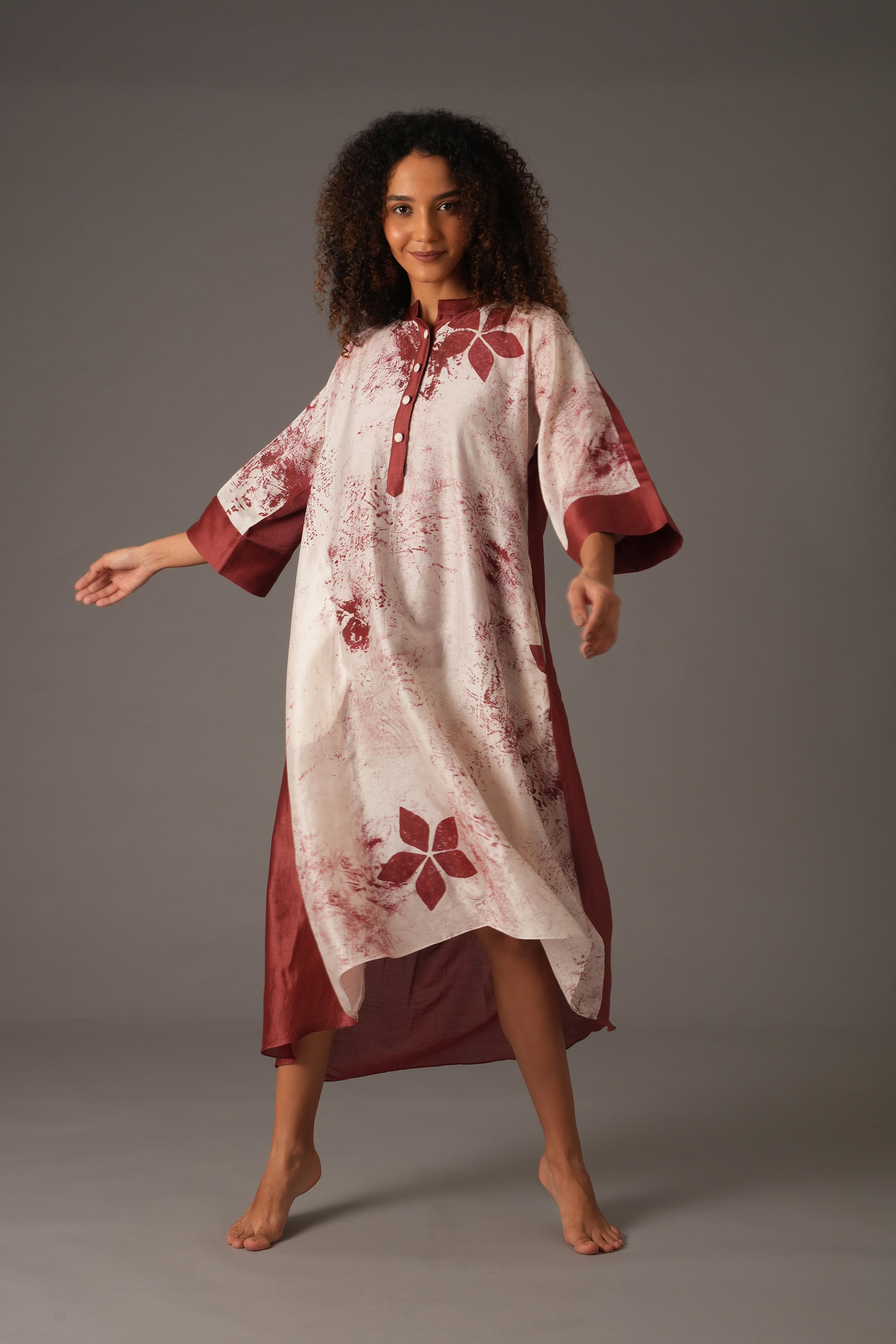 This Chanderi Silk set includes 2 pieces: Dress and Slip, both with stunning Cherry Red highlights. The dress is 42 inches in full length, with a back length of 48 inches. It features 15-inch long sleeves with 2.5-inch cuffs for a refined finish. Our model, standing 5'8", is wearing a size S.