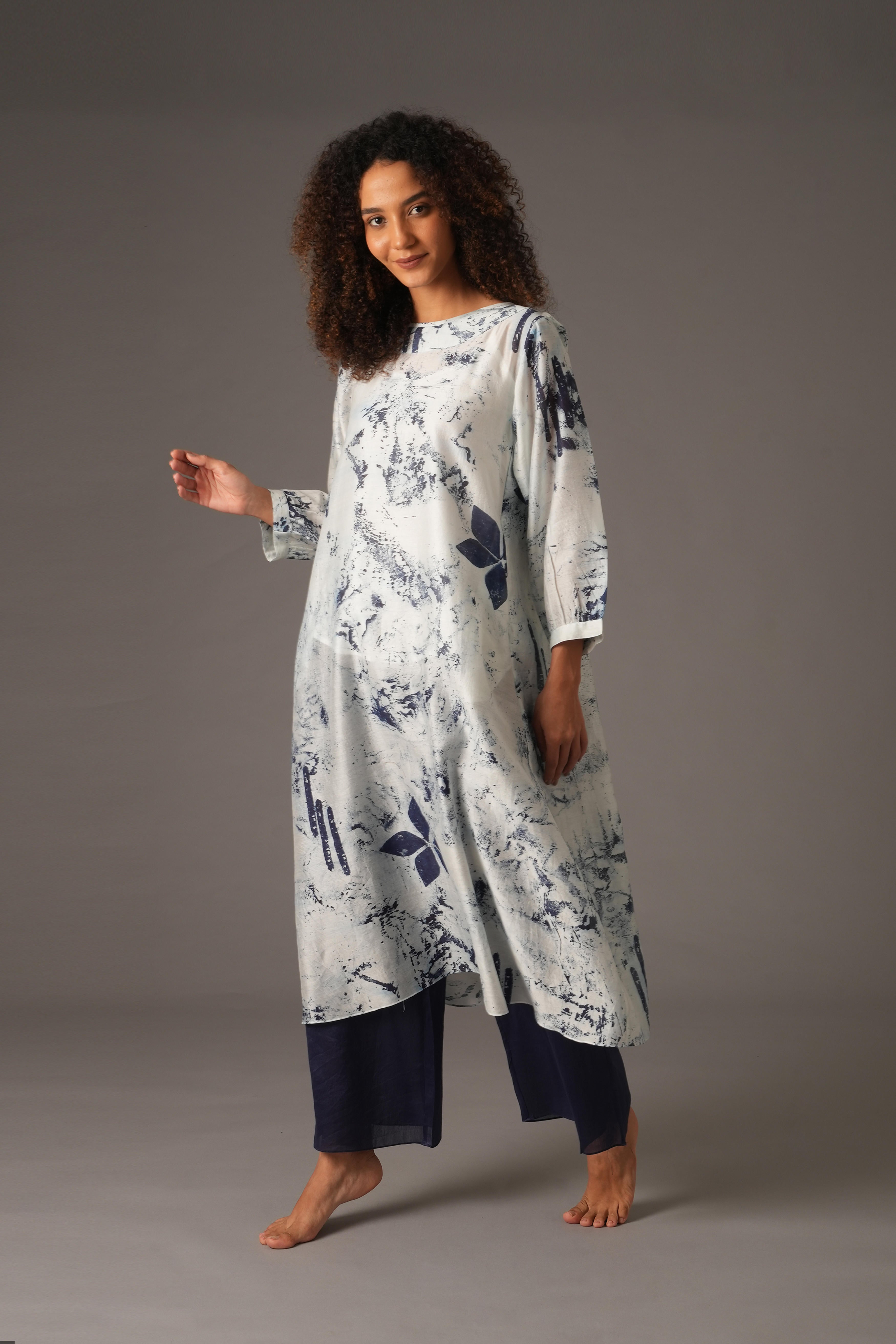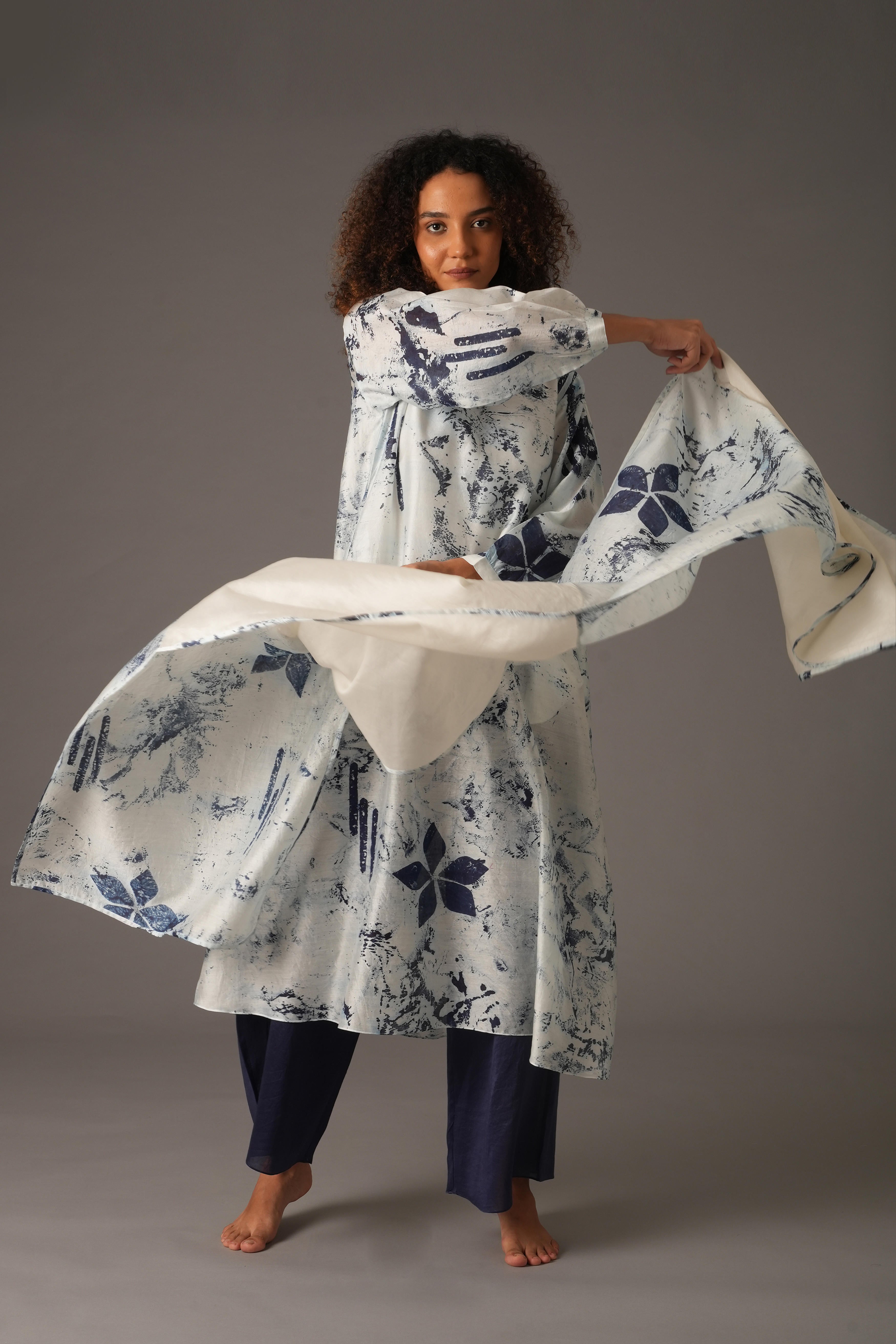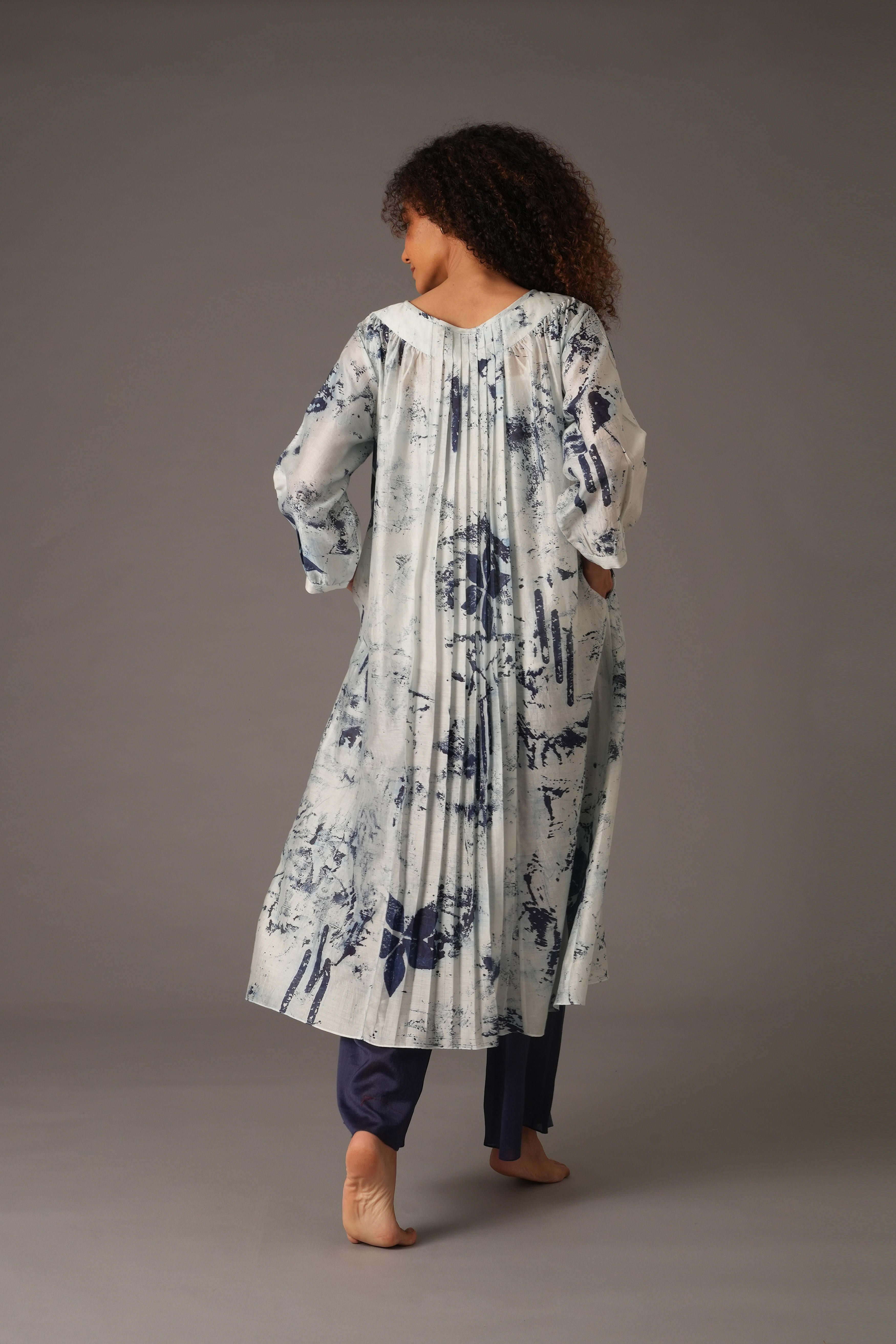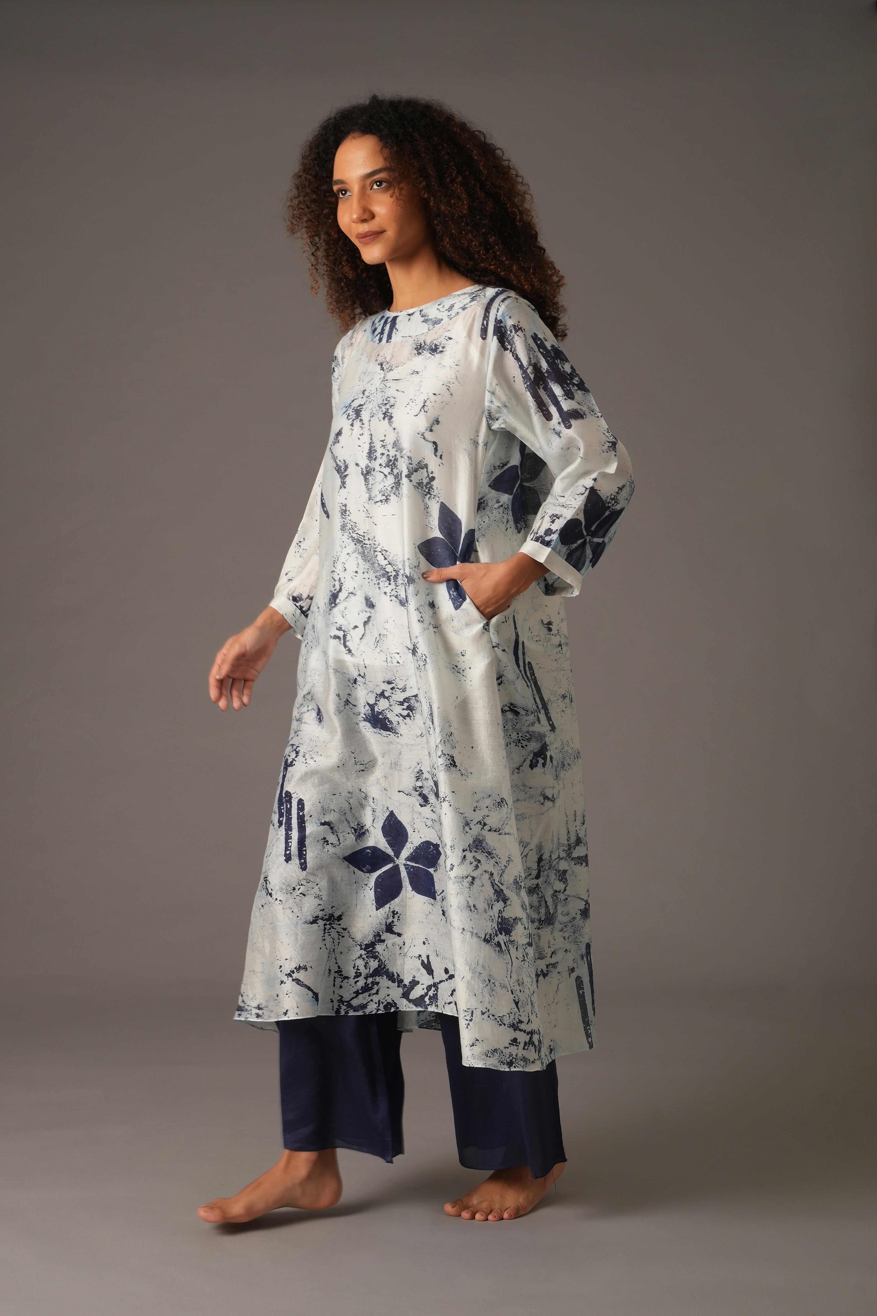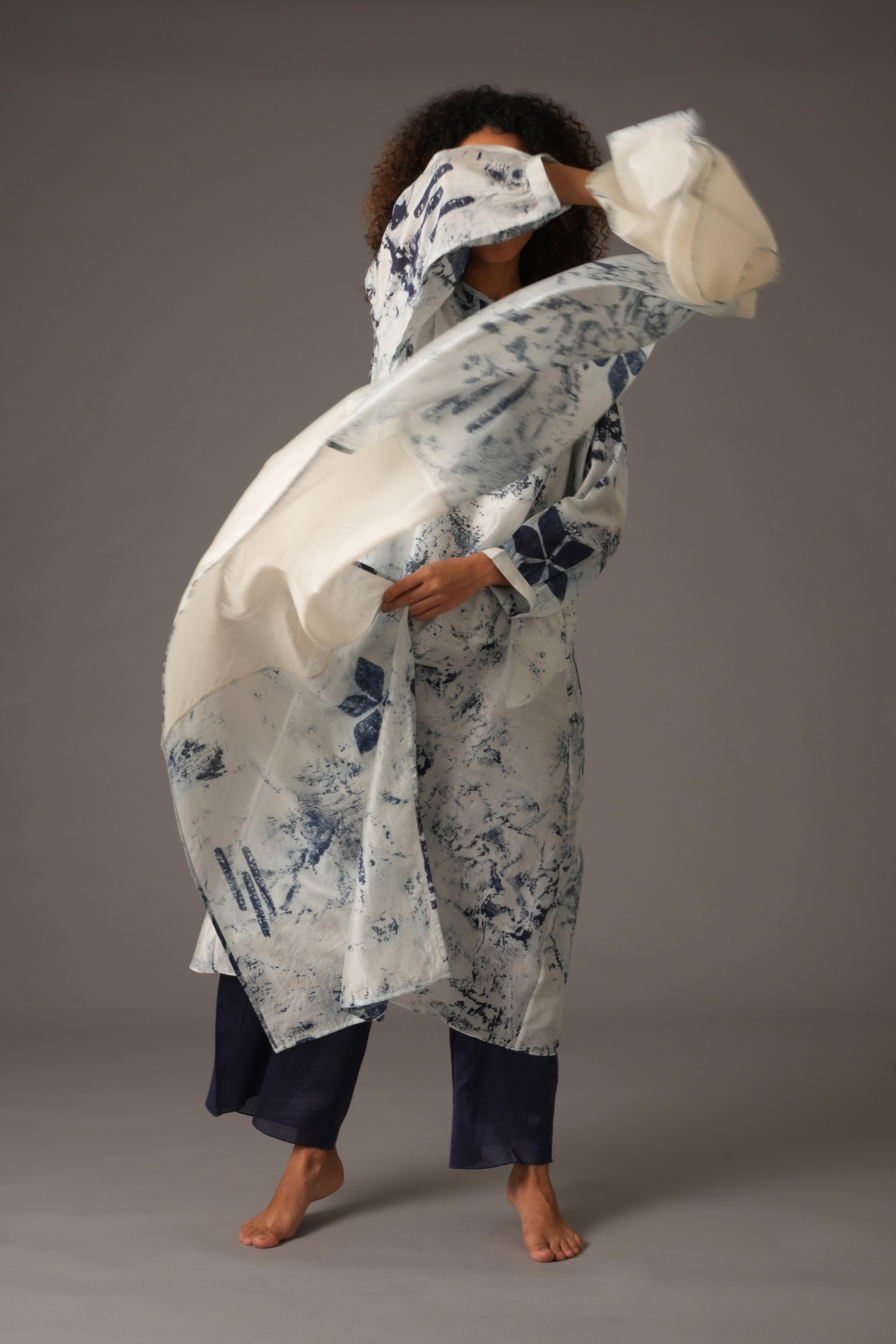 This beautiful Chanderi Silk set includes 4 pieces: Dress, Slip, Bottom, and Scarf in a rich Blue colour. The dress features a full length of 47 inches and 19-inch long sleeves with 1-inch cuffs. The pants have a length of 38 inches, a waist of 26 inches, and a 26-inch Mohri. The scarf is 82 inches in length and 25 inches in width. The design also includes pockets on both sides for added functionality. Our model, standing 5'8", is wearing a size S.