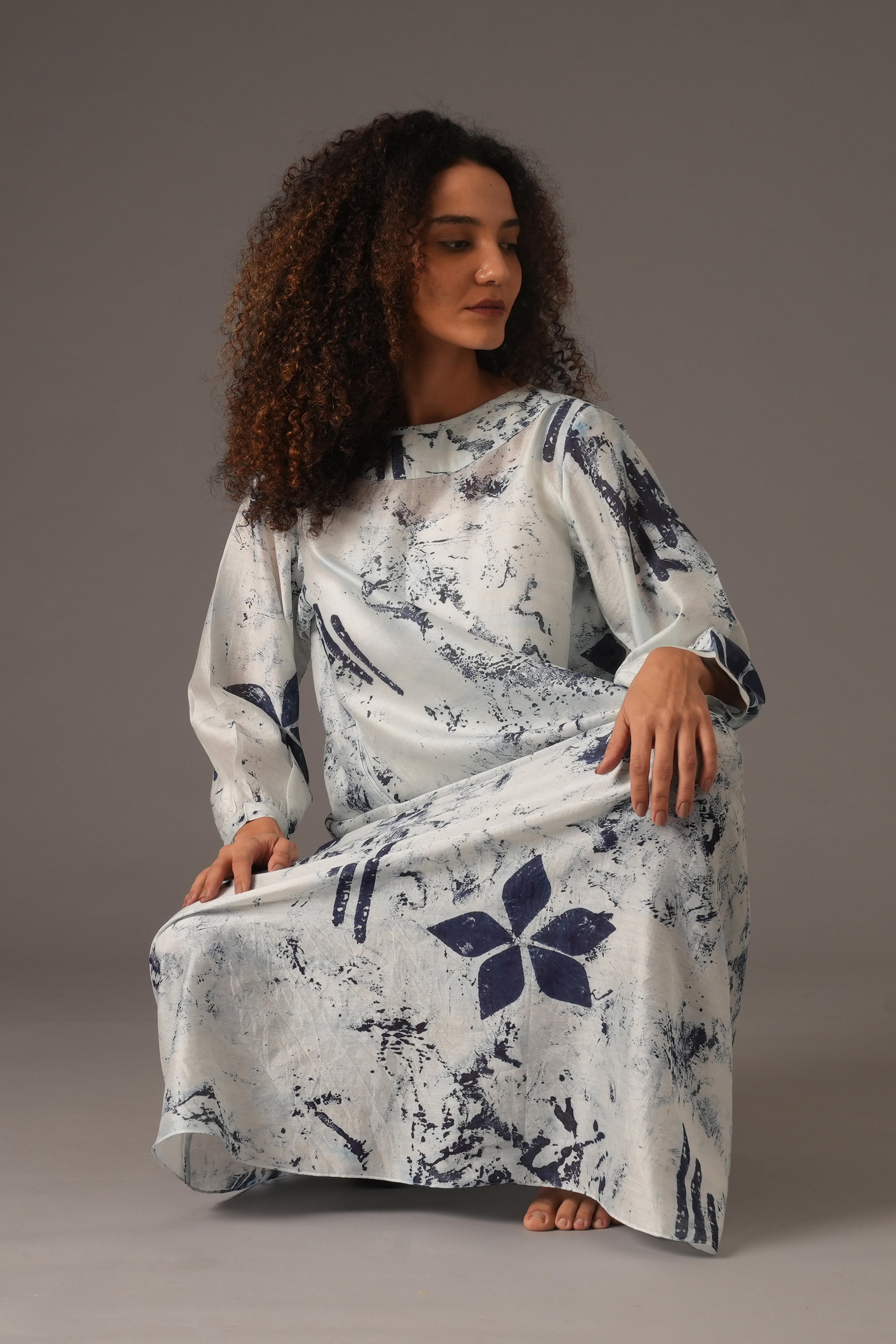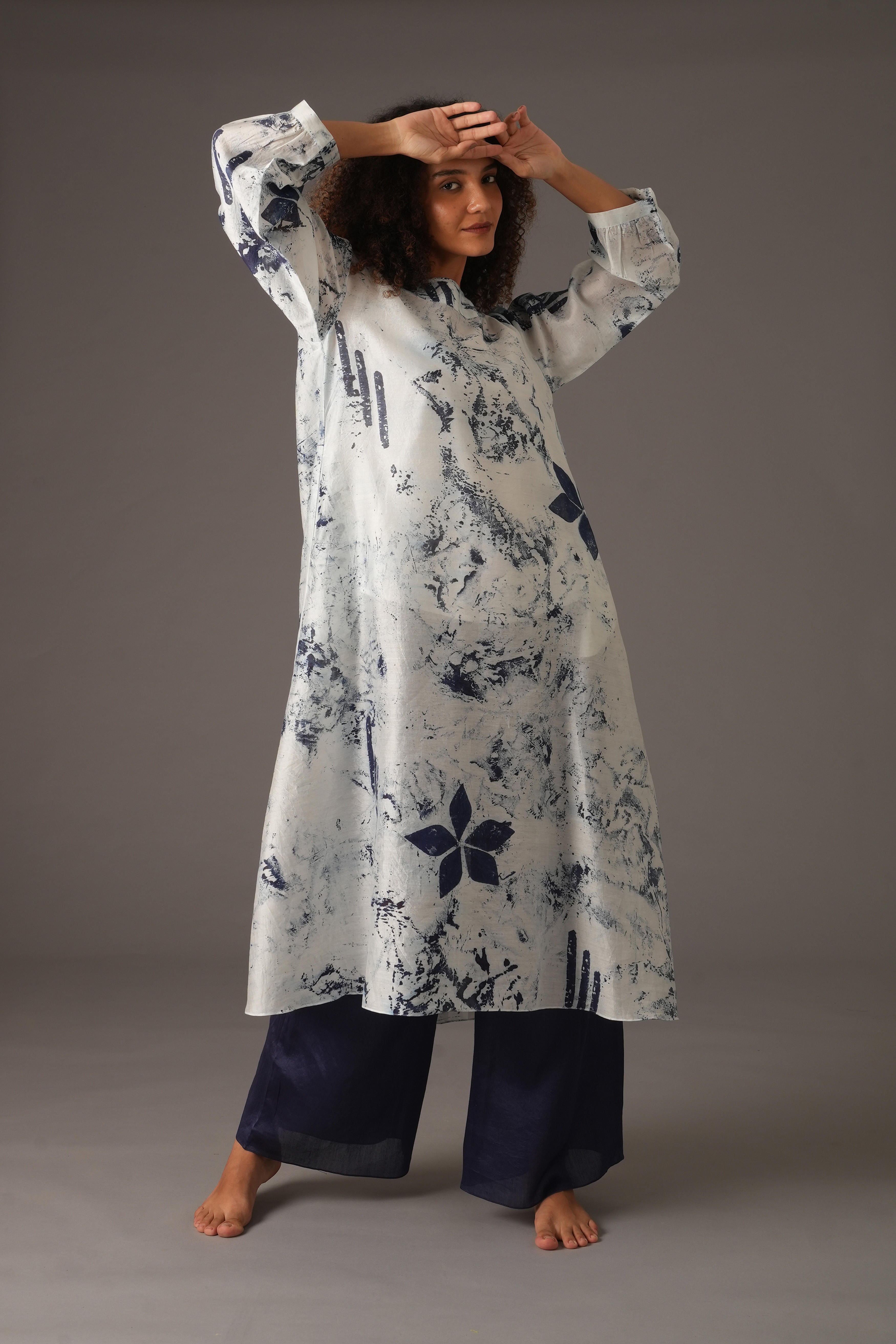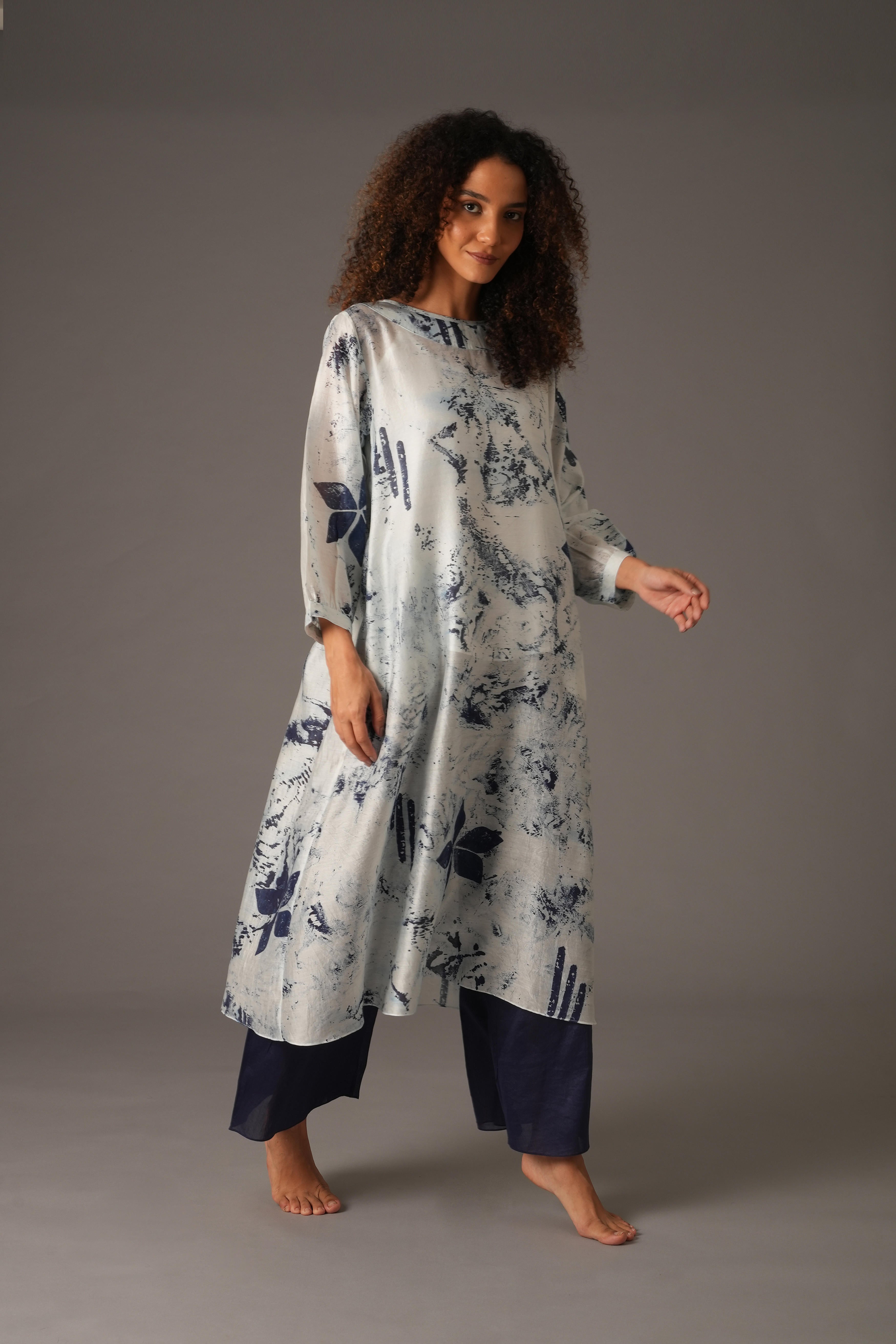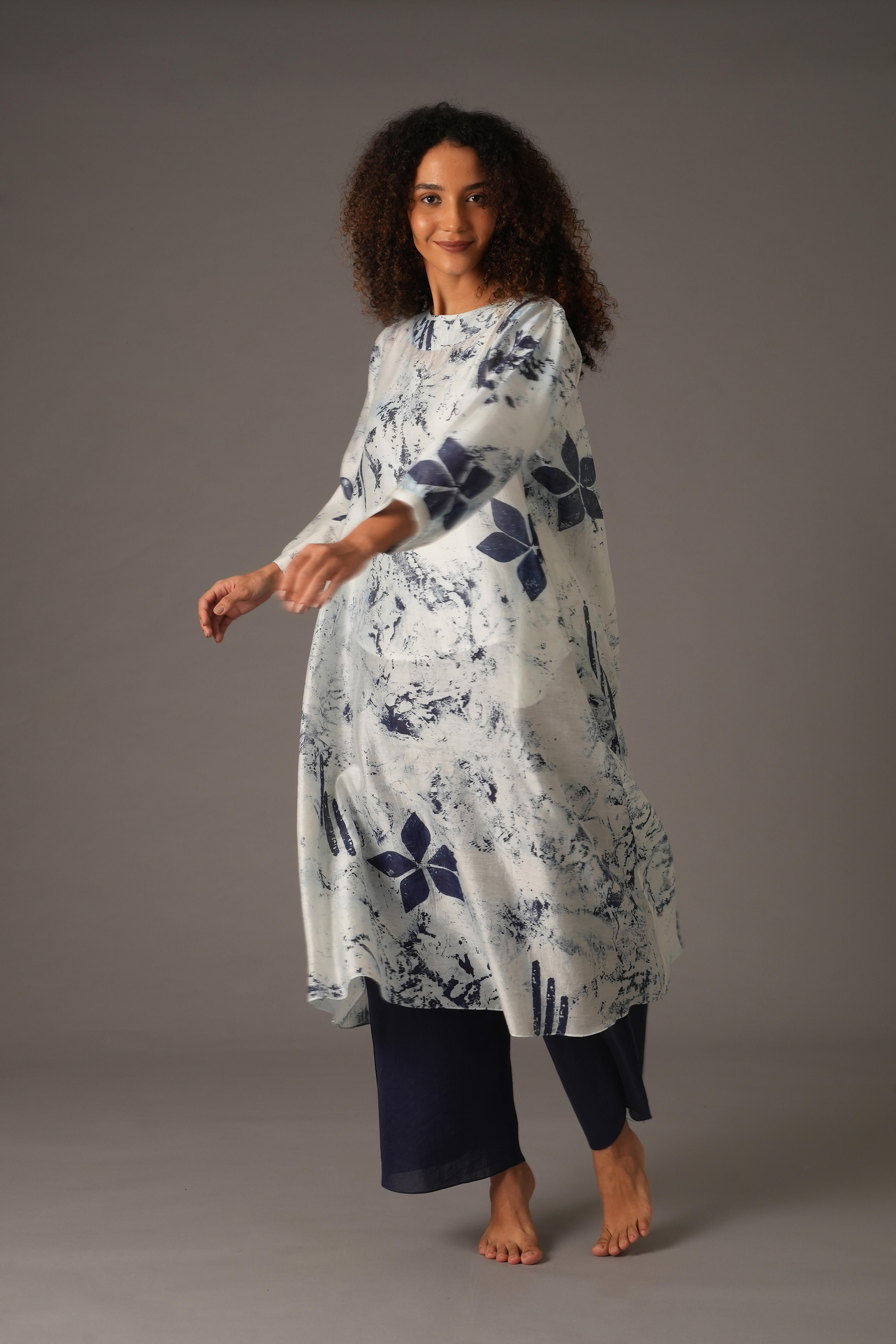 This luxurious Chanderi Silk set includes 3 pieces: Dress, Slip, and Bottom in a stunning Navy. The dress features a full length of 47 inches, 19-inch long sleeves with 1-inch cuffs, and pockets on both sides. The pants have a 38-inch length with a 26-inch waist and 26-inch mohri. Our model, standing 5'8", is wearing a size S.