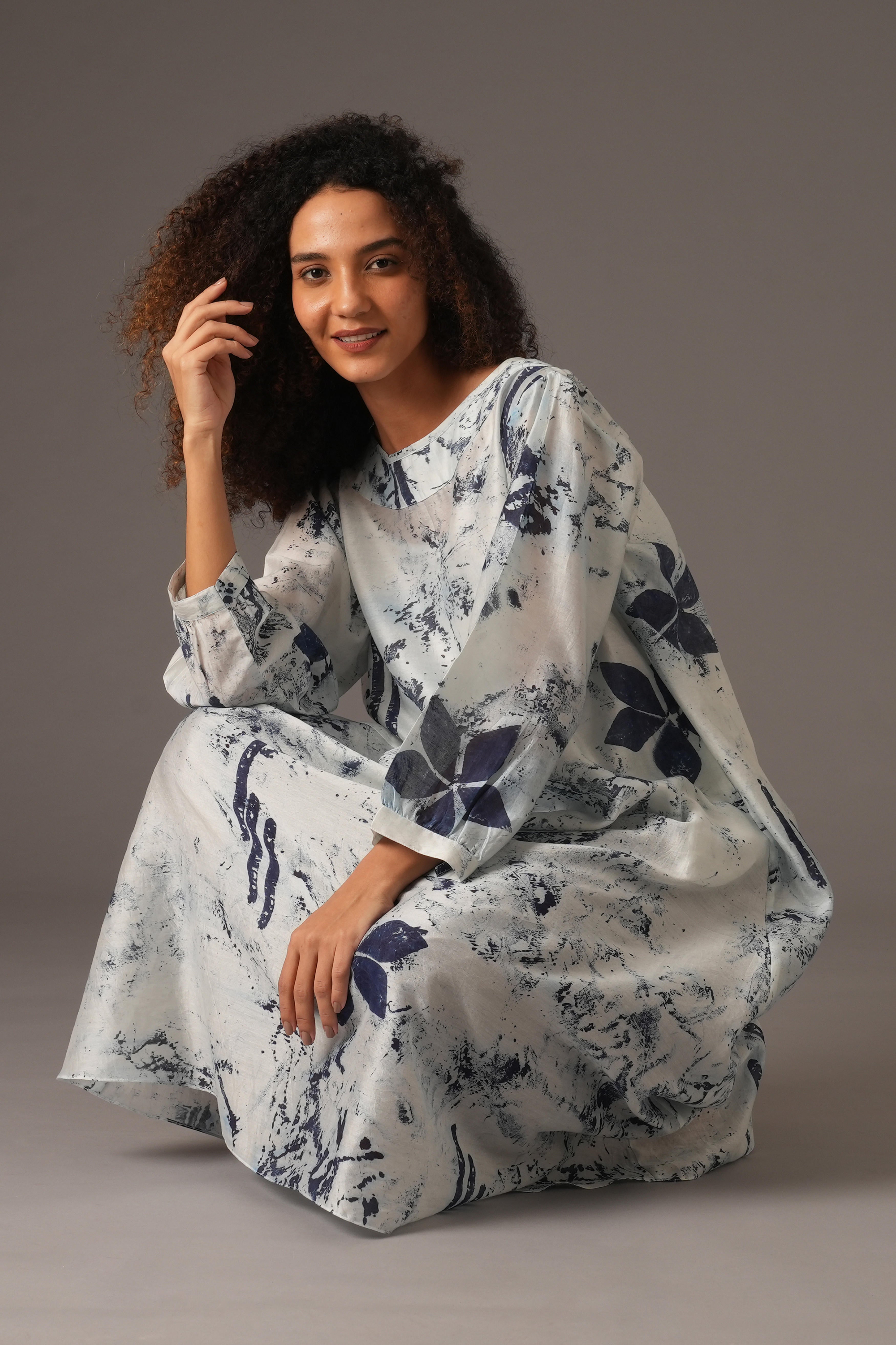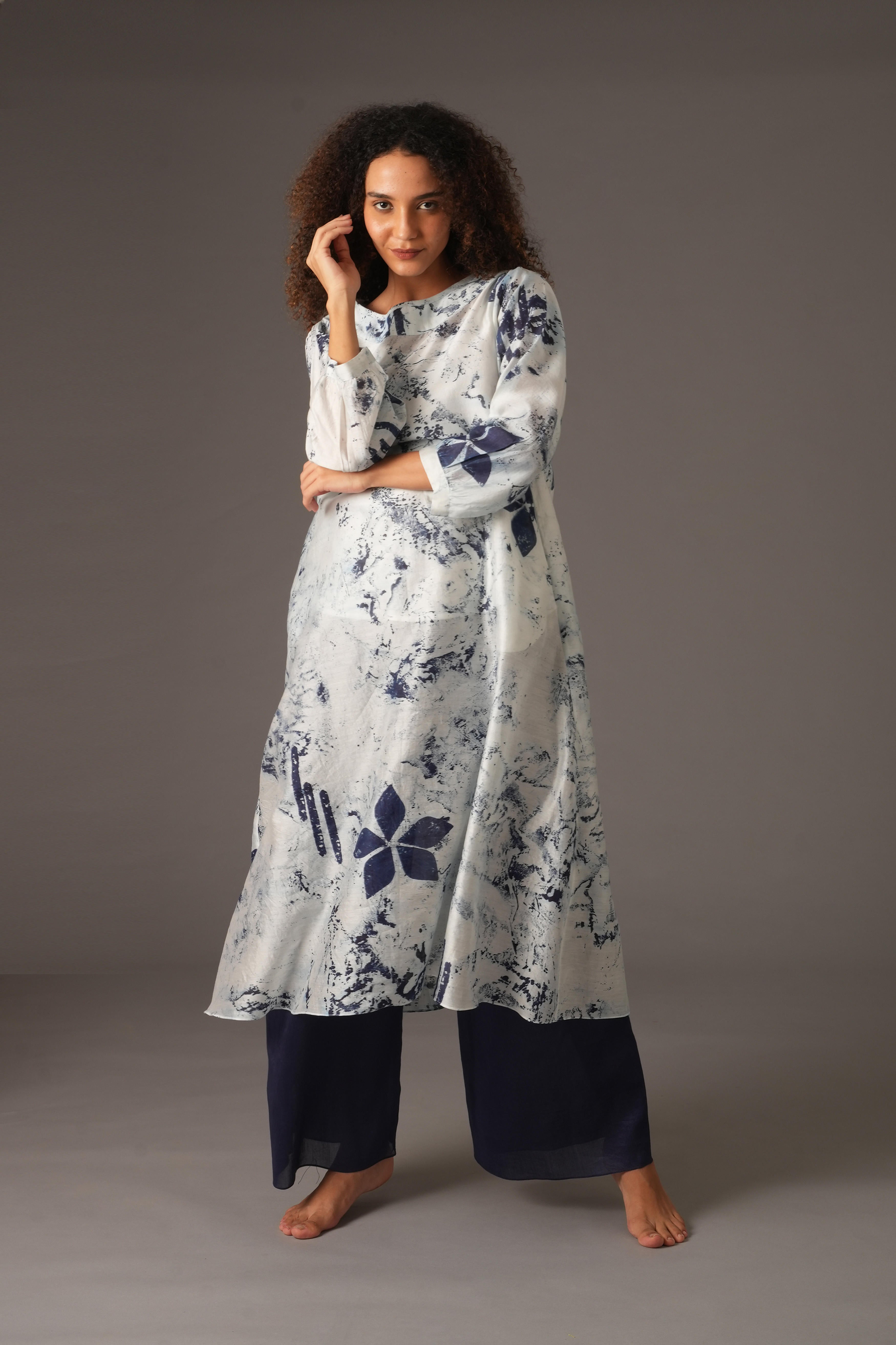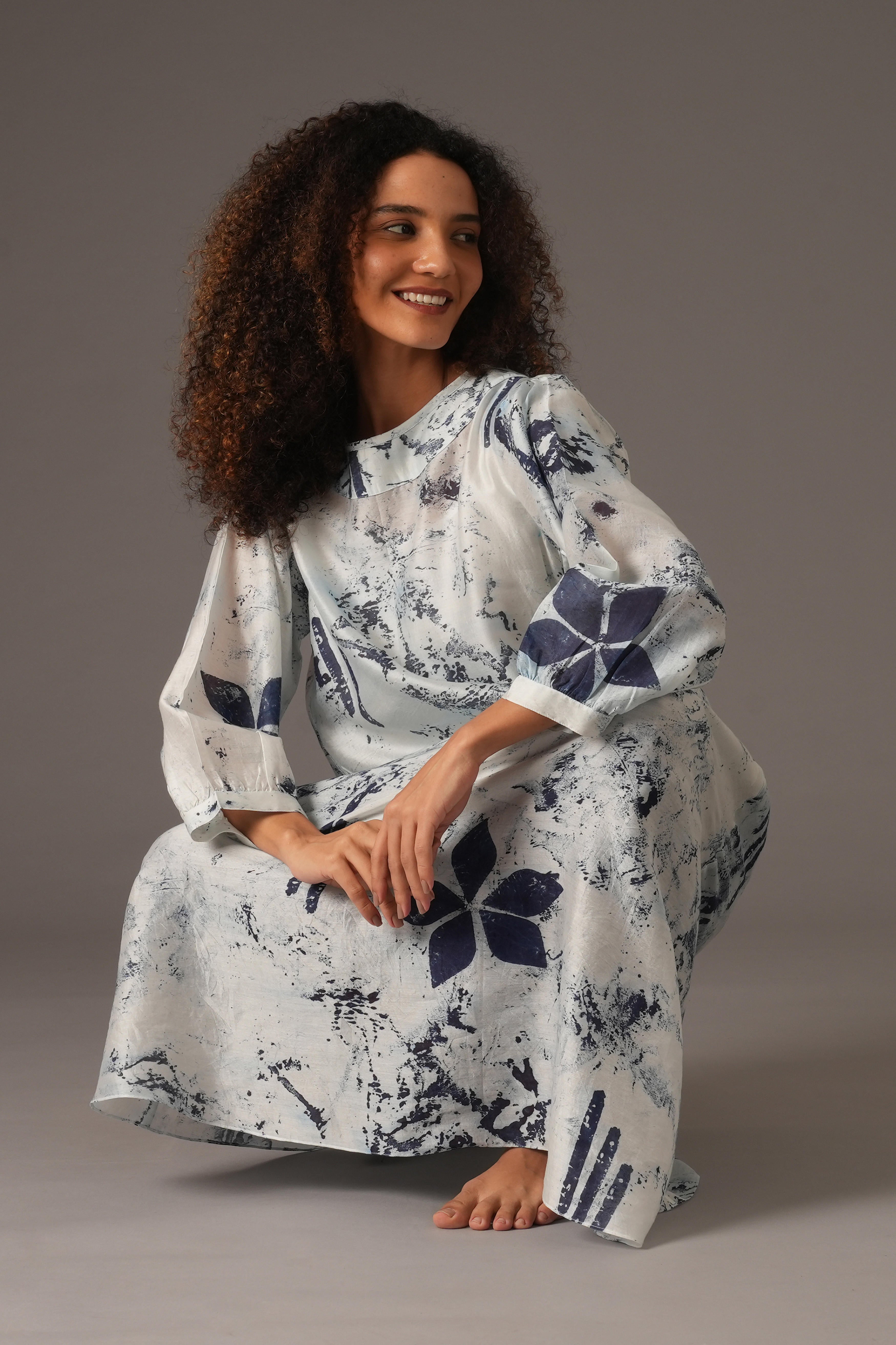 This luxurious Chanderi Silk set includes 3 pieces: Dress, Slip, and Bottom in a stunning Navy. The dress features a full length of 47 inches, 19-inch long sleeves with 1-inch cuffs, and pockets on both sides. The pants have a 38-inch length with a 26-inch waist and 26-inch mohri. Our model, standing 5'8", is wearing a size S.